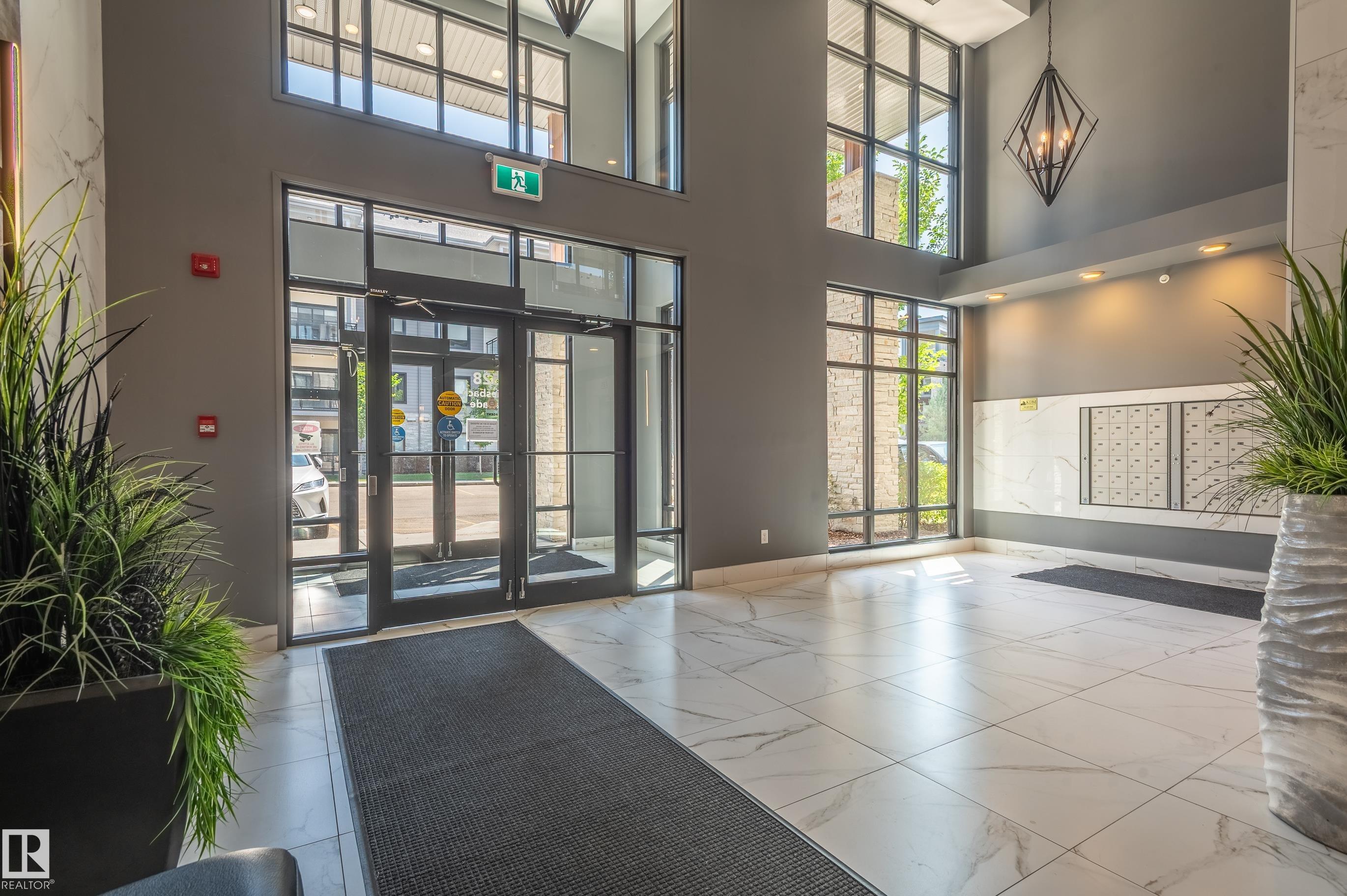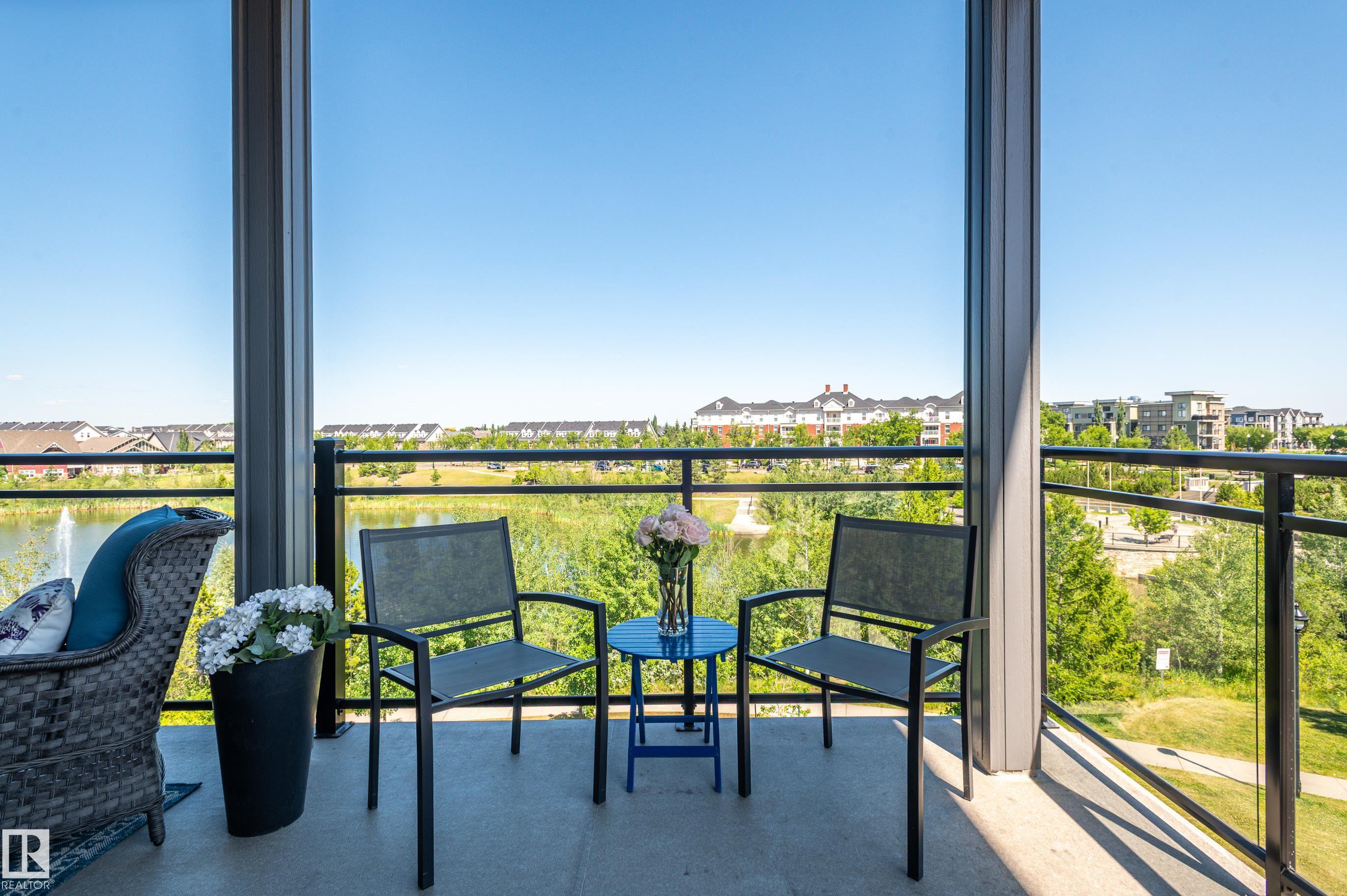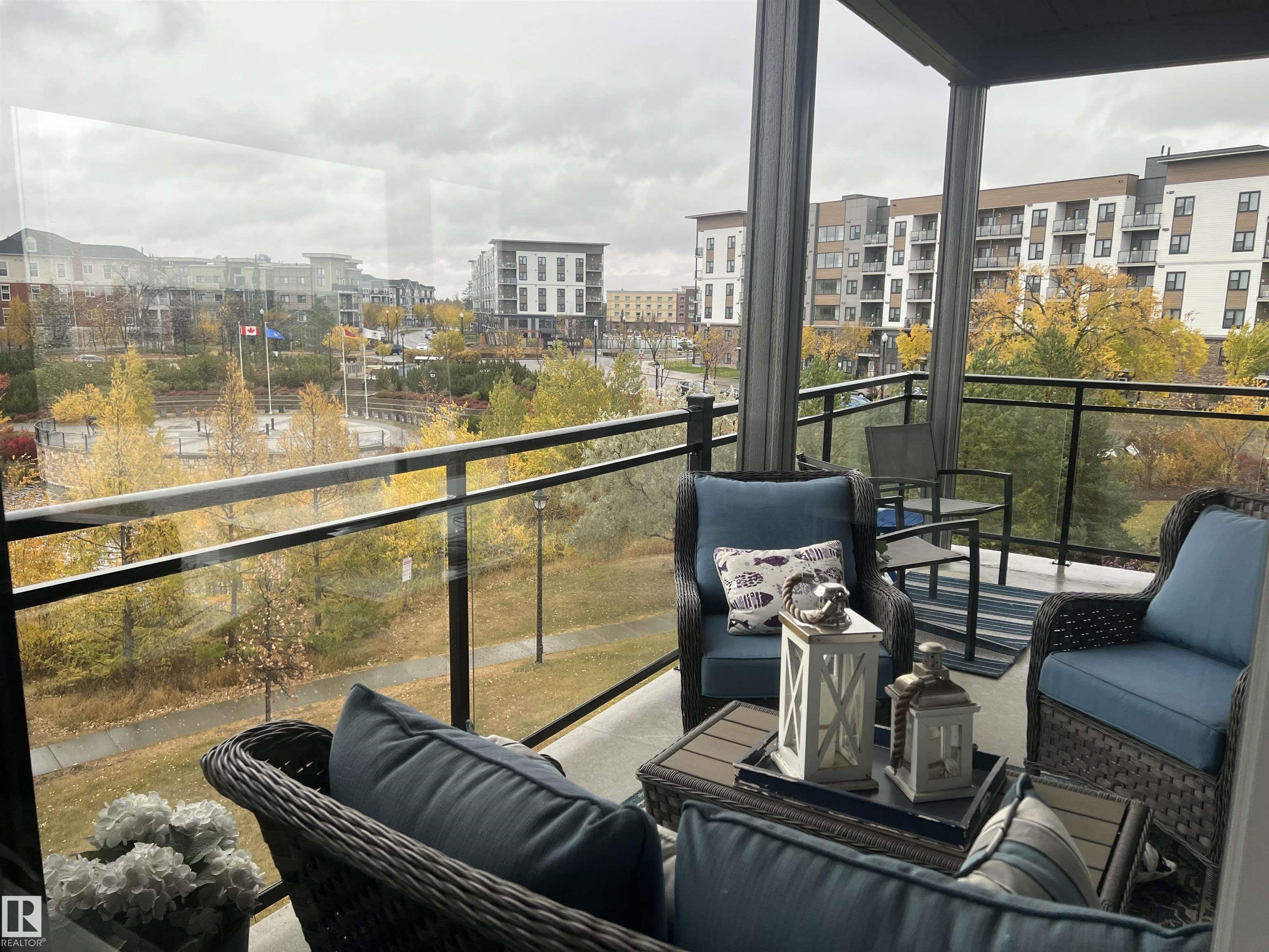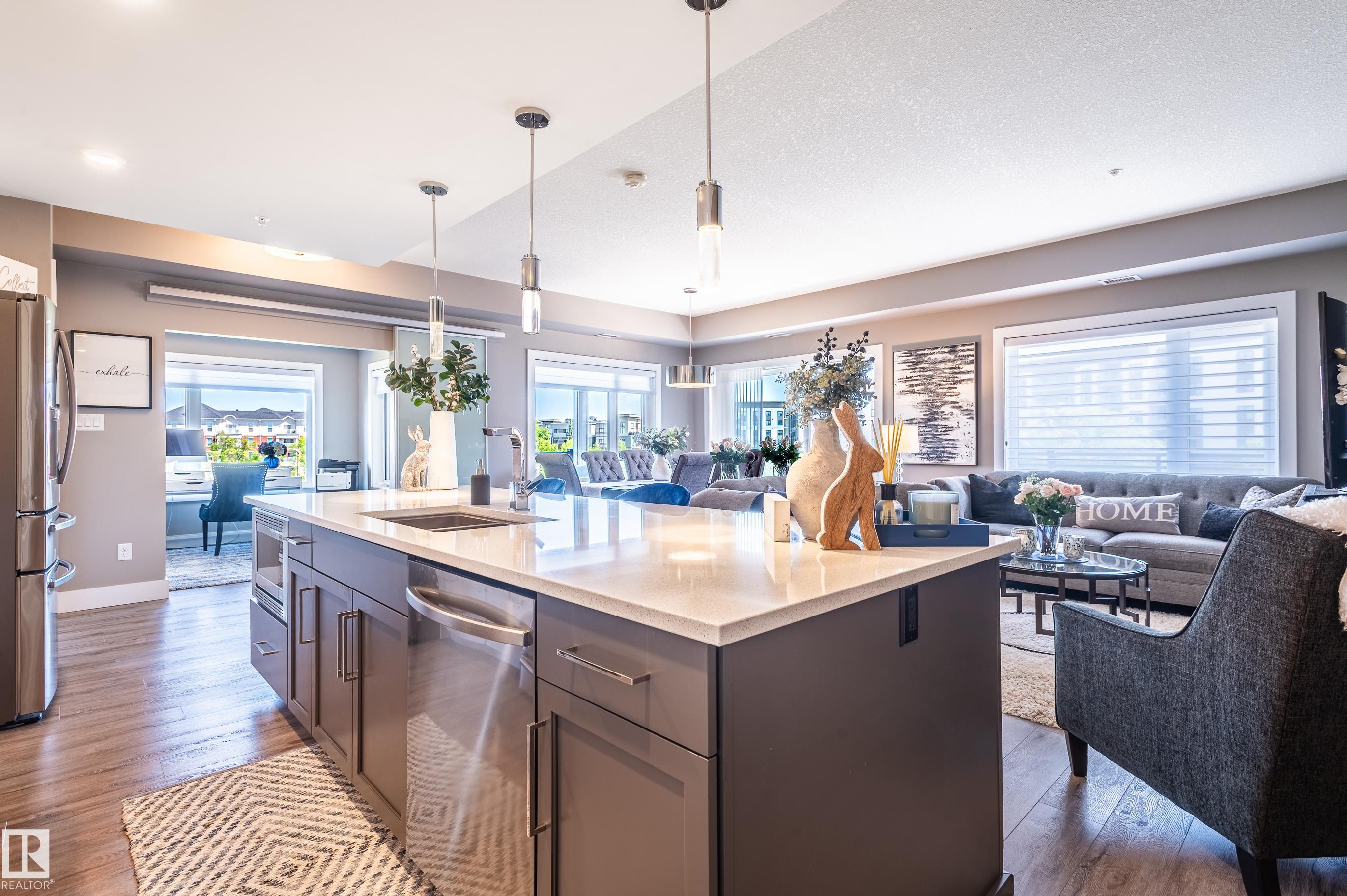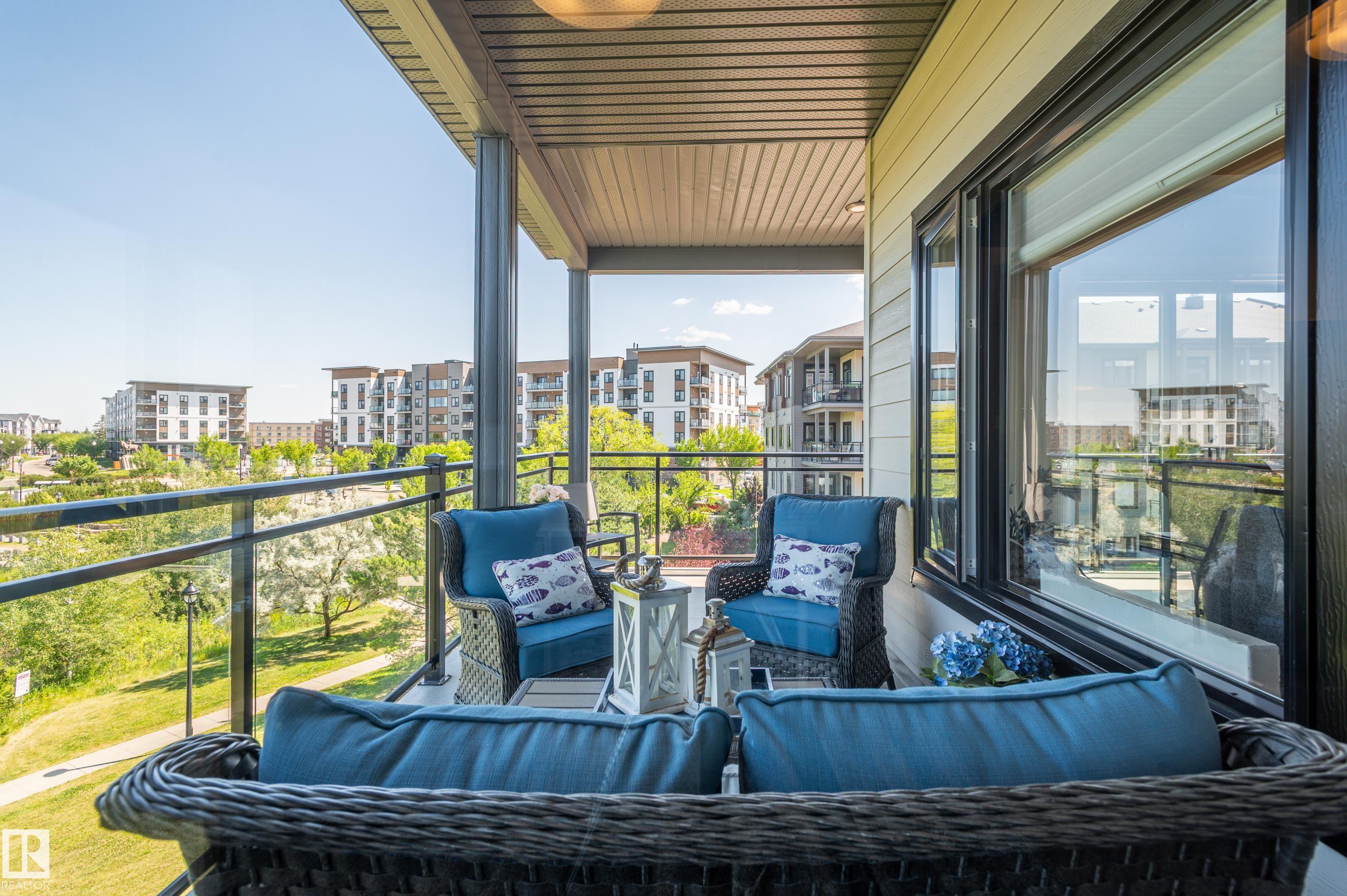 Extensively upgraded lake-facing corner unit in sought-after Veritas, offering awe-inspiring views from every angle. This immaculate one-owner home features 2 spacious bdrms, 2 baths, & a bright den. Enjoy sunny mornings & shady evenings on wrap-around deck. The two-tone kitchen is a standout with upgraded appliances, a tile backsplash, & a 6? extended island with added cabinetry on both sides. Designer lighting, magazine-worthy layout & décor, & a spa-inspired ensuite. A/C. Over $25,000 in thoughtful upgrades also include barn doors, premium flooring, custom shower tile, additional quartz countertops, blinds, hardware, & a second (surface) parking stall that adds everyday convenience, plus a heated stall with secure storage. Pride of ownership shines throughout?clean, cozy, and stylish. Located steps from countless amenities in one of Edmonton?s most desirable communities, this home offers a seamless blend of comfort, elegance, and breathtaking views. Style meets serenity in this Griesbach gem!