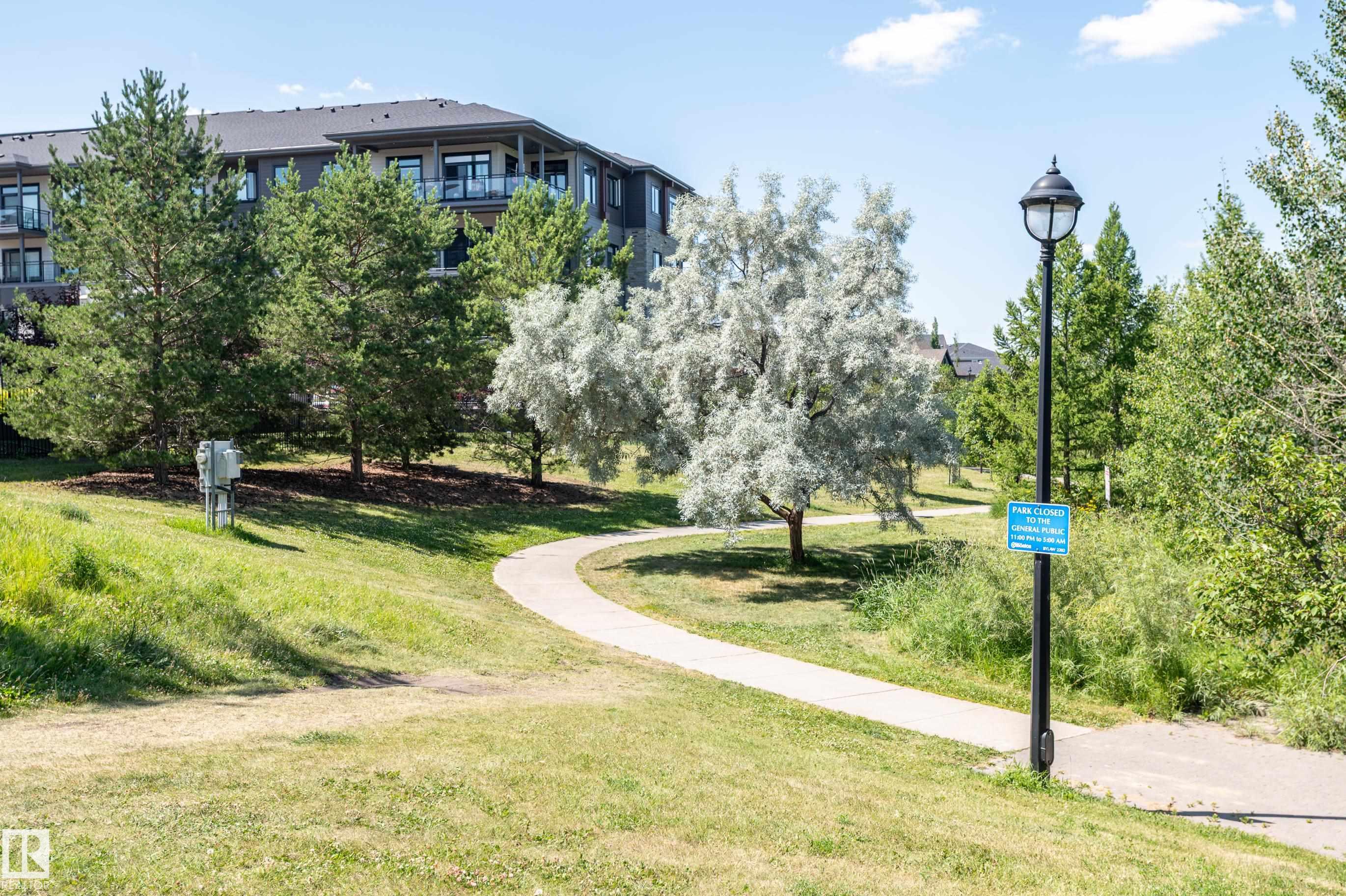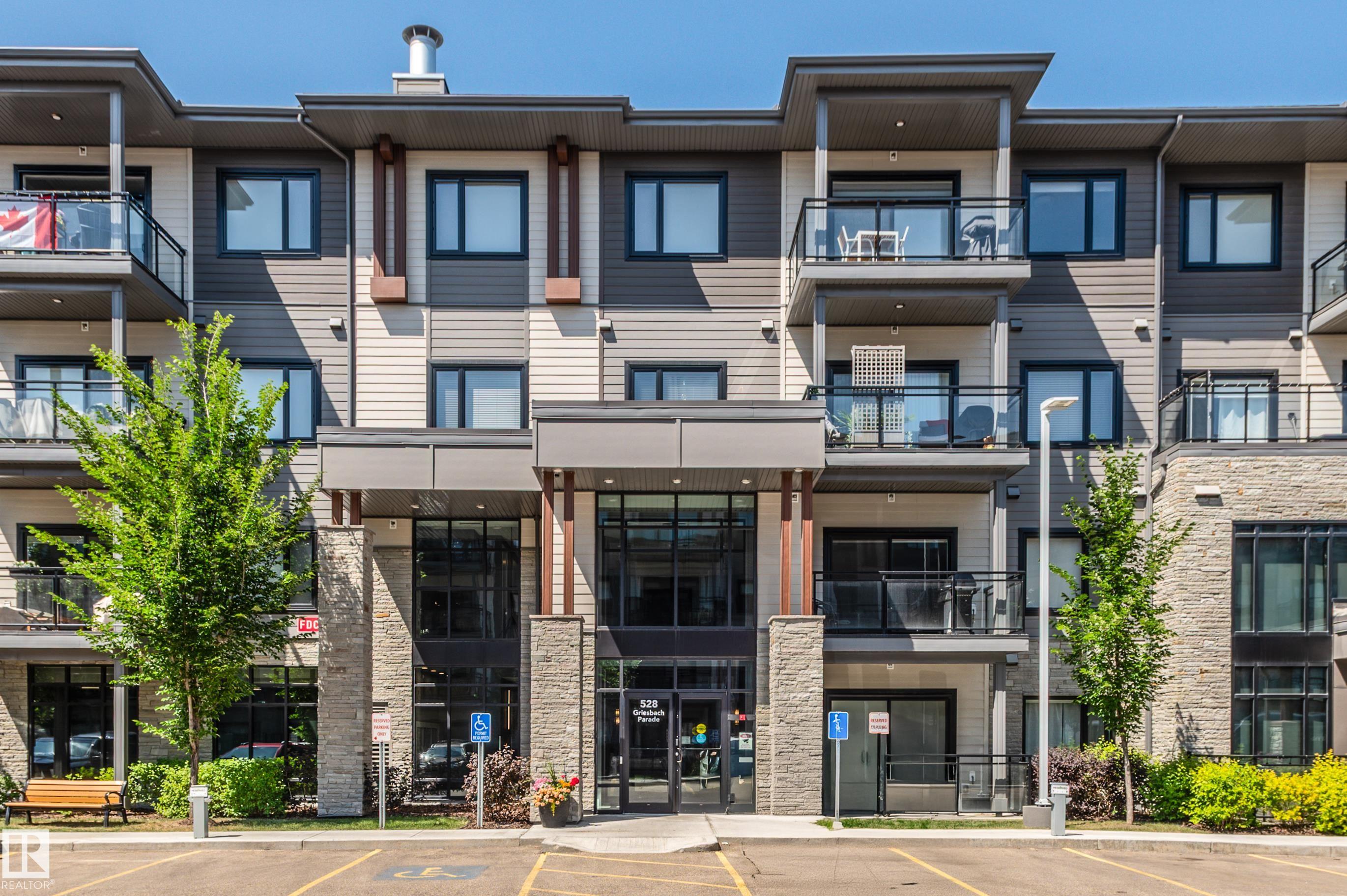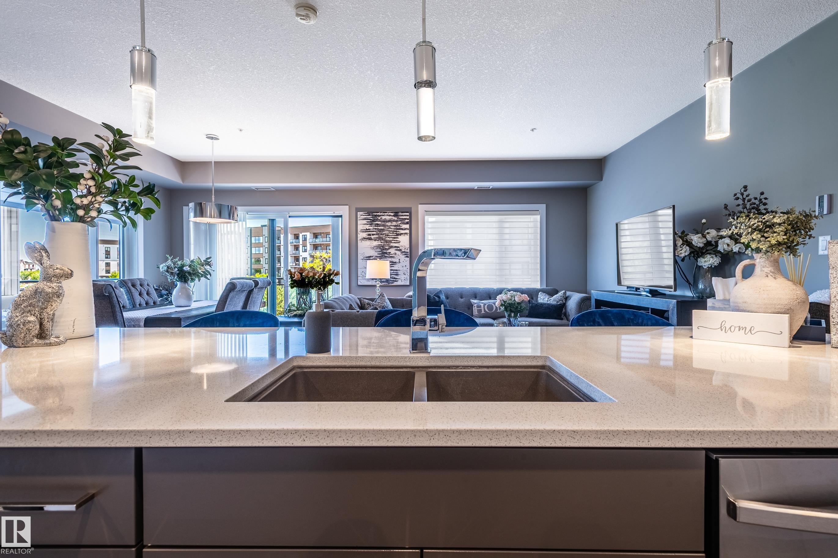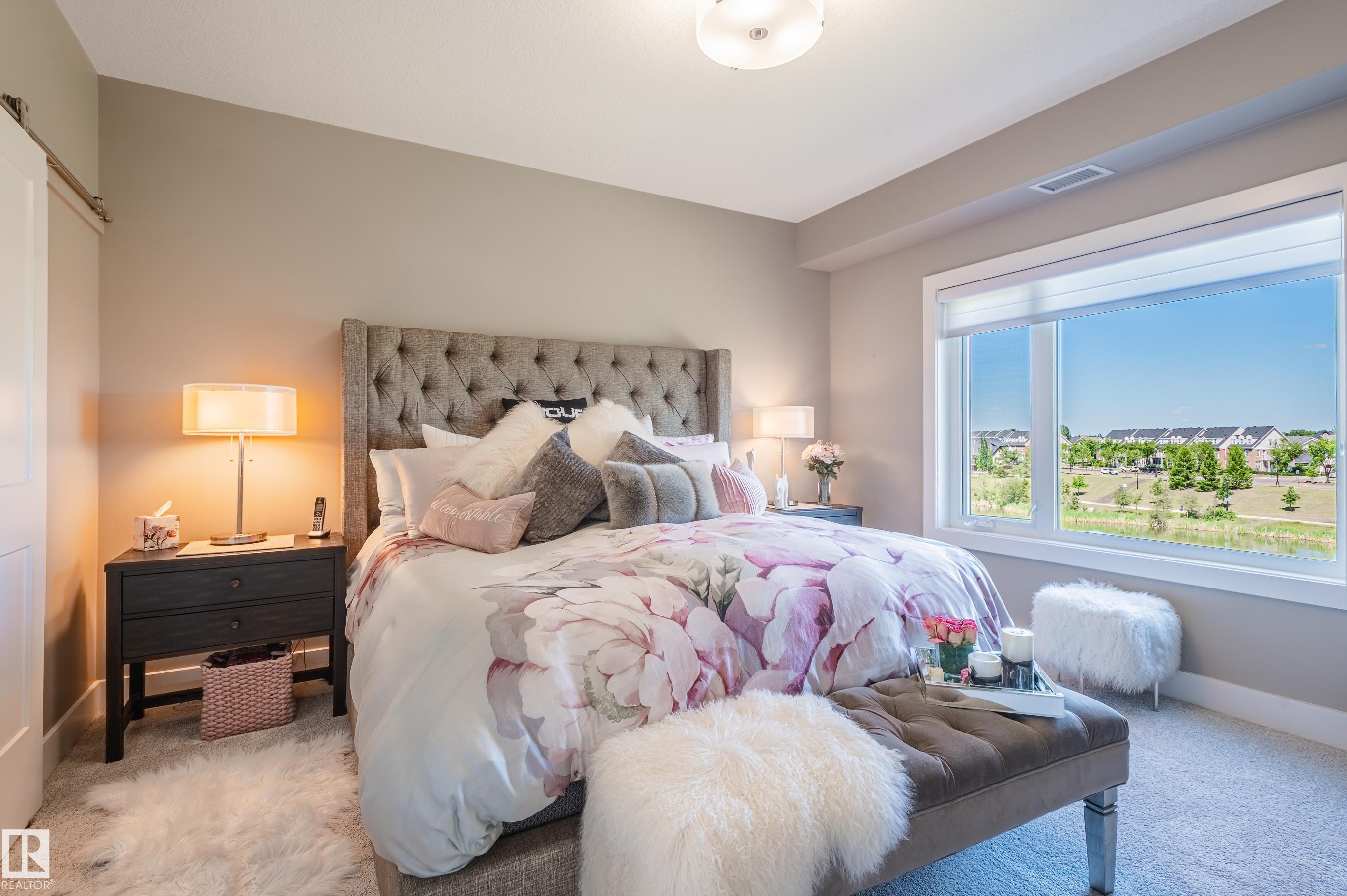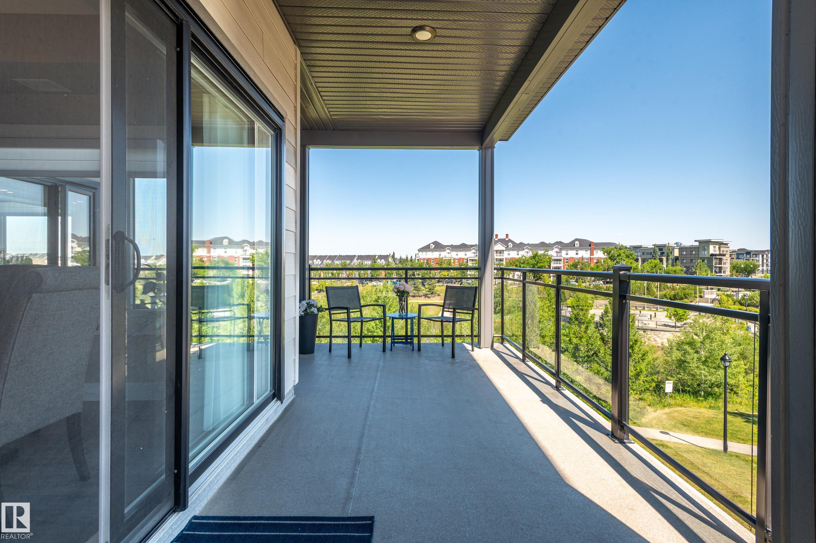 Extensively upgraded lake-facing corner unit in sought-after Veritas, offering awe-inspiring views from every angle. This immaculate one-owner home features 2 spacious bdrms, 2 baths, & a bright den. Enjoy sunny mornings & shady evenings on wrap-around deck. The two-tone kitchen is a standout with upgraded appliances, a tile backsplash, & a 6? extended island with added cabinetry on both sides. Designer lighting, magazine-worthy layout & décor, & a spa-inspired ensuite. A/C. Over $25,000 in thoughtful upgrades also include barn doors, premium flooring, custom shower tile, additional quartz countertops, blinds, hardware, & a second (surface) parking stall that adds everyday convenience, plus a heated stall with secure storage. Pride of ownership shines throughout?clean, cozy, and stylish. Located steps from countless amenities in one of Edmonton?s most desirable communities, this home offers a seamless blend of comfort, elegance, and breathtaking views. Style meets serenity in this Griesbach gem!