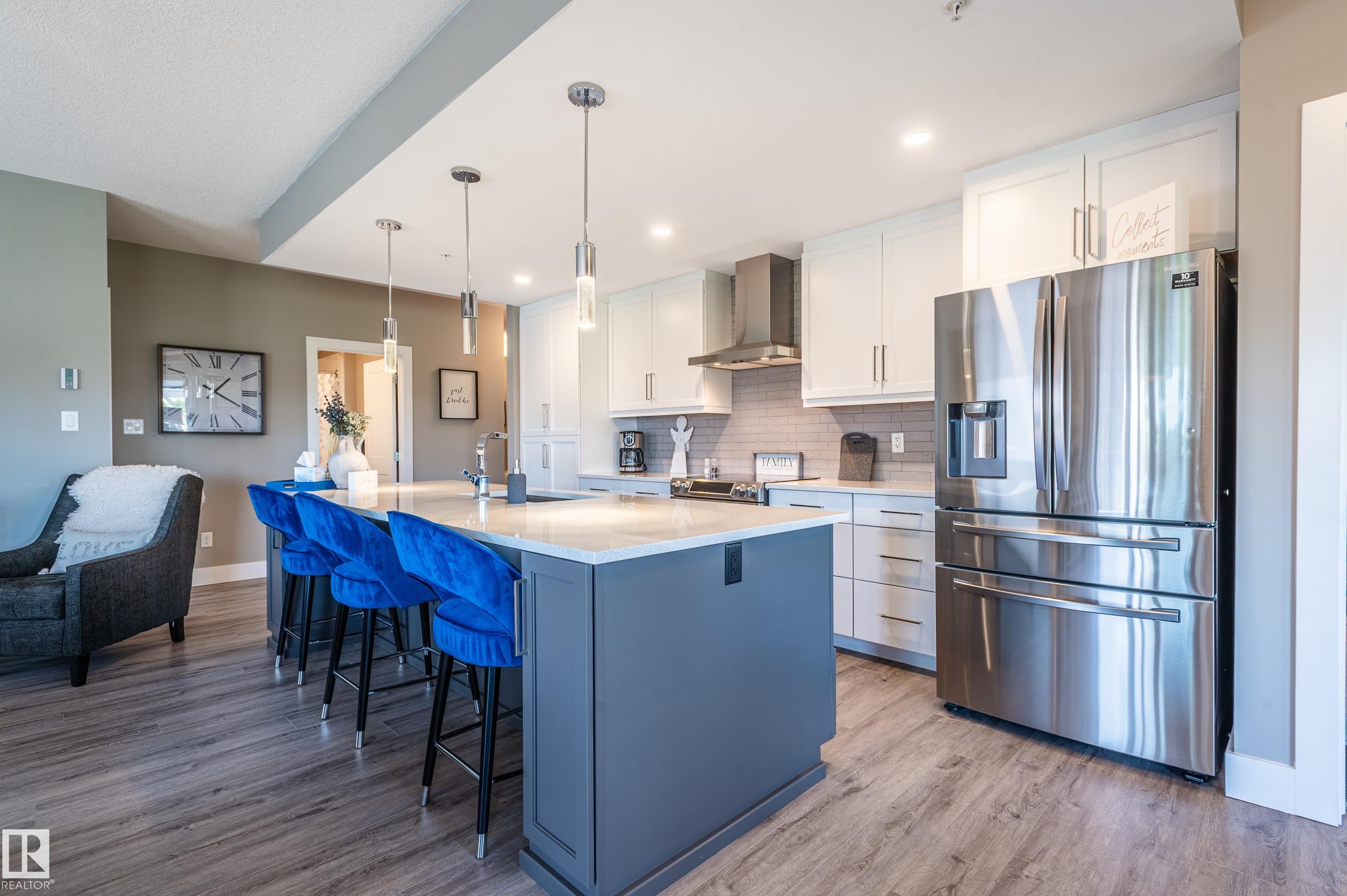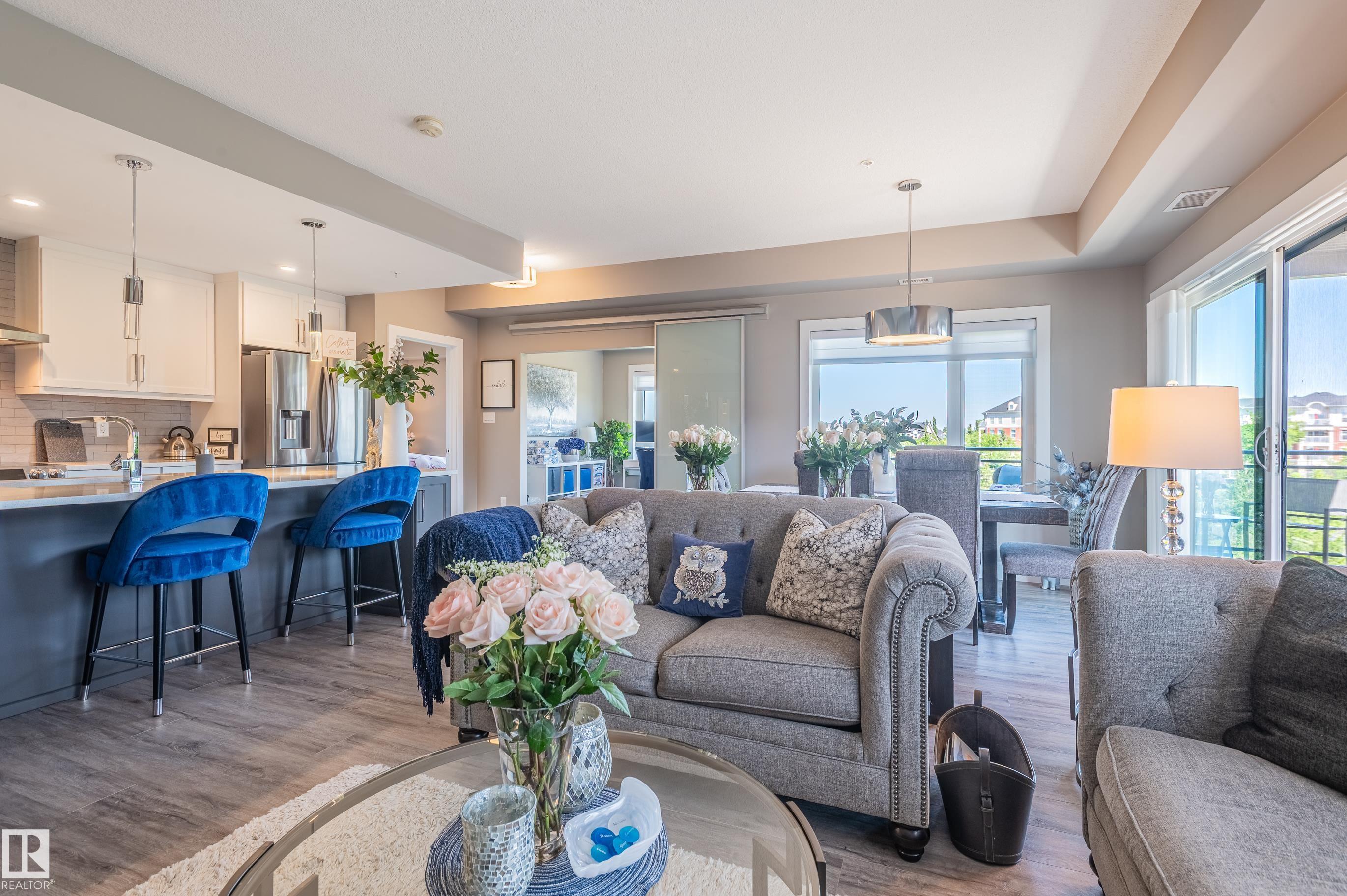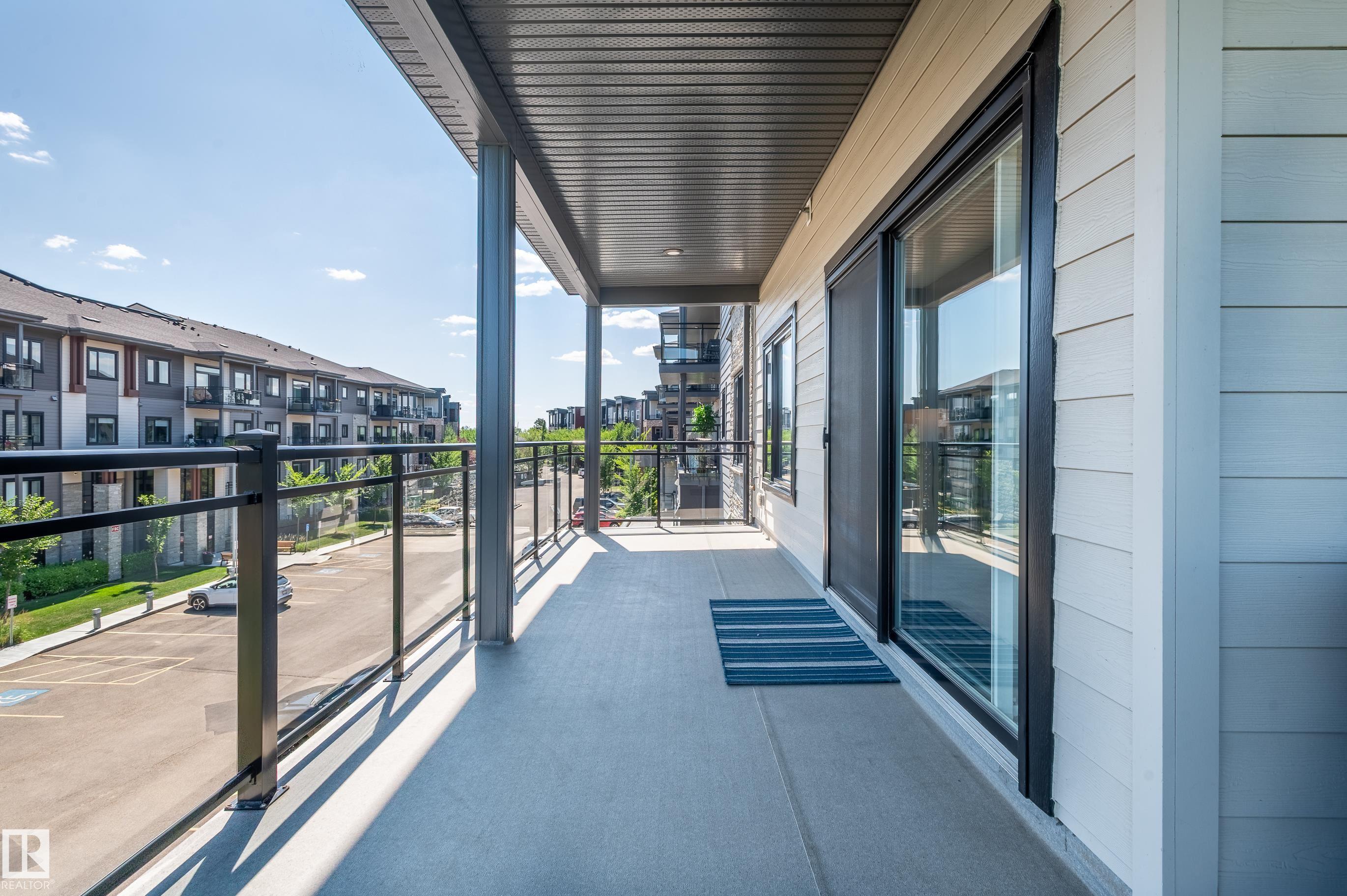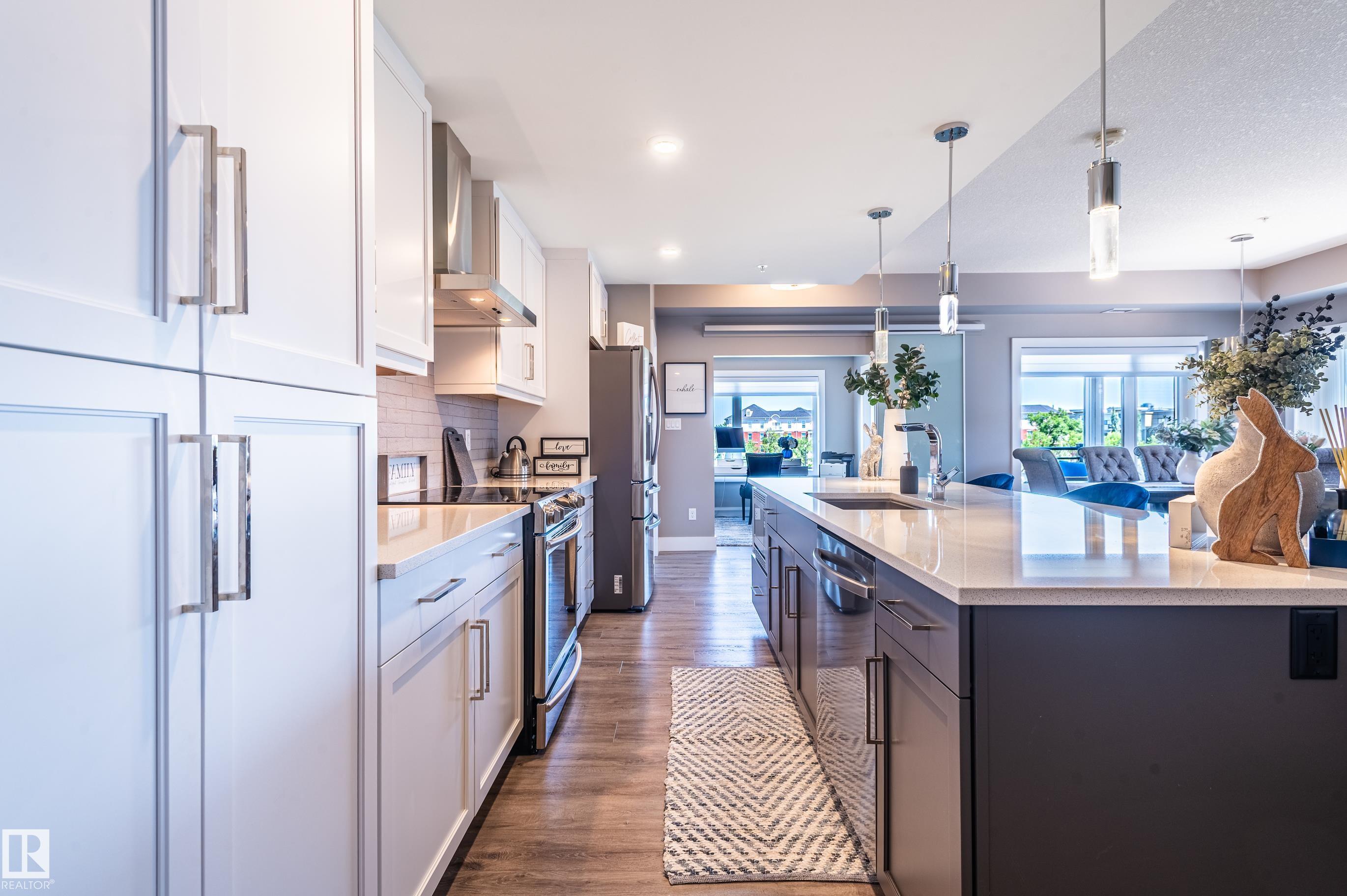 Extensively upgraded lake-facing corner unit in sought-after Veritas, offering awe-inspiring views from every angle. This immaculate one-owner home features 2 spacious bdrms, 2 baths, & a bright den. Enjoy sunny mornings & shady evenings on wrap-around deck. The two-tone kitchen is a standout with upgraded appliances, a tile backsplash, & a 6? extended island with added cabinetry on both sides. Designer lighting, magazine-worthy layout & décor, & a spa-inspired ensuite. A/C. Over $25,000 in thoughtful upgrades also include barn doors, premium flooring, custom shower tile, additional quartz countertops, blinds, hardware, & a second (surface) parking stall that adds everyday convenience, plus a heated stall with secure storage. Pride of ownership shines throughout?clean, cozy, and stylish. Located steps from countless amenities in one of Edmonton?s most desirable communities, this home offers a seamless blend of comfort, elegance, and breathtaking views. Style meets serenity in this Griesbach gem!