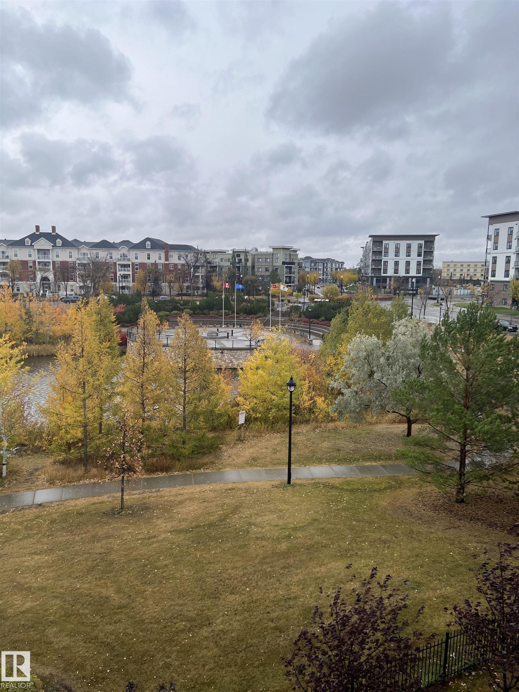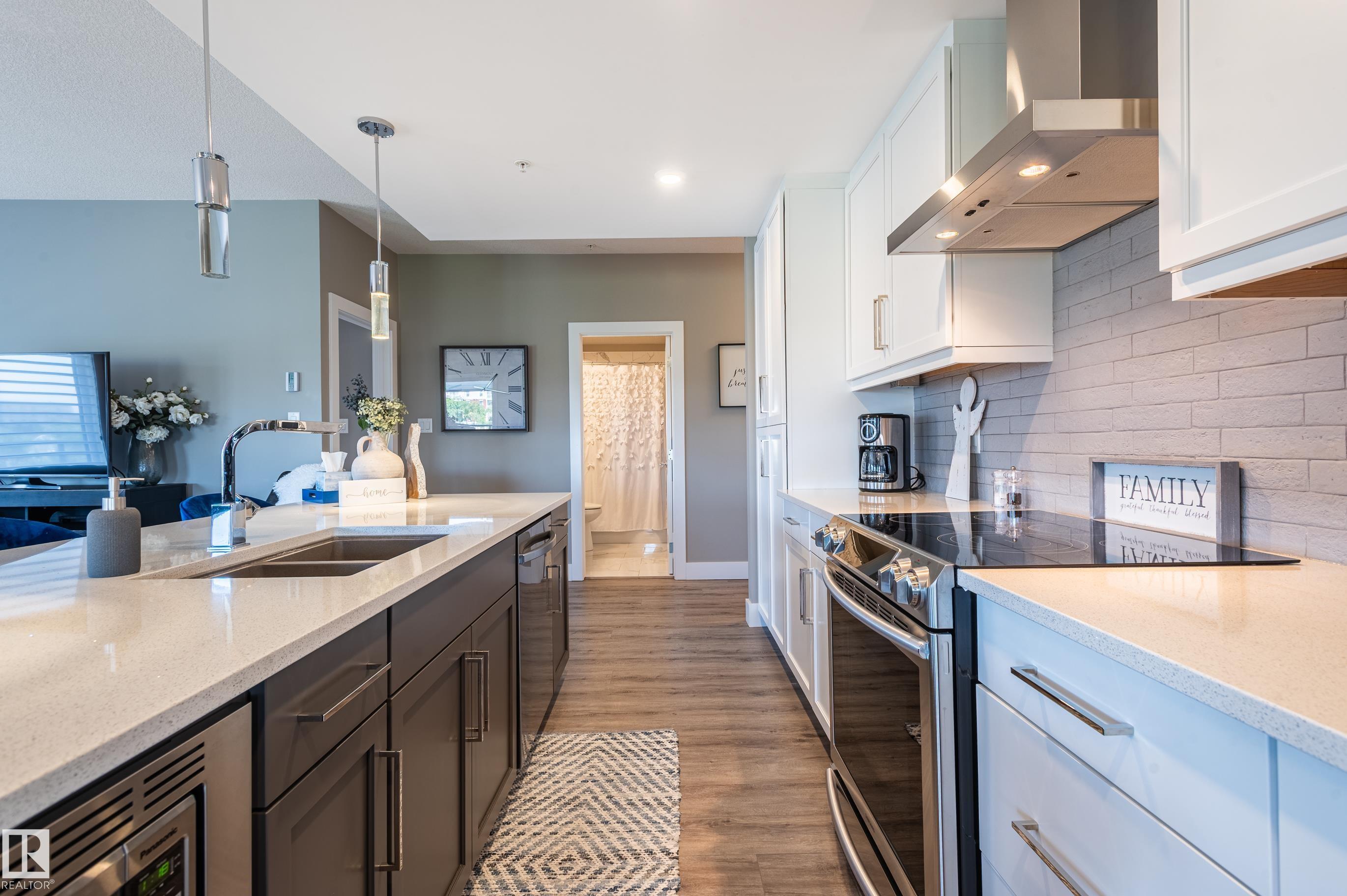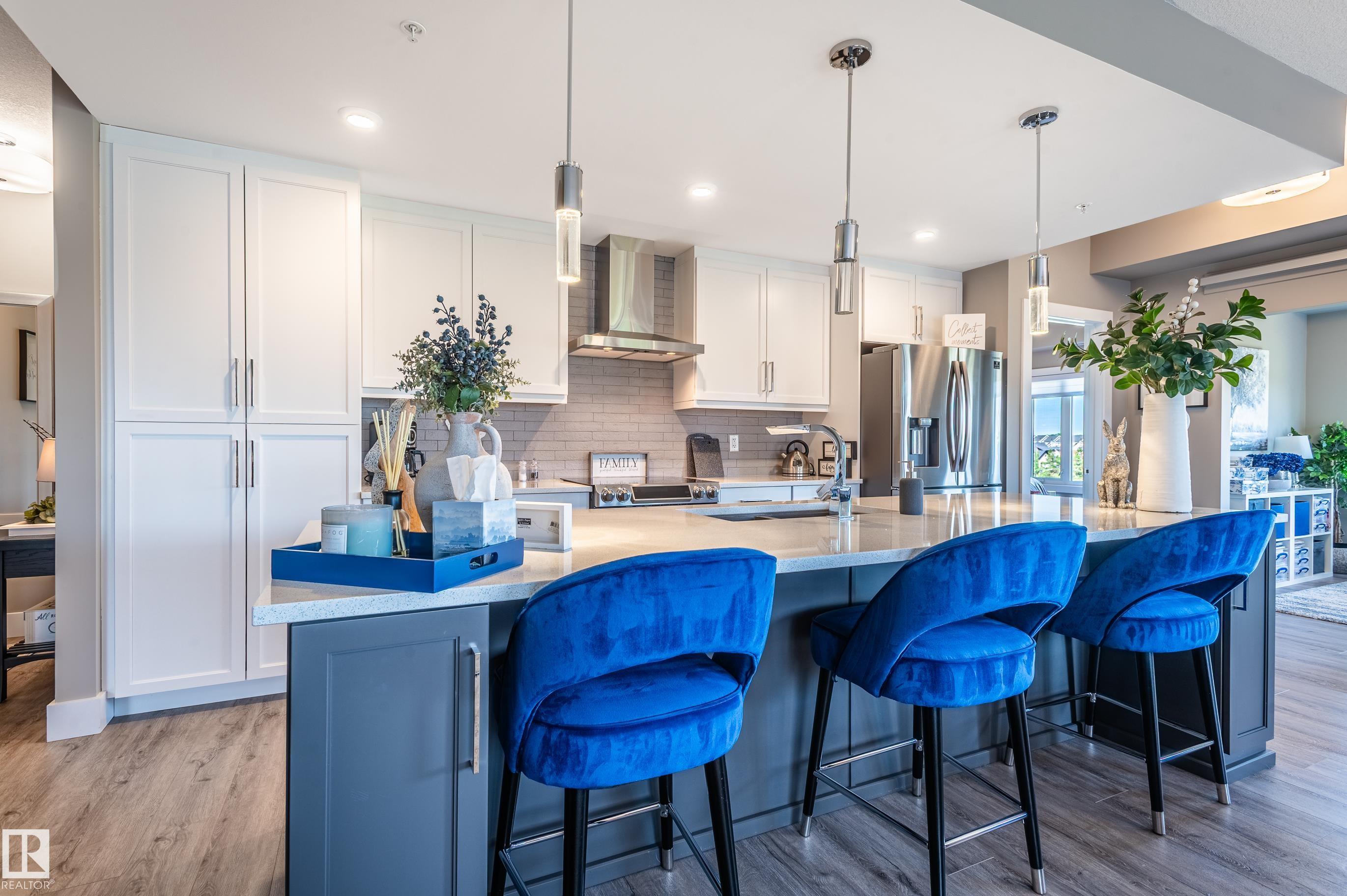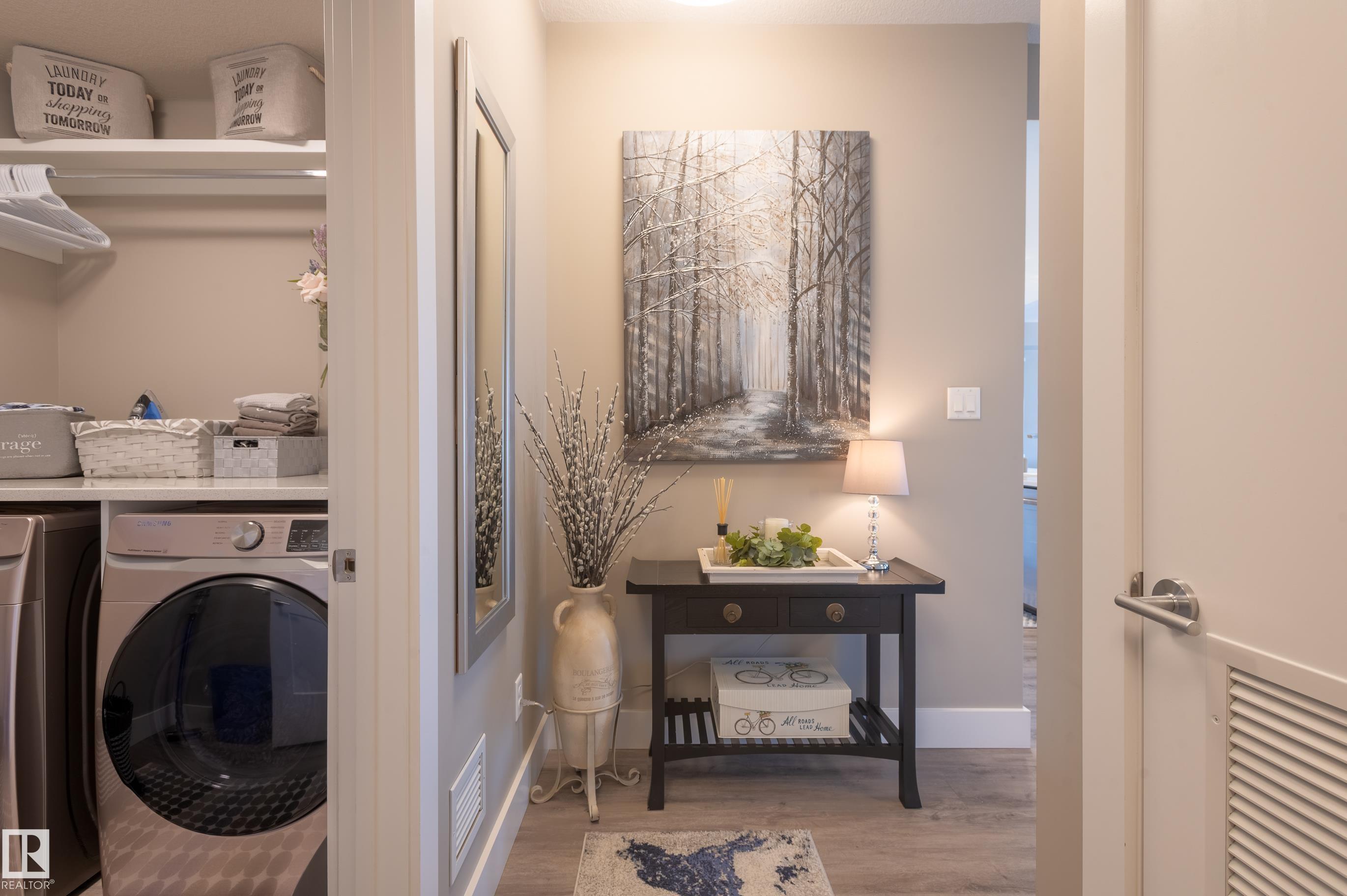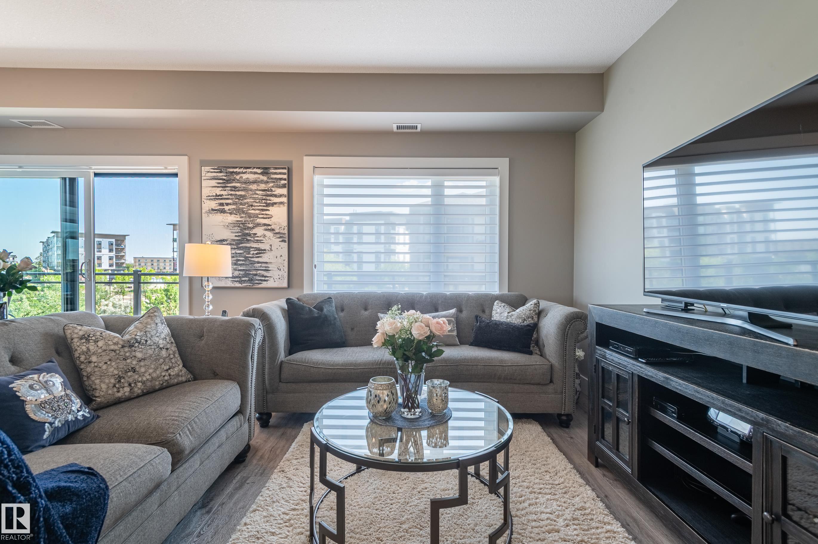 Extensively upgraded lake-facing corner unit in sought-after Veritas, offering awe-inspiring views from every angle. This immaculate one-owner home features 2 spacious bdrms, 2 baths, & a bright den. Enjoy sunny mornings & shady evenings on wrap-around deck. The two-tone kitchen is a standout with upgraded appliances, a tile backsplash, & a 6? extended island with added cabinetry on both sides. Designer lighting, magazine-worthy layout & décor, & a spa-inspired ensuite. A/C. Over $25,000 in thoughtful upgrades also include barn doors, premium flooring, custom shower tile, additional quartz countertops, blinds, hardware, & a second (surface) parking stall that adds everyday convenience, plus a heated stall with secure storage. Pride of ownership shines throughout?clean, cozy, and stylish. Located steps from countless amenities in one of Edmonton?s most desirable communities, this home offers a seamless blend of comfort, elegance, and breathtaking views. Style meets serenity in this Griesbach gem!