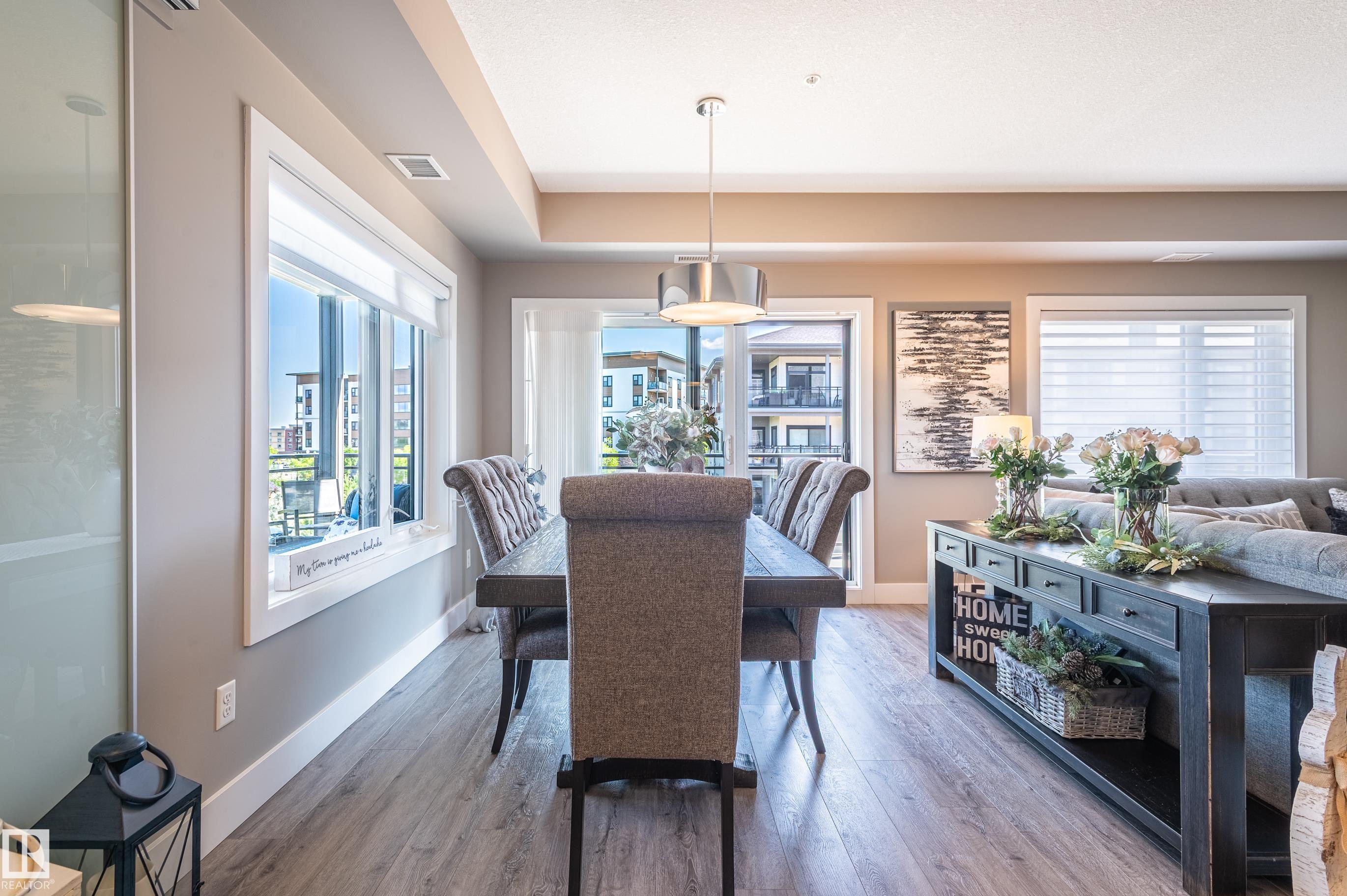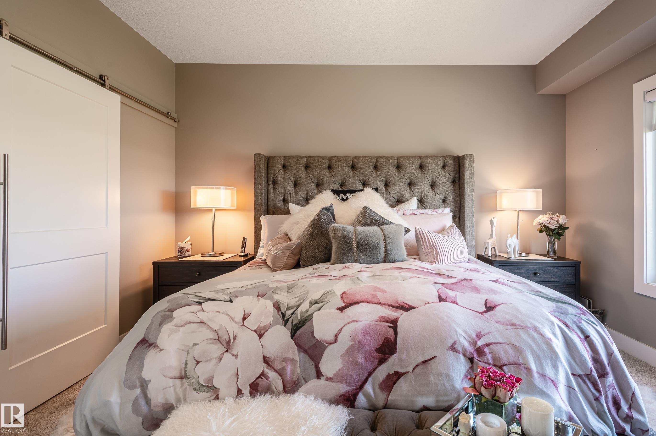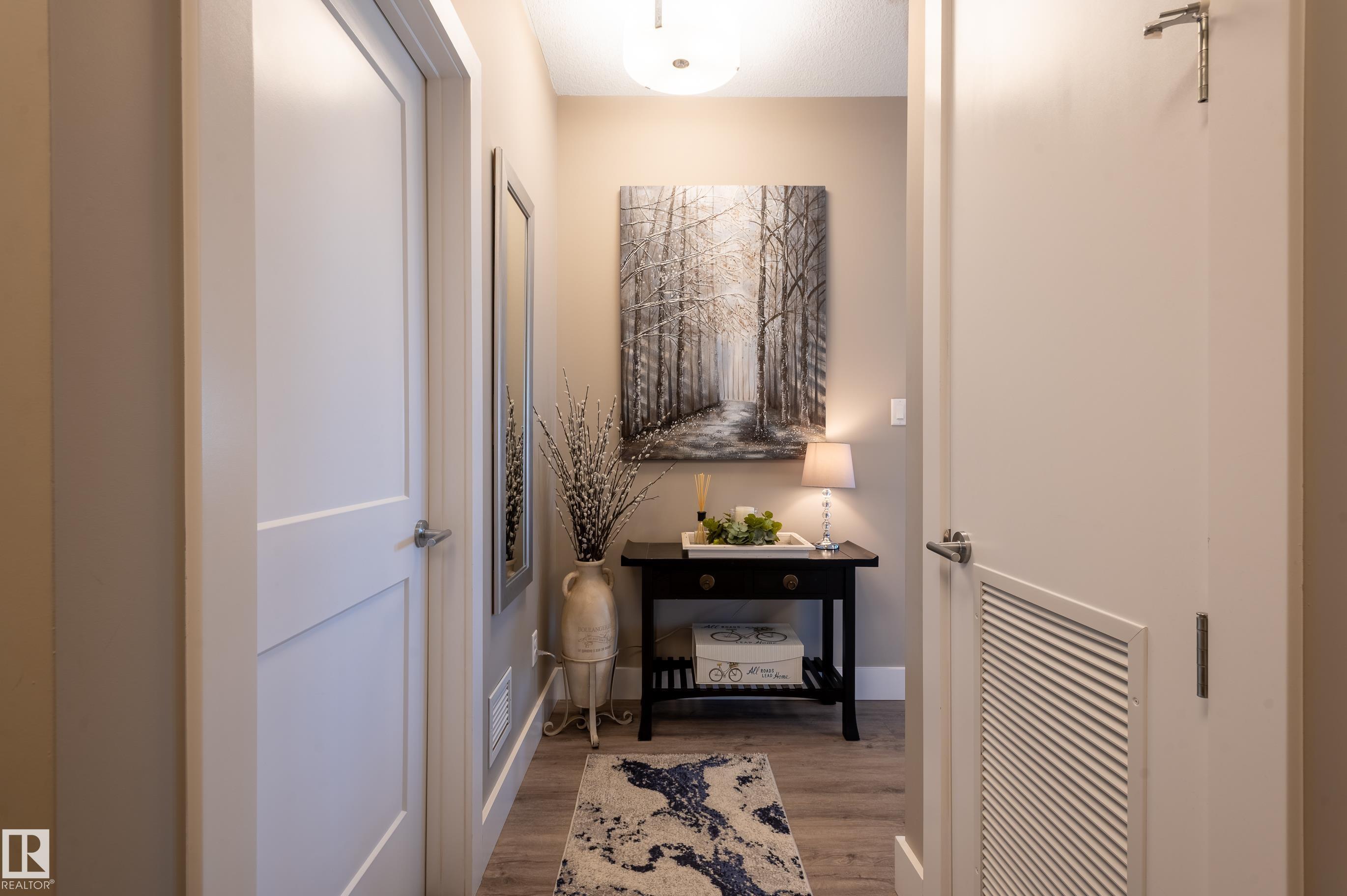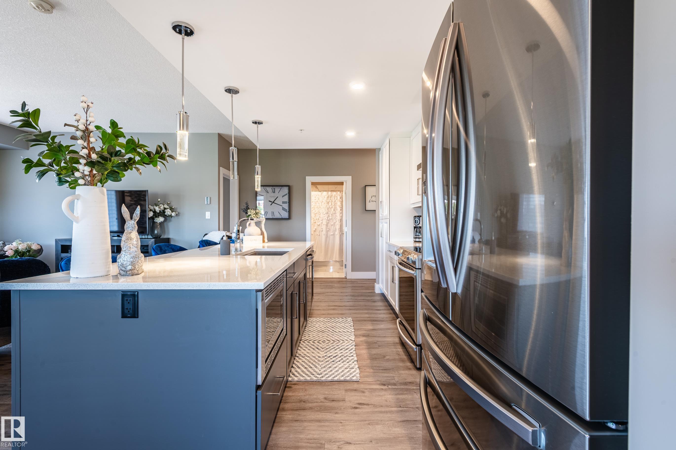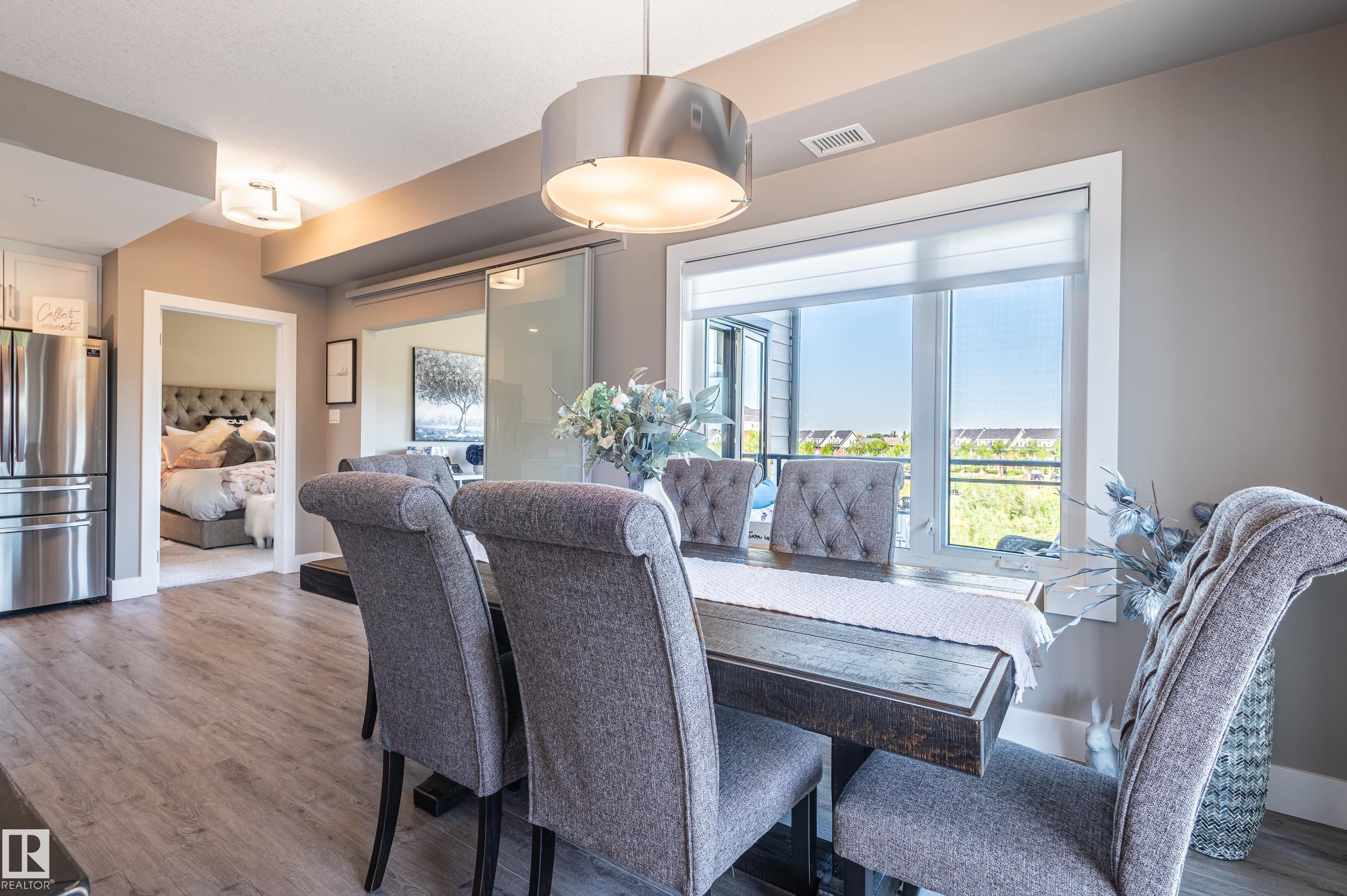 Extensively upgraded lake-facing corner unit in sought-after Veritas, offering awe-inspiring views from every angle. This immaculate one-owner home features 2 spacious bdrms, 2 baths, & a bright den. Enjoy sunny mornings & shady evenings on wrap-around deck. The two-tone kitchen is a standout with upgraded appliances, a tile backsplash, & a 6? extended island with added cabinetry on both sides. Designer lighting, magazine-worthy layout & décor, & a spa-inspired ensuite. A/C. Over $25,000 in thoughtful upgrades also include barn doors, premium flooring, custom shower tile, additional quartz countertops, blinds, hardware, & a second (surface) parking stall that adds everyday convenience, plus a heated stall with secure storage. Pride of ownership shines throughout?clean, cozy, and stylish. Located steps from countless amenities in one of Edmonton?s most desirable communities, this home offers a seamless blend of comfort, elegance, and breathtaking views. Style meets serenity in this Griesbach gem!