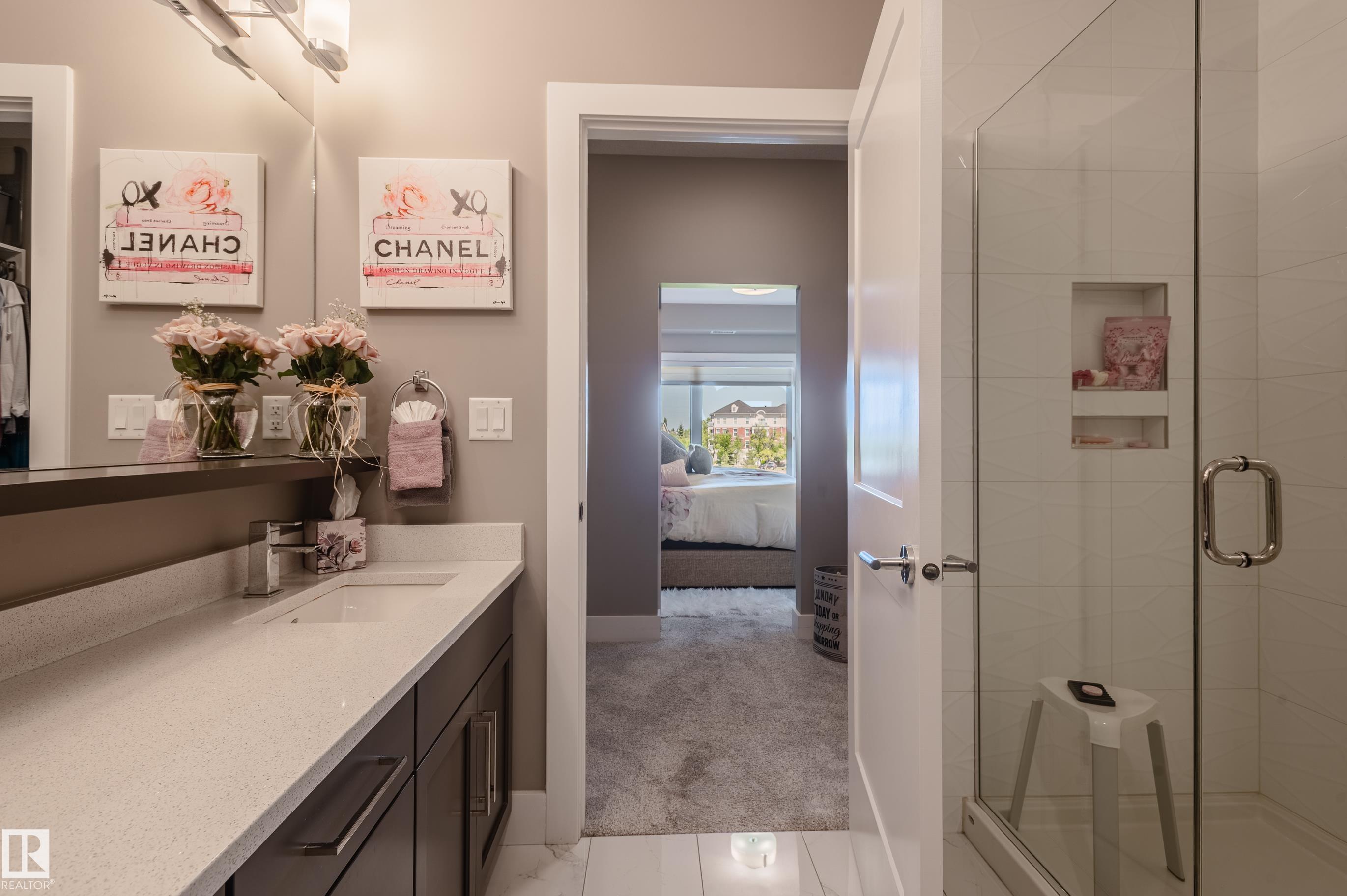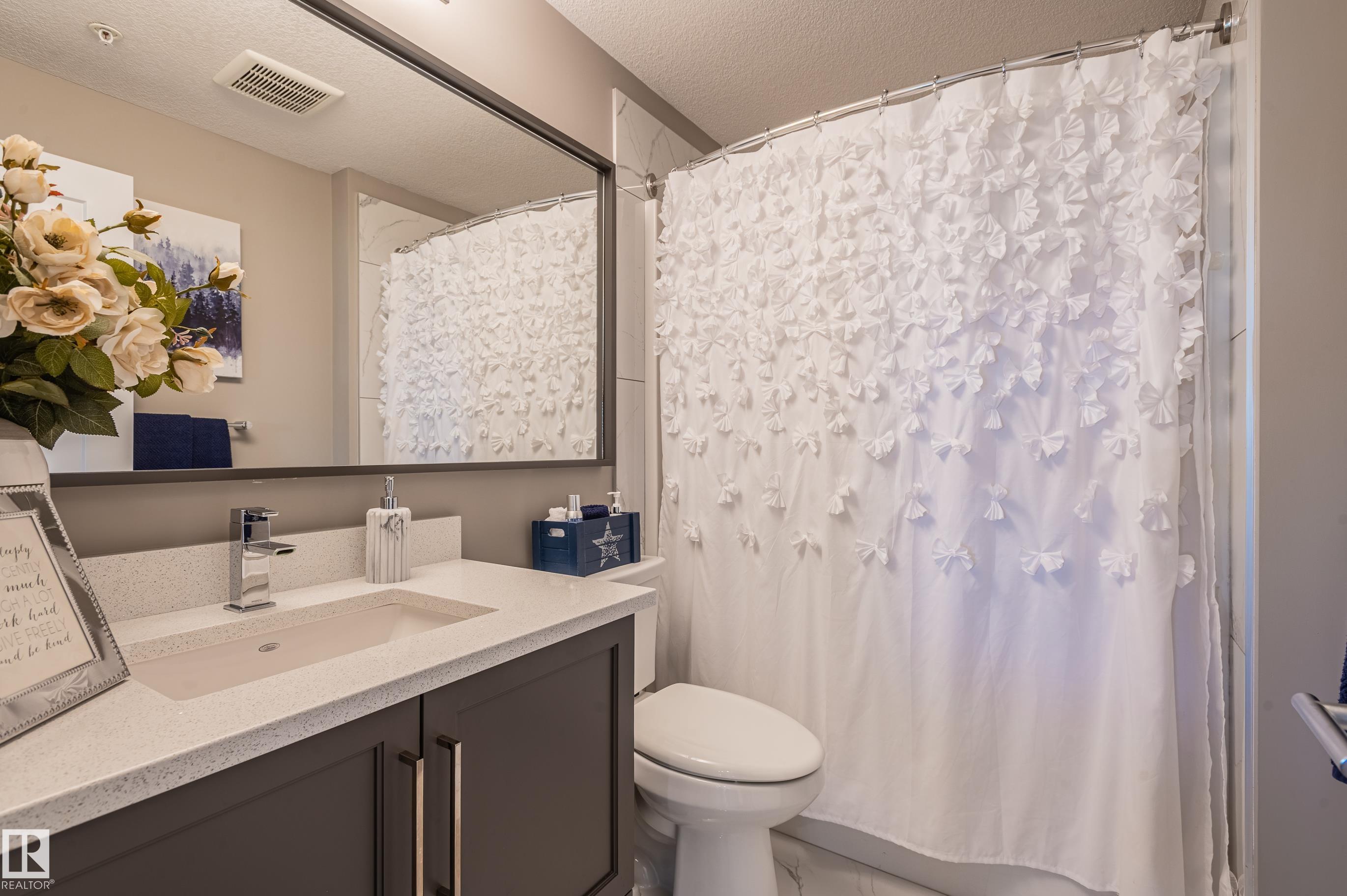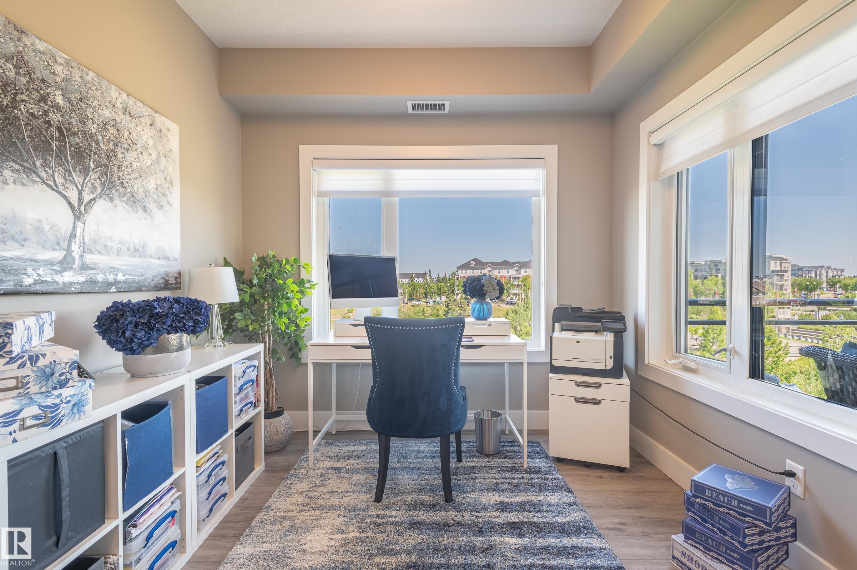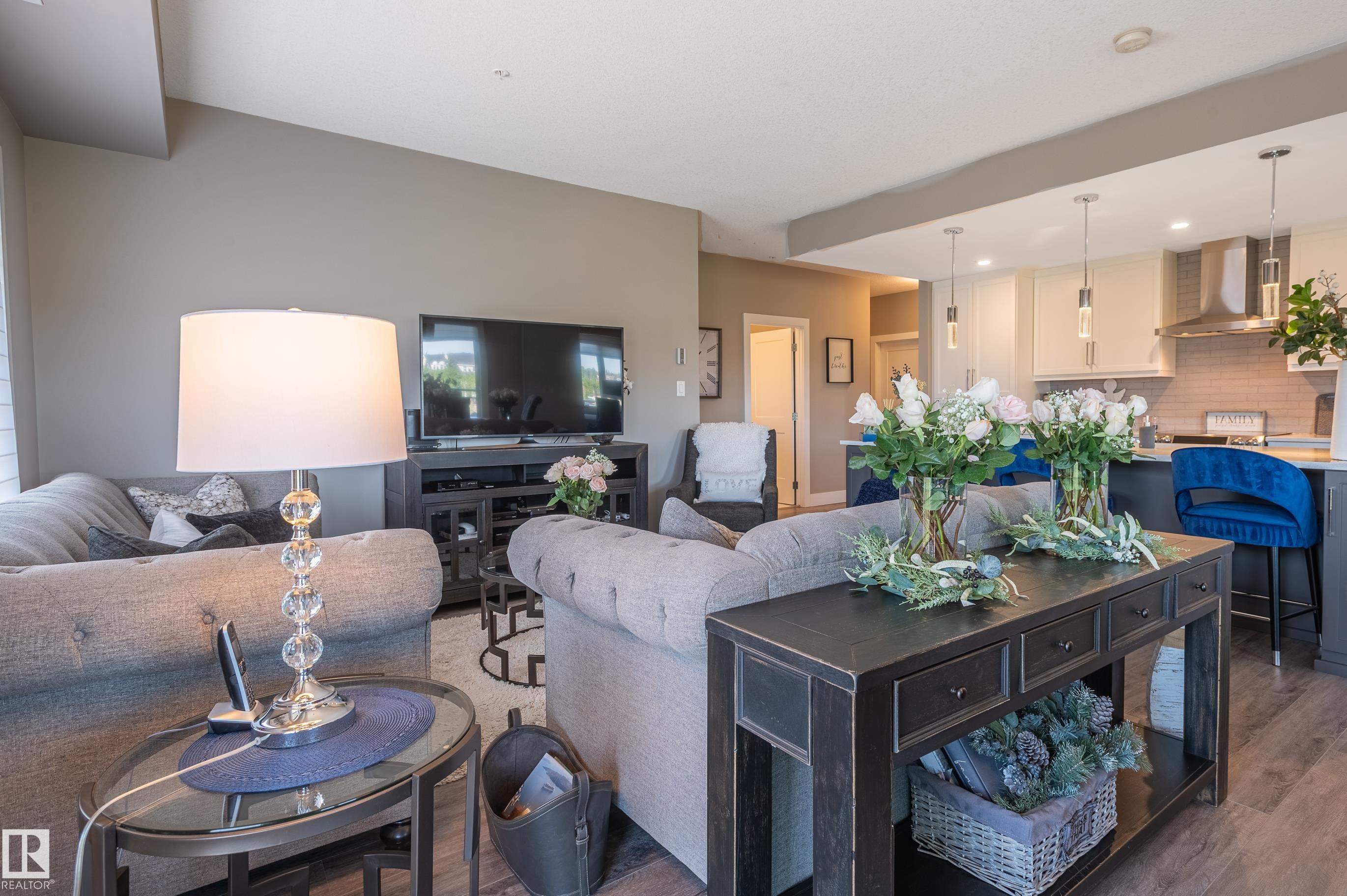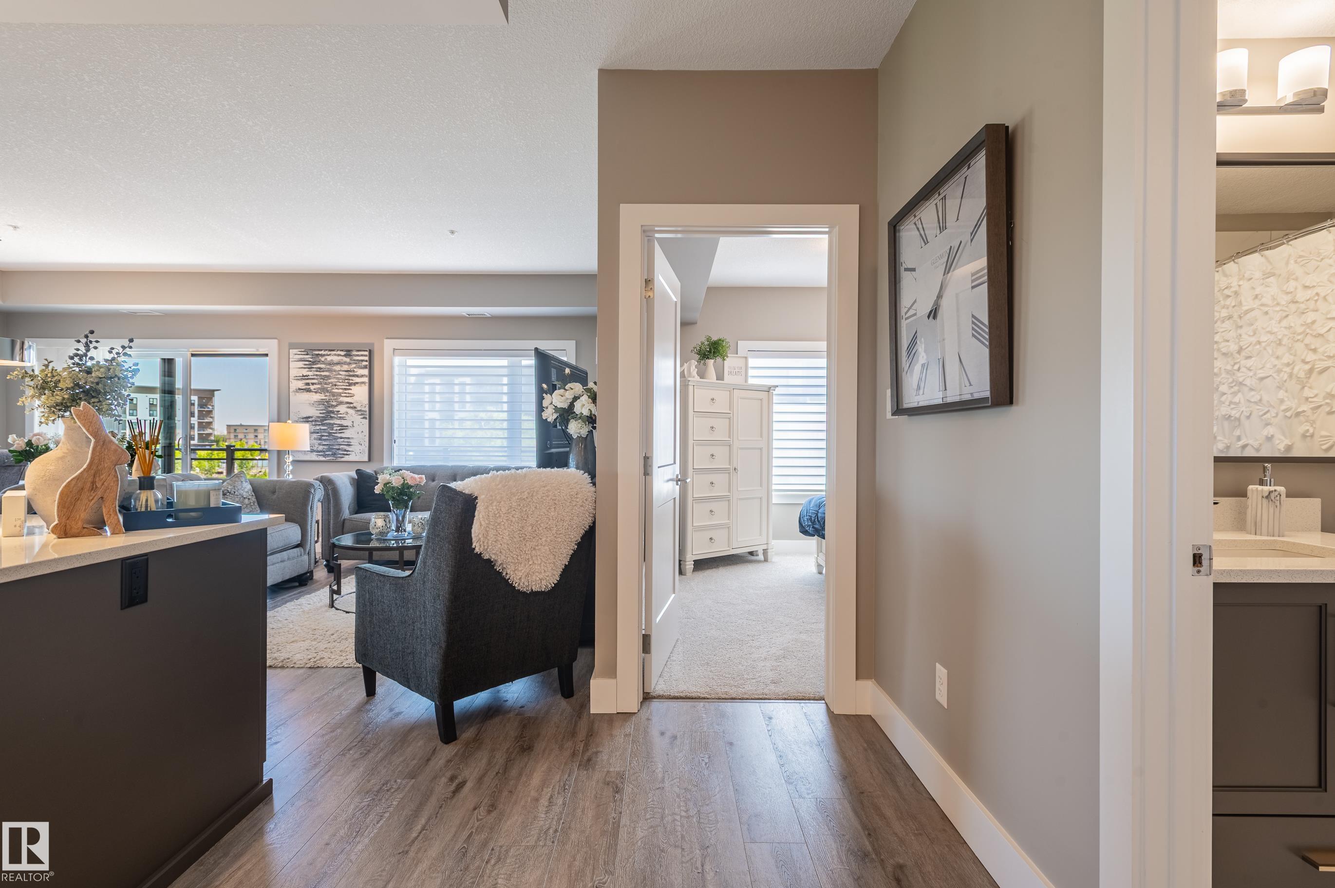 Extensively upgraded lake-facing corner unit in sought-after Veritas, offering awe-inspiring views from every angle. This immaculate one-owner home features 2 spacious bdrms, 2 baths, & a bright den. Enjoy sunny mornings & shady evenings on wrap-around deck. The two-tone kitchen is a standout with upgraded appliances, a tile backsplash, & a 6? extended island with added cabinetry on both sides. Designer lighting, magazine-worthy layout & décor, & a spa-inspired ensuite. A/C. Over $25,000 in thoughtful upgrades also include barn doors, premium flooring, custom shower tile, additional quartz countertops, blinds, hardware, & a second (surface) parking stall that adds everyday convenience, plus a heated stall with secure storage. Pride of ownership shines throughout?clean, cozy, and stylish. Located steps from countless amenities in one of Edmonton?s most desirable communities, this home offers a seamless blend of comfort, elegance, and breathtaking views. Style meets serenity in this Griesbach gem!