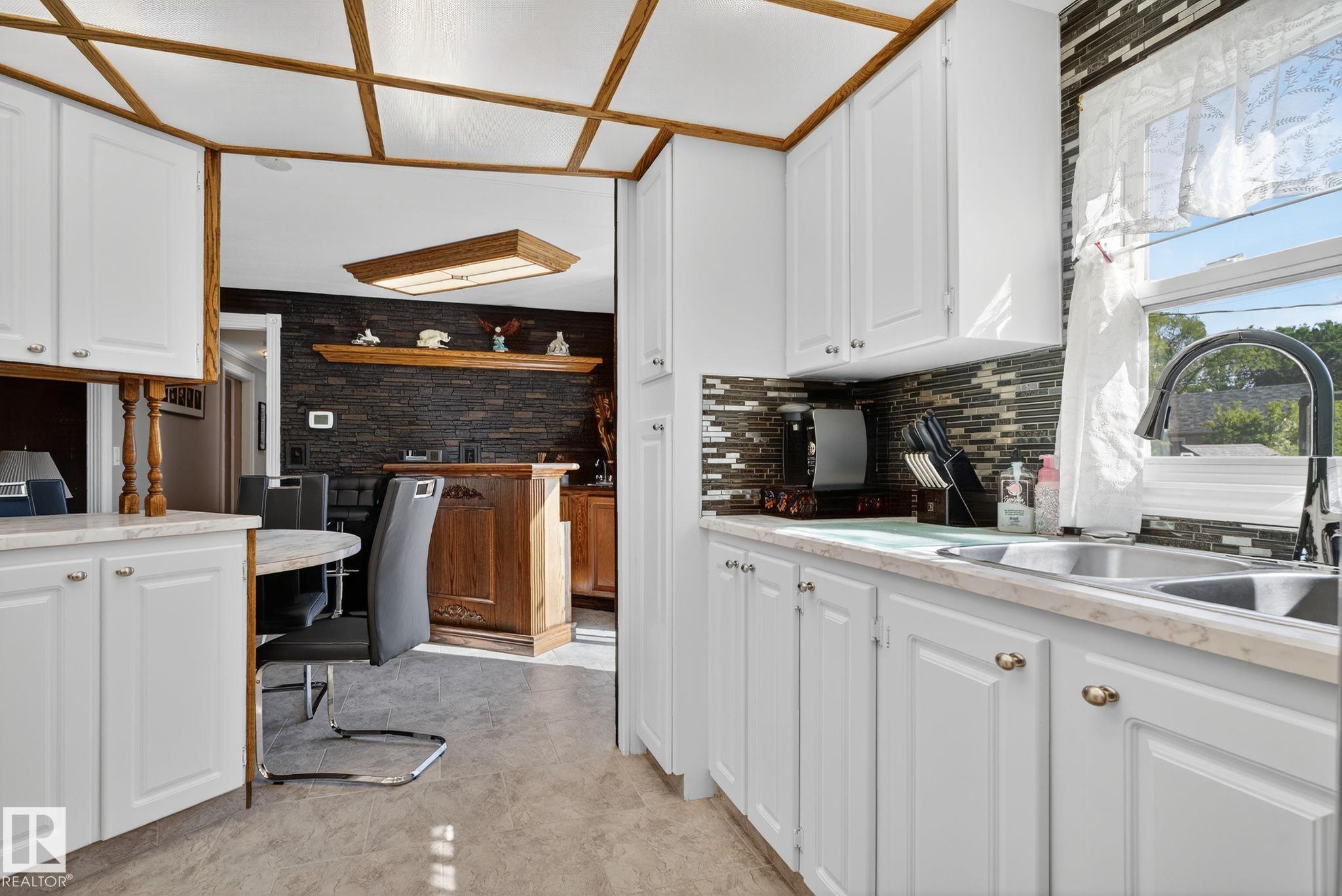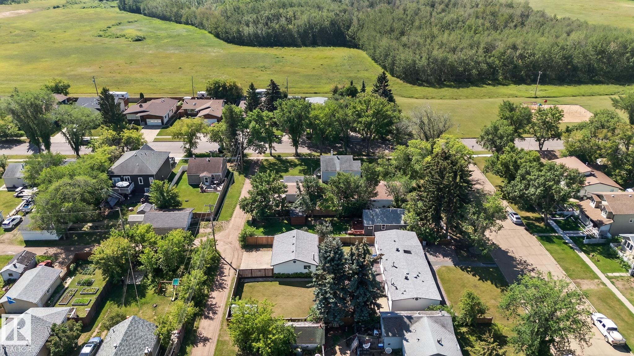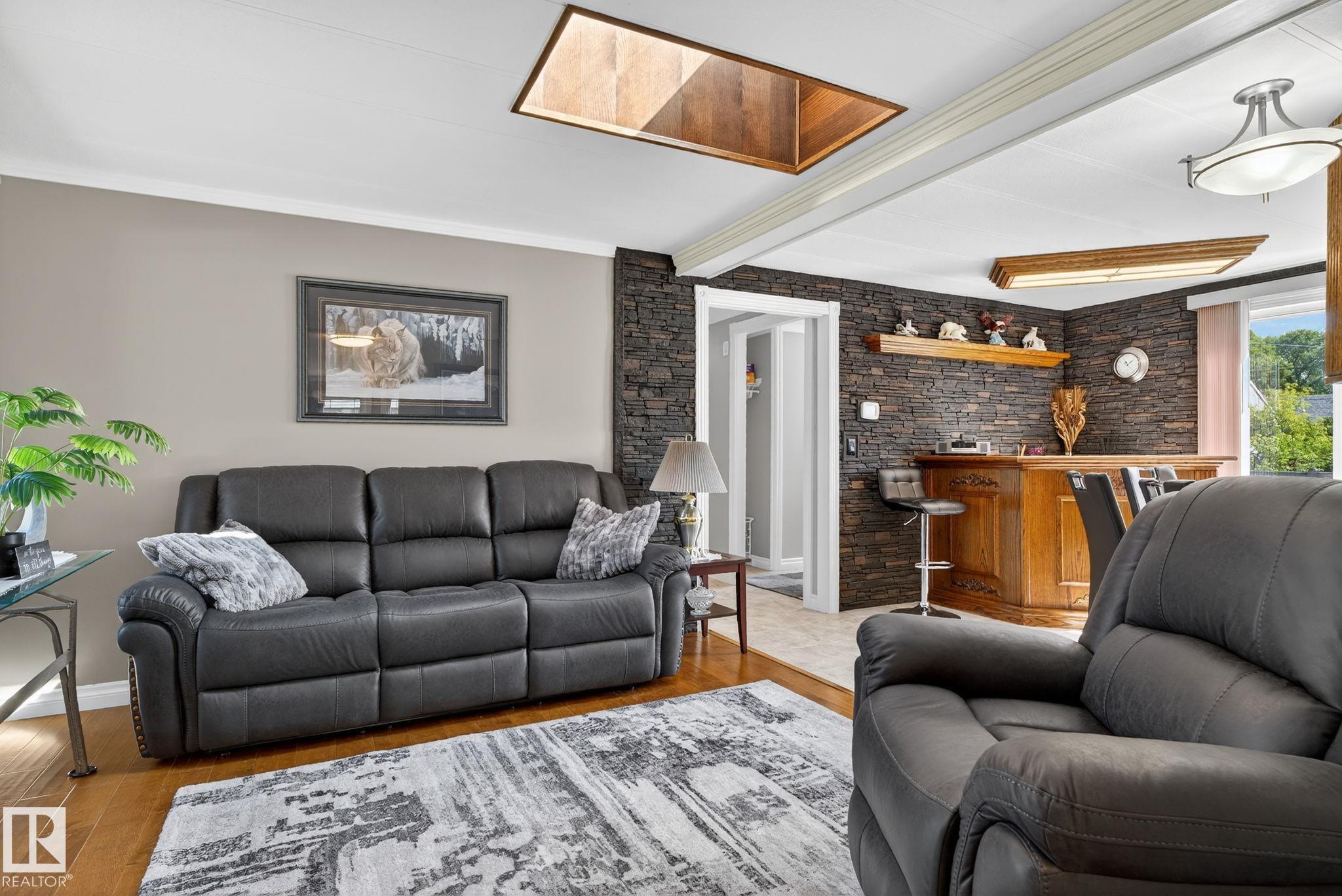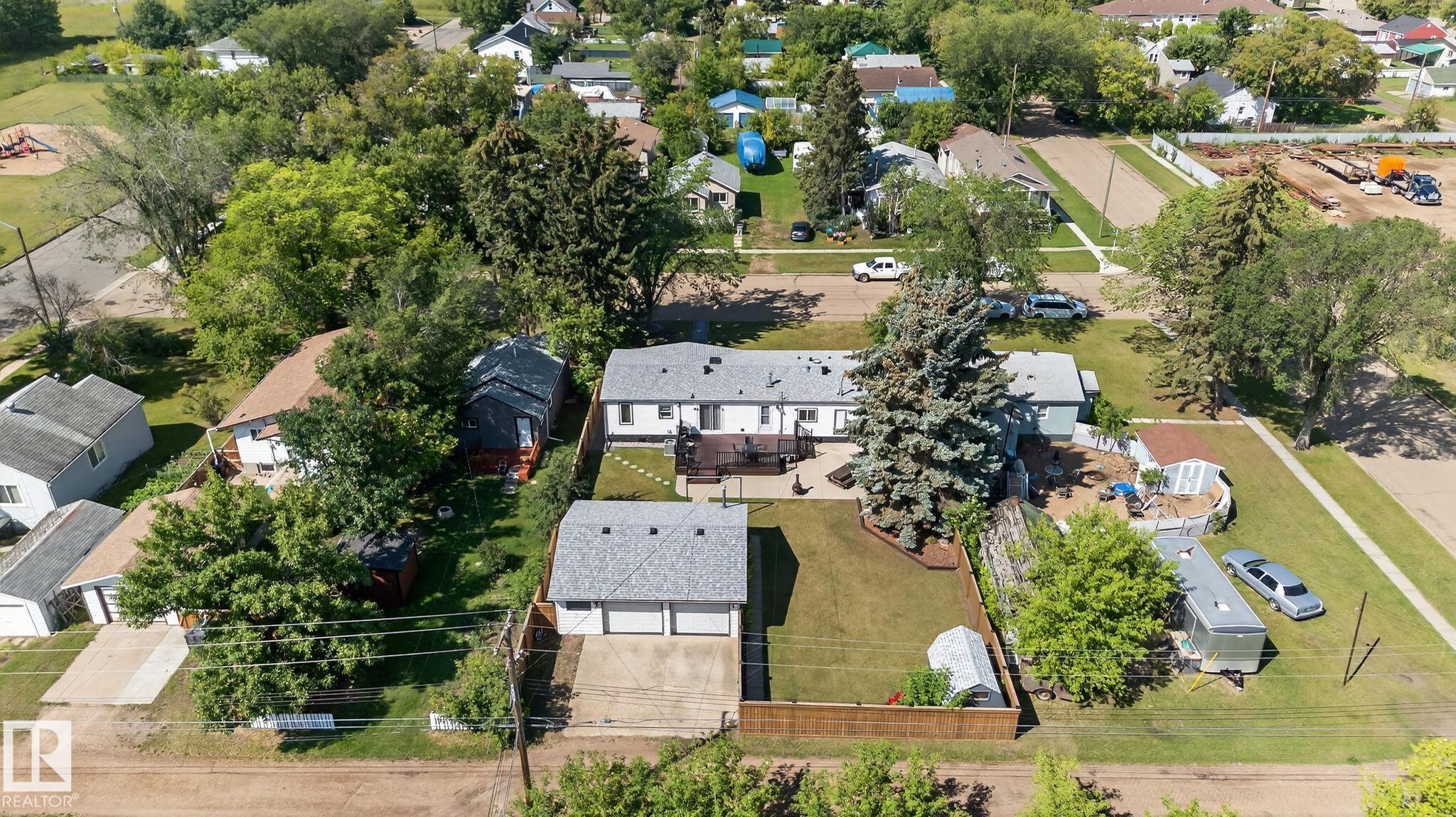 Welcome to this beautifully maintained home in the heart of Redwater. Pride of ownership is evident throughout this extensively updated property, set on an IMPRESSIVE 9,100 sq ft DOUBLE LOT?a rare gem offering space, privacy, and a peaceful, tree-lined backdrop. This spacious home features 3 generous bedrooms, 2 full bathrooms, and a bright open-concept layout with large windows, a stunning skylight, and two roomy living areas with a built-in bar?perfect for entertaining. The modern kitchen boasts stainless steel appliances, a large island, and ample storage. Recent upgrades offer peace of mind, including: upgraded electrical systems- newer: windows, furnace, hot water tank and shingles?fresh paint throughout, new carpet in bedrooms, and central A/C. Double insulated for energy efficiency and professionally leveled. Outside, enjoy a HEATED oversized double garage detached, newer deck and fence, and a fully landscaped yard?ideal for relaxed, indoor-outdoor living.