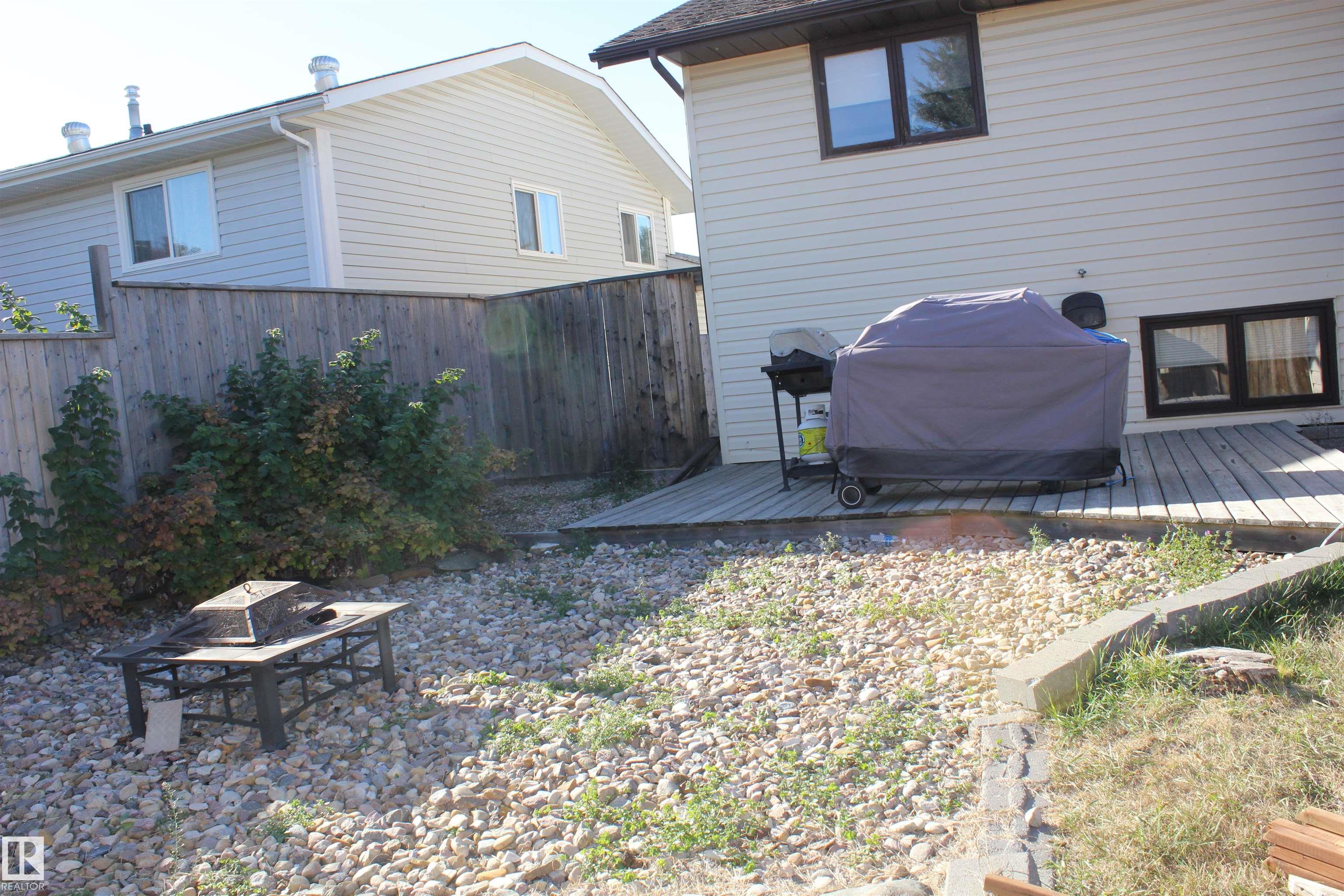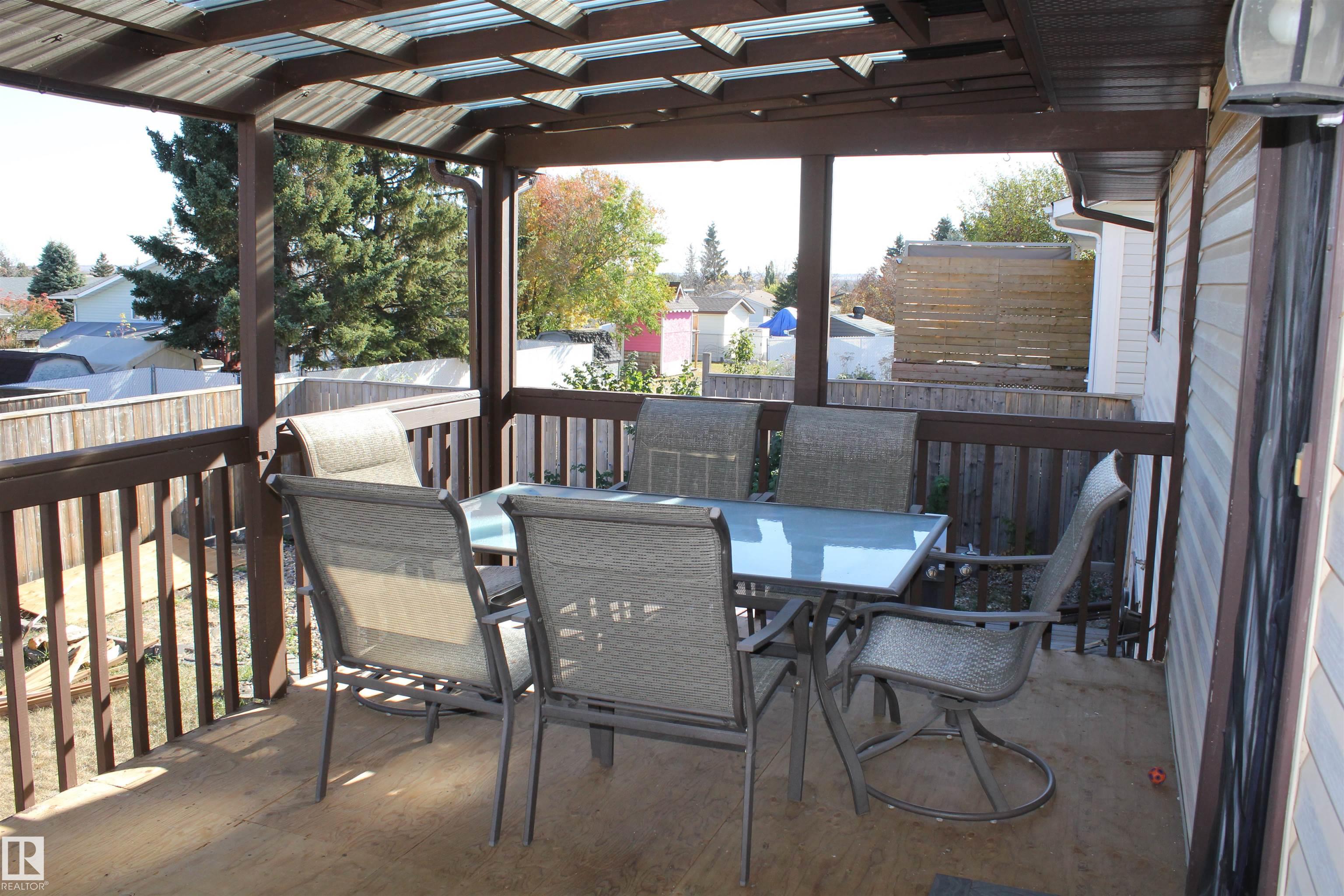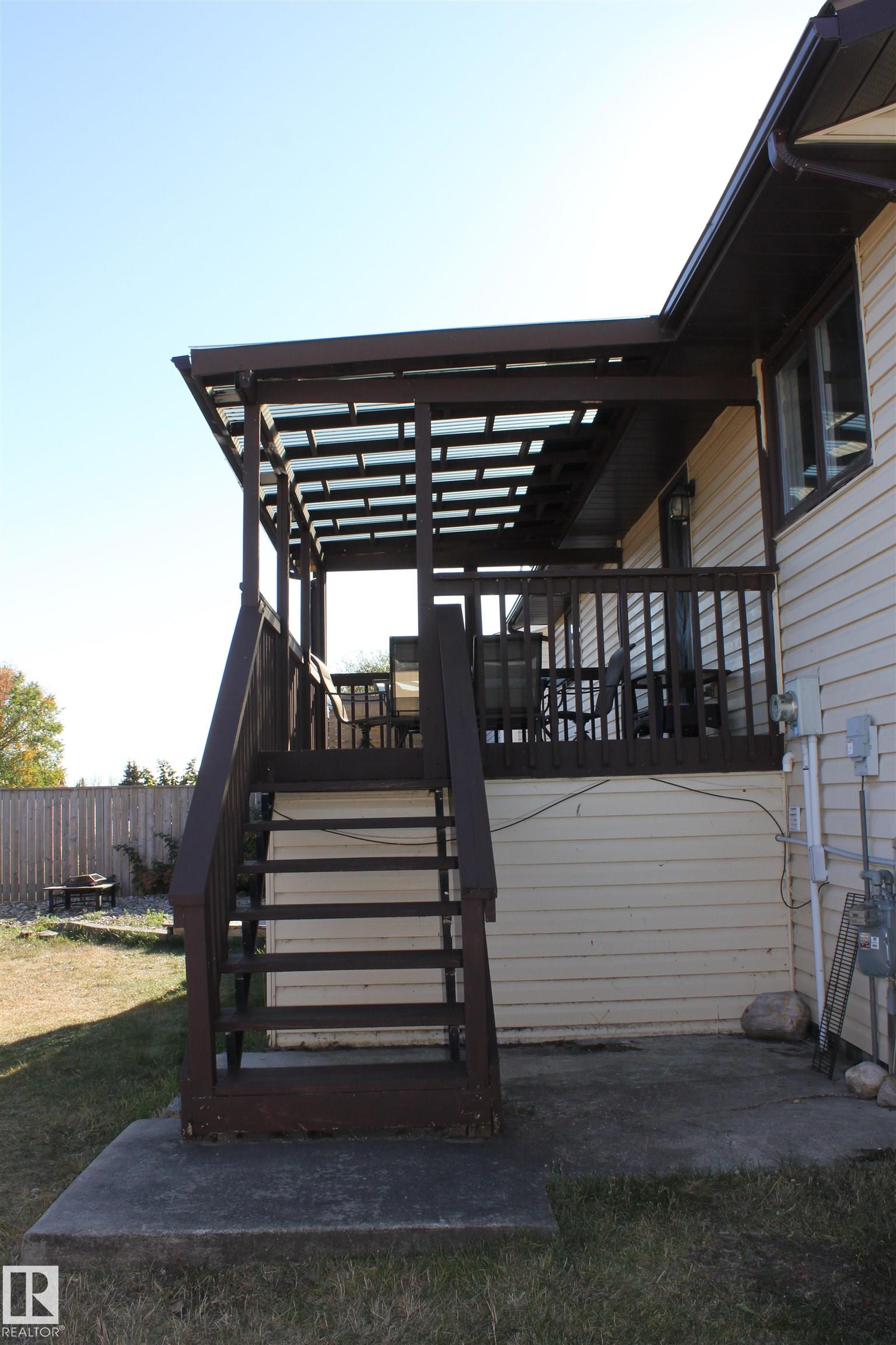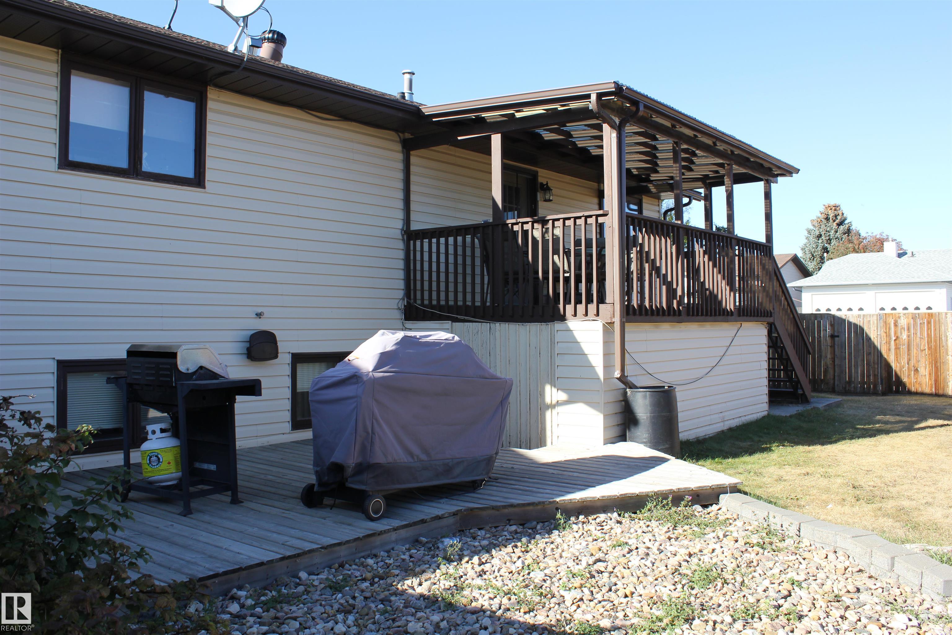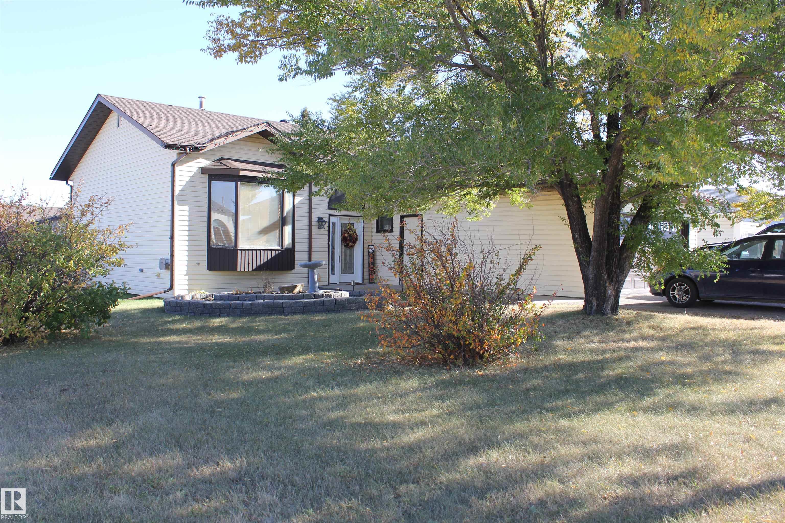 Welcome to the perfect family home in Elk Point. This 1987, 1269 sq ft home is located on a corner lot in a quiet crescent. With five bedrooms and three baths there is room for everyone. The large open concept kitchen, with an island and lots of cabinetry and a good size dining area can accommodate a growing family PLUS there is access to the east facing covered deck. On the main floor is 3 bedrooms and two baths, including a 3pc ensuite and a sunken living room. The fully finished basement boasts a large family room, 2 more bedrooms with large windows, a 3pc. bath, large laundry/utility room with a sink, cupboards and a hook-up for an electric stove, a cold room and tons of storage. To provide warmth and comfort on both levels is a boiler (2012) for hot water heat and under slab heat. The double attached garage has a workshop area and a large garage door. The backyard is fully fenced with 2 gates and provides a private sitting area with a fire pit area and storage under the deck.