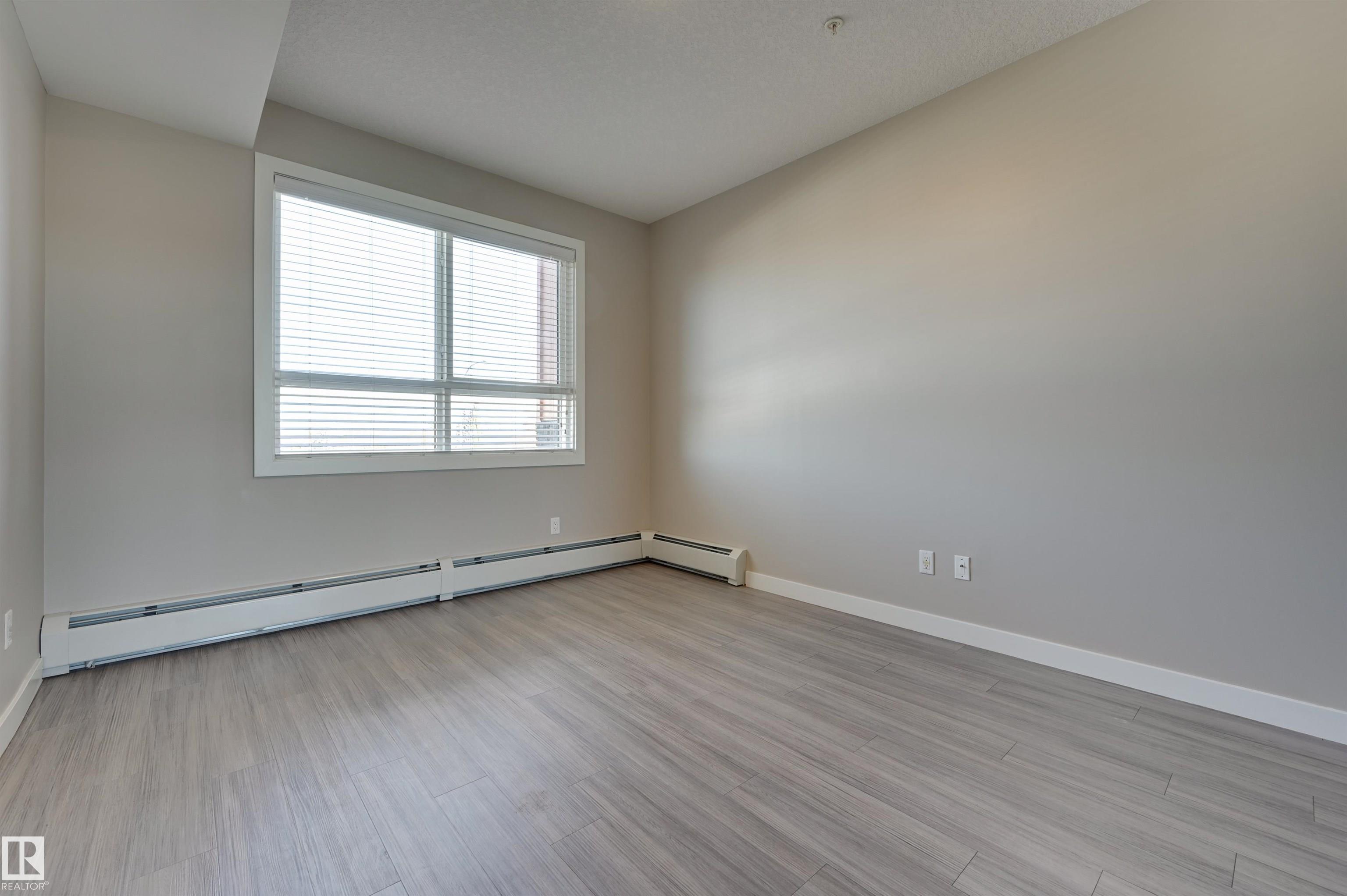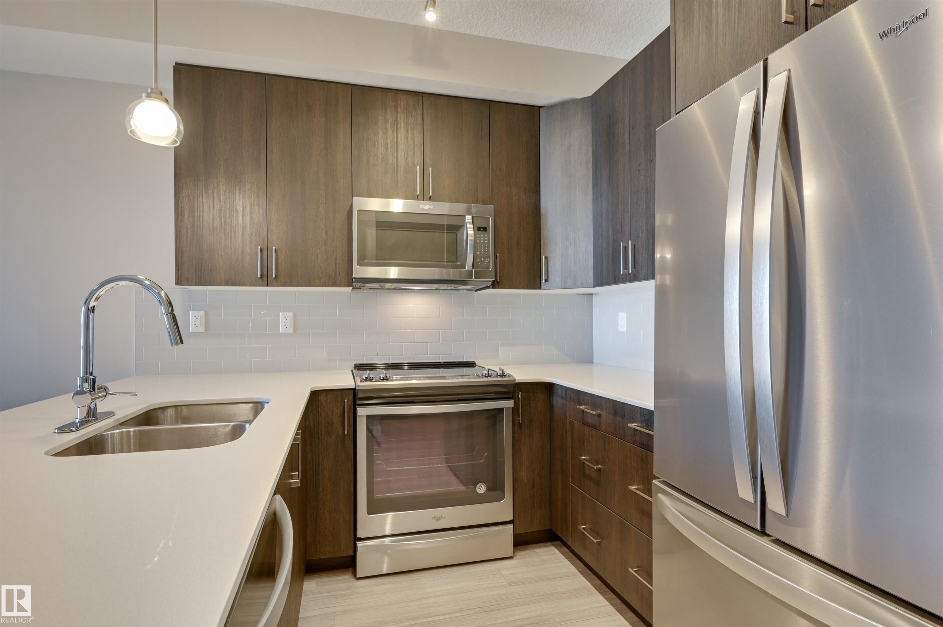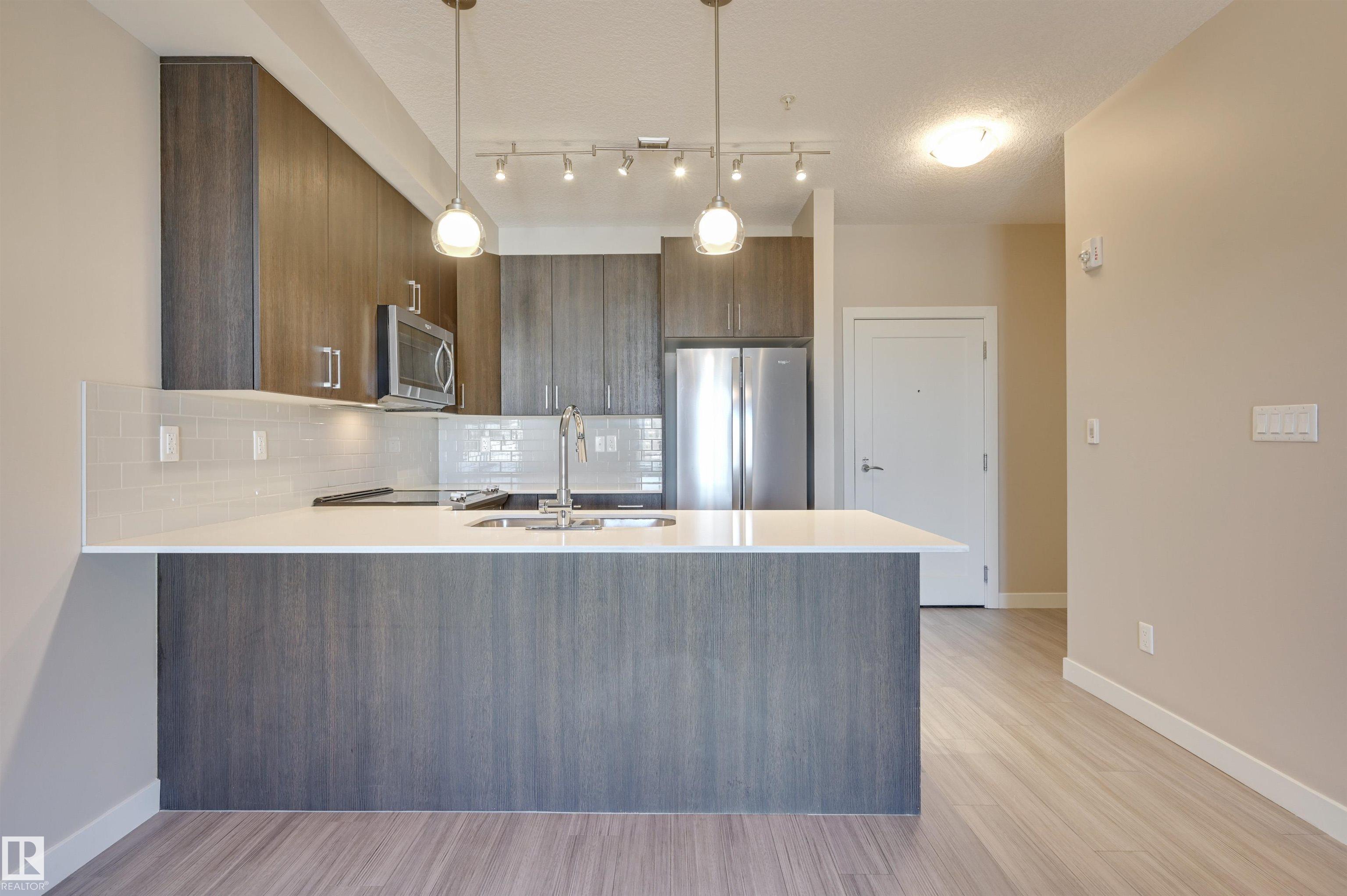 Welcome home to this spacious 708 sq.ft. modern 2 bedroom condo in THE RIDGE located in the heart of DEVON within walking distance to schools, parks, groceries, restaurants, outdoor pool, arena and river valley walking/biking trails. This unit has an open concept floor plan with 9' ceilings offering premium finishings throughout. The kitchen has an eating island, quartz countertops, espresso color cabinetry, with soft close and stainless steel appliances. The bedrooms are at opposite ends of the living area. The spacious north facing deck has a gas BBQ outlet. Vinyl plank flooring throughout except for tile in the bathroom. Roughed in for A/C. Included is the fridge, glass top stove, microwave hood fan, dishwasher, INSUITE WASHER AND DRYER and TITLED UNDERGROUND PARKING Unit 44 (Actual #12) with a storage cage. Shows very well! A great place to call home!