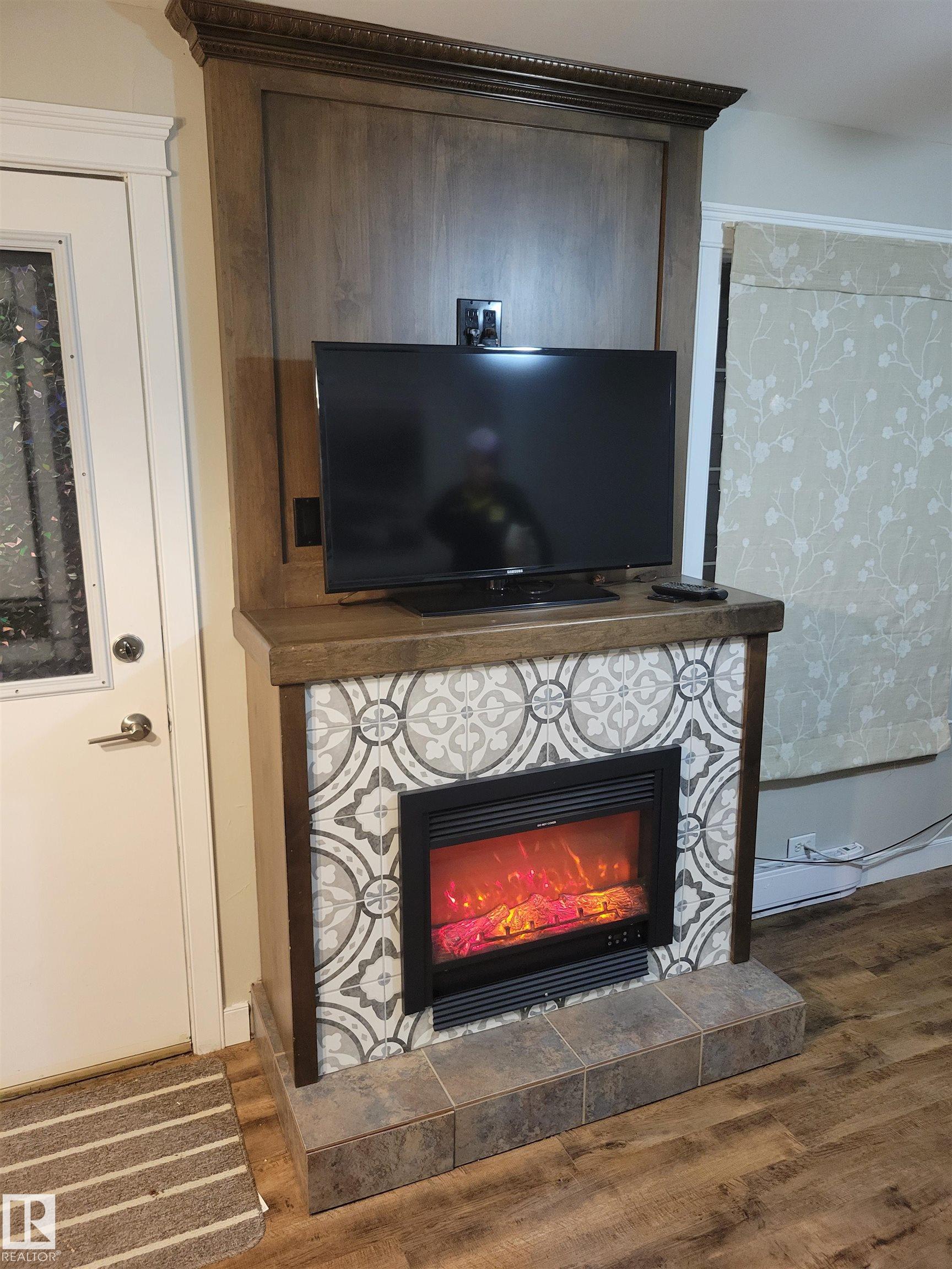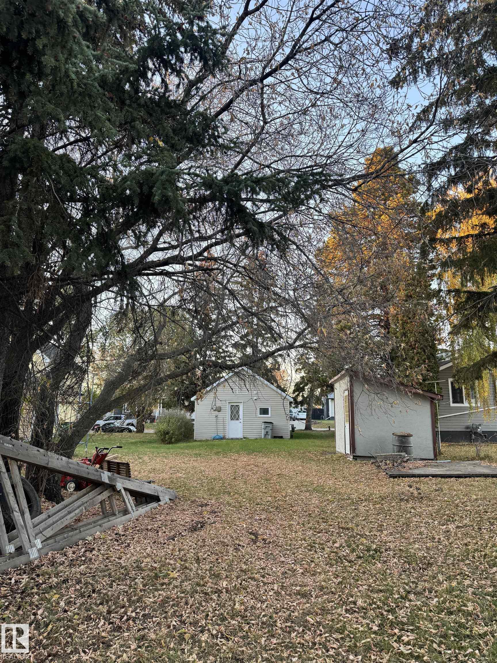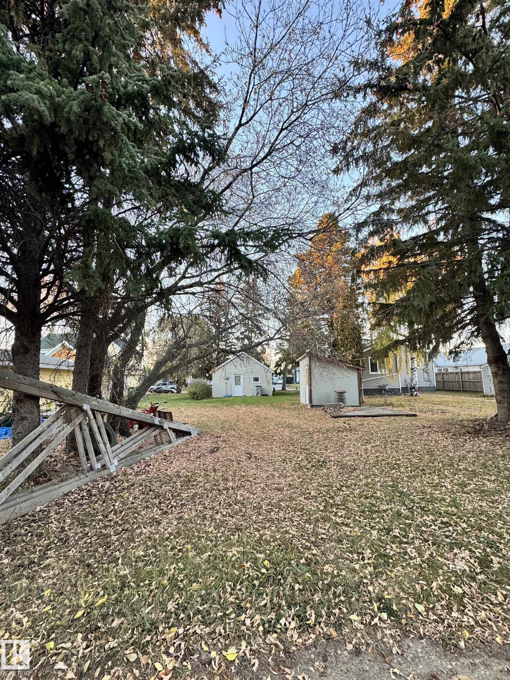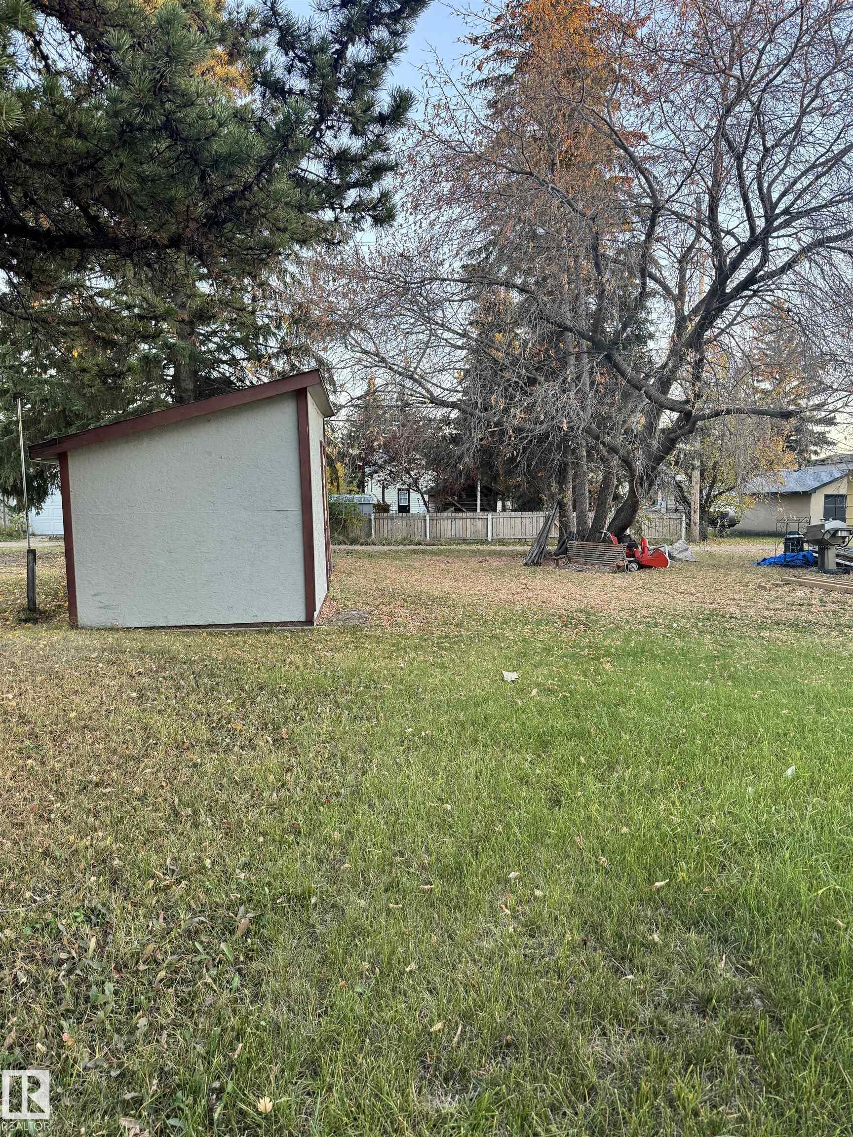 Cozy bungalow in Westlock surrounded by mature evergreens and a welcoming front flower bed. Step inside to your vision of a custom tiny home with a warm living and dining area featuring a tile-surround fireplace. The kitchen boasts custom cabinetry, stainless steel appliances, and ceramic tile, creating a thoughtful, efficient layout. Built-in cabinetry flows throughout the home, from the fireplace to the kitchen, laundry, bedroom, and bath, blending function with design. The primary bedroom includes built-in wardrobes, end tables, pot lights, and a ceiling fan for comfort. The laundry room offers a bench and more cabinets for back entry storage. The four-piece bath features a tiled shower and a heat lamp. Outside, enjoy a large backyard with trees, a storage shed, and a walking path wrapping the home, ideal for relaxing, gardening, or future expansion of your small-town sanctuary.