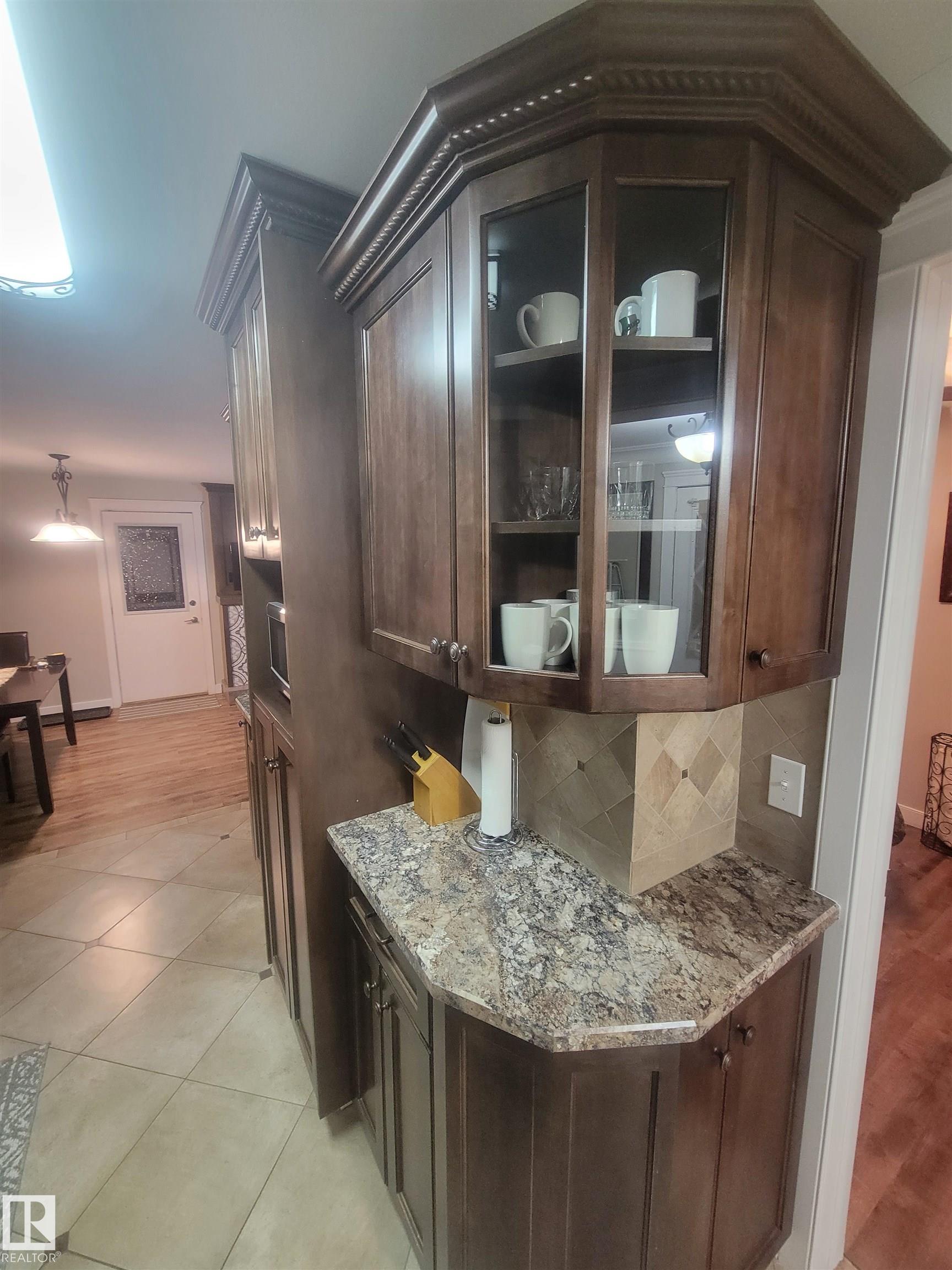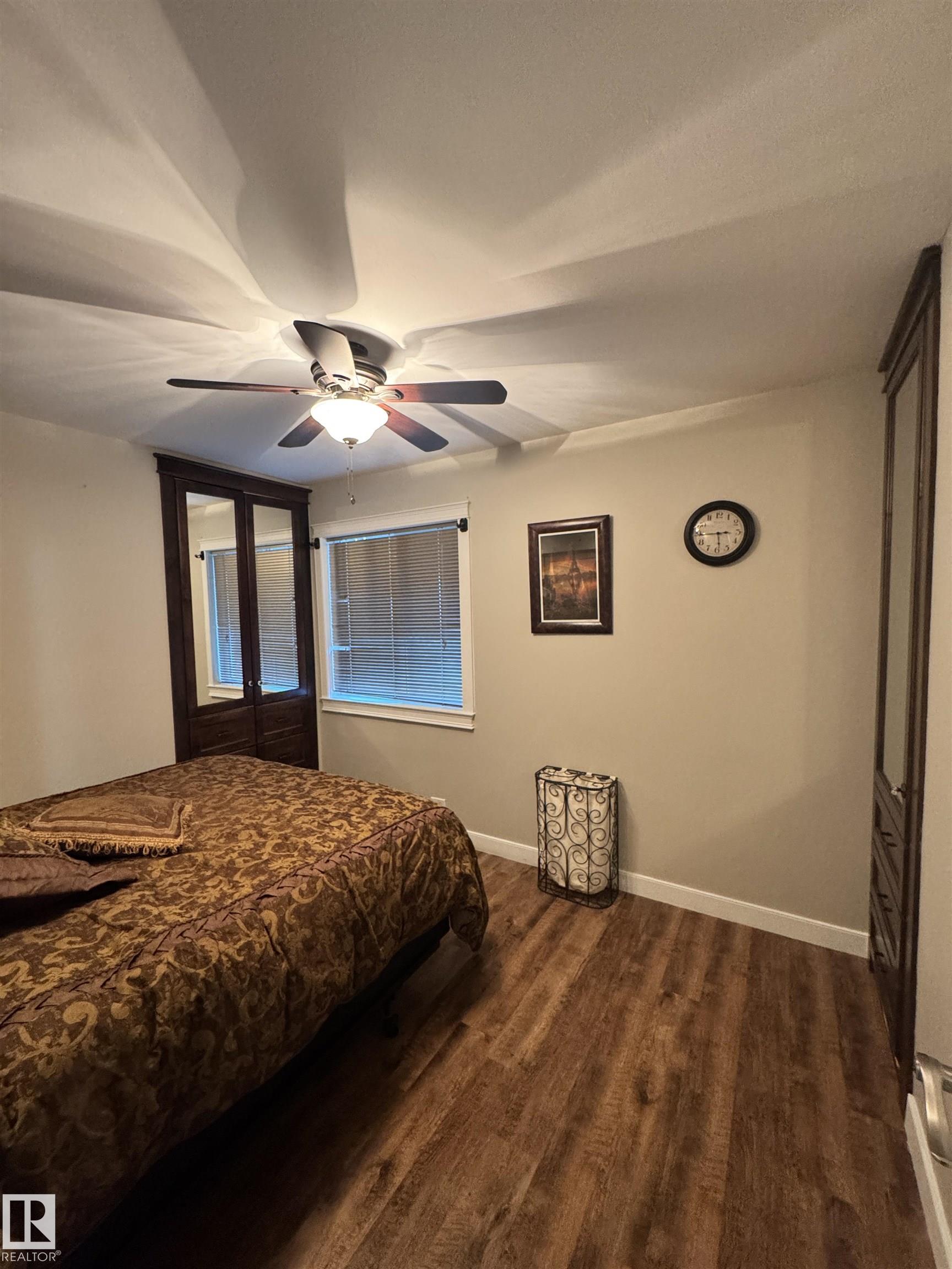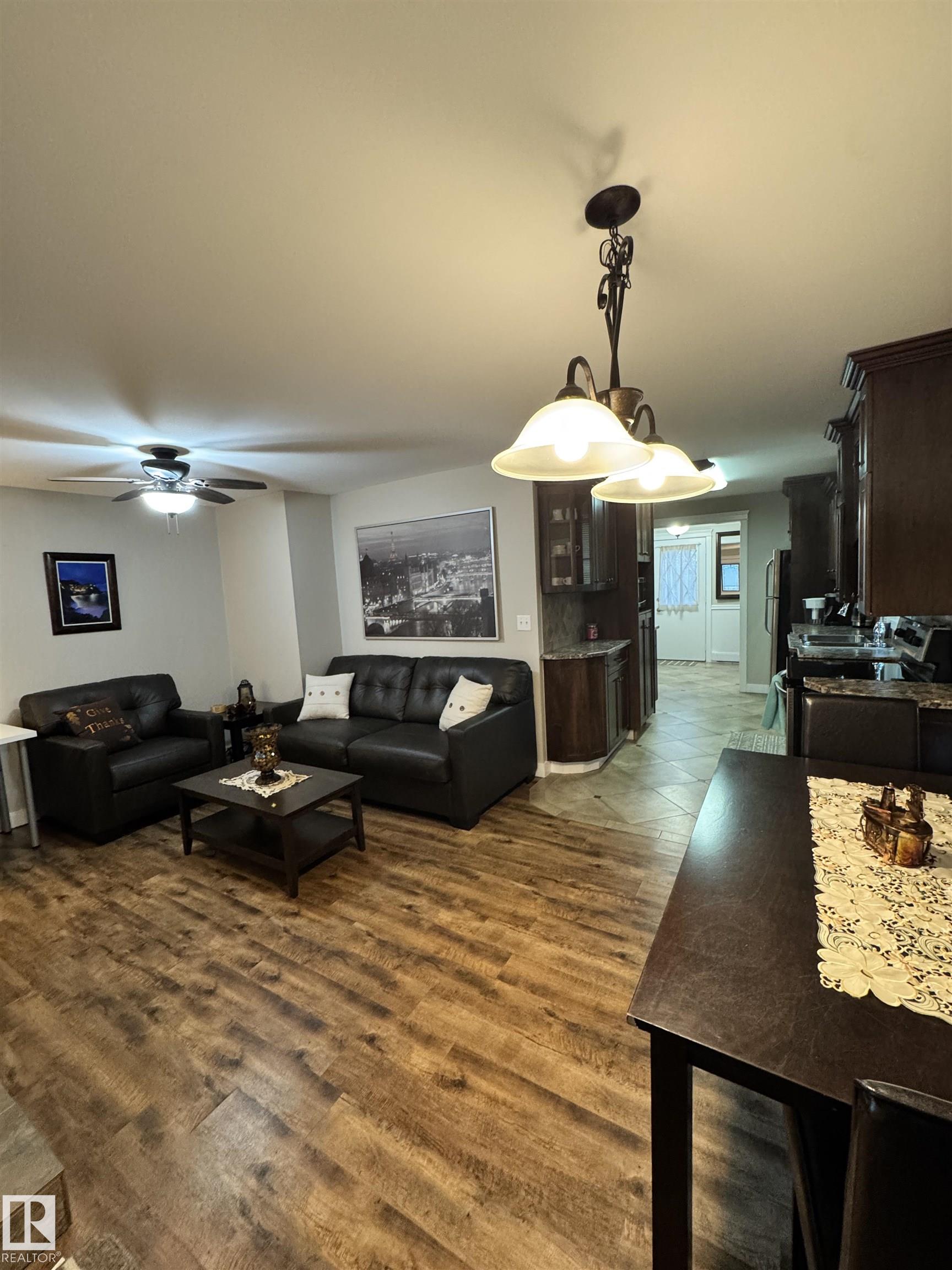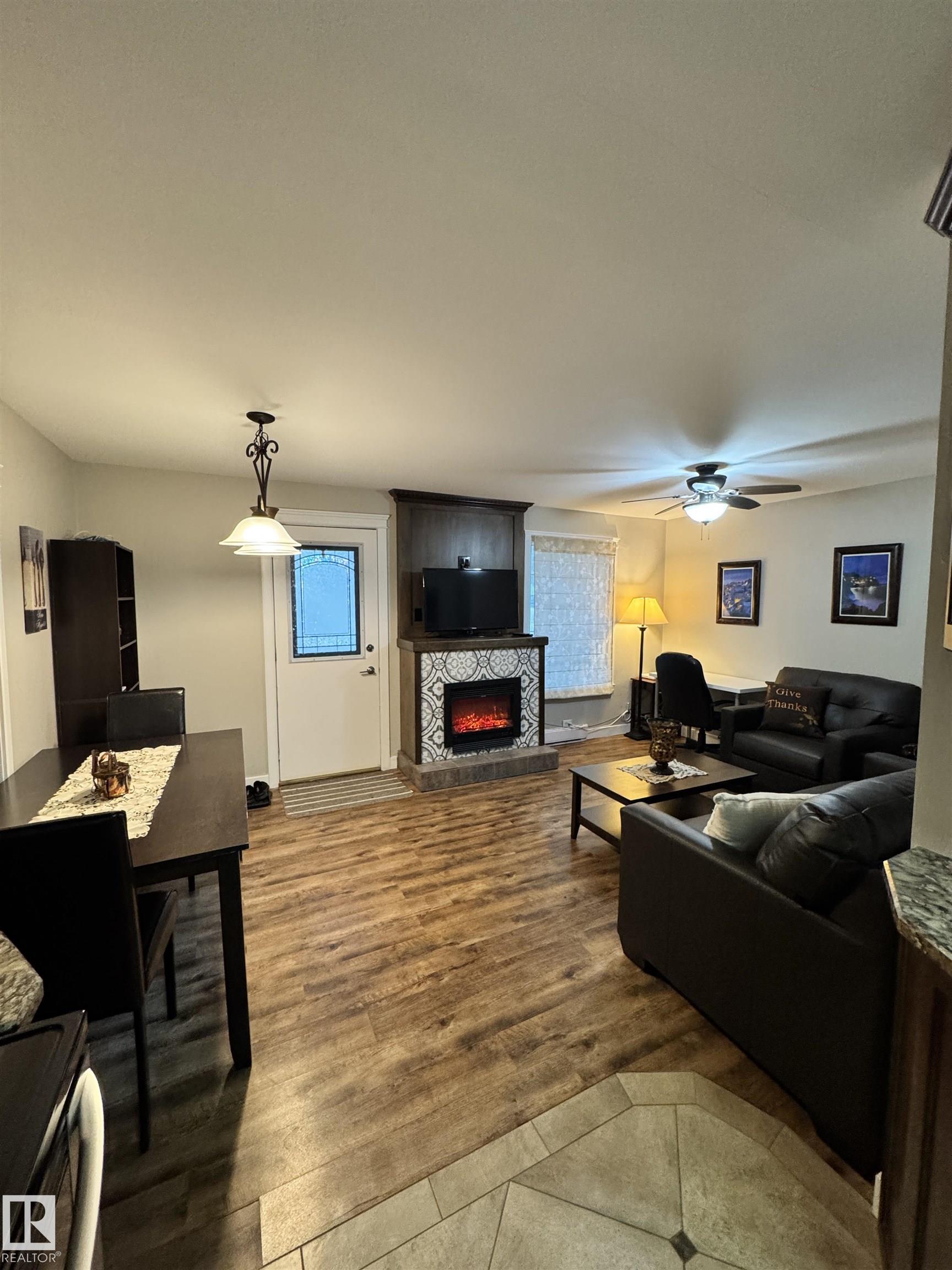 Cozy bungalow in Westlock surrounded by mature evergreens and a welcoming front flower bed. Step inside to your vision of a custom tiny home with a warm living and dining area featuring a tile-surround fireplace. The kitchen boasts custom cabinetry, stainless steel appliances, and ceramic tile, creating a thoughtful, efficient layout. Built-in cabinetry flows throughout the home, from the fireplace to the kitchen, laundry, bedroom, and bath, blending function with design. The primary bedroom includes built-in wardrobes, end tables, pot lights, and a ceiling fan for comfort. The laundry room offers a bench and more cabinets for back entry storage. The four-piece bath features a tiled shower and a heat lamp. Outside, enjoy a large backyard with trees, a storage shed, and a walking path wrapping the home, ideal for relaxing, gardening, or future expansion of your small-town sanctuary.