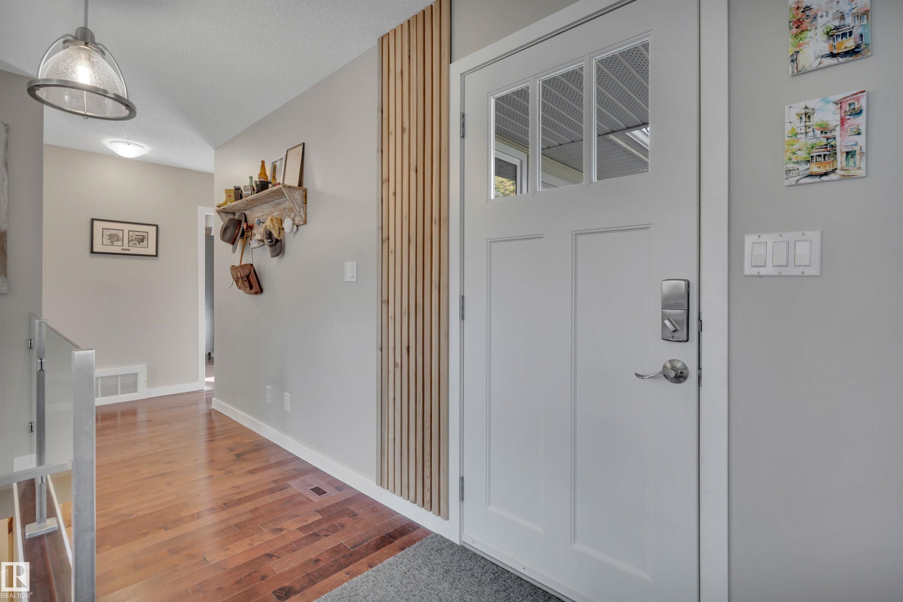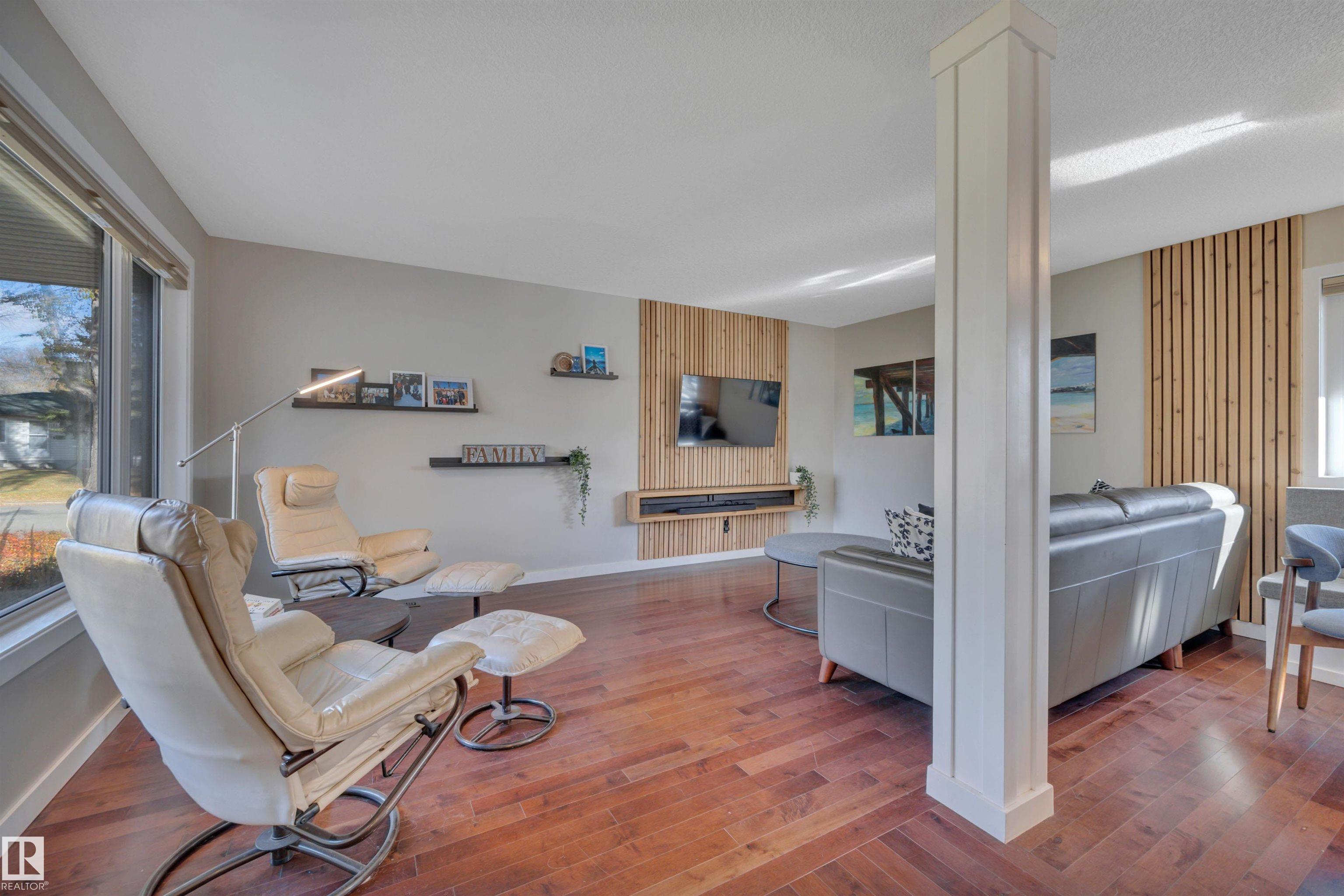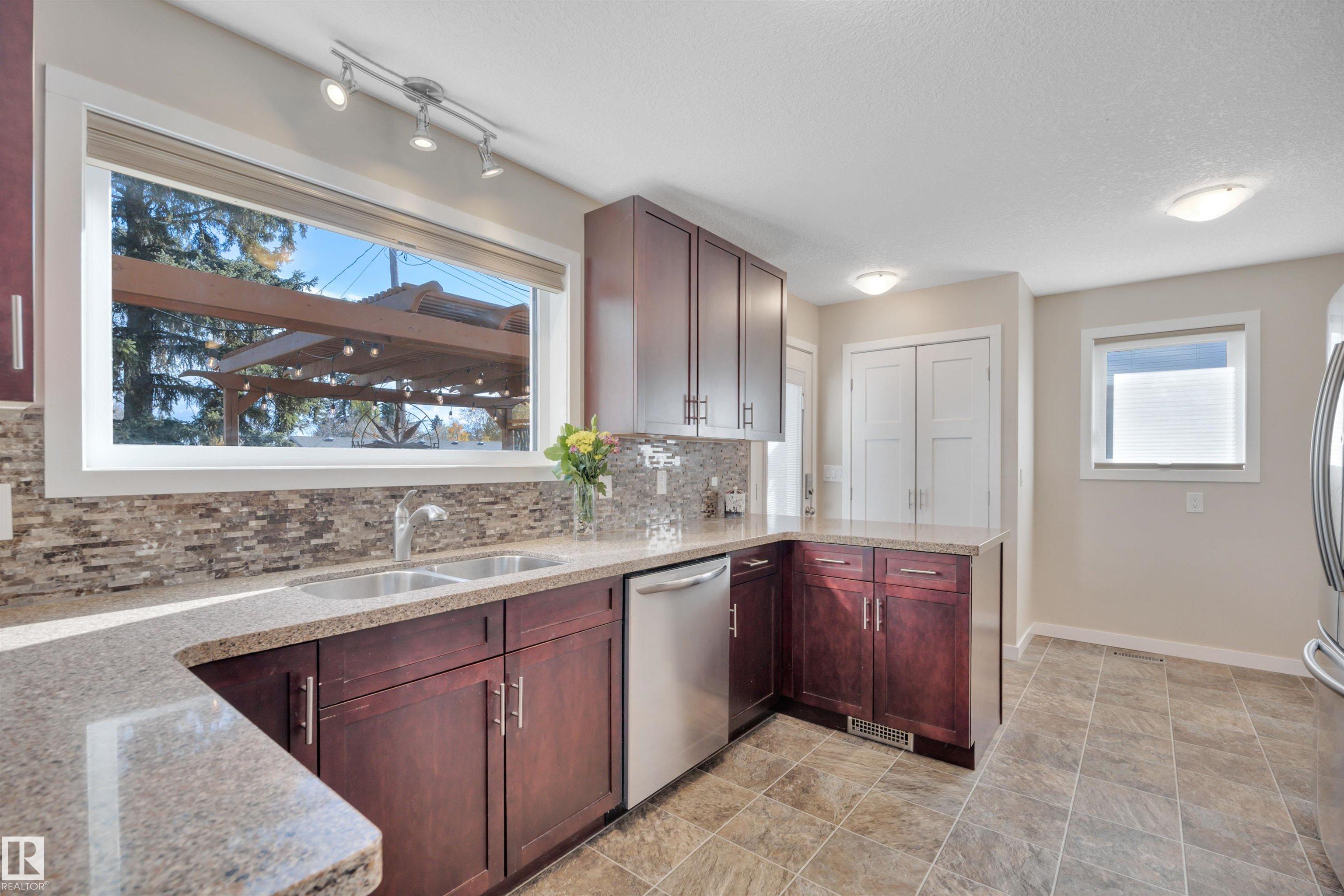 Welcome home to this stunningly renovated 4-bedroom, 3-bathroom bungalow on a massive corner lot in the desirable community of Sturgeon Heights! Step inside to an open-concept floor plan featuring stylish wood slat accents, sleek glass railings, hardwood floors, and a custom built-in eating nook. The fully renovated kitchen impresses with modern cabinetry, stainless steel appliances, granite countertops, and ample storage. The spacious primary bedroom offers a walk-in closet and a luxurious ensuite, while a second main-floor bedroom and full bathroom provide comfort for family or guests. Downstairs, enjoy a large rec room, two bright bedrooms with egress windows, and a beautifully updated full bathroom. Outside, relax in your sunny south-facing yard with a newer deck and pergola. The heated SUPER SINGLE garage built in 2017 is 18x21 ft with an oversized door perfect for the garage enthusiast! Upgrades include triple-pane windows, newer furnace and hot water tank, new fence, and sewer line. Move in ready!