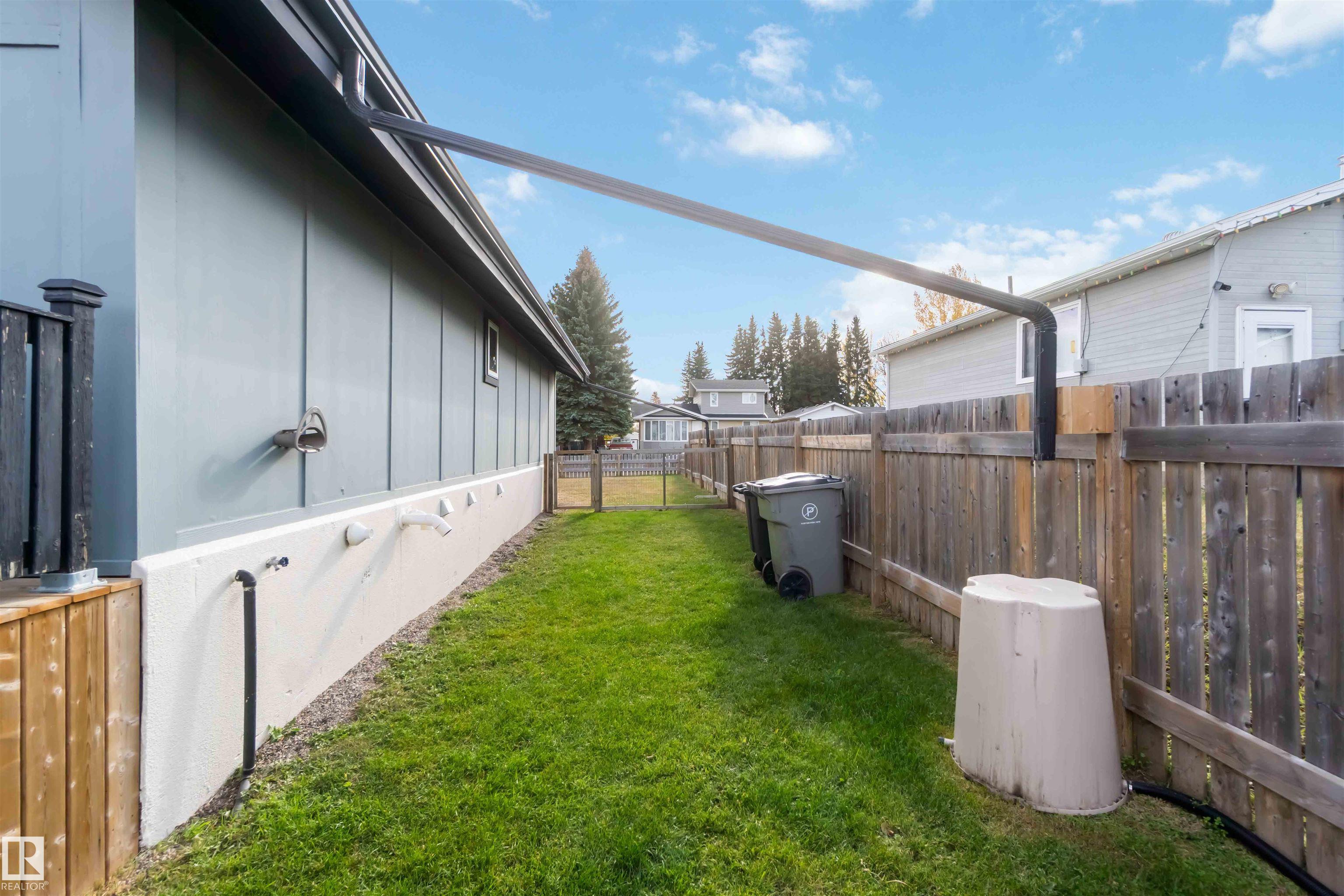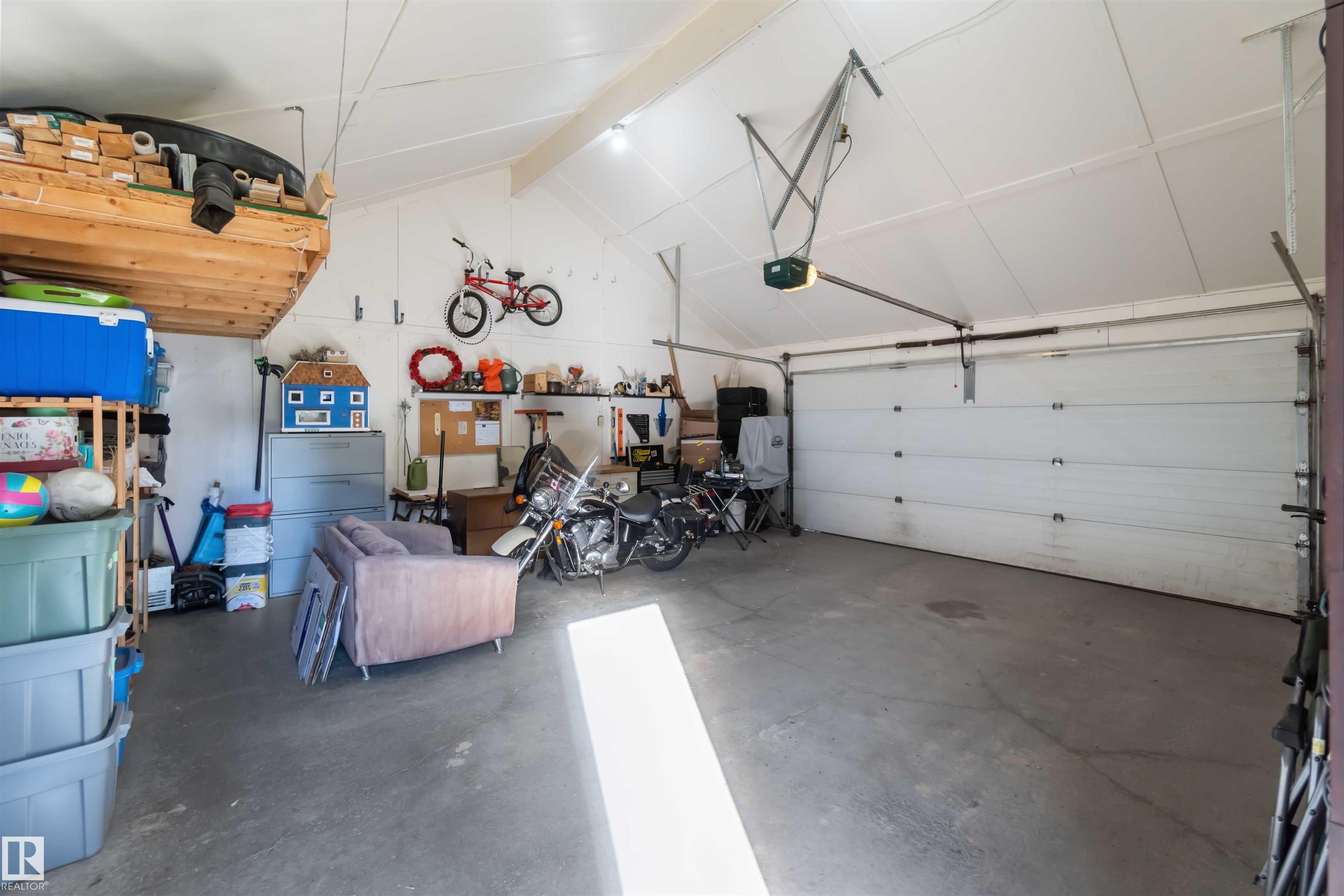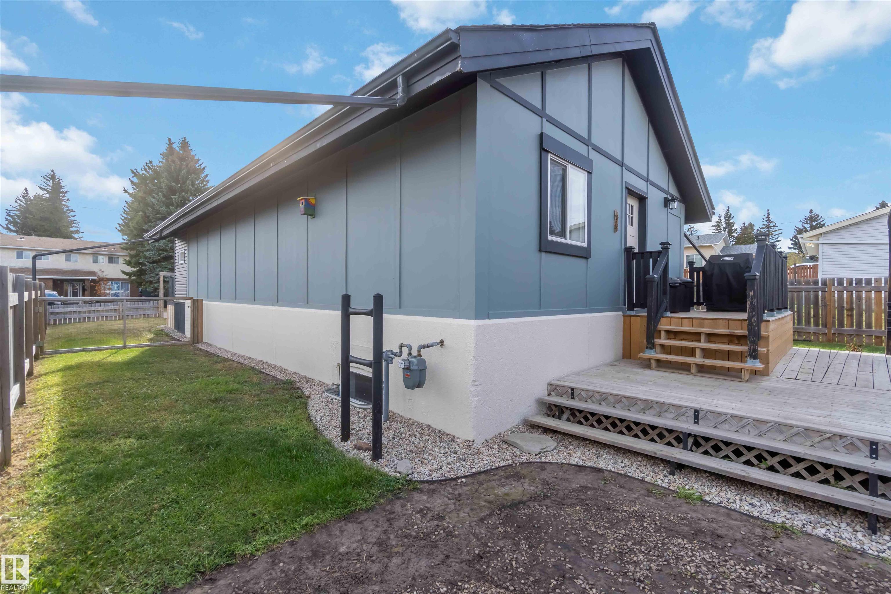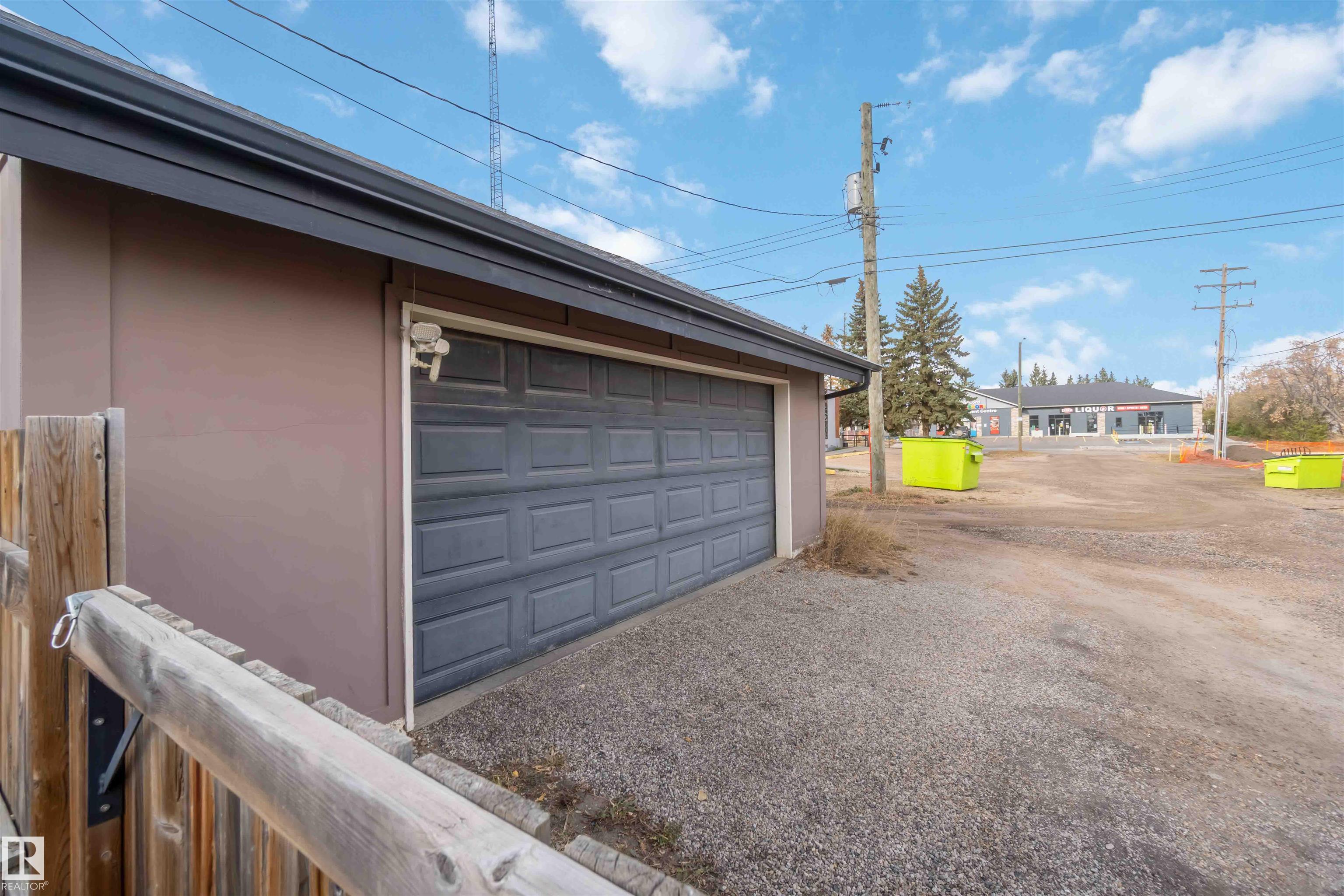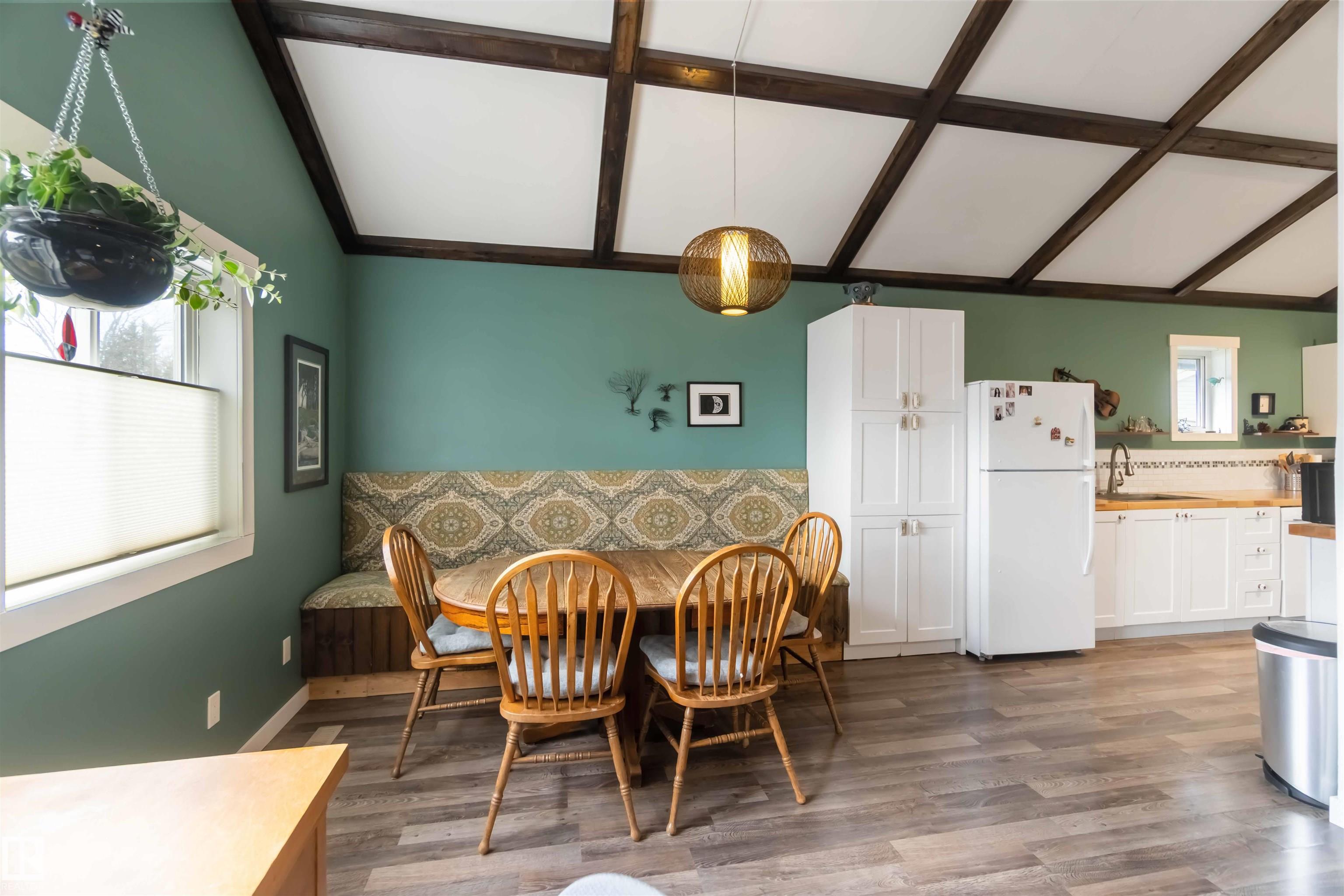 Great curb appeal and stunning modern features throughout this energy efficient home. This 990 sq ft 3-brm bungalow shows so well. Enter in from the insulated porch into the living space with vaulted ceilings, giving the home a first impression of roomy & comfortable. The kitchen has butcher block countertops & dining area with b/i bench seating. The main floor bathroom has a w/i shower & across the hall is the primary bedroom with b/i closet space. The basement is finished with a family room, 2 more bedrooms, a renovated 4 pc bathroom with soaker tub & new vinyl plank flooring. 9 ft ceilings, H/E furnace & hot water on demand, plus newer shingles (2021) on house and garage. All interior lighting updated & exterior painted. Deck off the back door for outdoor living space & a double detached garage 23x23. Fenced yard & a gravel pad for RV parking or firepit area. Walking distance to amenities (grocery store/drug store etc). Enjoy the quaint small town feeling in the Town of Bon Accord.