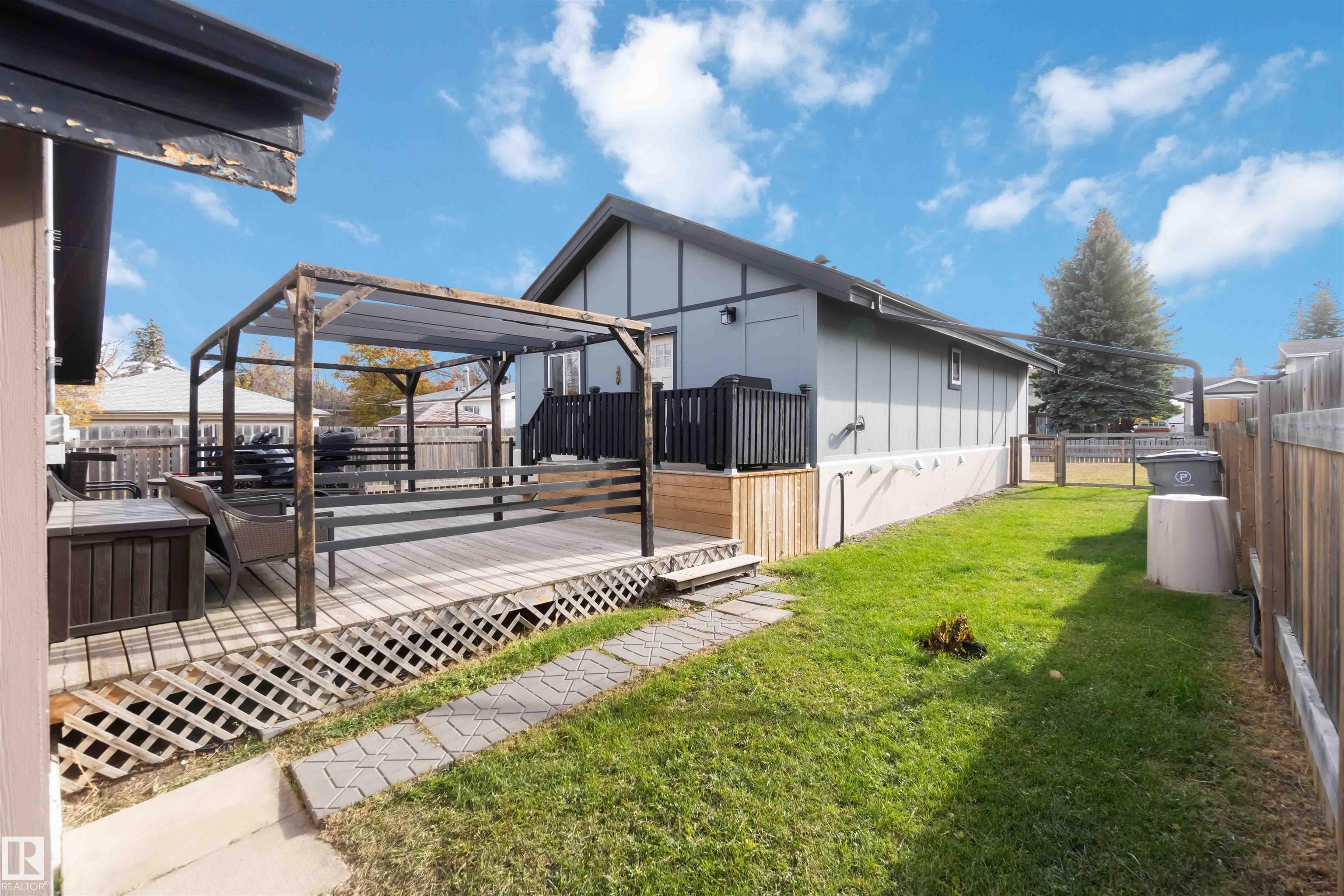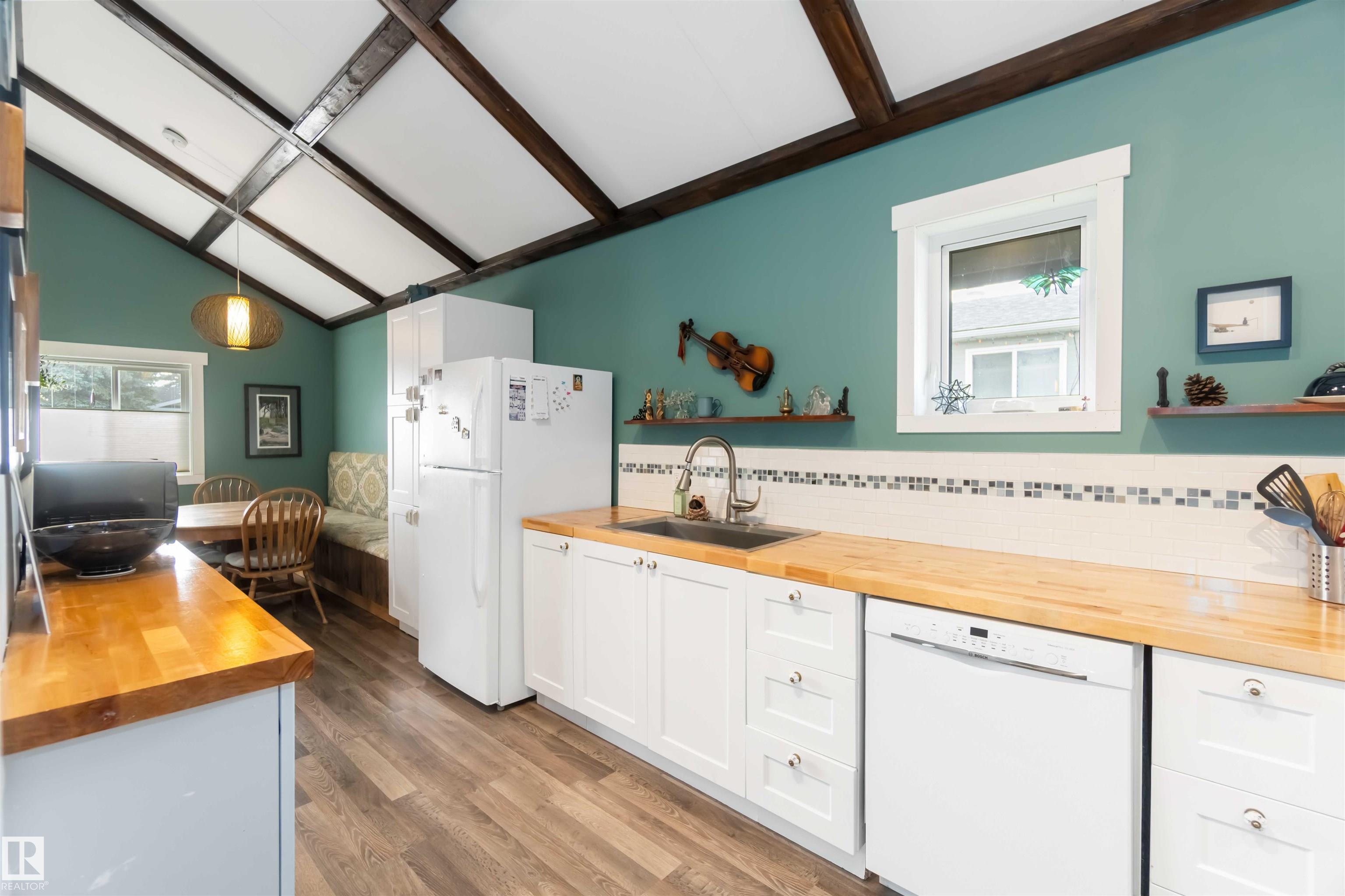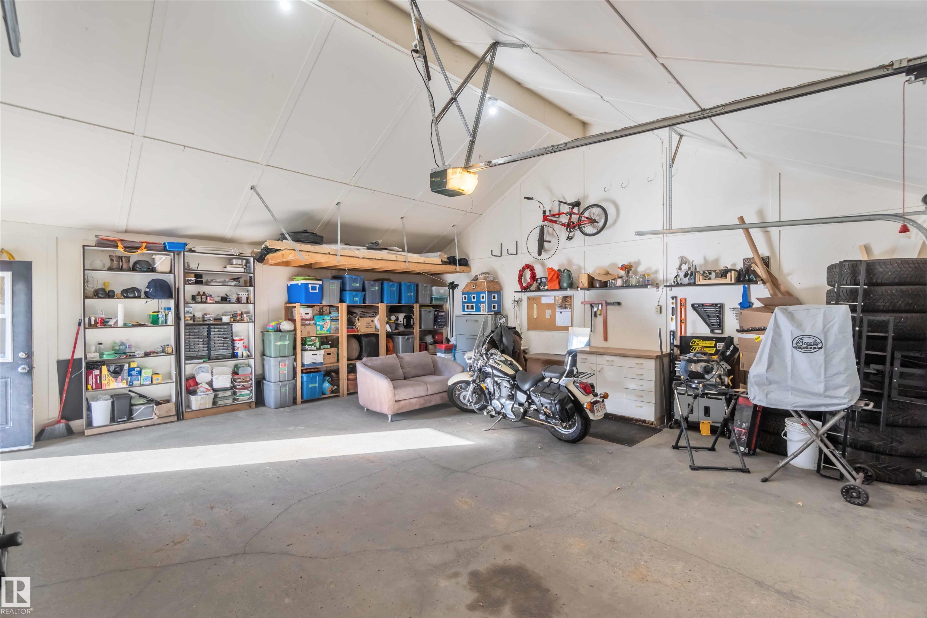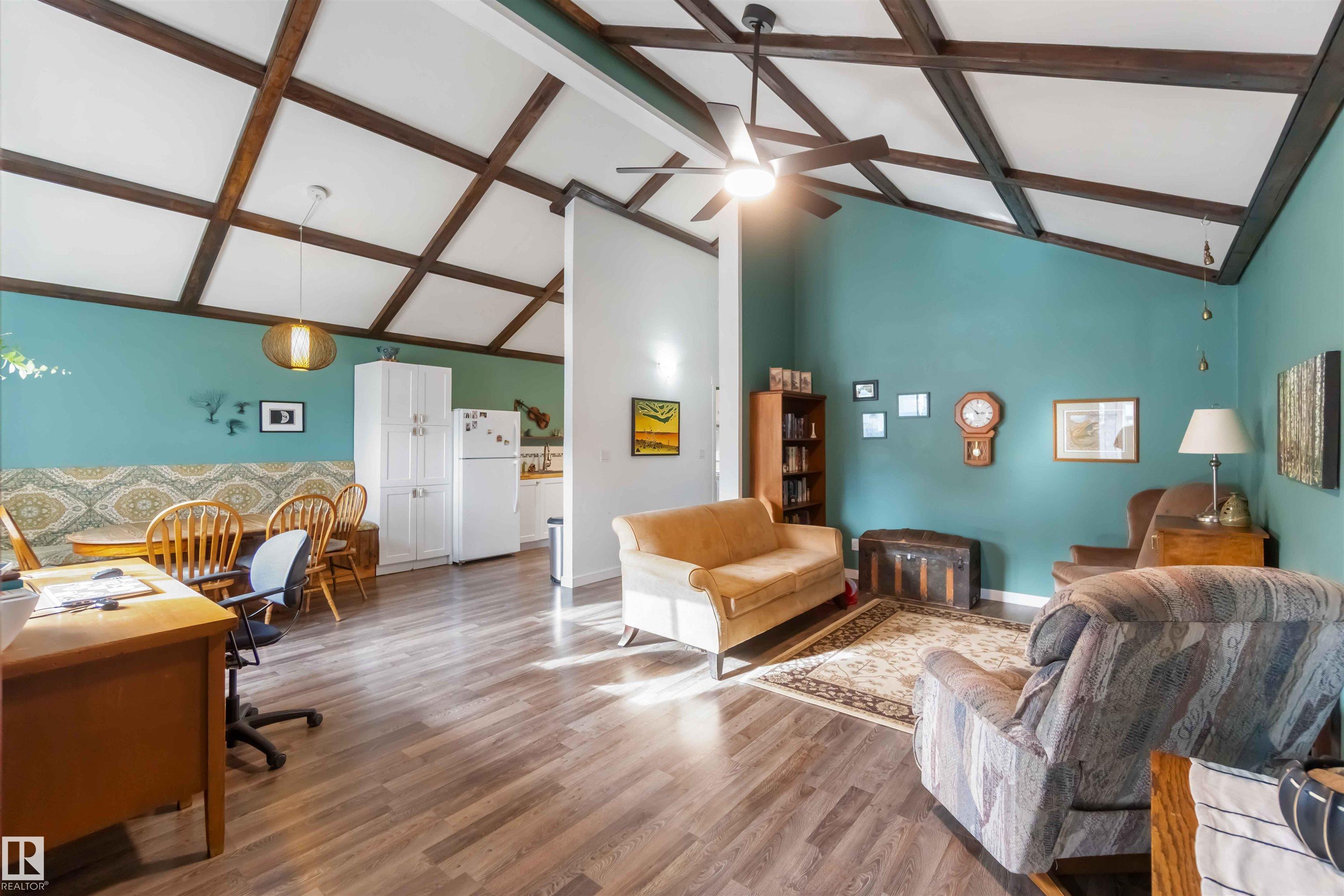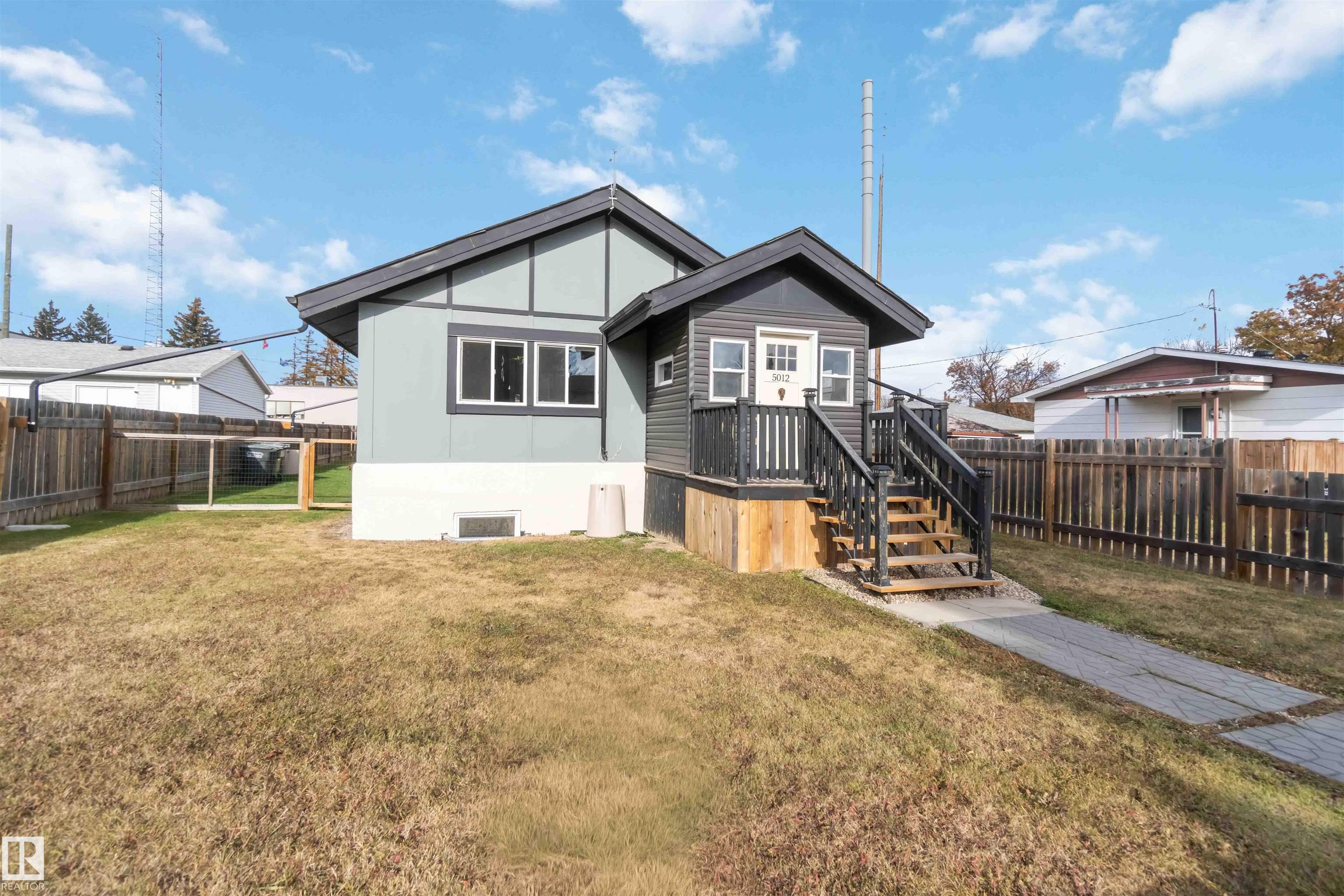 Great curb appeal and stunning modern features throughout this energy efficient home. This 990 sq ft 3-brm bungalow shows so well. Enter in from the insulated porch into the living space with vaulted ceilings, giving the home a first impression of roomy & comfortable. The kitchen has butcher block countertops & dining area with b/i bench seating. The main floor bathroom has a w/i shower & across the hall is the primary bedroom with b/i closet space. The basement is finished with a family room, 2 more bedrooms, a renovated 4 pc bathroom with soaker tub & new vinyl plank flooring. 9 ft ceilings, H/E furnace & hot water on demand, plus newer shingles (2021) on house and garage. All interior lighting updated & exterior painted. Deck off the back door for outdoor living space & a double detached garage 23x23. Fenced yard & a gravel pad for RV parking or firepit area. Walking distance to amenities (grocery store/drug store etc). Enjoy the quaint small town feeling in the Town of Bon Accord.