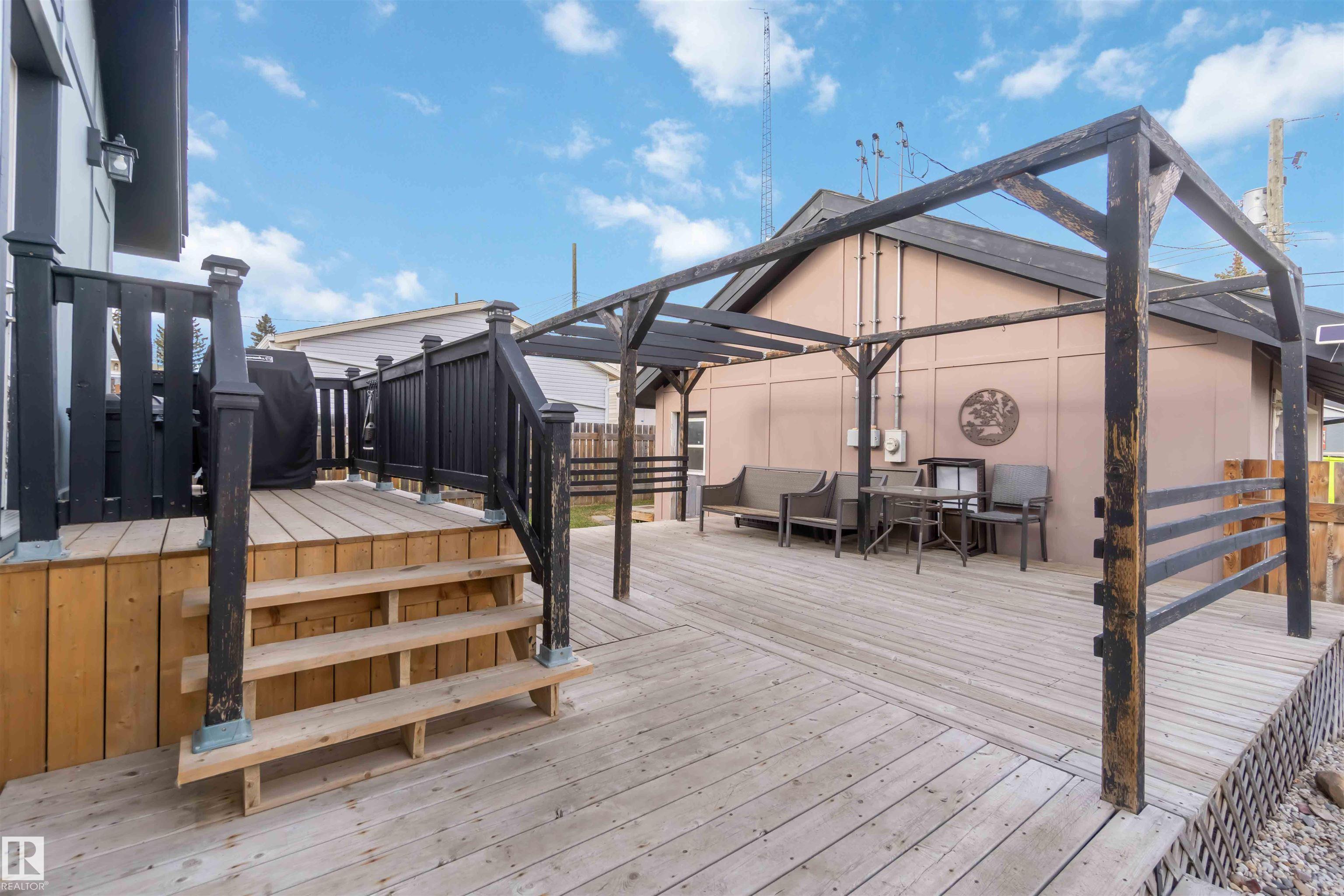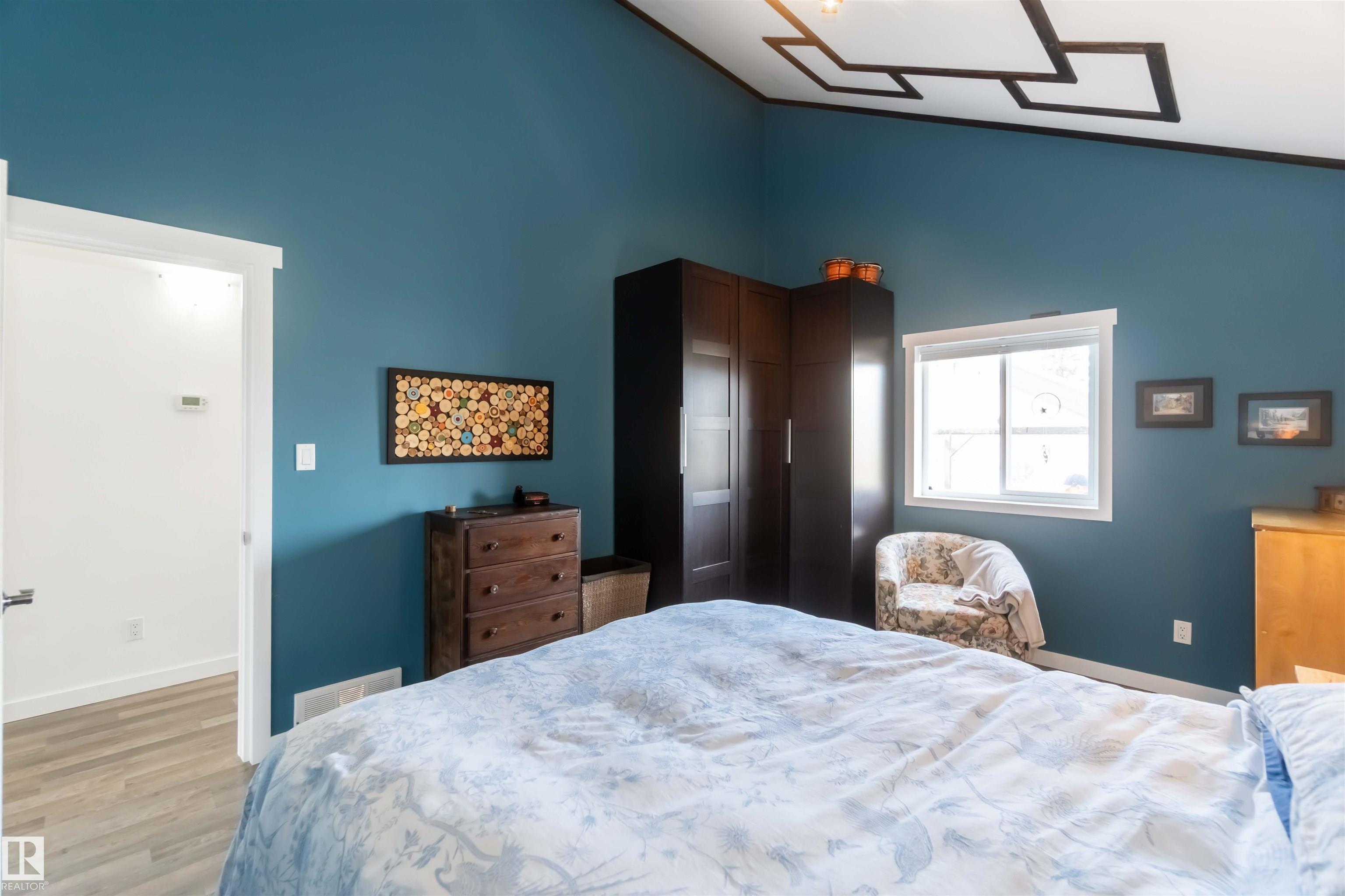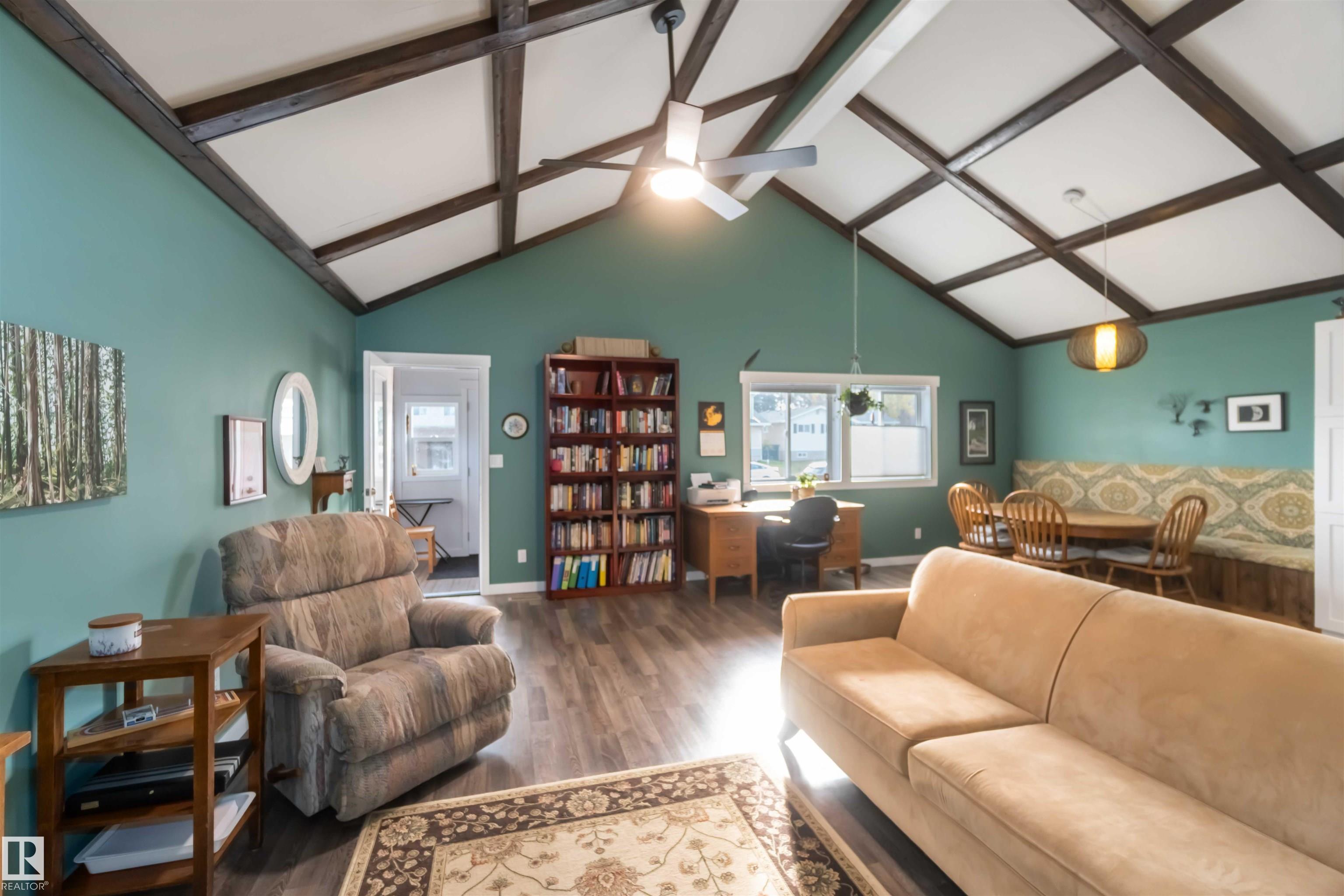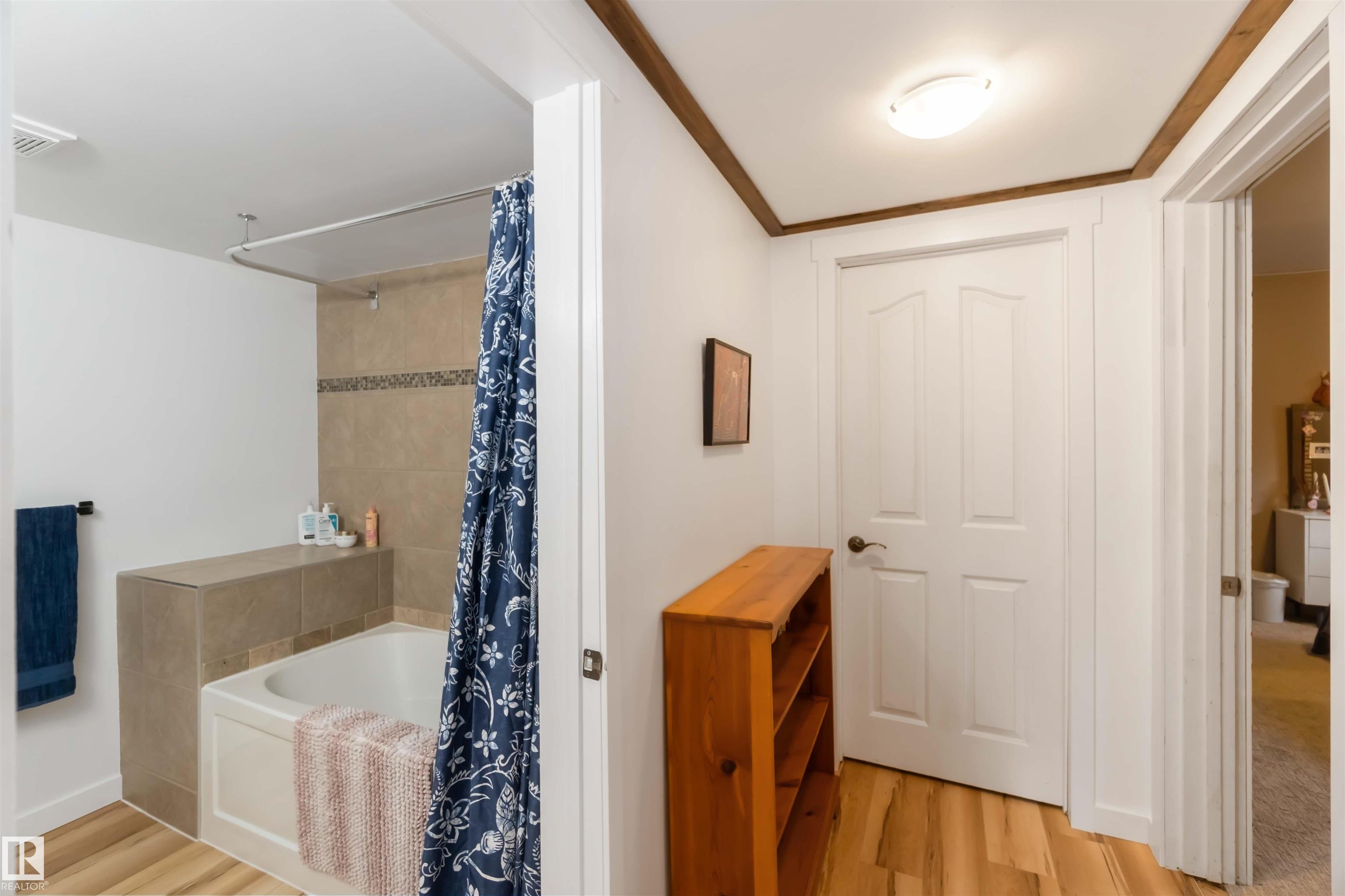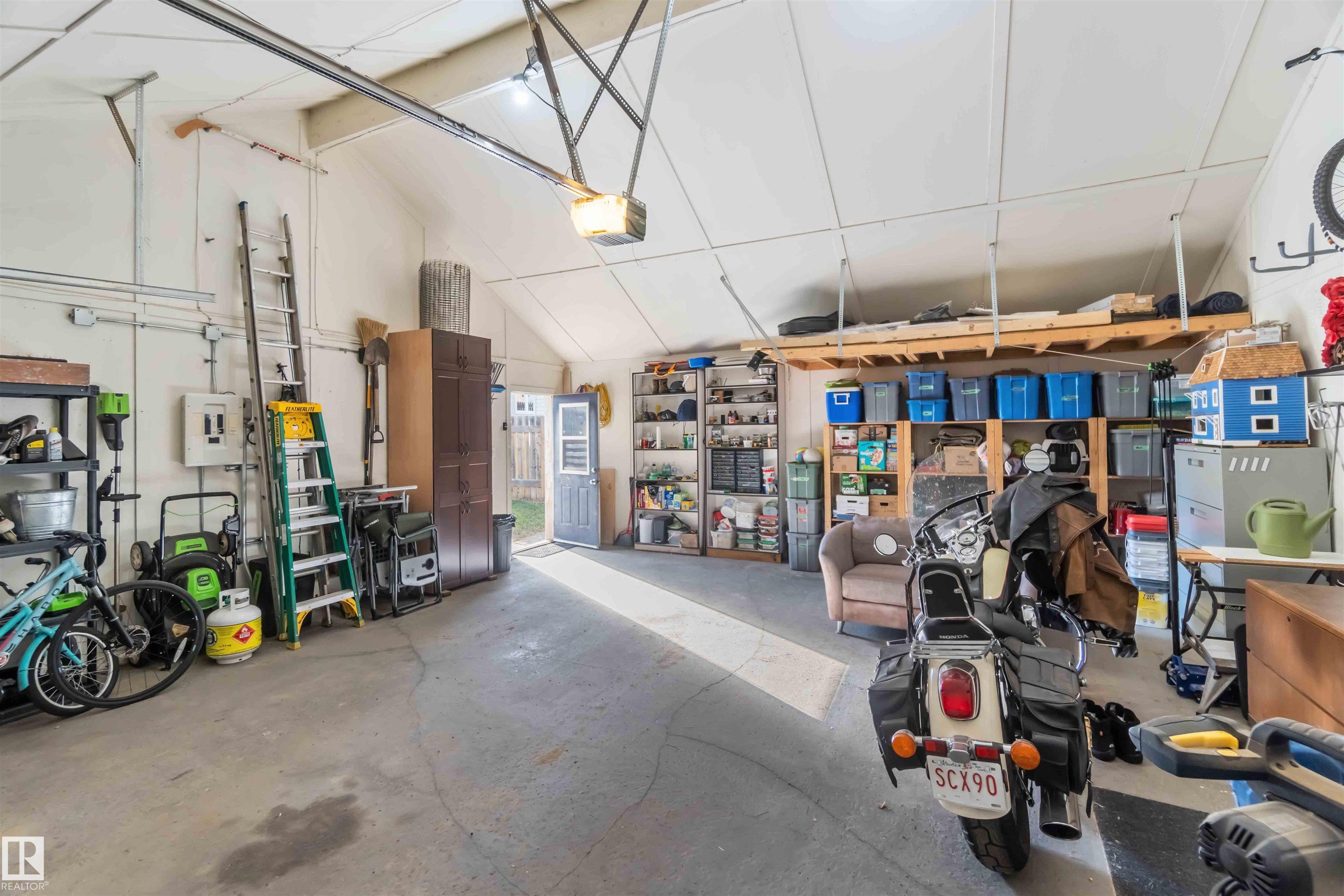 Great curb appeal and stunning modern features throughout this energy efficient home. This 990 sq ft 3-brm bungalow shows so well. Enter in from the insulated porch into the living space with vaulted ceilings, giving the home a first impression of roomy & comfortable. The kitchen has butcher block countertops & dining area with b/i bench seating. The main floor bathroom has a w/i shower & across the hall is the primary bedroom with b/i closet space. The basement is finished with a family room, 2 more bedrooms, a renovated 4 pc bathroom with soaker tub & new vinyl plank flooring. 9 ft ceilings, H/E furnace & hot water on demand, plus newer shingles (2021) on house and garage. All interior lighting updated & exterior painted. Deck off the back door for outdoor living space & a double detached garage 23x23. Fenced yard & a gravel pad for RV parking or firepit area. Walking distance to amenities (grocery store/drug store etc). Enjoy the quaint small town feeling in the Town of Bon Accord.
