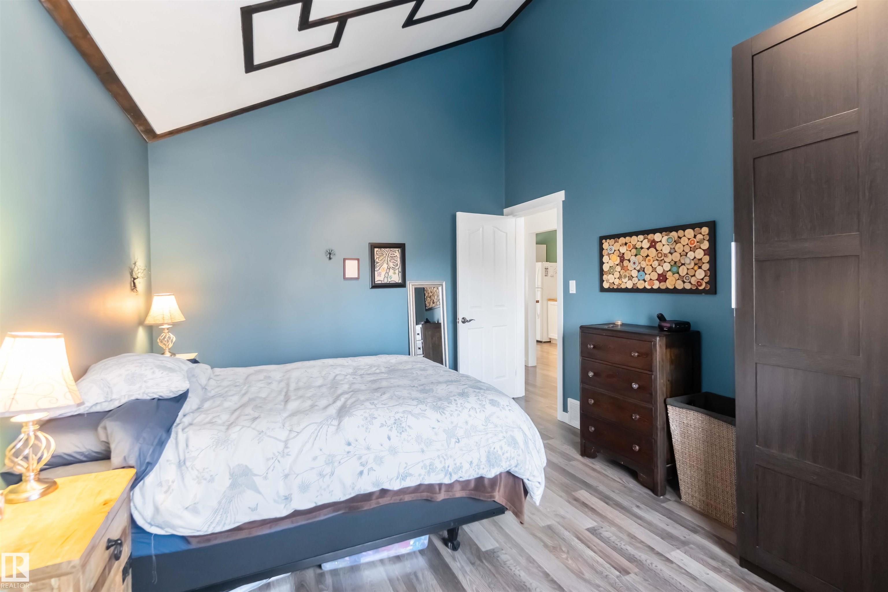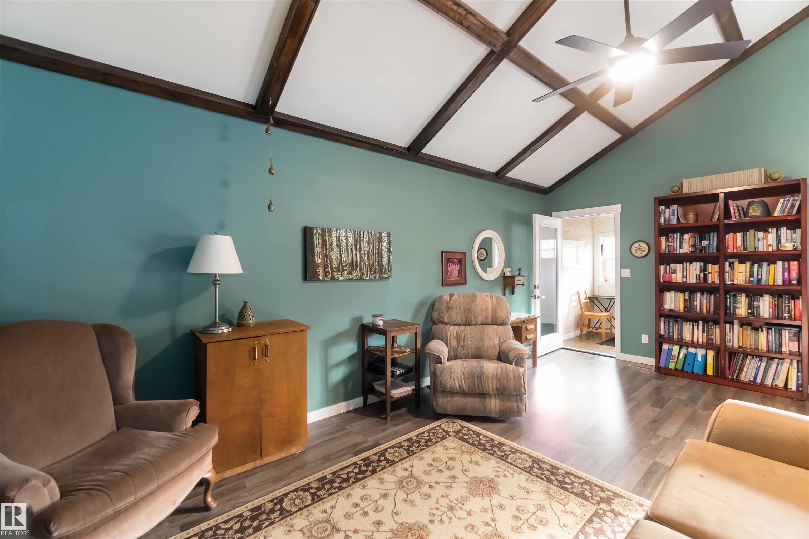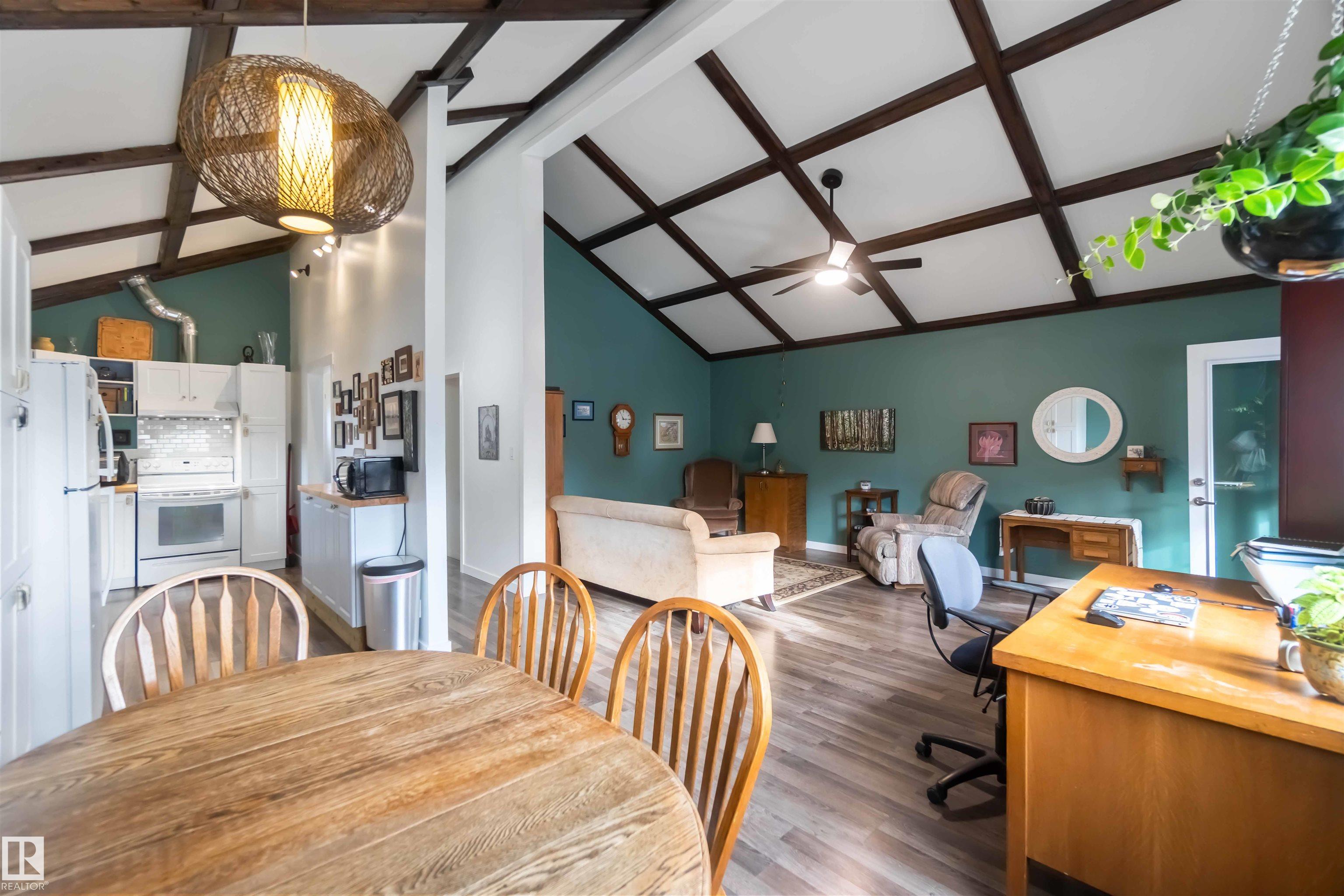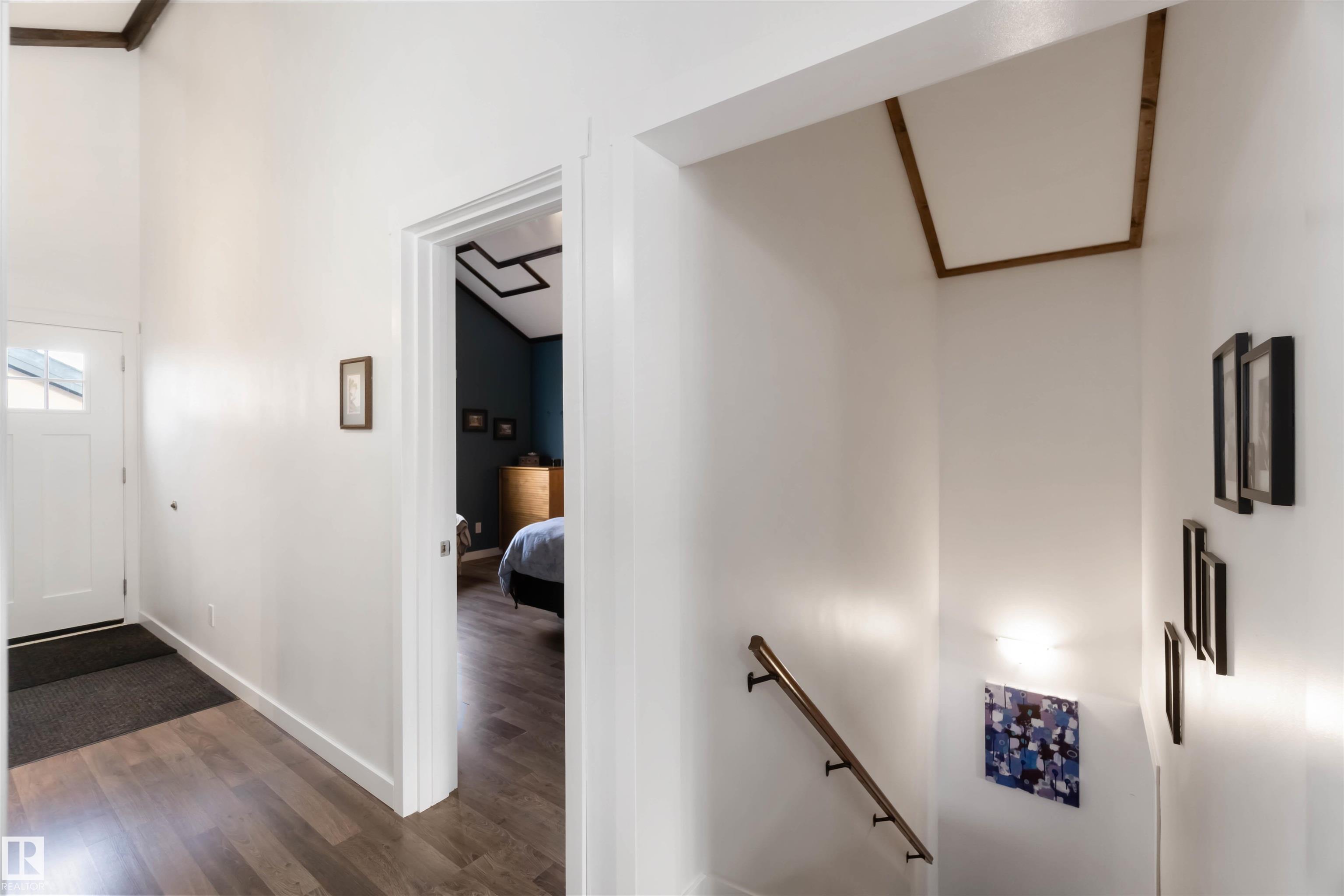 Great curb appeal and stunning modern features throughout this energy efficient home. This 990 sq ft 3-brm bungalow shows so well. Enter in from the insulated porch into the living space with vaulted ceilings, giving the home a first impression of roomy & comfortable. The kitchen has butcher block countertops & dining area with b/i bench seating. The main floor bathroom has a w/i shower & across the hall is the primary bedroom with b/i closet space. The basement is finished with a family room, 2 more bedrooms, a renovated 4 pc bathroom with soaker tub & new vinyl plank flooring. 9 ft ceilings, H/E furnace & hot water on demand, plus newer shingles (2021) on house and garage. All interior lighting updated & exterior painted. Deck off the back door for outdoor living space & a double detached garage 23x23. Fenced yard & a gravel pad for RV parking or firepit area. Walking distance to amenities (grocery store/drug store etc). Enjoy the quaint small town feeling in the Town of Bon Accord.