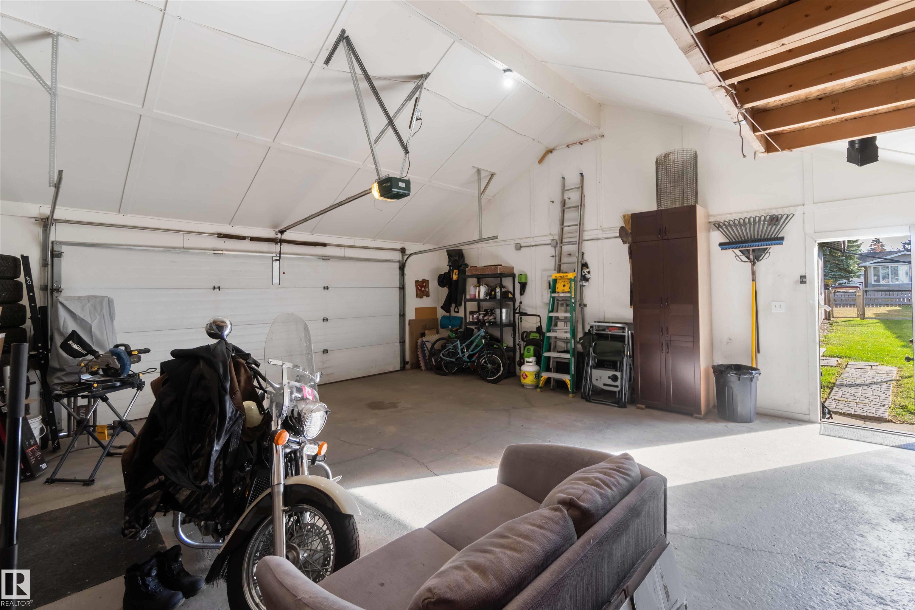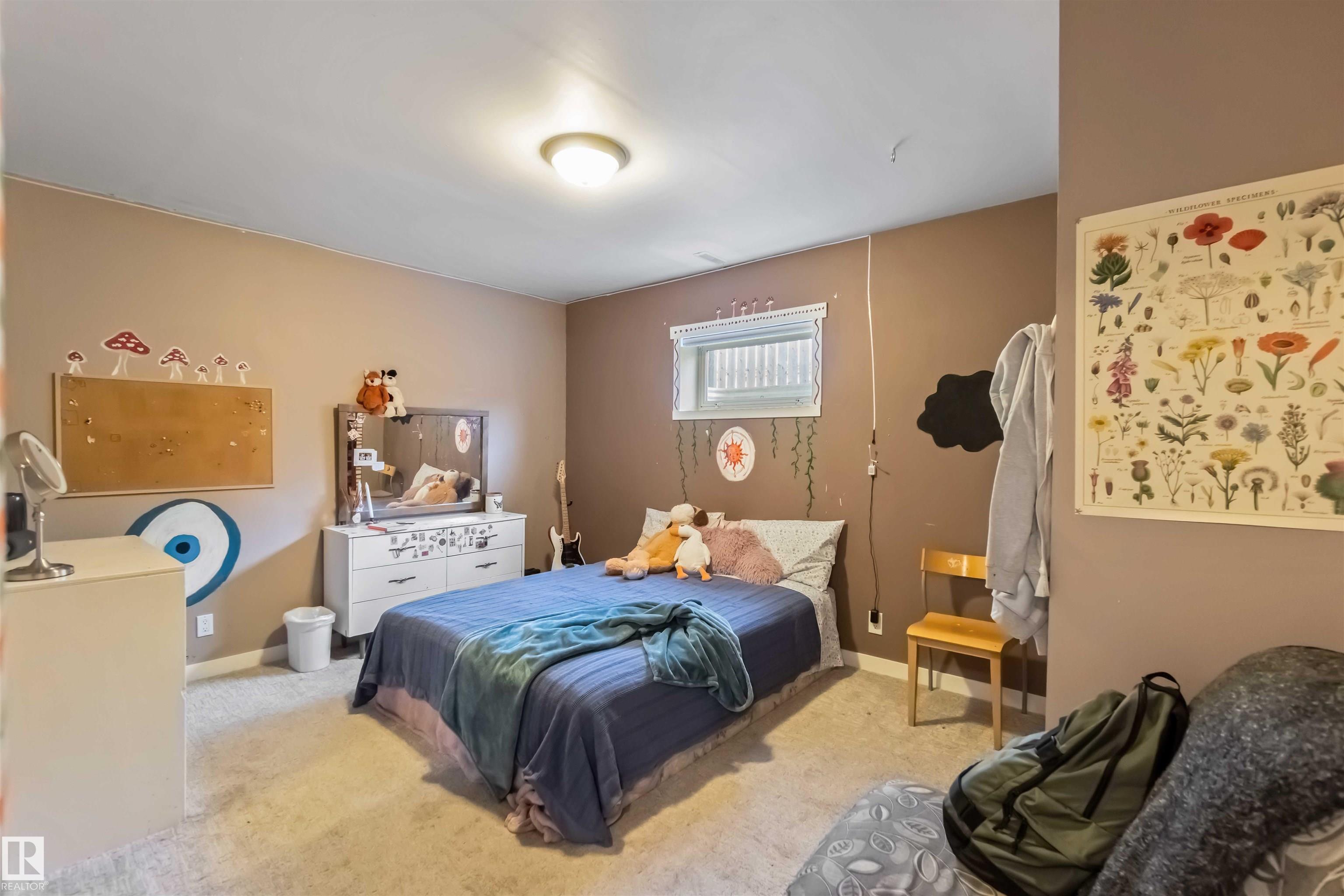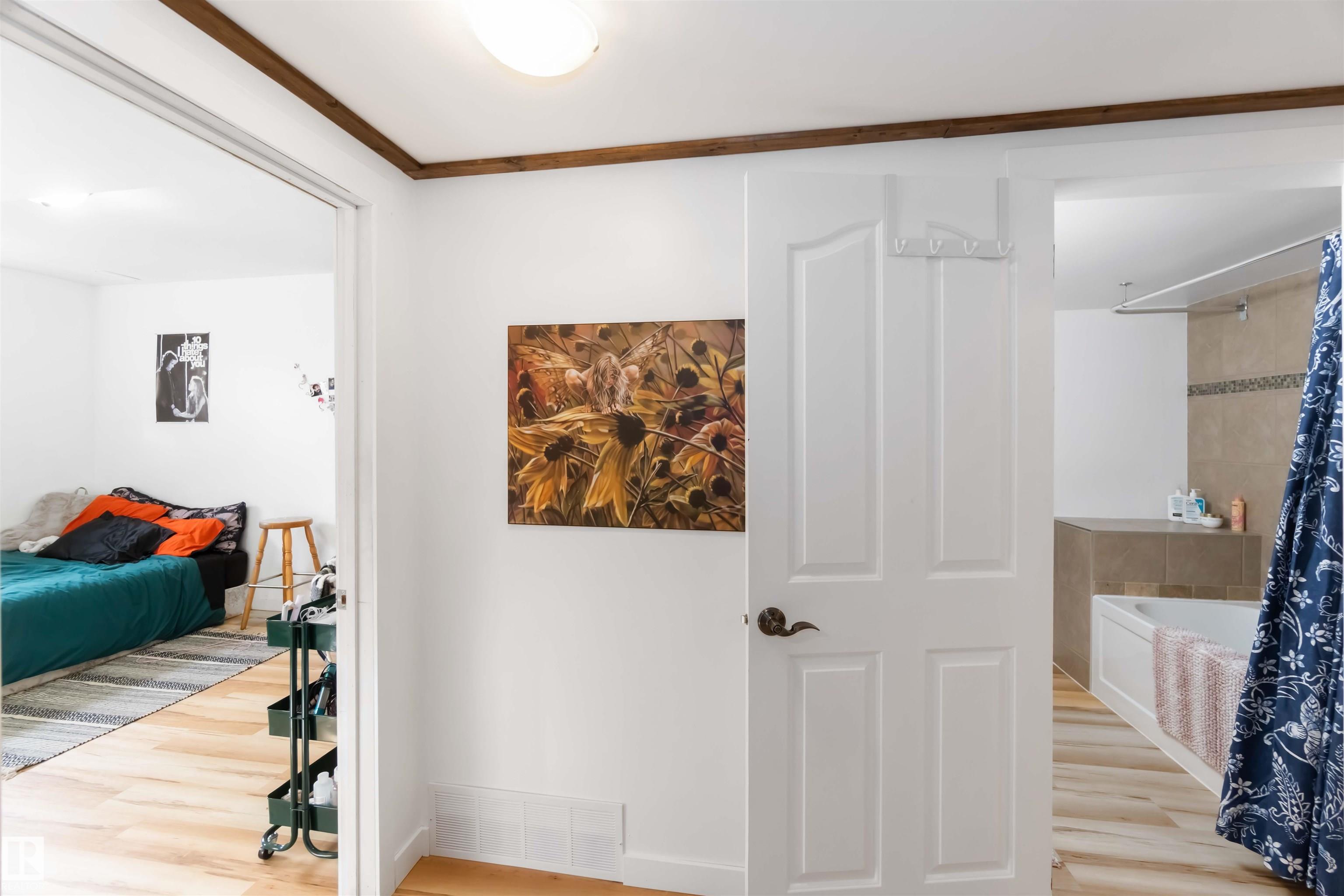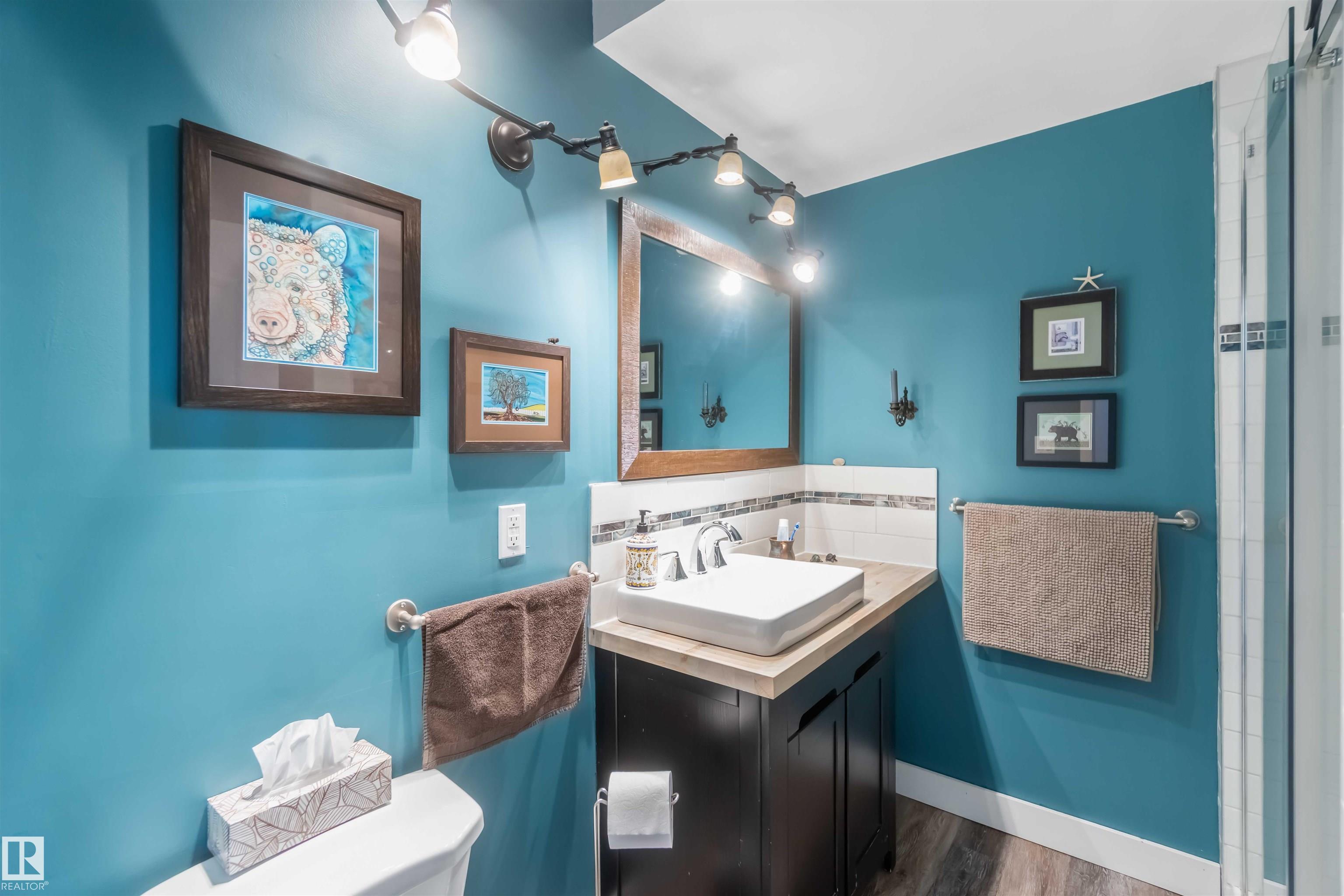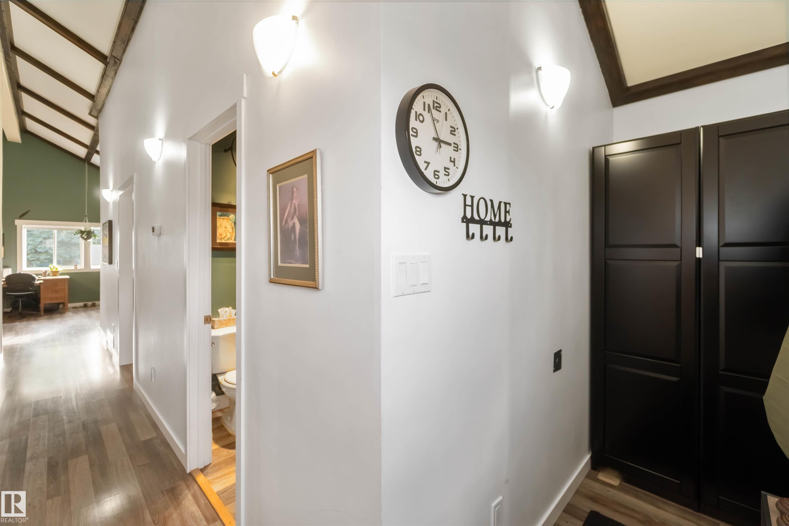 Great curb appeal and stunning modern features throughout this energy efficient home. This 990 sq ft 3-brm bungalow shows so well. Enter in from the insulated porch into the living space with vaulted ceilings, giving the home a first impression of roomy & comfortable. The kitchen has butcher block countertops & dining area with b/i bench seating. The main floor bathroom has a w/i shower & across the hall is the primary bedroom with b/i closet space. The basement is finished with a family room, 2 more bedrooms, a renovated 4 pc bathroom with soaker tub & new vinyl plank flooring. 9 ft ceilings, H/E furnace & hot water on demand, plus newer shingles (2021) on house and garage. All interior lighting updated & exterior painted. Deck off the back door for outdoor living space & a double detached garage 23x23. Fenced yard & a gravel pad for RV parking or firepit area. Walking distance to amenities (grocery store/drug store etc). Enjoy the quaint small town feeling in the Town of Bon Accord.