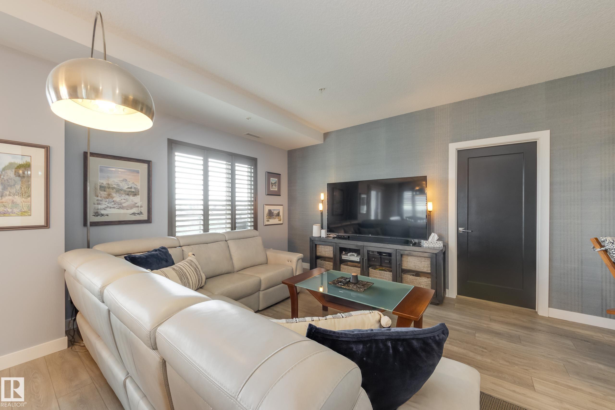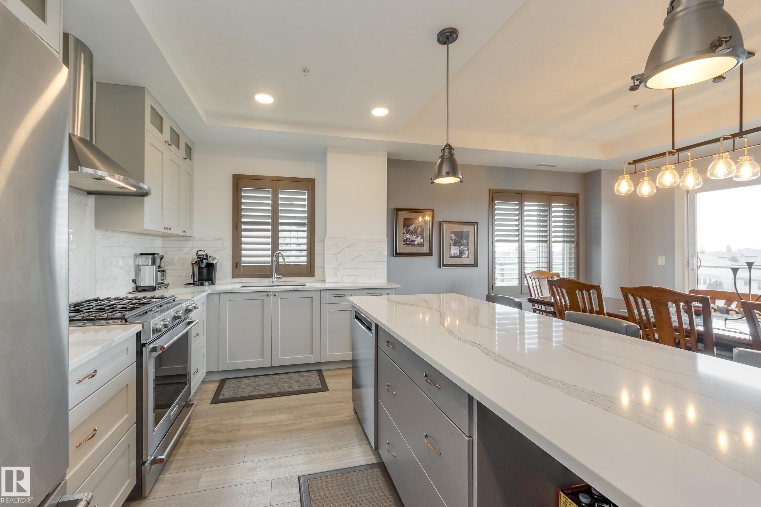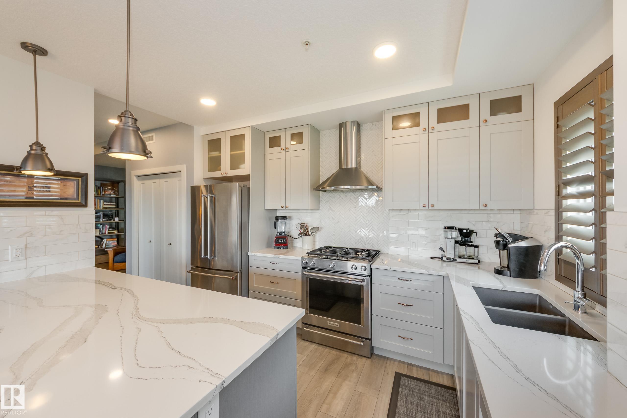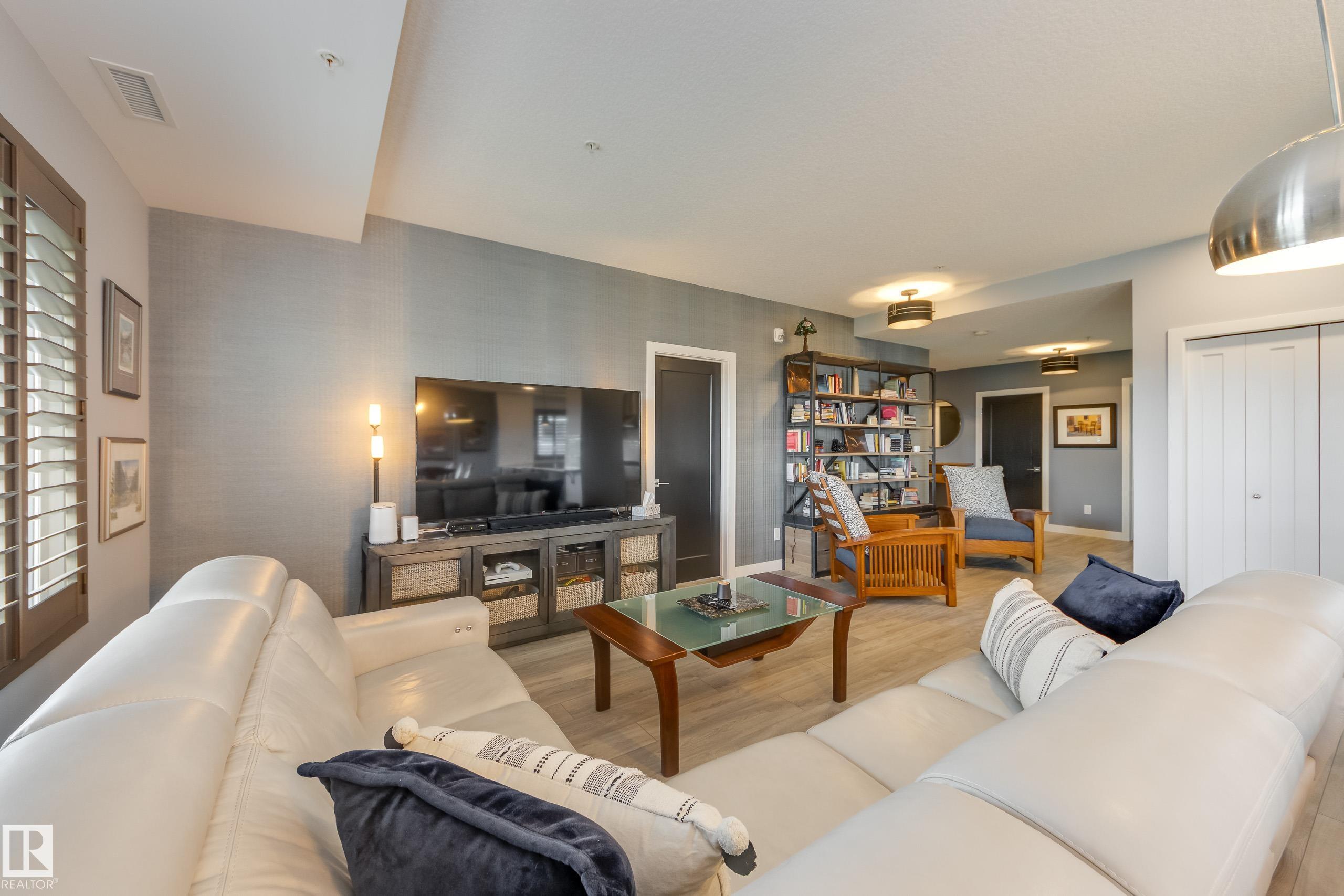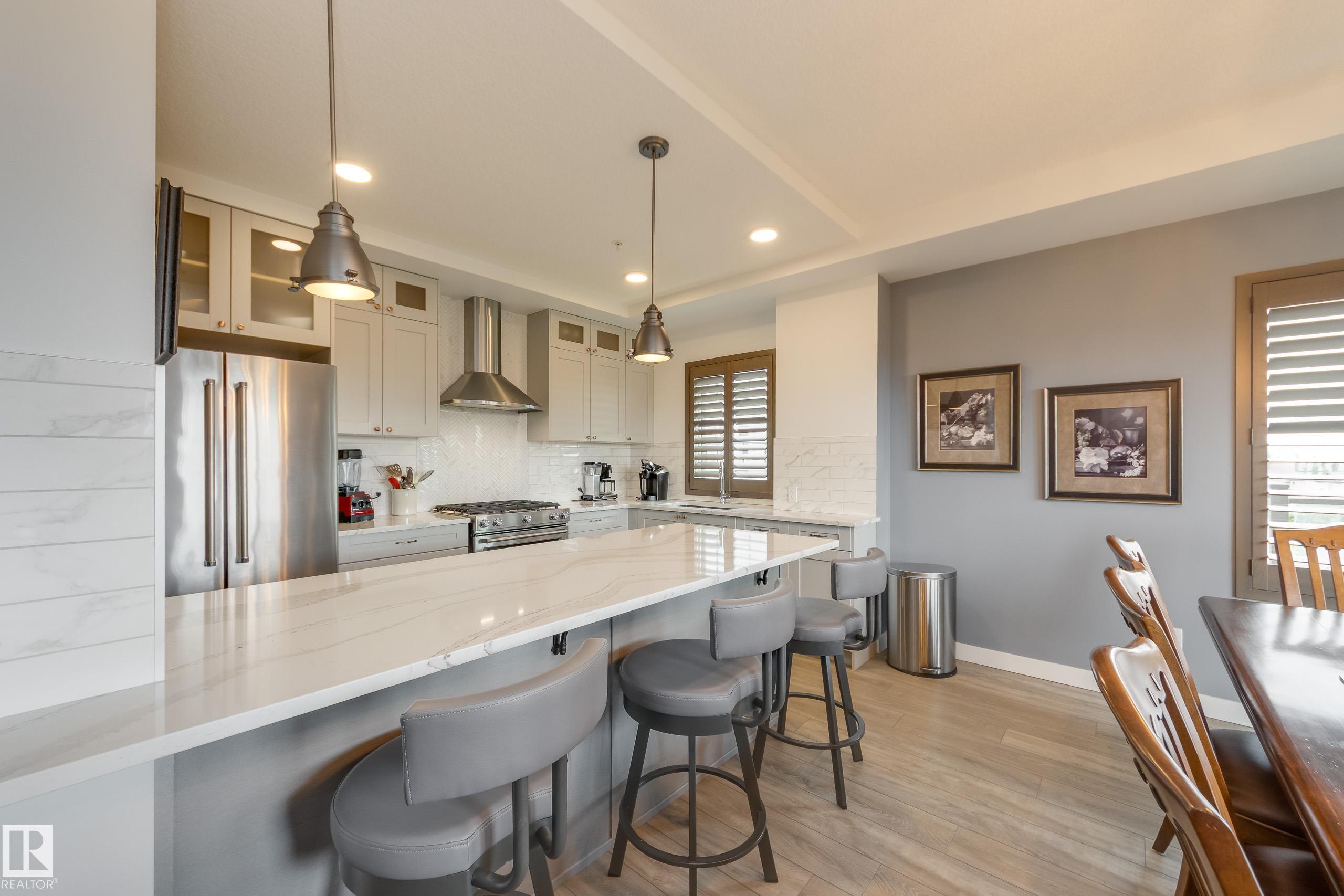 Offering 1595 Sq. Ft.of total living space! Are you looking for an executive style condo home in a secure, exclusive location? Look no further than this exquisite home with top quality finishing & upgrades plus it is a corner unit with South West exposure so you have a view of the pond & green space! Spacious foyer welcomes you home, & you will appreciate the many special touches here. A half bath is conveniently located for guests, & the open main living area offers wonderful south west views. The dining area has patio doors opening to the wrap around balcony so you can enjoy your outdoor living space with gas lines for BBQ & fire table! Kitchen is perfect for the family chef! Pantry, granite counter tops, Upgraded cabinets and appliances, including a 5 burner gas stove. Two large bedrooms, each with a walk-in closet & full ensuite bath. The den is perfect for home office, exercise space or whatever suits your life style. Comes with two underground parking stalls, storage cabinets & cage storage