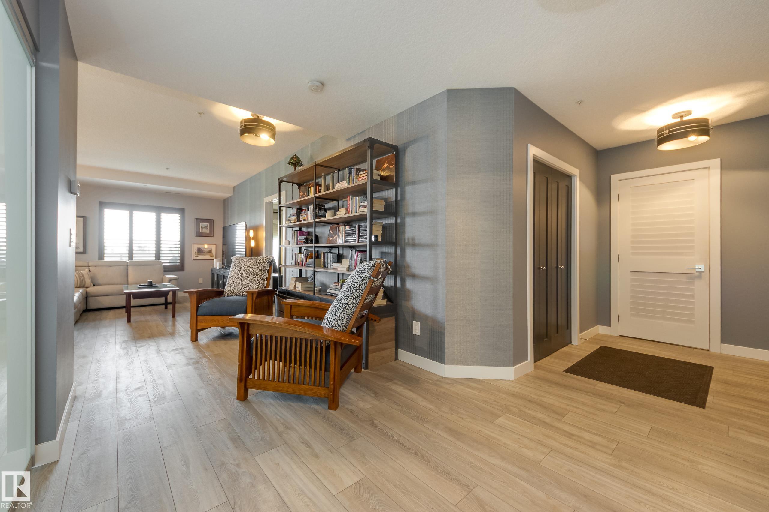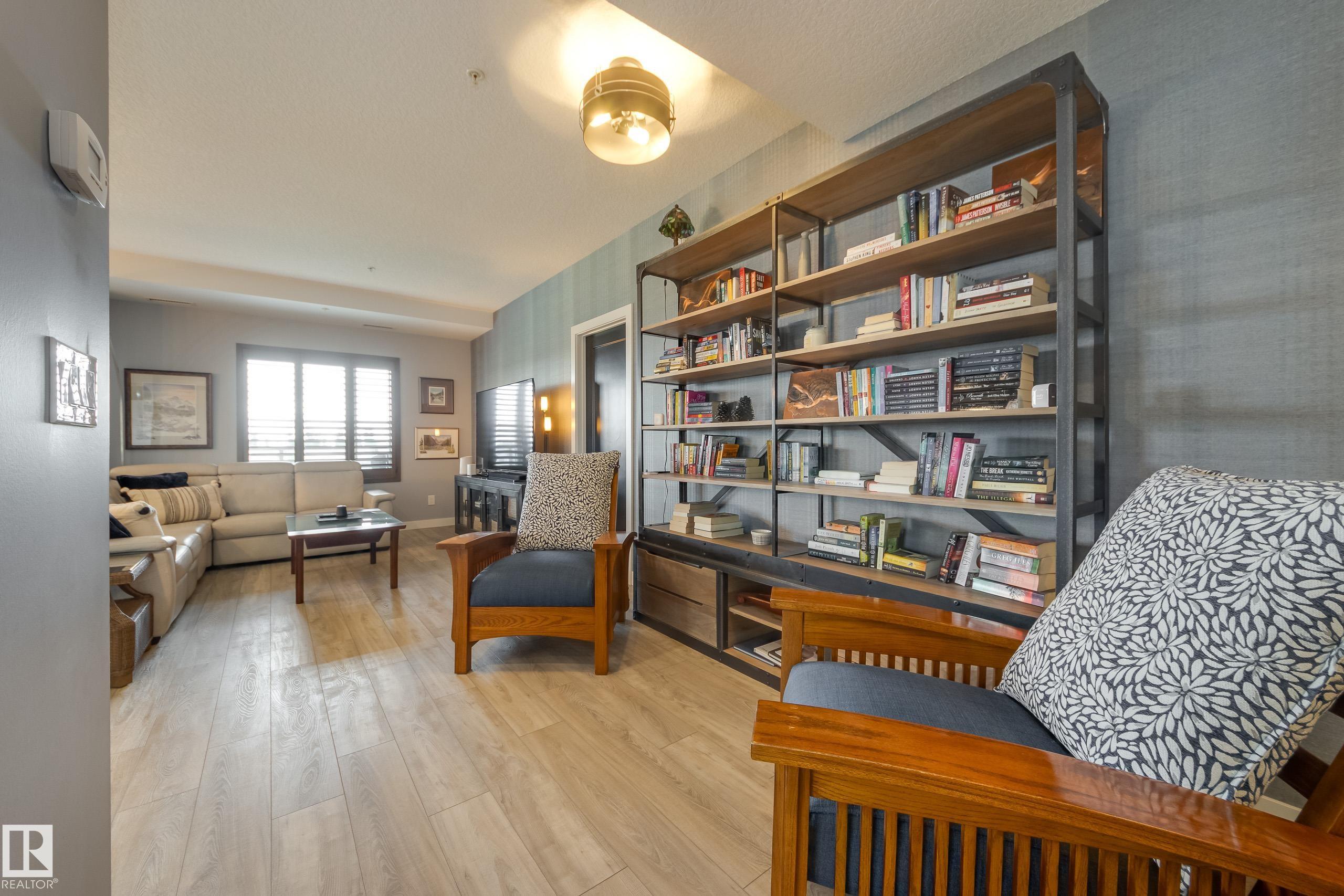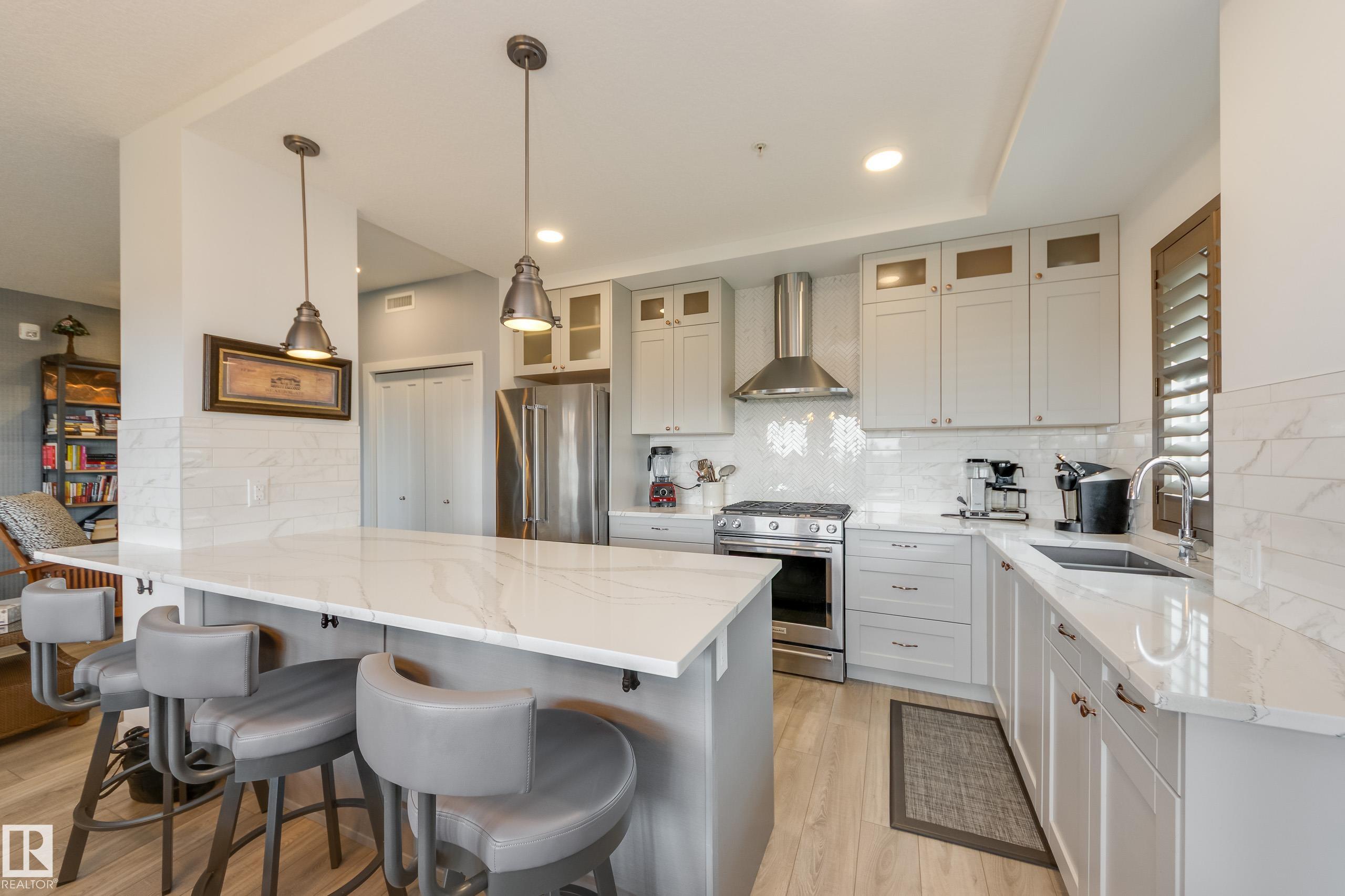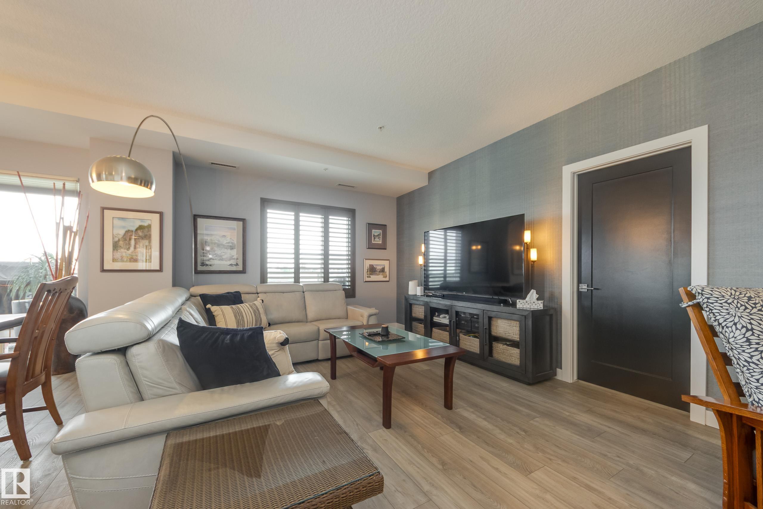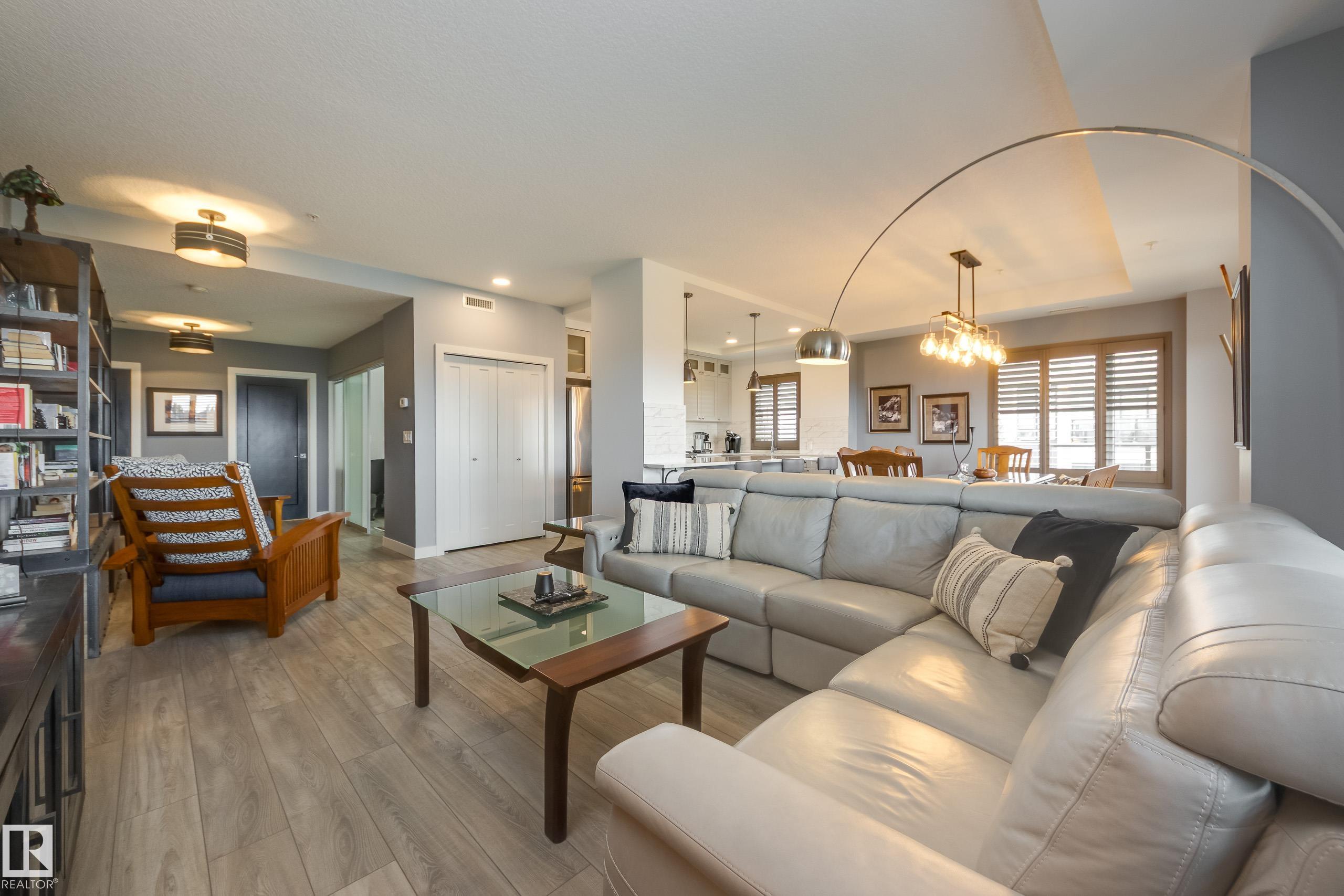 Offering 1595 Sq. Ft.of total living space! Are you looking for an executive style condo home in a secure, exclusive location? Look no further than this exquisite home with top quality finishing & upgrades plus it is a corner unit with South West exposure so you have a view of the pond & green space! Spacious foyer welcomes you home, & you will appreciate the many special touches here. A half bath is conveniently located for guests, & the open main living area offers wonderful south west views. The dining area has patio doors opening to the wrap around balcony so you can enjoy your outdoor living space with gas lines for BBQ & fire table! Kitchen is perfect for the family chef! Pantry, granite counter tops, Upgraded cabinets and appliances, including a 5 burner gas stove. Two large bedrooms, each with a walk-in closet & full ensuite bath. The den is perfect for home office, exercise space or whatever suits your life style. Comes with two underground parking stalls, storage cabinets & cage storage