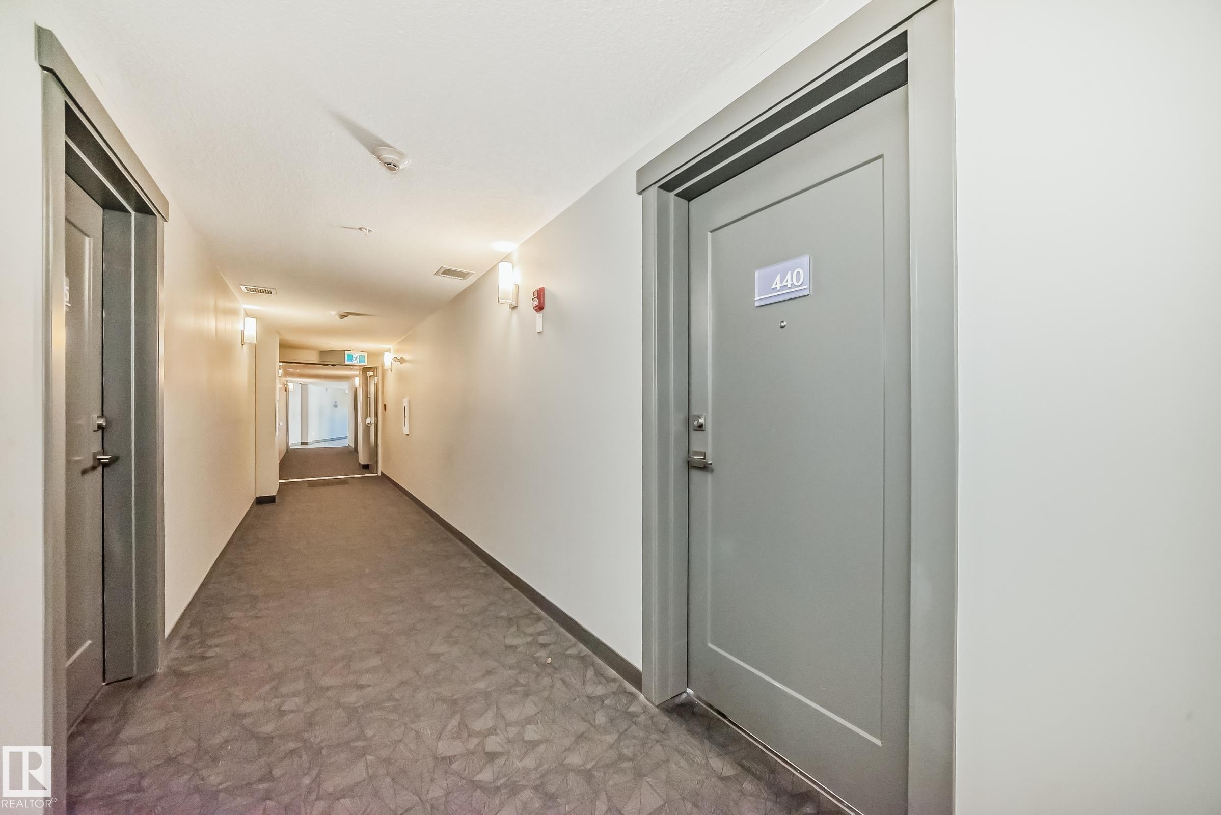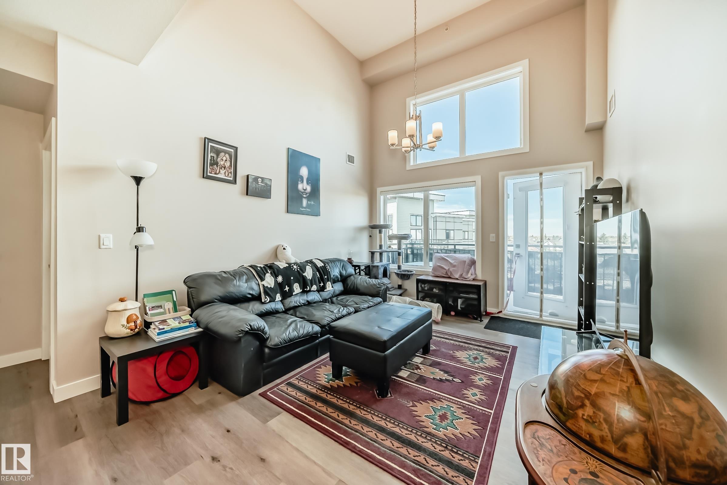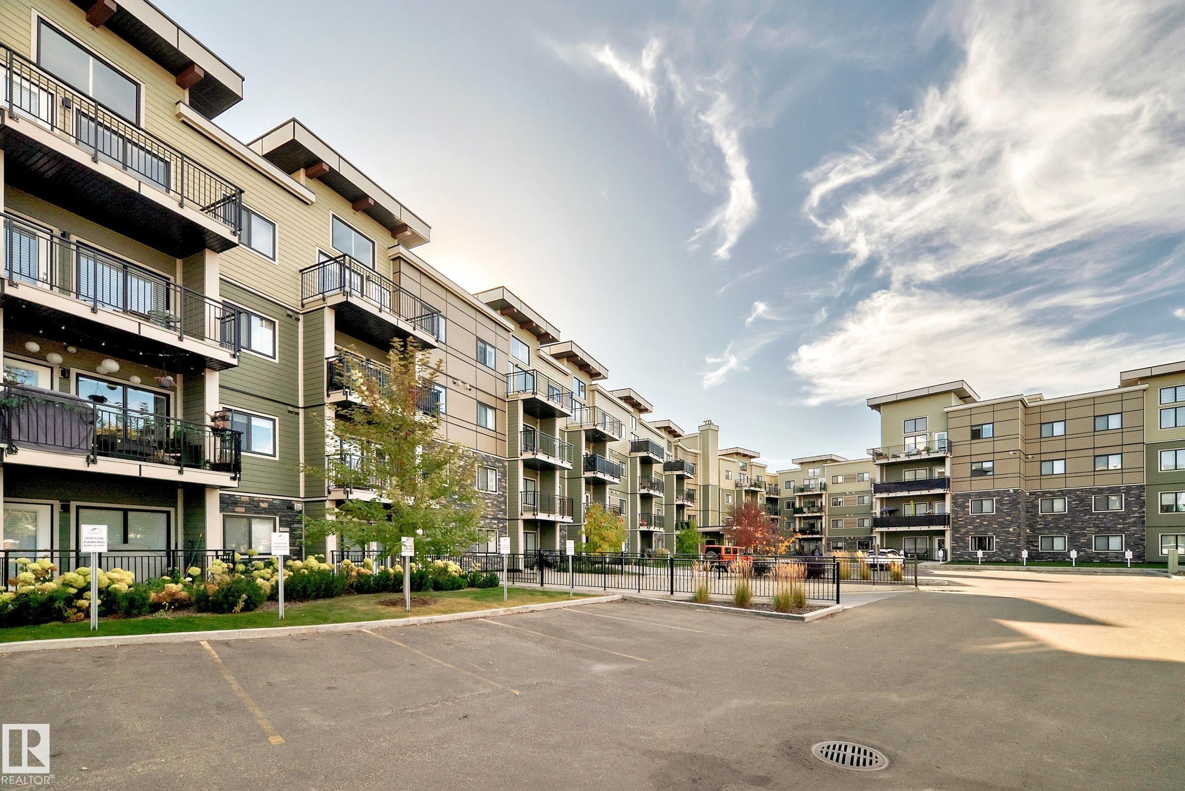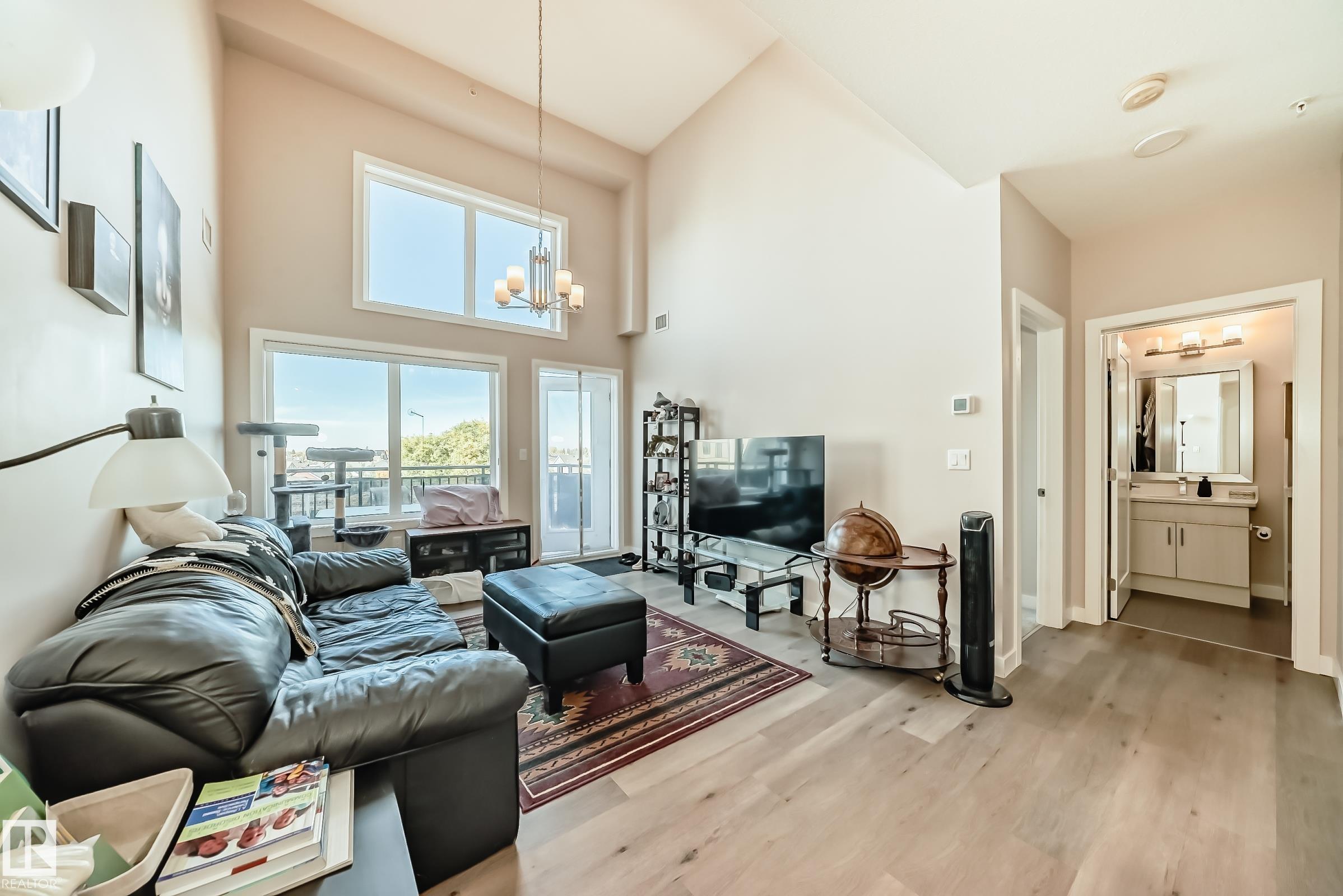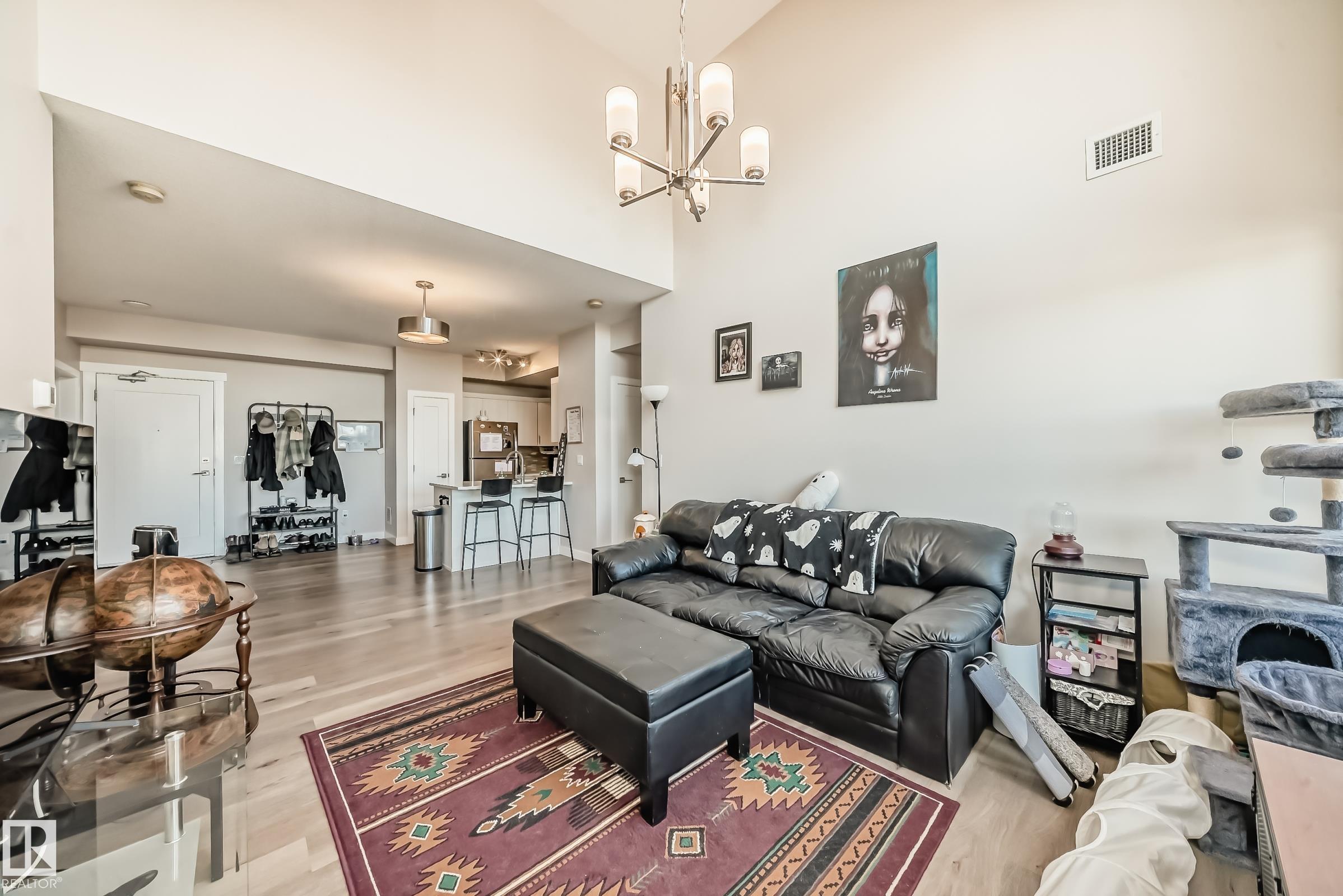 The Connaught at Griesbach - Welcome home to this stunning top-floor, north-facing 2 bedroom, 2 bathroom suite featuring a bright open-concept design and modern finishes throughout. With a builder?s size of 1,000 sq. ft., this suite offers quartz countertops, soft-close cabinetry, and low-maintenance vinyl plank flooring in the main living areas, complemented by plush carpet in the bedrooms. The impressive two-storey living room is filled with natural light from expansive windows, with a bedroom conveniently located on each side for added privacy. Step out onto the spacious deck, complete with a natural gas hookup for barbecuing. Enjoy the many building amenities, including a fitness centre, social/amenity room, library, car wash bay, and secure key fob access. Additional features include Hunter Douglas window coverings, stainless steel appliances, in-suite laundry with stacking washer and dryer, and one underground parking stall. Building was treated with fire retardant spray during construction.