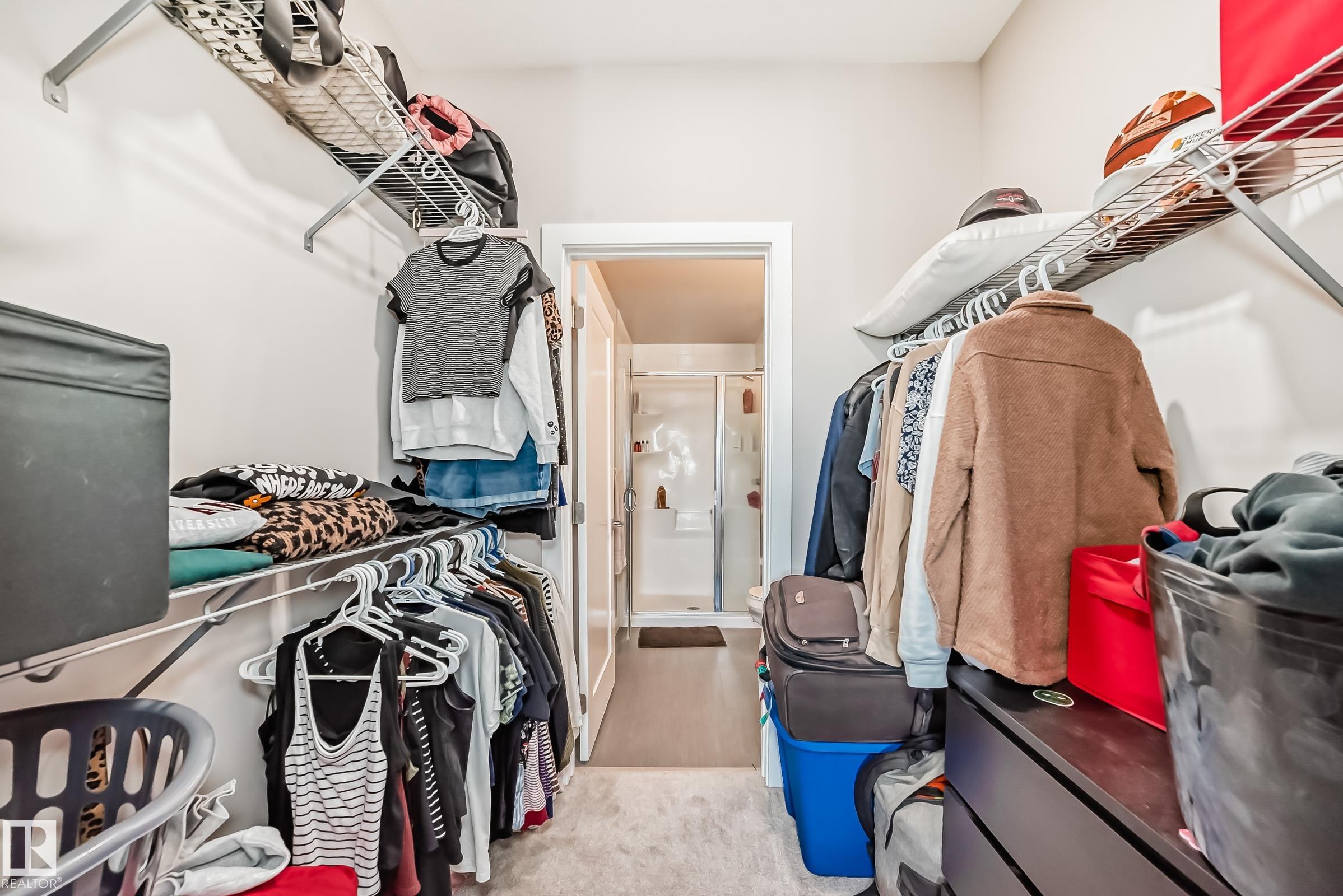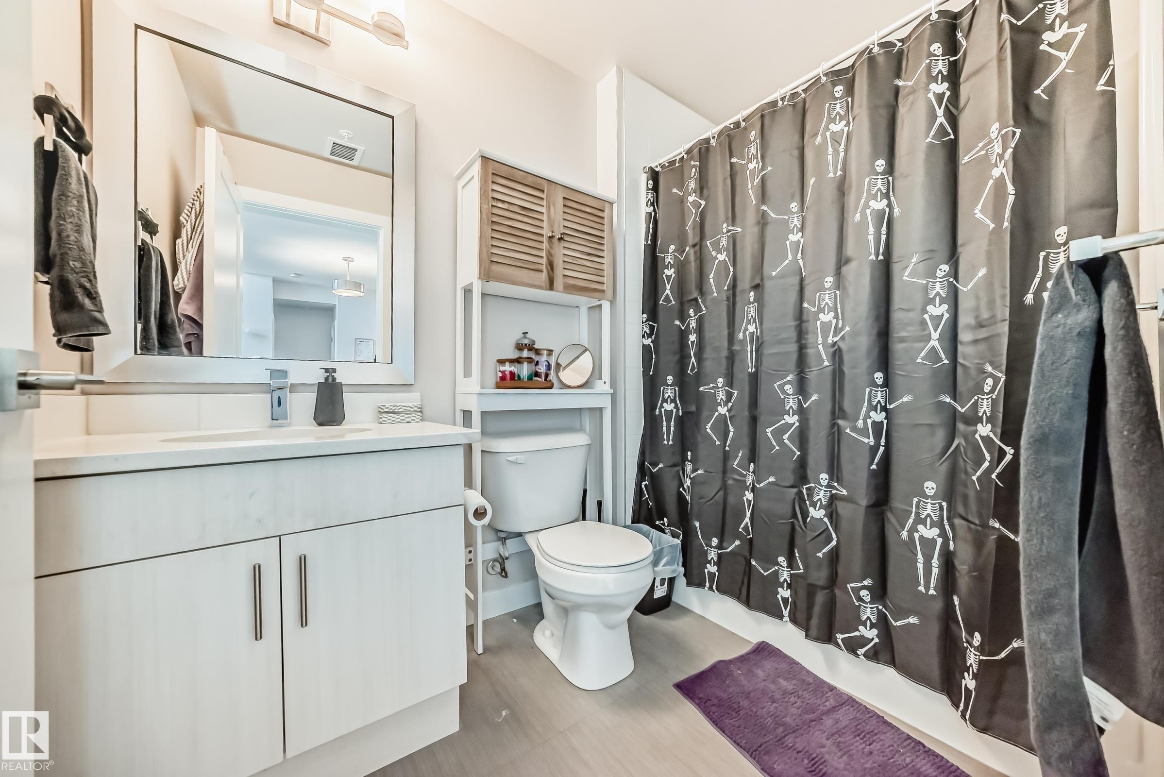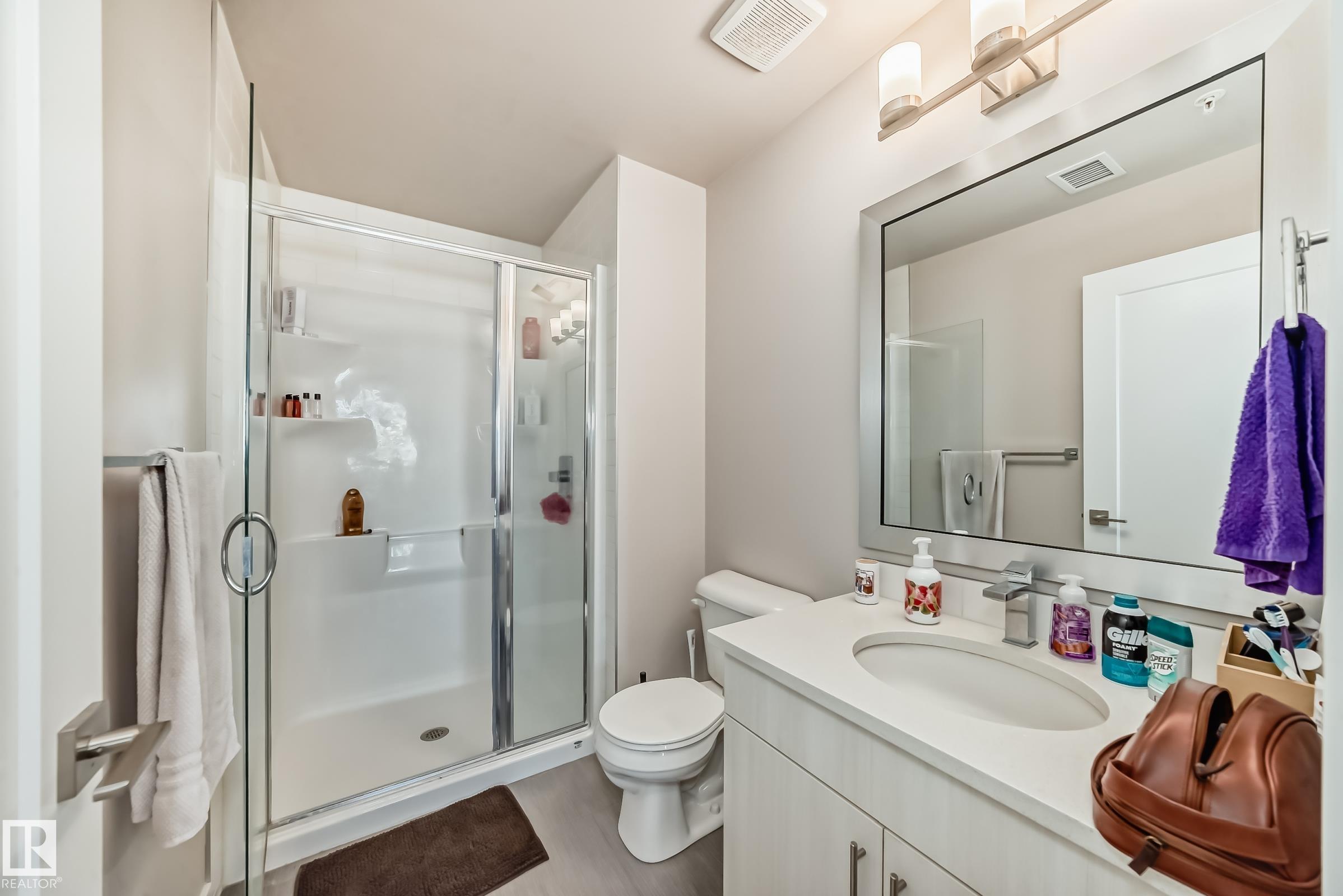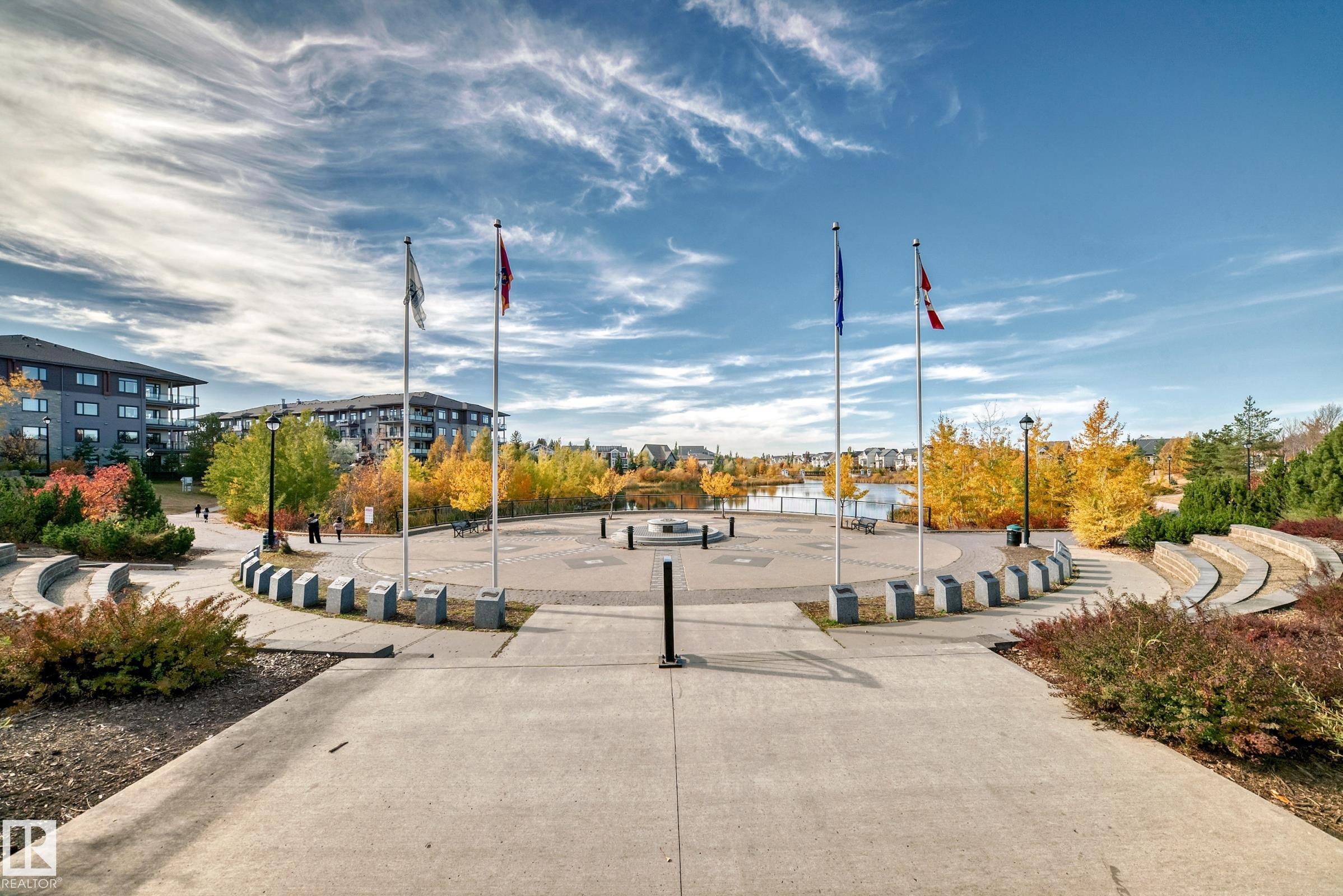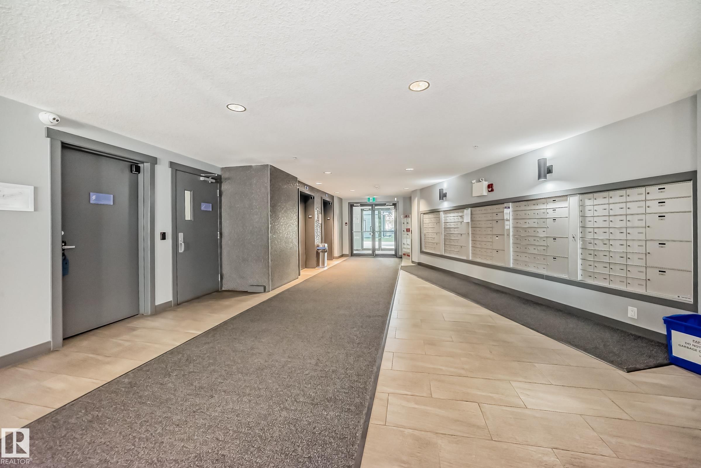 The Connaught at Griesbach - Welcome home to this stunning top-floor, north-facing 2 bedroom, 2 bathroom suite featuring a bright open-concept design and modern finishes throughout. With a builder?s size of 1,000 sq. ft., this suite offers quartz countertops, soft-close cabinetry, and low-maintenance vinyl plank flooring in the main living areas, complemented by plush carpet in the bedrooms. The impressive two-storey living room is filled with natural light from expansive windows, with a bedroom conveniently located on each side for added privacy. Step out onto the spacious deck, complete with a natural gas hookup for barbecuing. Enjoy the many building amenities, including a fitness centre, social/amenity room, library, car wash bay, and secure key fob access. Additional features include Hunter Douglas window coverings, stainless steel appliances, in-suite laundry with stacking washer and dryer, and one underground parking stall. Building was treated with fire retardant spray during construction.