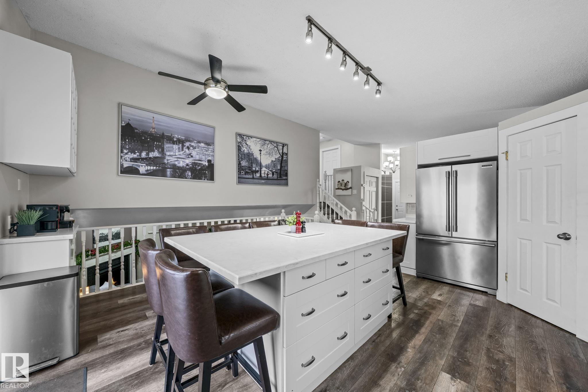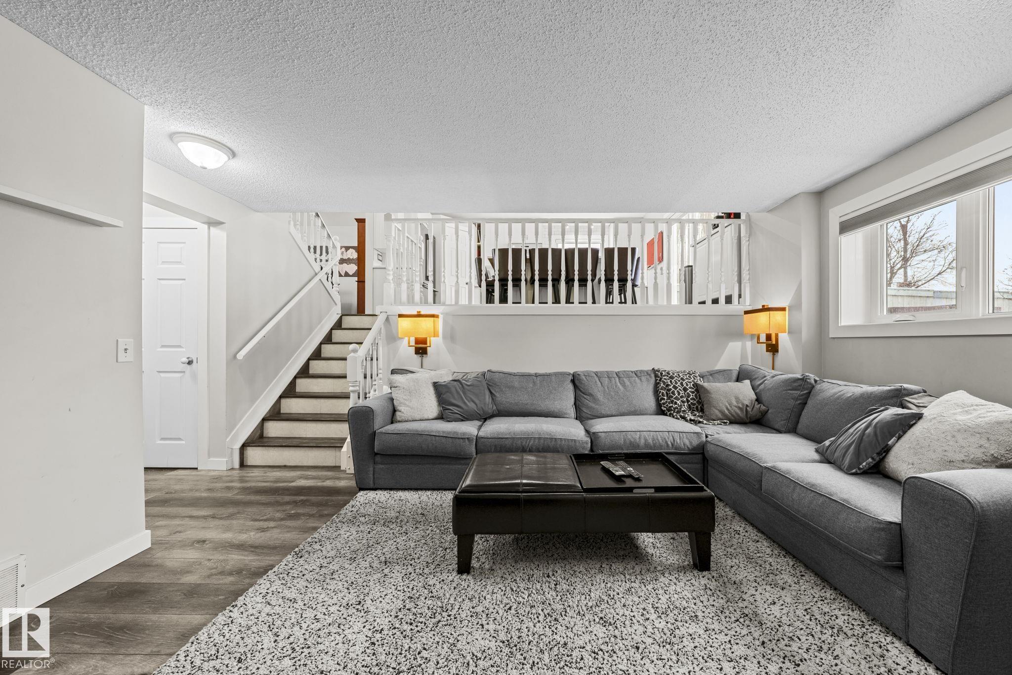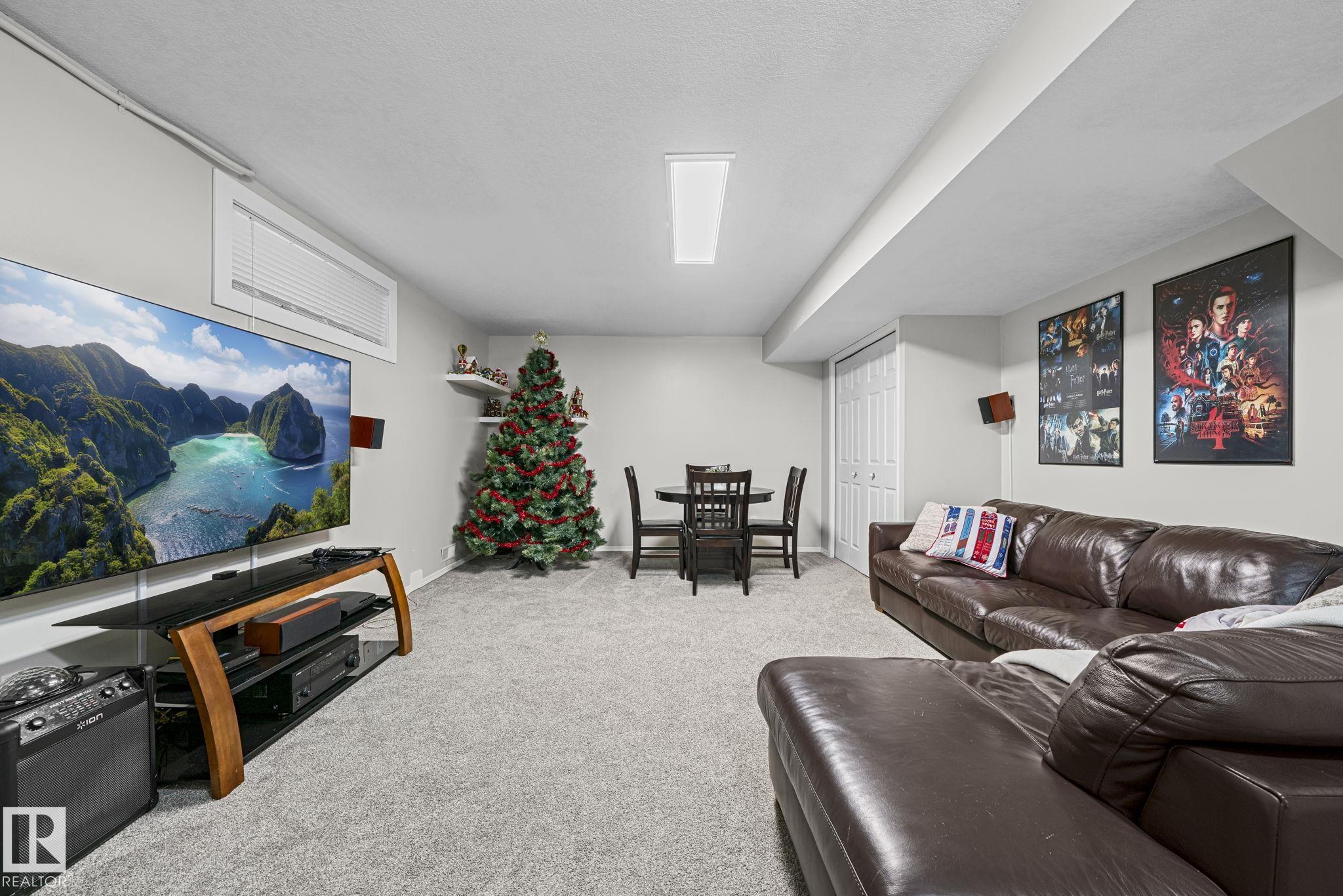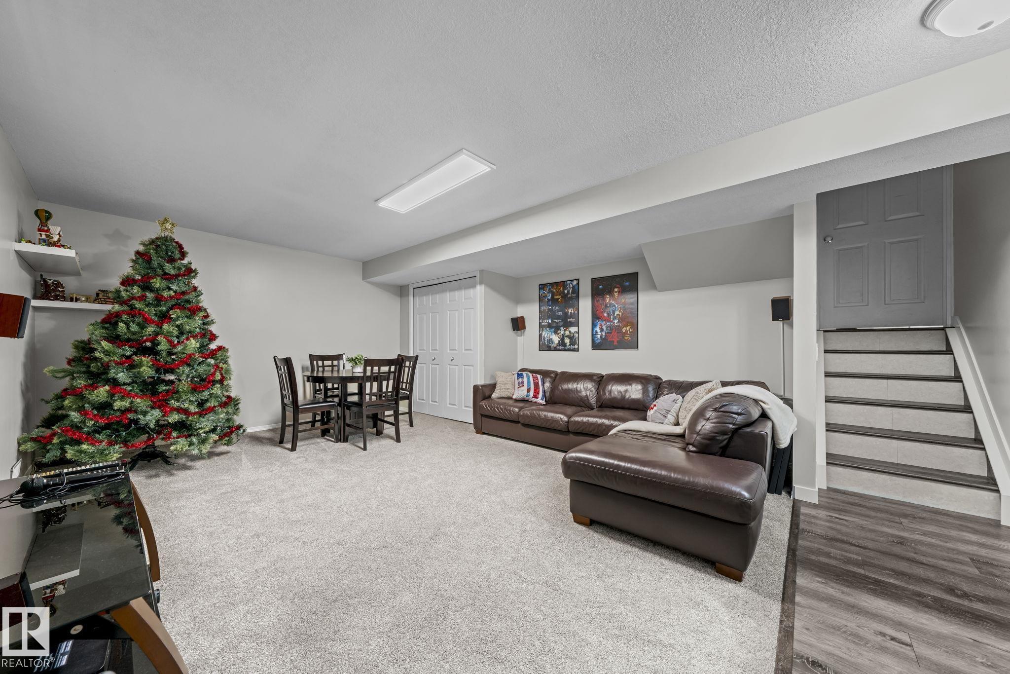Prepare to be delighted by this beautiful 4 level split tucked into family friendly Jamieson Place. You are welcomed into a bright foyer and airy living/dining room with vaulted ceilings and updated flooring. Step into the gorgeous updated chefs kitchen with stainless steel appliances including a new gas stove, massive island and loads of cupboard space. Step down into the spacious family room with cozy gas fireplace, the perfect spot to relax. A large 3pc bathroom and bedroom/office complete this level. Upstairs is home to three more bedrooms including a primary with 3pc ensuite, and another 4pc bathroom. The basement hosts another fully finished living area for games and movies. Enjoy privacy in your west facing backyard, backing directly on to a massive greenspace - no rear neighbors and stunning sunsets. Upgrades include: A/C, newer appliances, 50-year shingles, finished heated garage and new triple pane windows. Minutes from schools, amenities, and very quick access to Henday. Welcome home!