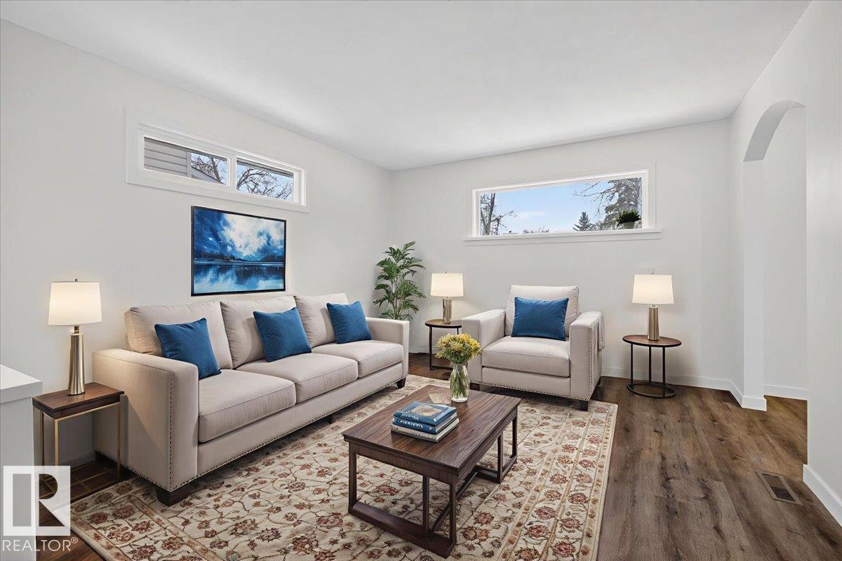 Beautifully Renovated 4 level split in Beaumont is Move In Ready! 4 beds 2 full baths; Brand Renos: New kitchen, 4 Samsung stainless steel appliances including built in dishwasher and microwave hood fan; 2 full bathrooms, vinyl plank flooring, carpet and paint through out. Recent Reno's: PVC windows (2019 & 22), All new gutters, soffit, exterior door and A/C (2022), hot water tank (2021), estimate roof to be 2012. Add a great garden shed in your sizable yard backing on to Canel Leblanc Playground & Park. Quiet friendly neighbours and groceries, pharmacy, shopping and more all with in walking distance. Beaumont offers a blend of small-town charm and urban convenience with close proximity to Edmonton, a strong sense of community, beautiful walkable neighborhoods, excellent family amenities, affordable living, manageable commutes, a growing local economy, and a safe, peaceful environment. Some pictures are virtually staged