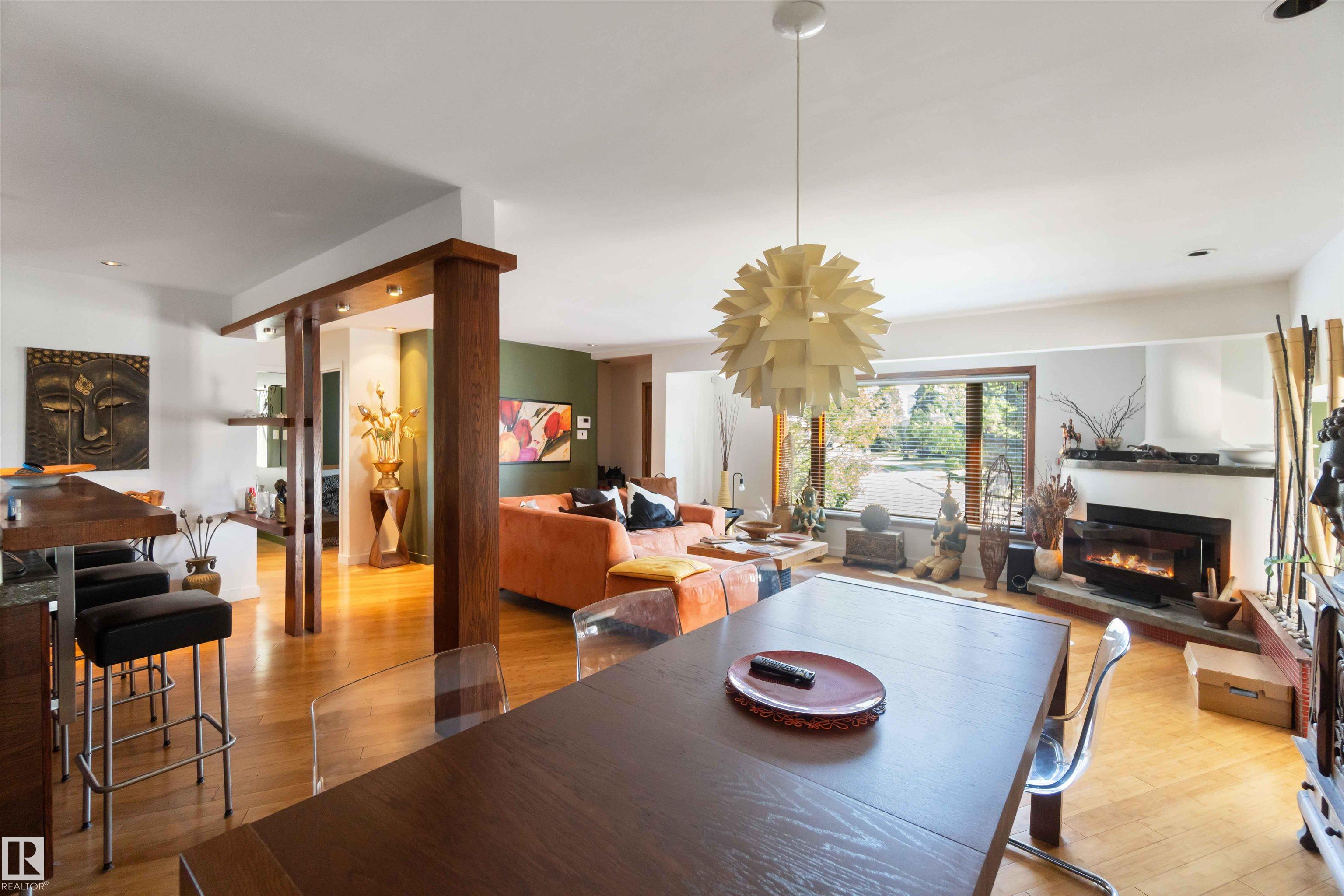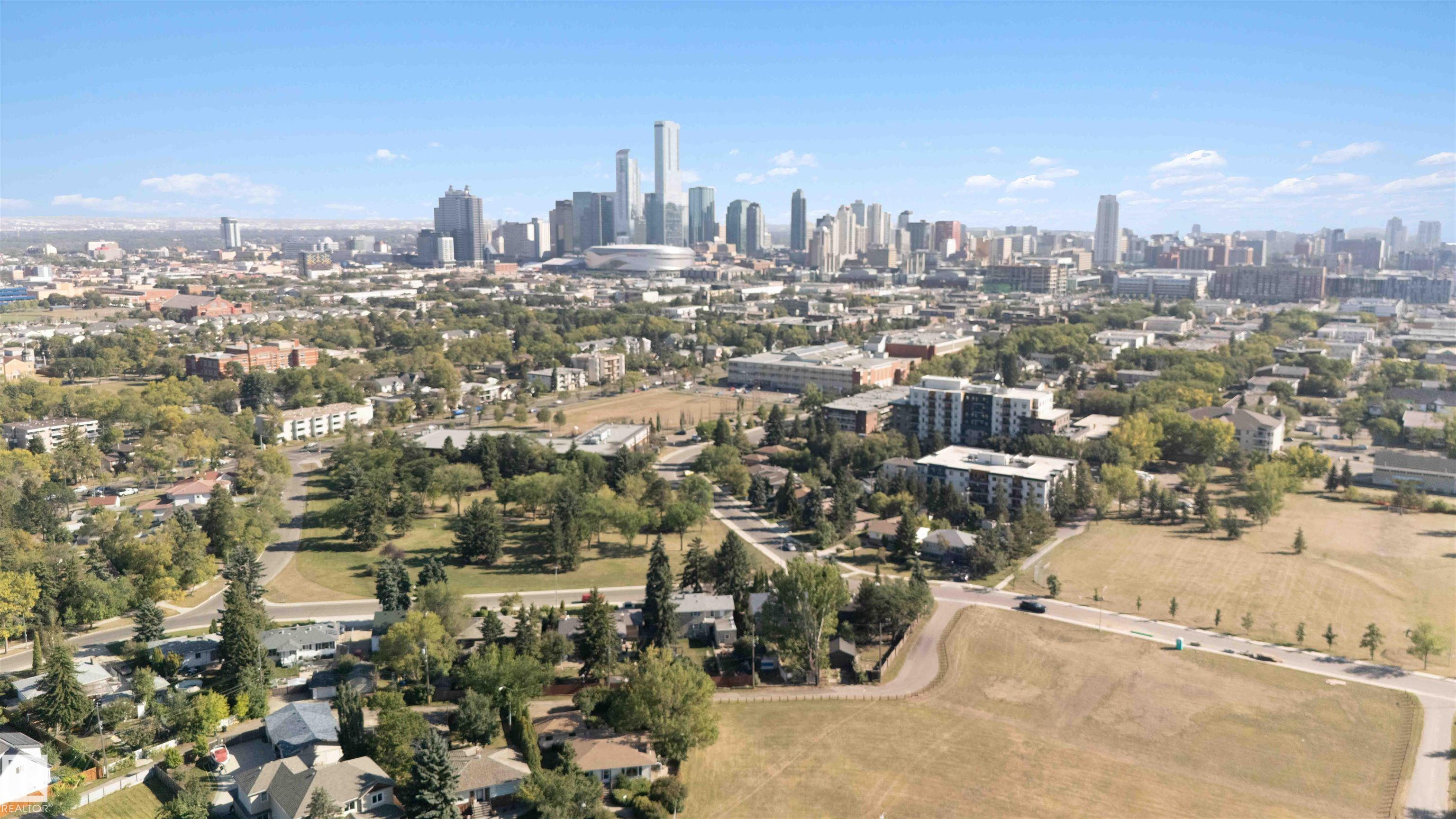 CORNER LOT HOME. TURN KEY - READY! UPDATED BUNGALOW ON A LARGE PIE-SHAPED CORNER LOT (7,285 sq.ft.) in Queen Mary Park?steps from NAIT, Kingsway Mall, Grant MacEwan, Downtown, and adjacent to three green spaces/parks. This unique home has a tower attachment to the main bungalow. The main floor features bamboo flooring, two bedrooms, a bathroom with a jacuzzi tub, and an open-beam kitchen with modern lighting and concrete countertops. Additional highlights include a stone fireplace, water heating system, and a green room with heated floors.The tower?s upper-level bedroom showcases cinematic downtown views. The basement is partially finished with laundry and a 3-piece tiled bathroom.The fenced in backyard is a private, lush oasis with single-garage parking. Ideal as a primary residence, redevelopment project, or investment opportunity. Bonus: can be negotiated and combined with the neighboring property (11022?110 Avenue) for a double-wide corner lot opportunity.