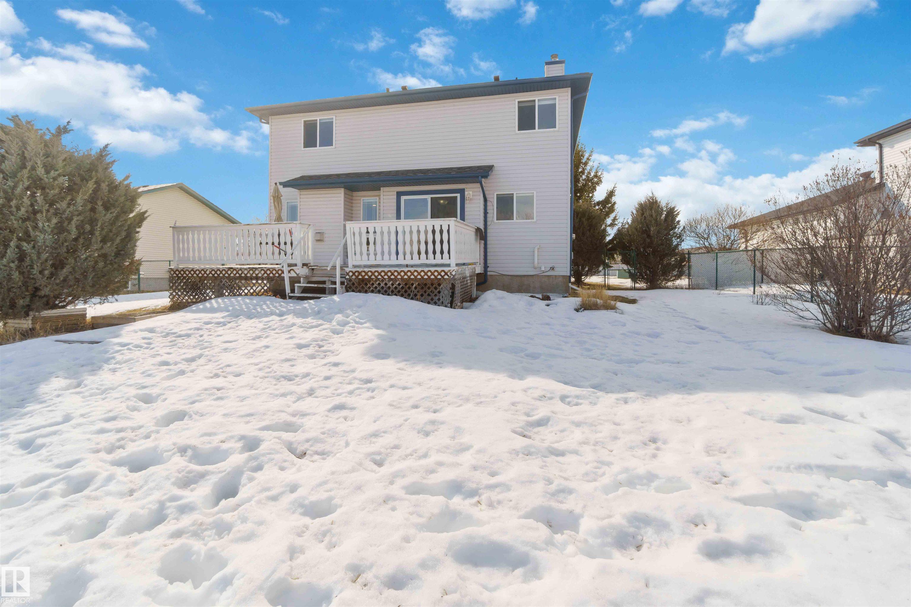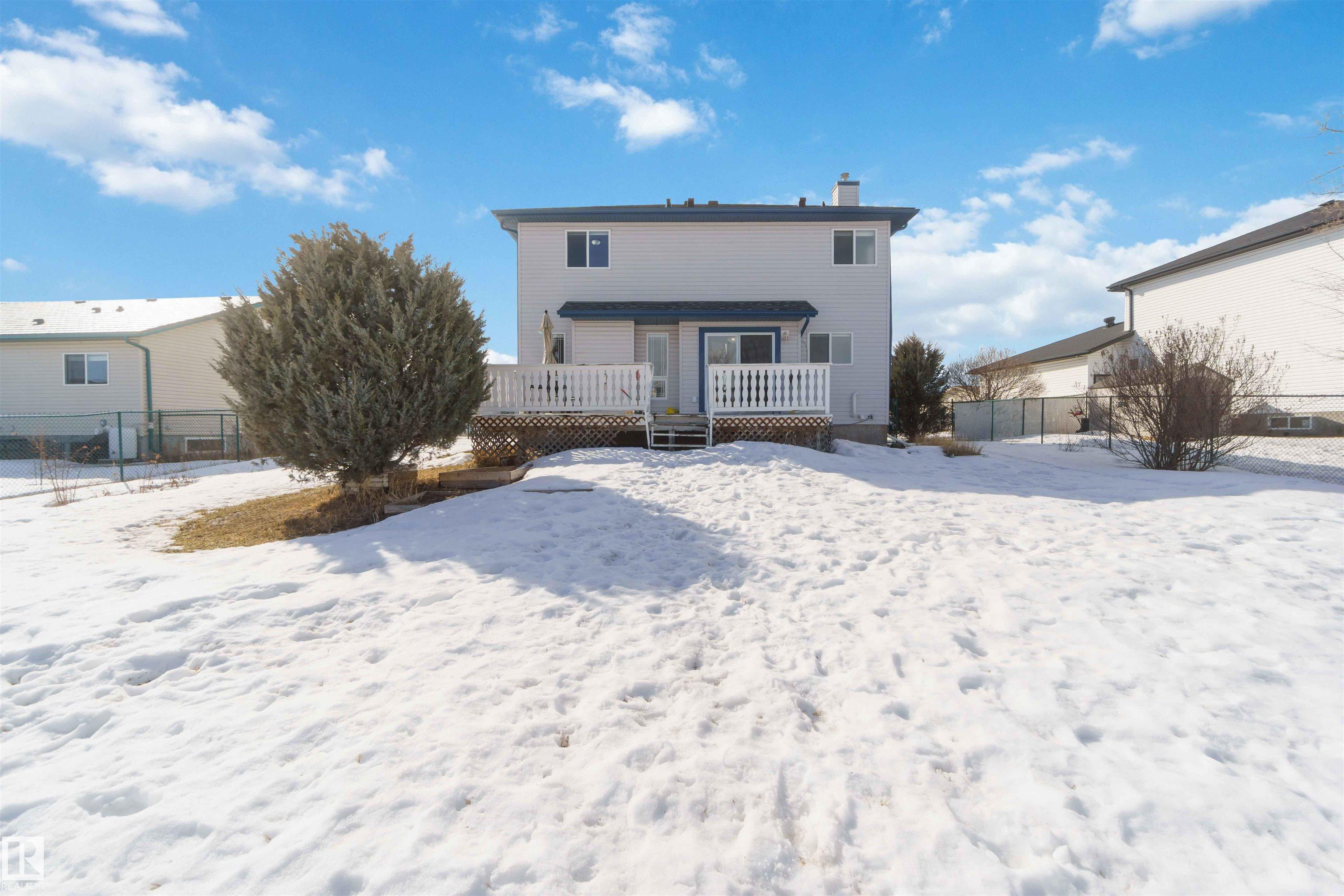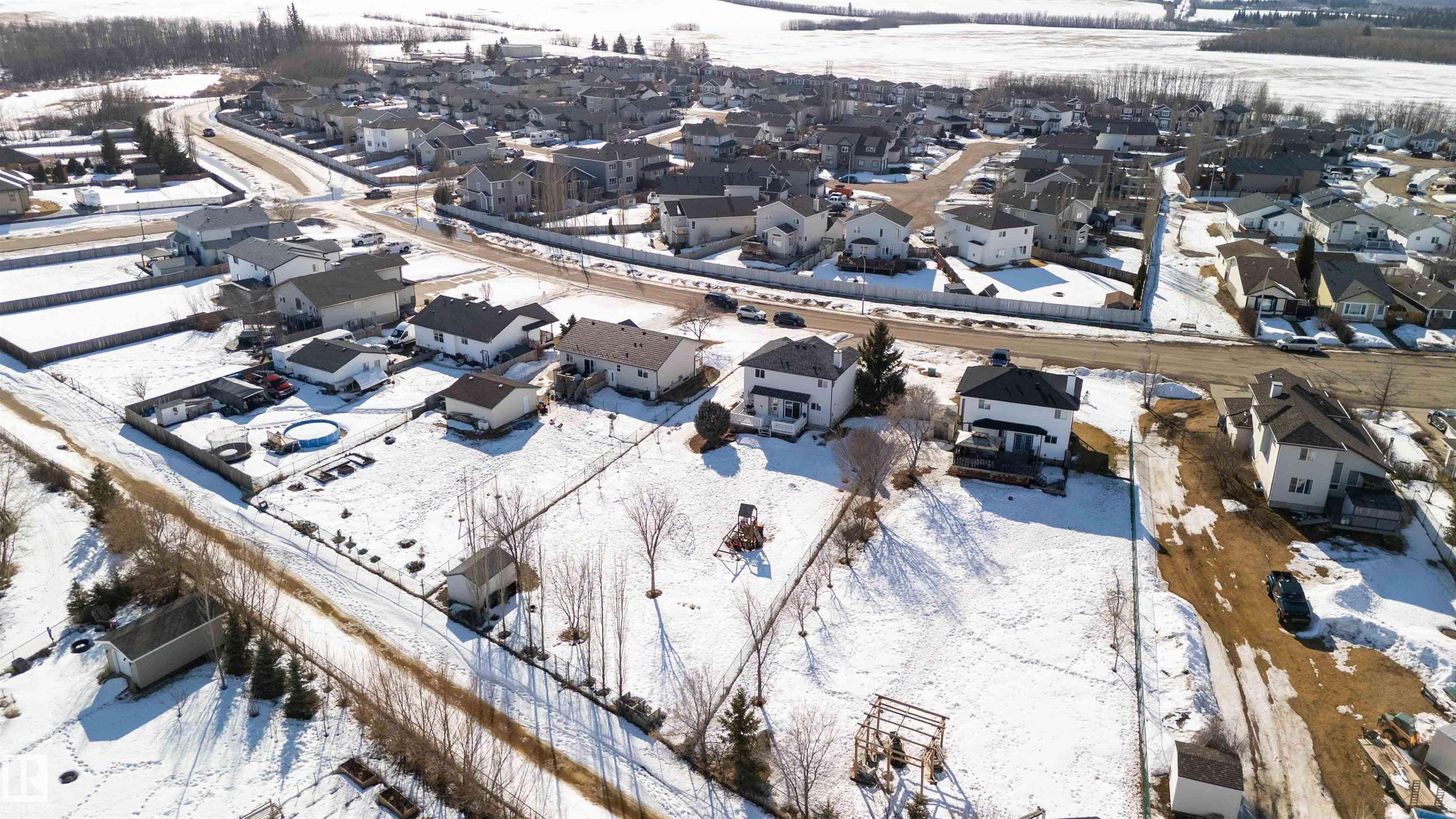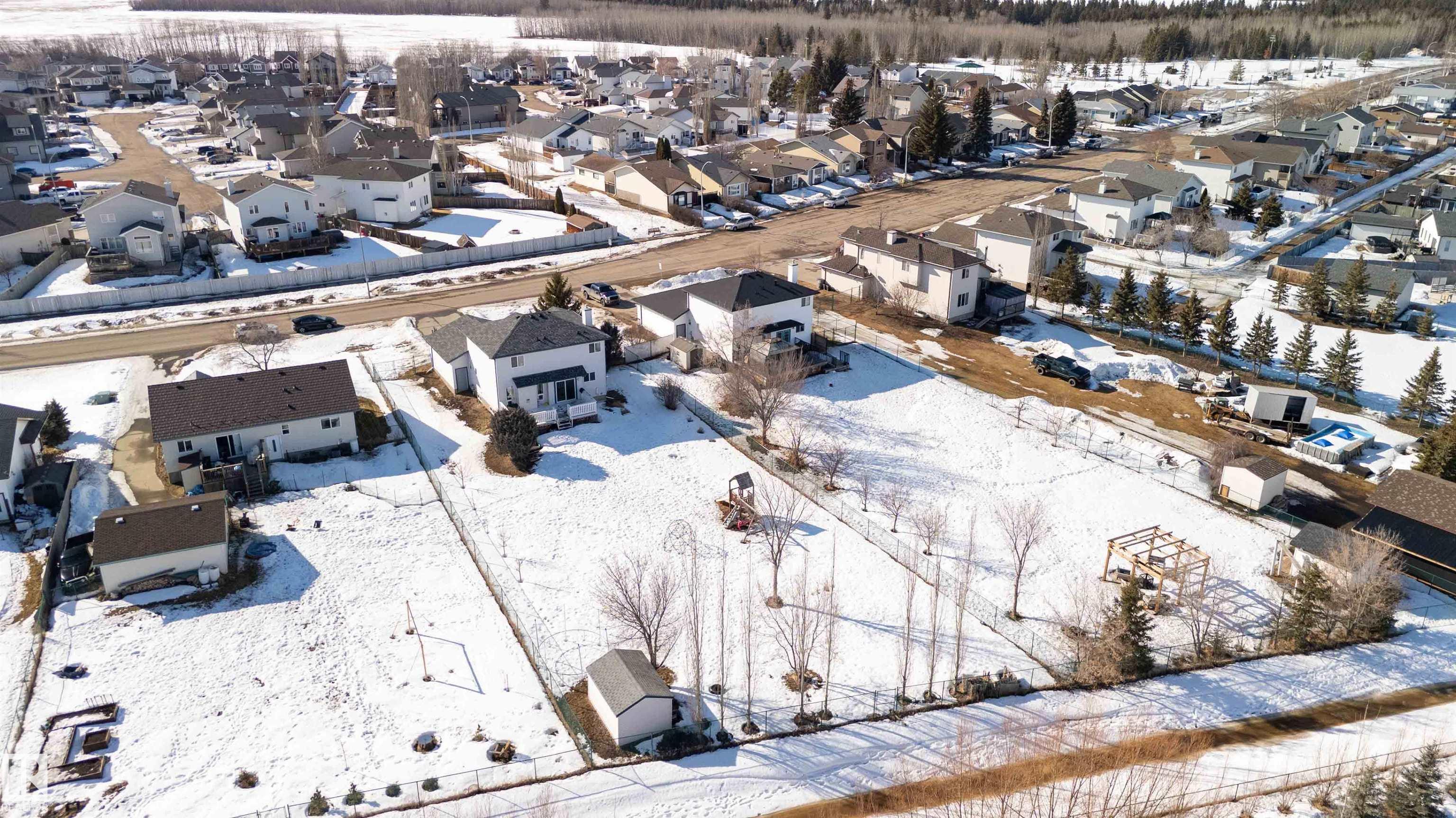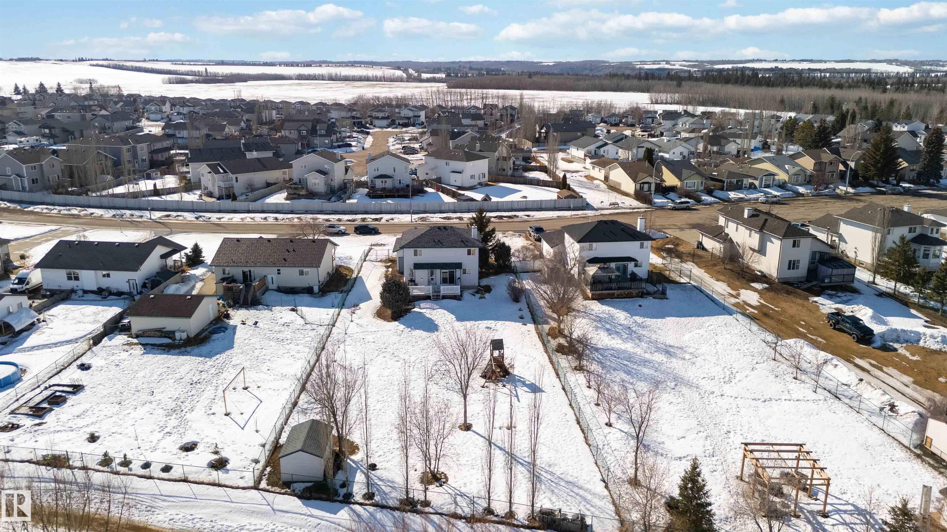 Ever dream of owning a .4-acre lot with the convenience of city water? This solid 2004-built, 1,816 sq. ft. two-storey home offers the perfect balance of massive outdoor space for the kids to play without the high maintenance of full acreage living. Featuring 5 bedrooms, two main-floor living rooms, and a fully developed basement with an additional rec room, there is space for everyone. The home is topped with a new roof (2024) and features a bright, west-facing layout. Outside, you?ll find a large garden, numerous fruit trees, a shed, and a deck with a gas BBQ hookup. The property includes a double attached garage and ample parking for an RV. Perfectly situated for convenience, you are walking distance to the elementary school and just 15 minutes from CFB Edmonton. This is a rare opportunity to secure a spacious family home on a prime, oversized lot.