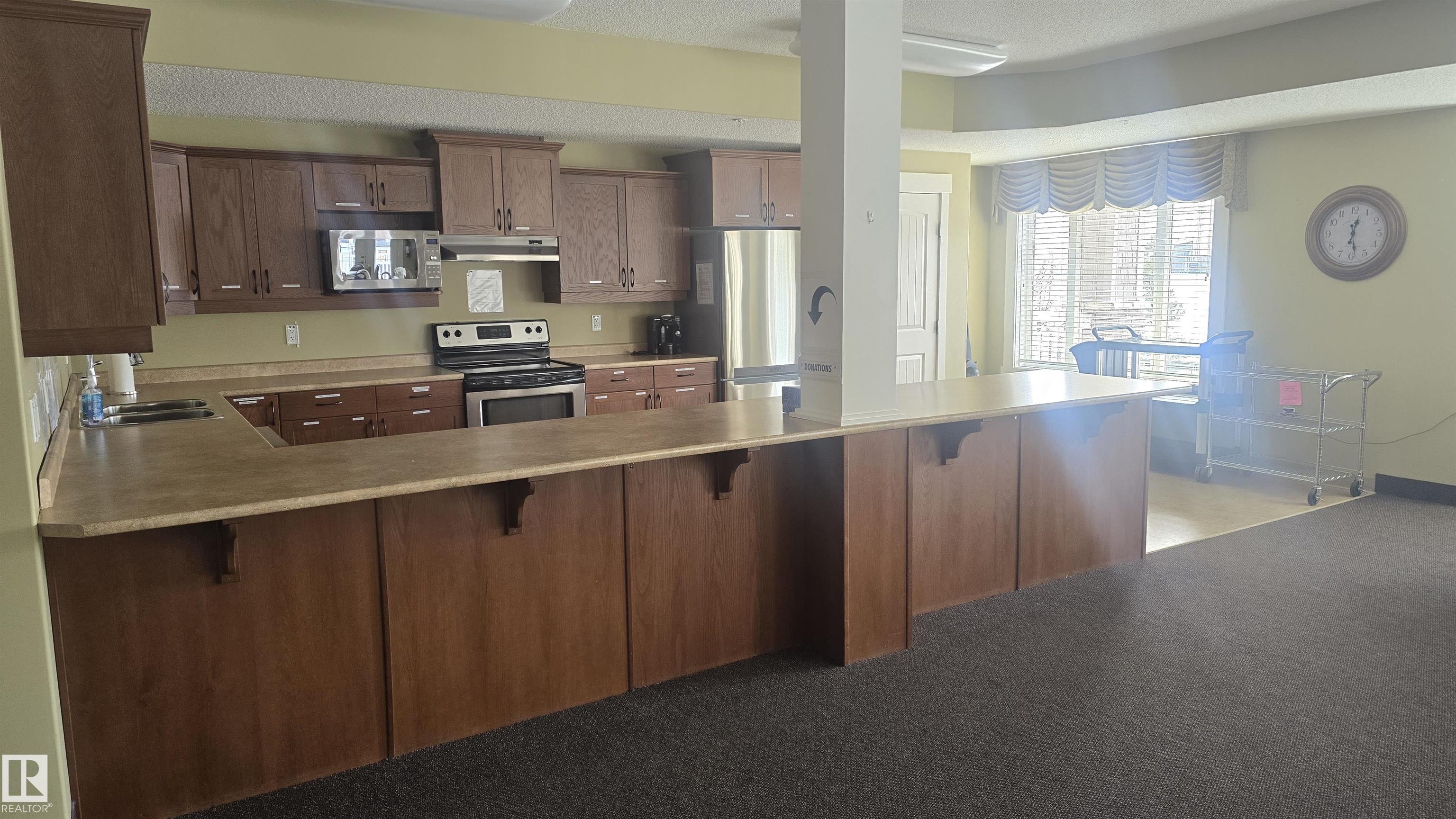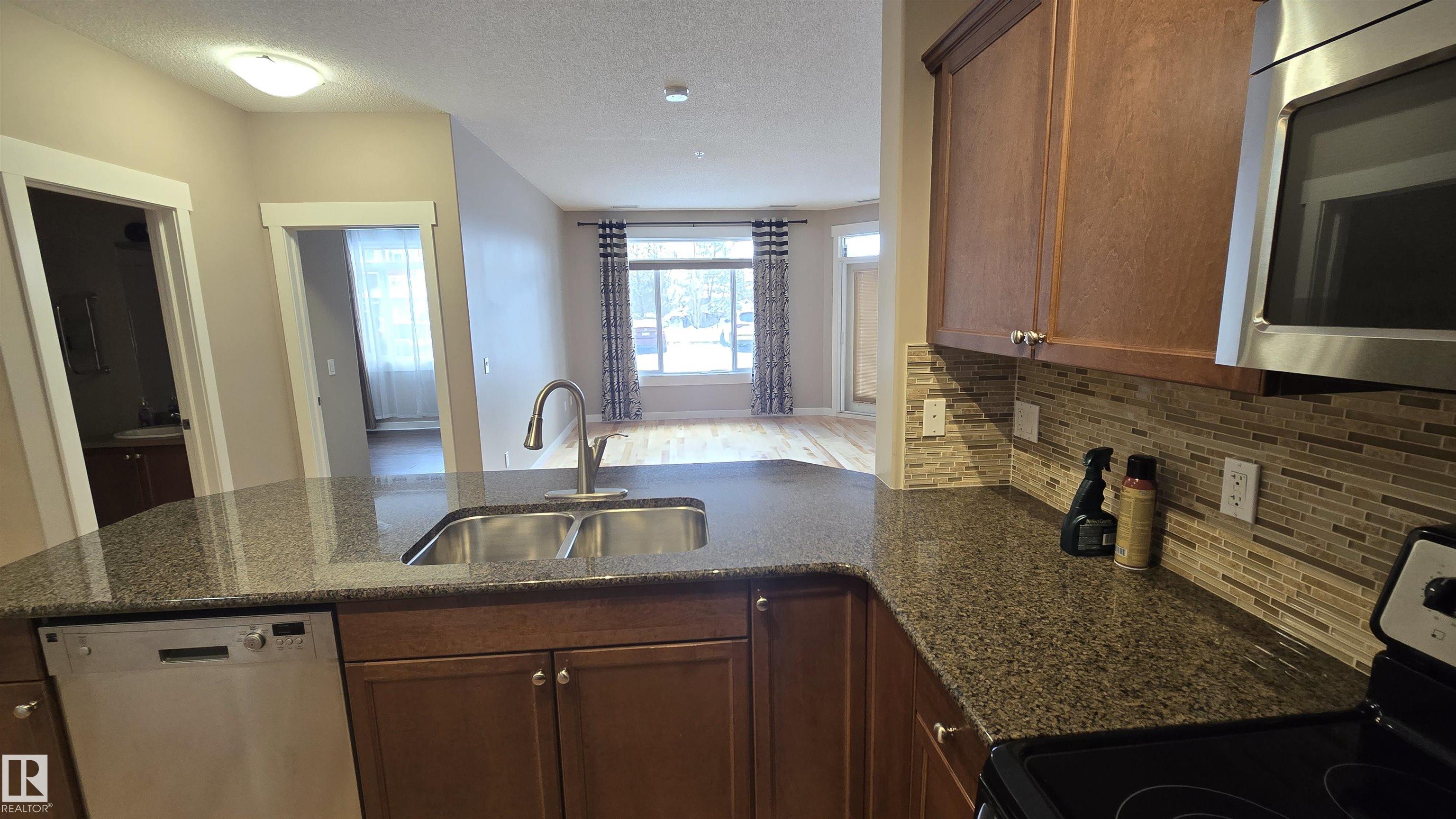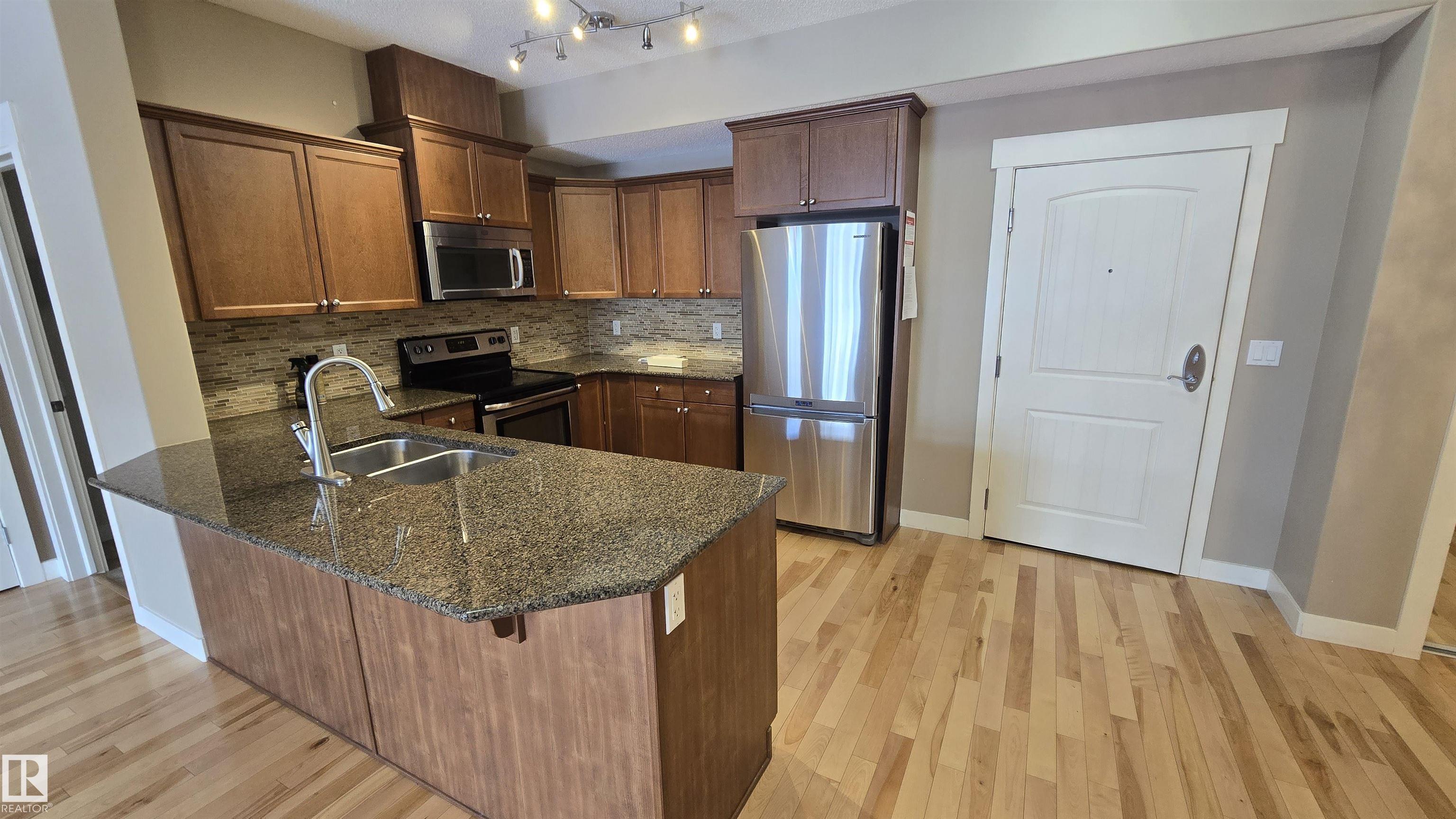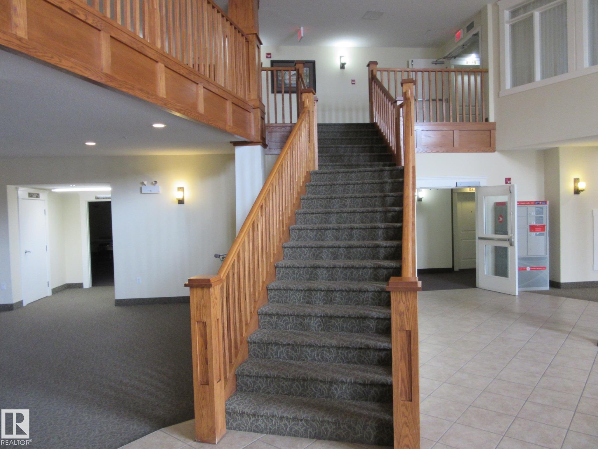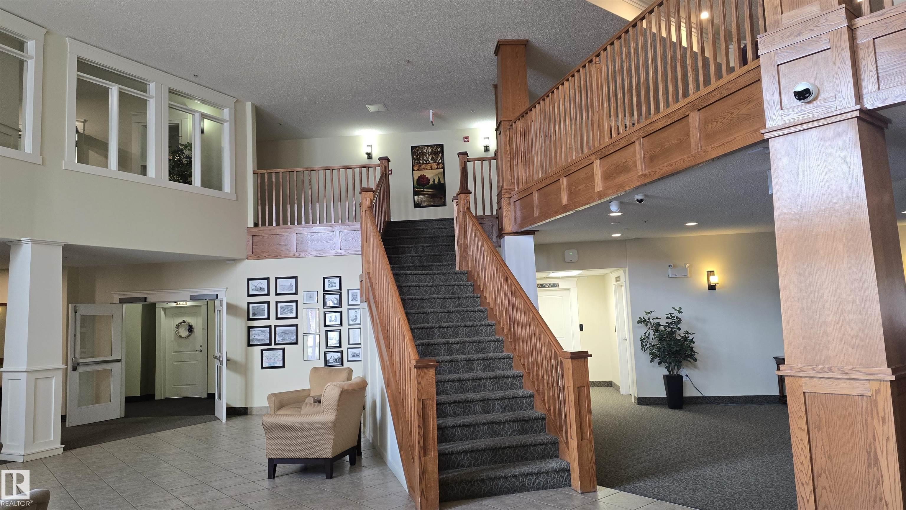 Welcome to prestigious 55+ living in Spruce Grove! This beautifully maintained two bedroom condo offers a perfect blend of comfort and lifestyle in a sought-after adult community. The bright kitchen features lovely cabinetry, upgraded gleaming granite countertops, and stainless steel appliances, complemented by vinyl plank flooring throughout. Enjoy the convenience of in-suite laundry and relax on your spacious main floor north-facing balcony, ideal for morning coffee and summer evenings. Situated on the main floor of a well-kept 4-storey building, residents enjoy exceptional amenities including an elegant lobby, social activity center with full kitchen, theatre room, games and cards room, library, and inviting many sitting areas. Additional highlights include heated underground parking, ample visitor parking, and a beautifully landscaped courtyard with a tranquil water feature. A welcoming community offering a vibrant lifestyle, comfort, and the opportunity to build lasting friendships.