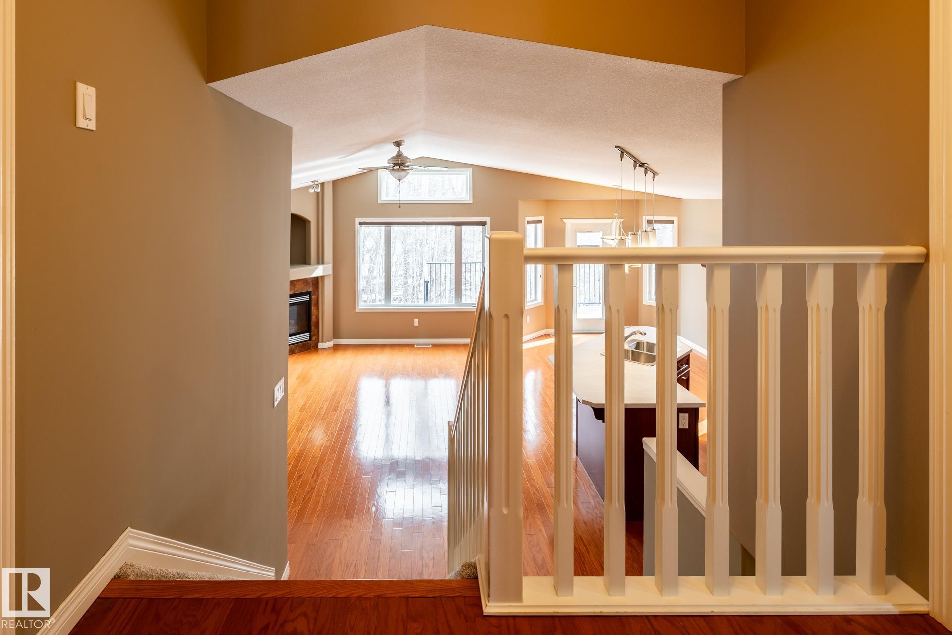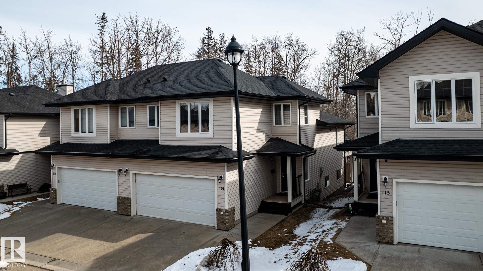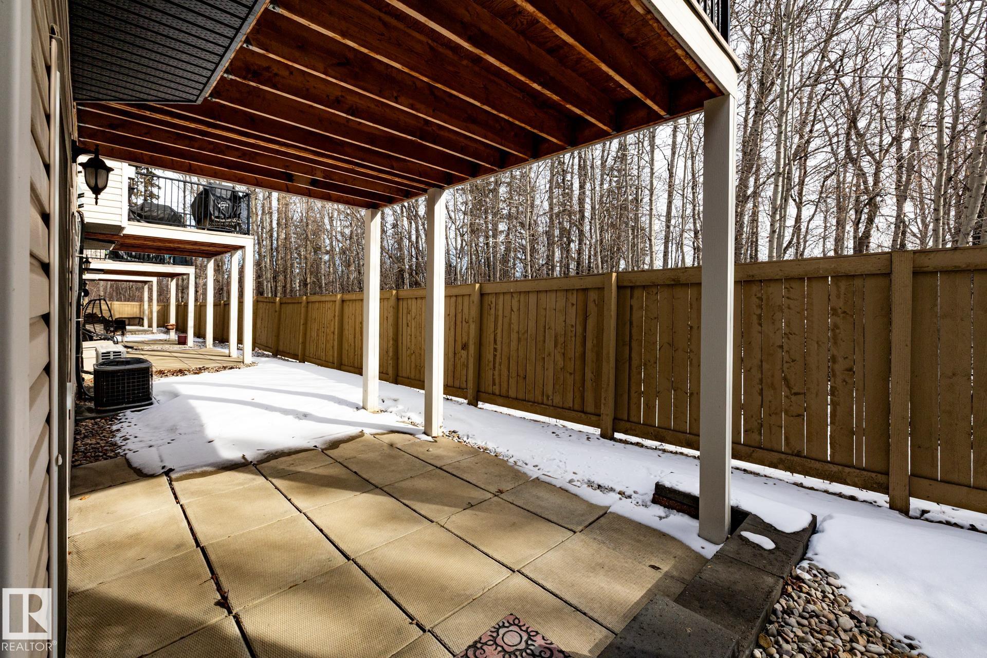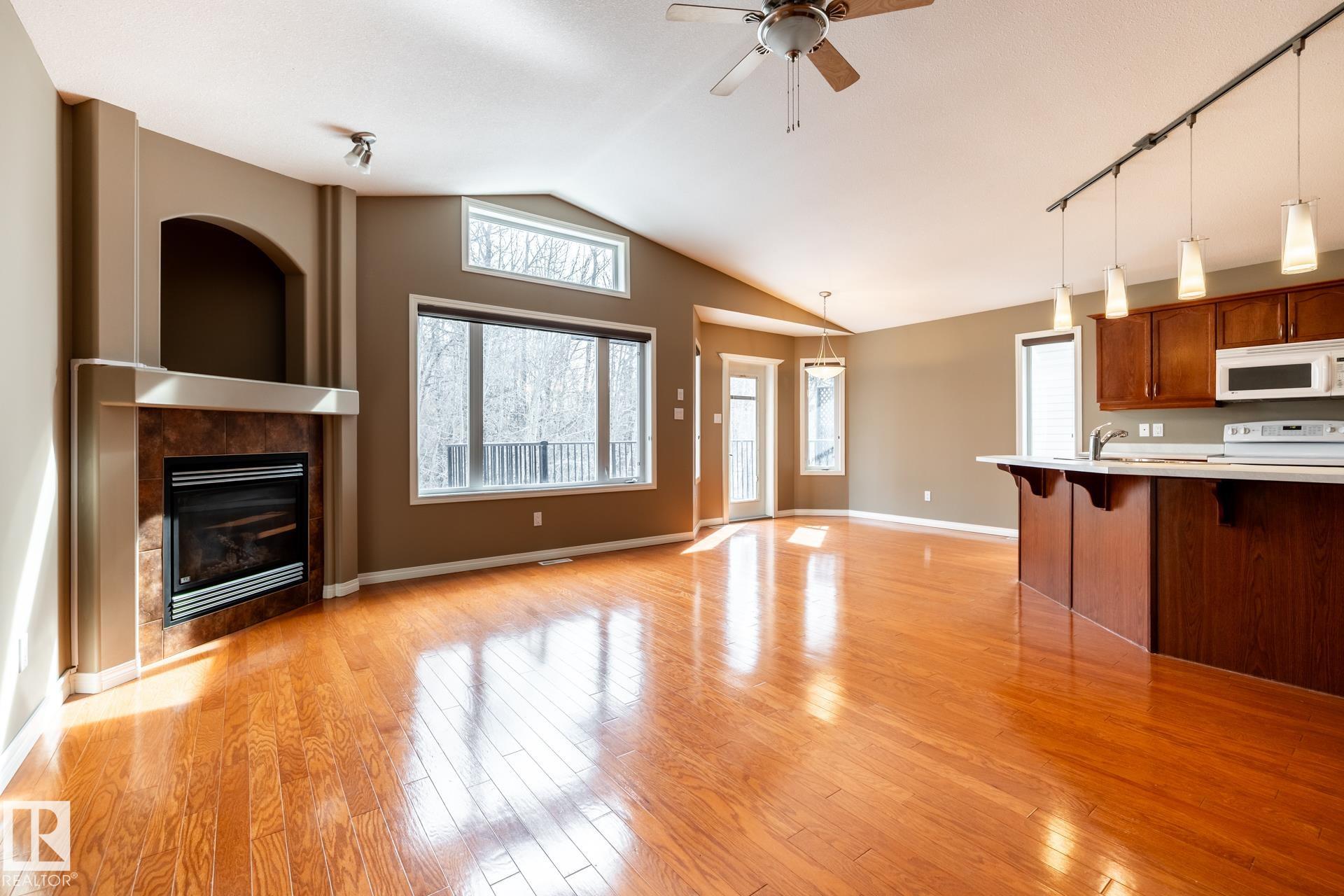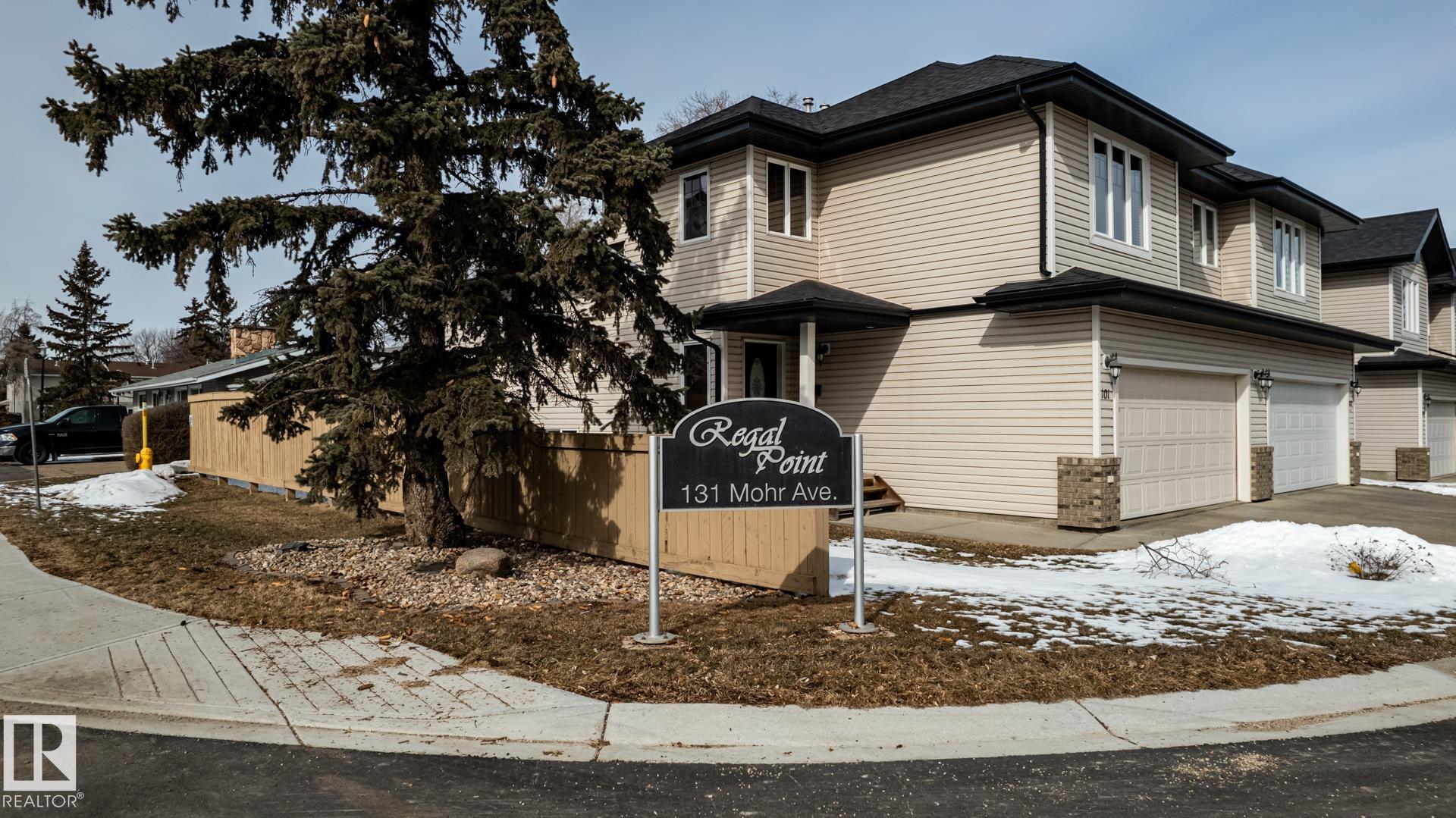 Welcome to Regal Point, an 18+ age-restricted community backing onto the beautifully treed Heritage Park trail in central Spruce Grove, near Queen Street Medical Centre. This well-maintained, 3-level split was built in 2006 & offers over 1,800 sf of developed living space. Generous front entry transitions smoothly to the double (18?Wx20?L) attached garage & laundry room. Impressive main floor features a great room concept w/ vaulted ceiling, hardwood flooring, corner gas f/p, many windows, kitchen w/ brand new countertops & corner pantry. Enjoy your morning coffee on your east-facing balcony. Upstairs: 4-pc bath, 2 bedrooms including the over-sized primary w/ walk-in closet & 4-pc ensuite. Professionally developed 3rd level has just been completed to include a 4-pc bath & WALK-OUT family room w/ sliding patio door access to the covered rear patio. Upgrades: New Carpet, A/C, Refrigerator (2020), Dishwasher (2024), HWT (2021) & Shingles (2019). Only $145/month for lawn maintenance & street snow removal!