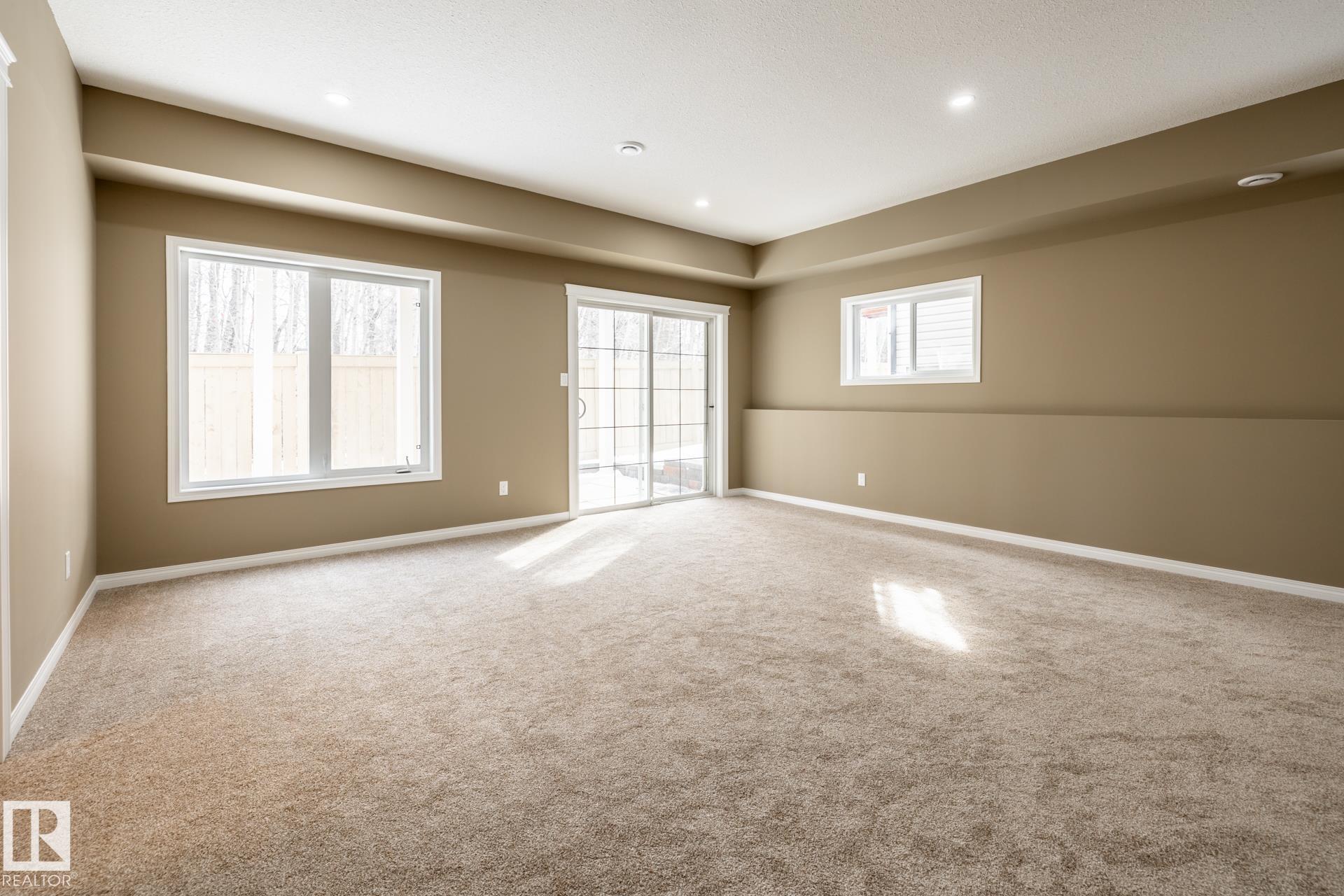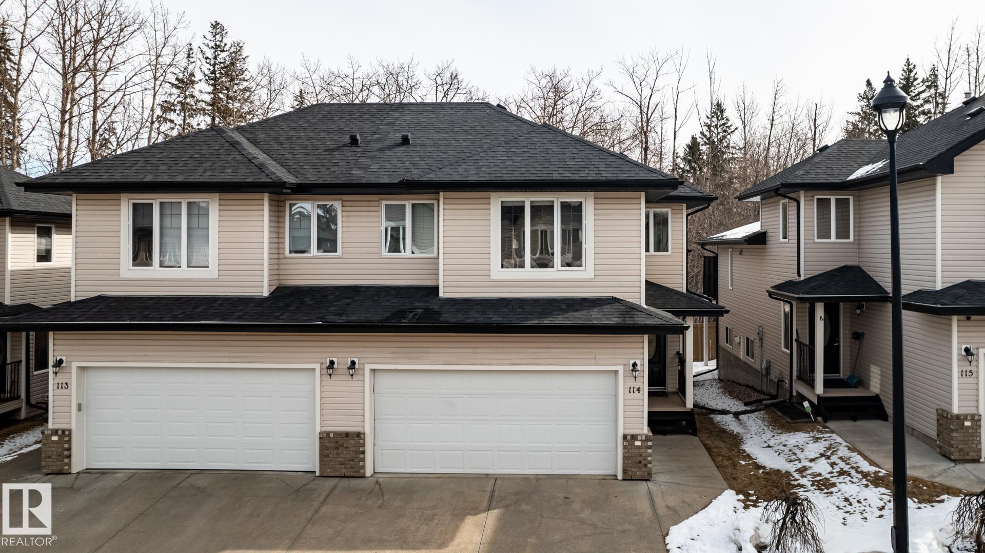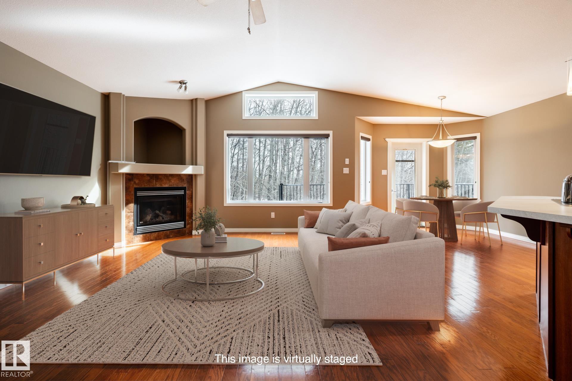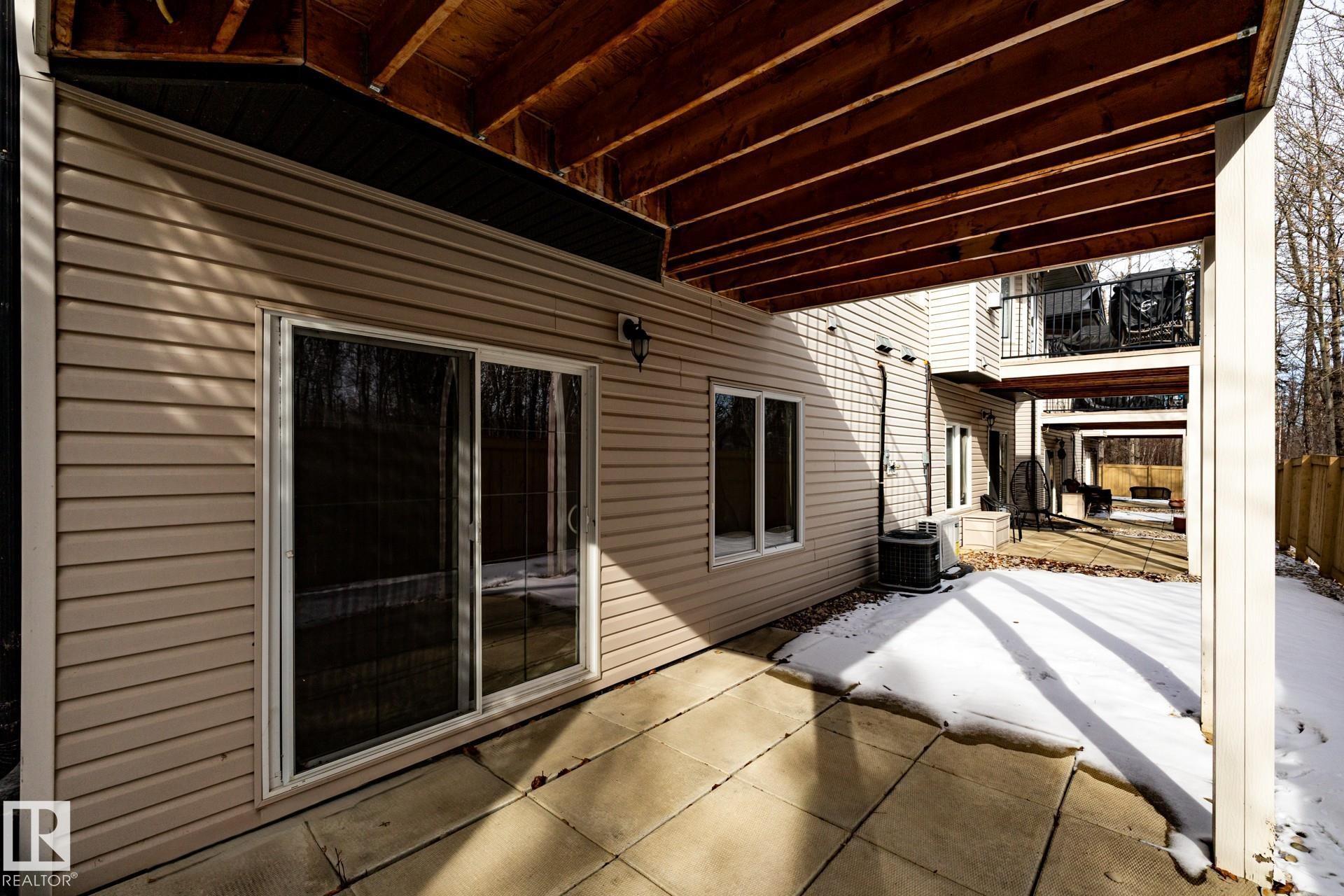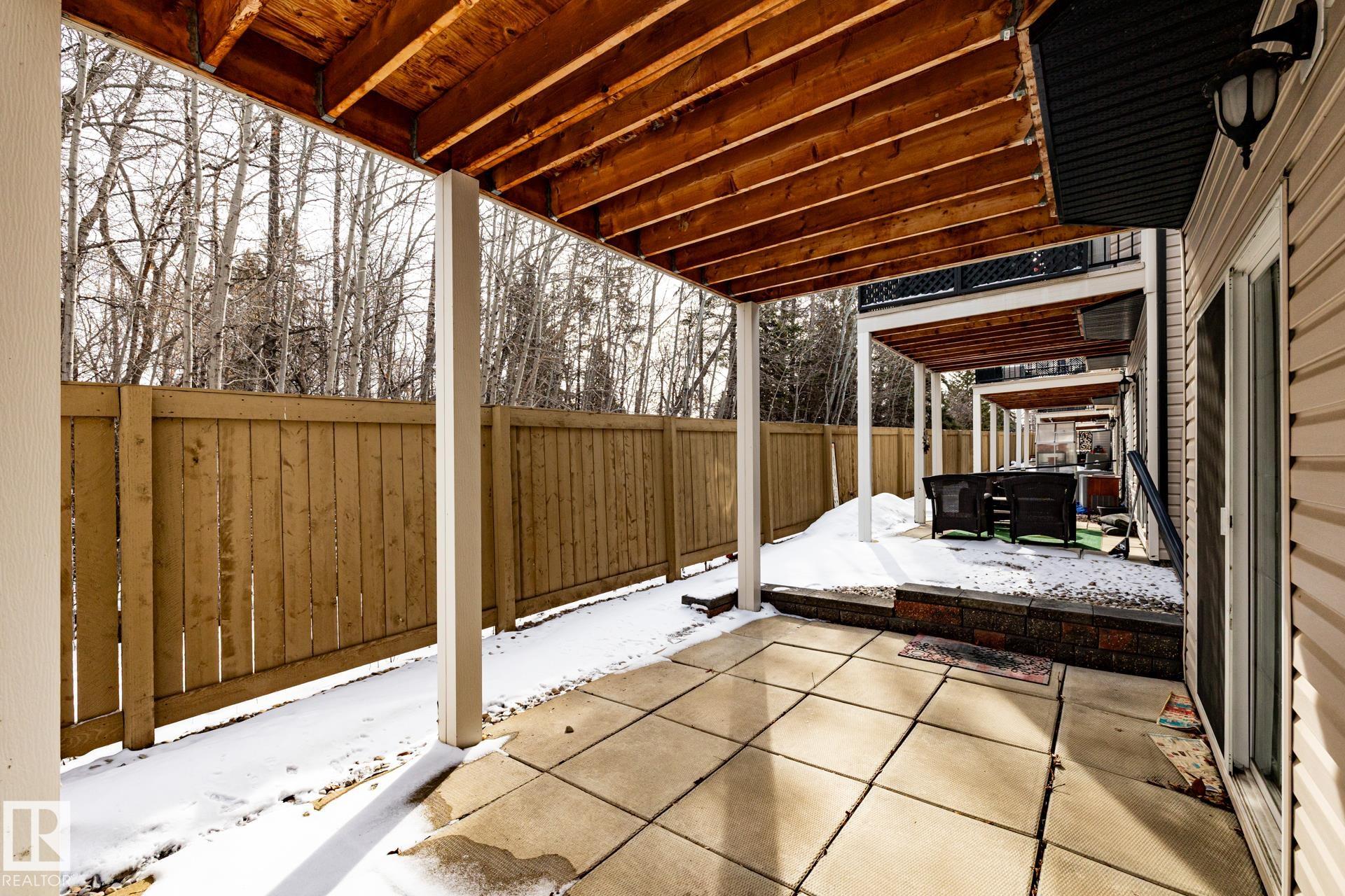 Welcome to Regal Point, an 18+ age-restricted community backing onto the beautifully treed Heritage Park trail in central Spruce Grove, near Queen Street Medical Centre. This well-maintained, 3-level split was built in 2006 & offers over 1,800 sf of developed living space. Generous front entry transitions smoothly to the double (18?Wx20?L) attached garage & laundry room. Impressive main floor features a great room concept w/ vaulted ceiling, hardwood flooring, corner gas f/p, many windows, kitchen w/ brand new countertops & corner pantry. Enjoy your morning coffee on your east-facing balcony. Upstairs: 4-pc bath, 2 bedrooms including the over-sized primary w/ walk-in closet & 4-pc ensuite. Professionally developed 3rd level has just been completed to include a 4-pc bath & WALK-OUT family room w/ sliding patio door access to the covered rear patio. Upgrades: New Carpet, A/C, Refrigerator (2020), Dishwasher (2024), HWT (2021) & Shingles (2019). Only $145/month for lawn maintenance & street snow removal!