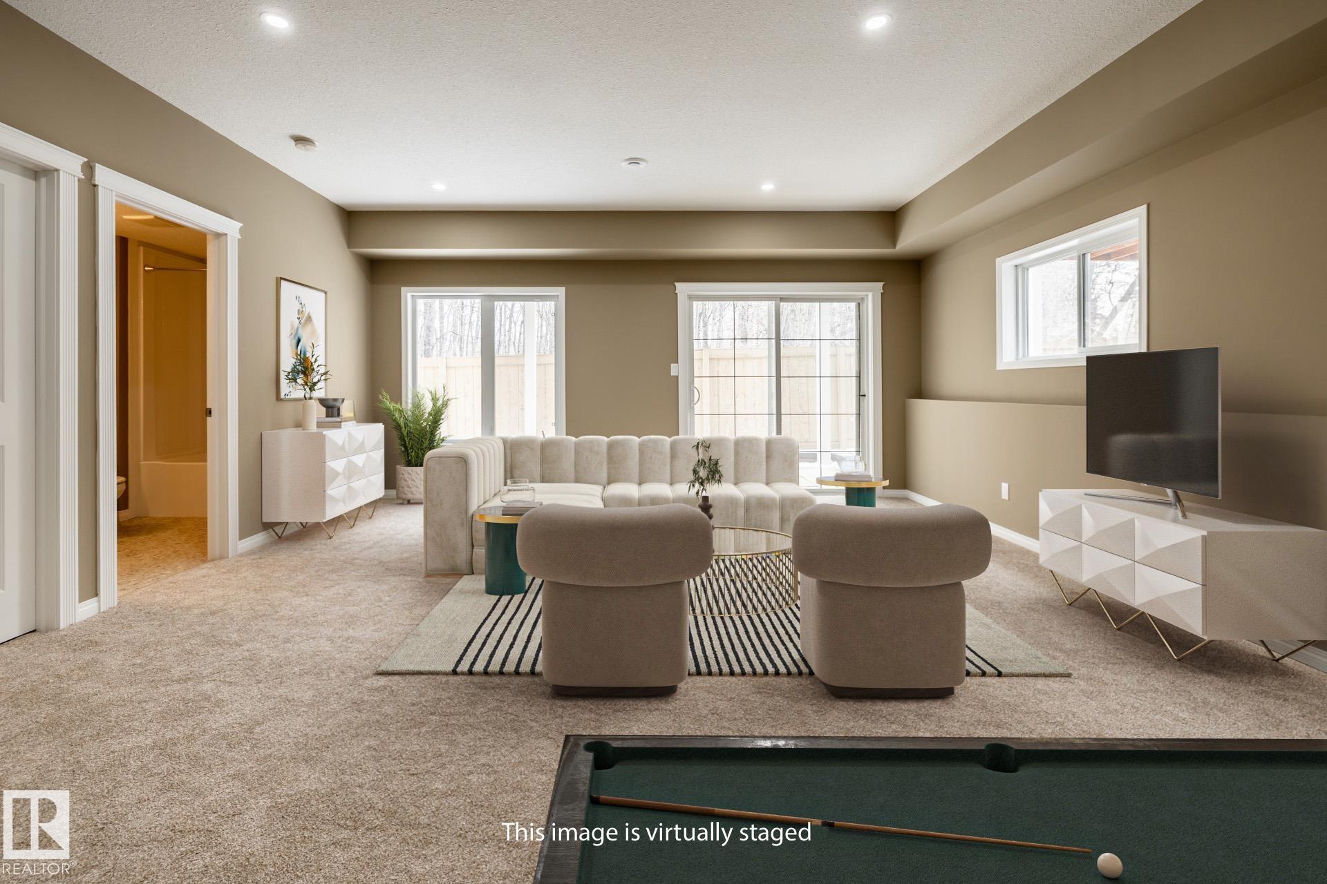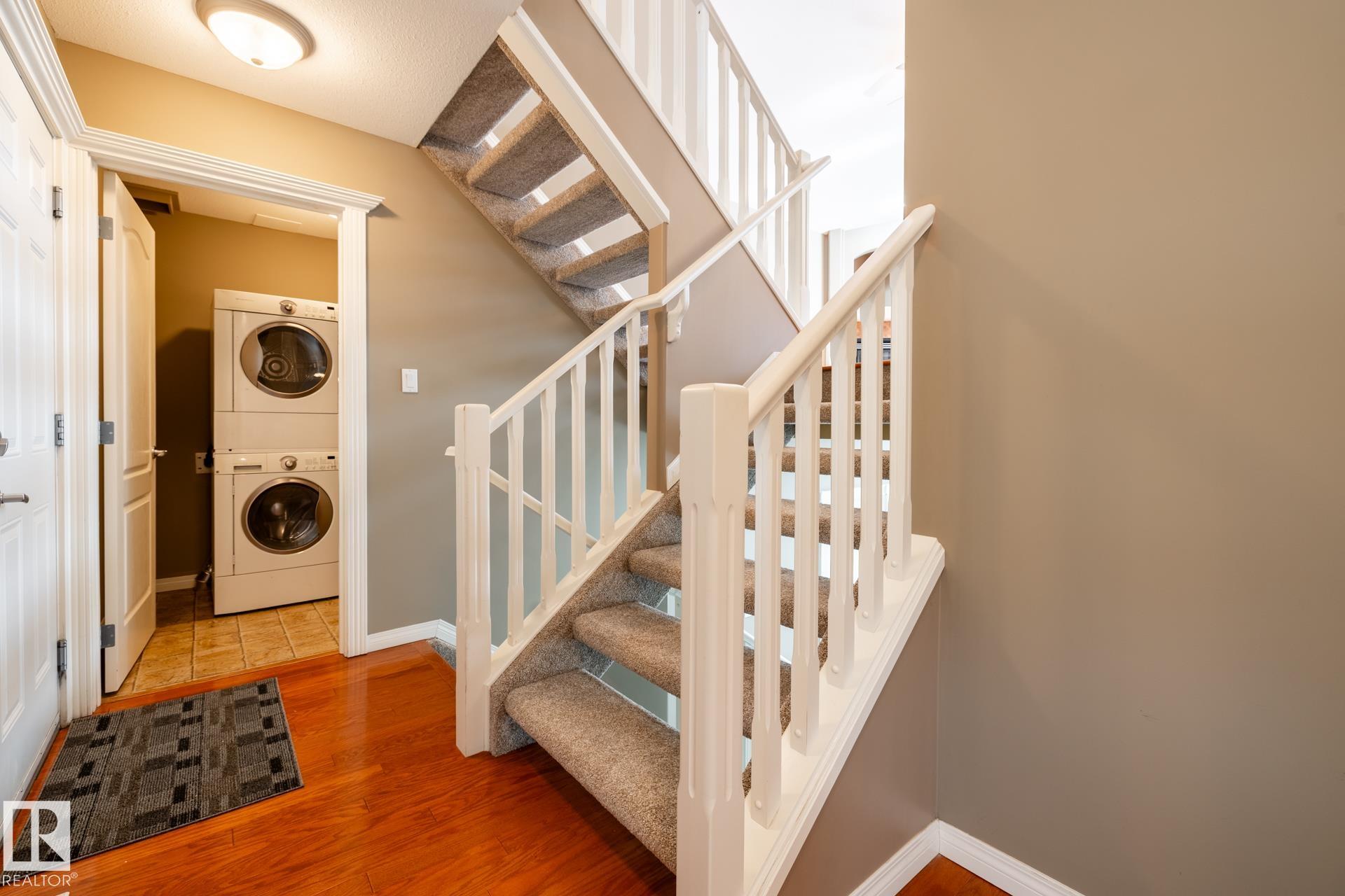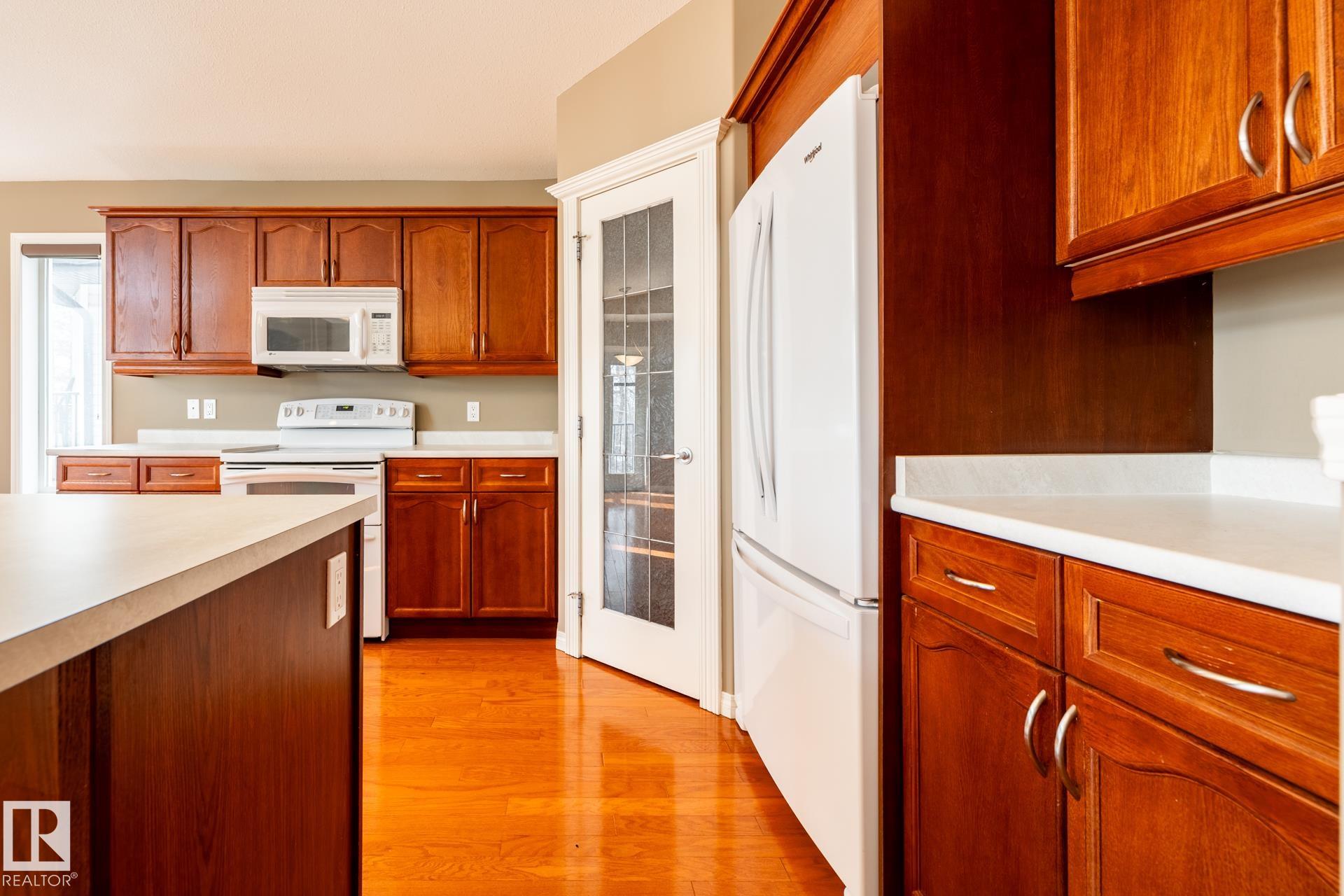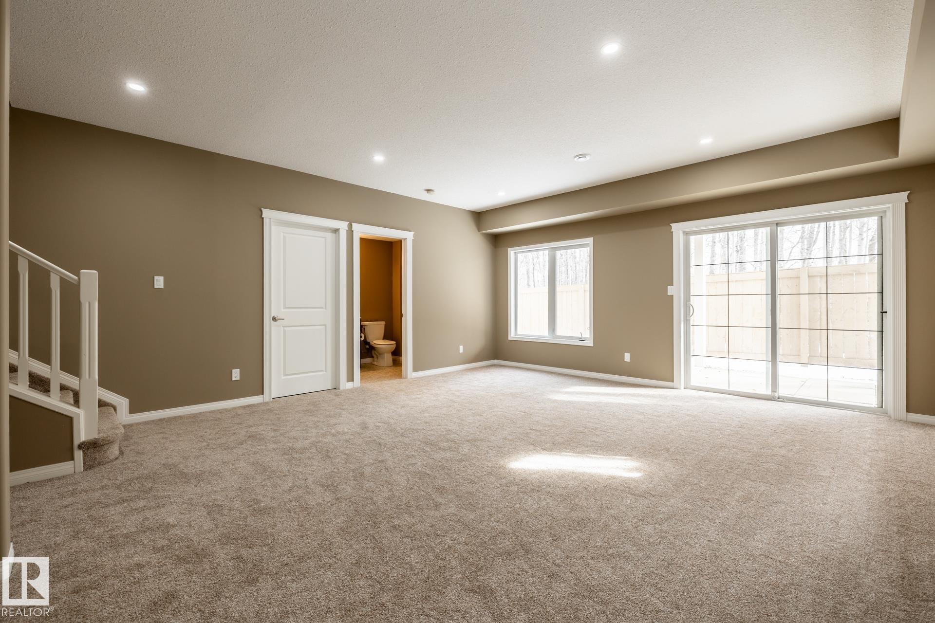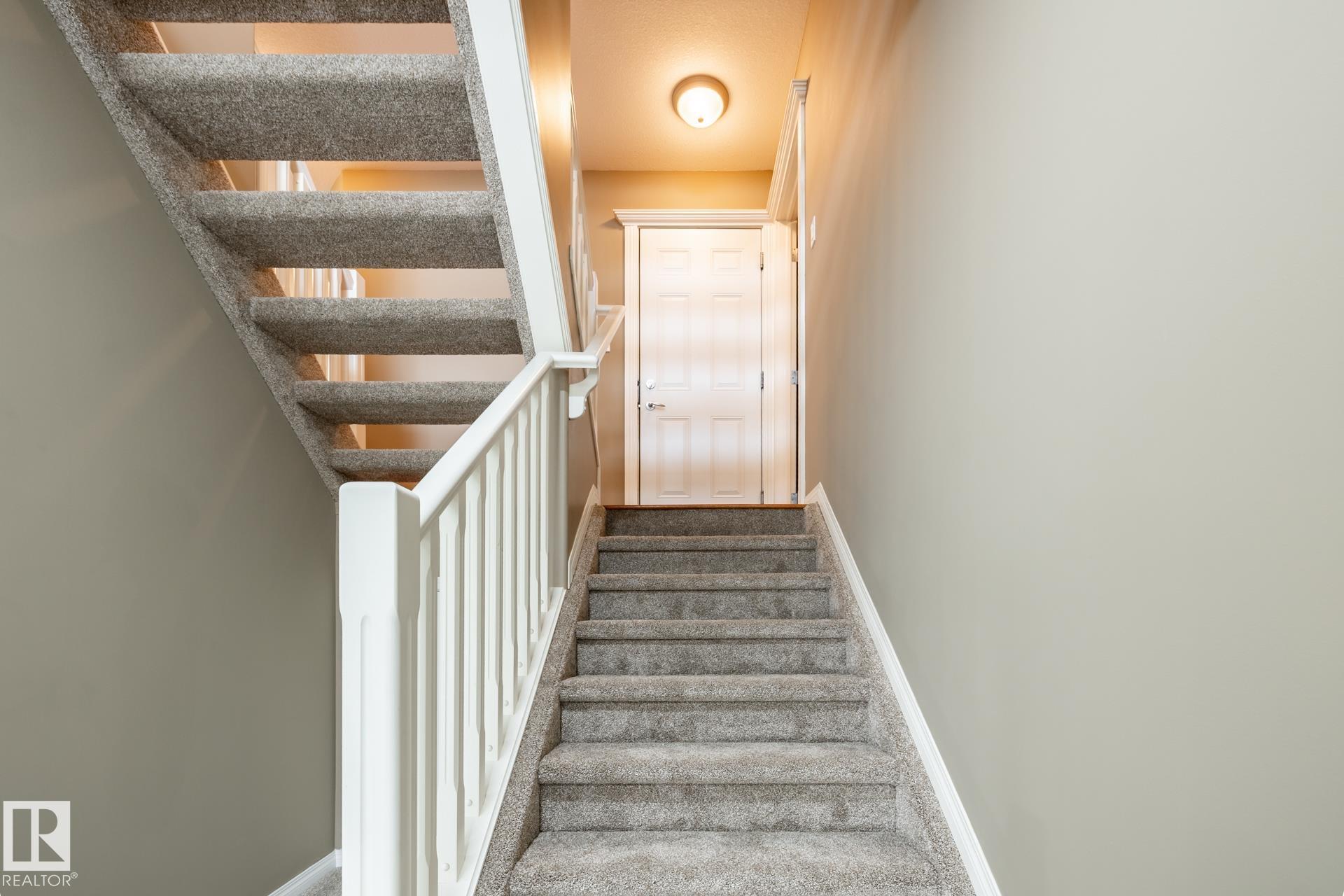 Welcome to Regal Point, an 18+ age-restricted community backing onto the beautifully treed Heritage Park trail in central Spruce Grove, near Queen Street Medical Centre. This well-maintained, 3-level split was built in 2006 & offers over 1,800 sf of developed living space. Generous front entry transitions smoothly to the double (18?Wx20?L) attached garage & laundry room. Impressive main floor features a great room concept w/ vaulted ceiling, hardwood flooring, corner gas f/p, many windows, kitchen w/ brand new countertops & corner pantry. Enjoy your morning coffee on your east-facing balcony. Upstairs: 4-pc bath, 2 bedrooms including the over-sized primary w/ walk-in closet & 4-pc ensuite. Professionally developed 3rd level has just been completed to include a 4-pc bath & WALK-OUT family room w/ sliding patio door access to the covered rear patio. Upgrades: New Carpet, A/C, Refrigerator (2020), Dishwasher (2024), HWT (2021) & Shingles (2019). Only $145/month for lawn maintenance & street snow removal!