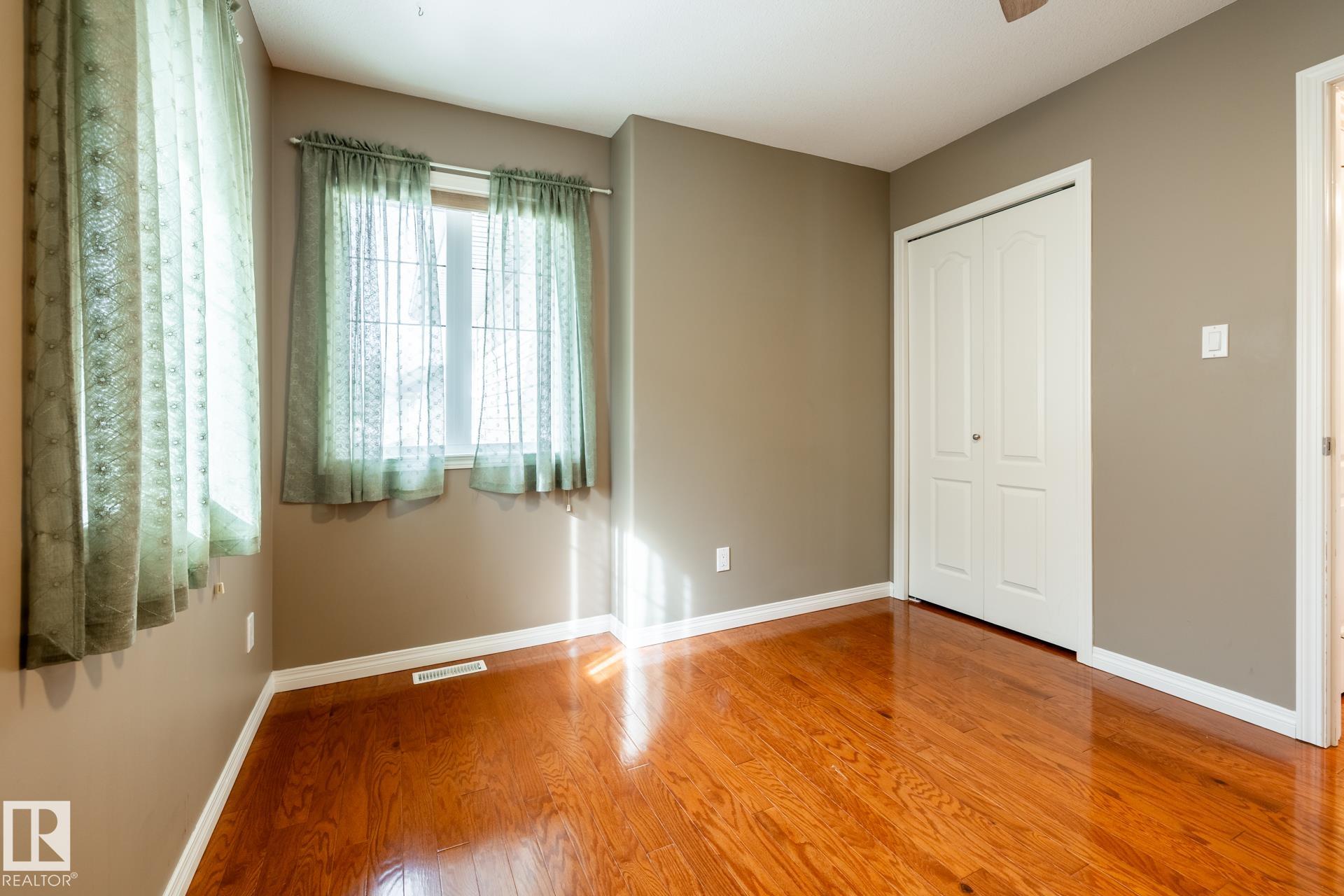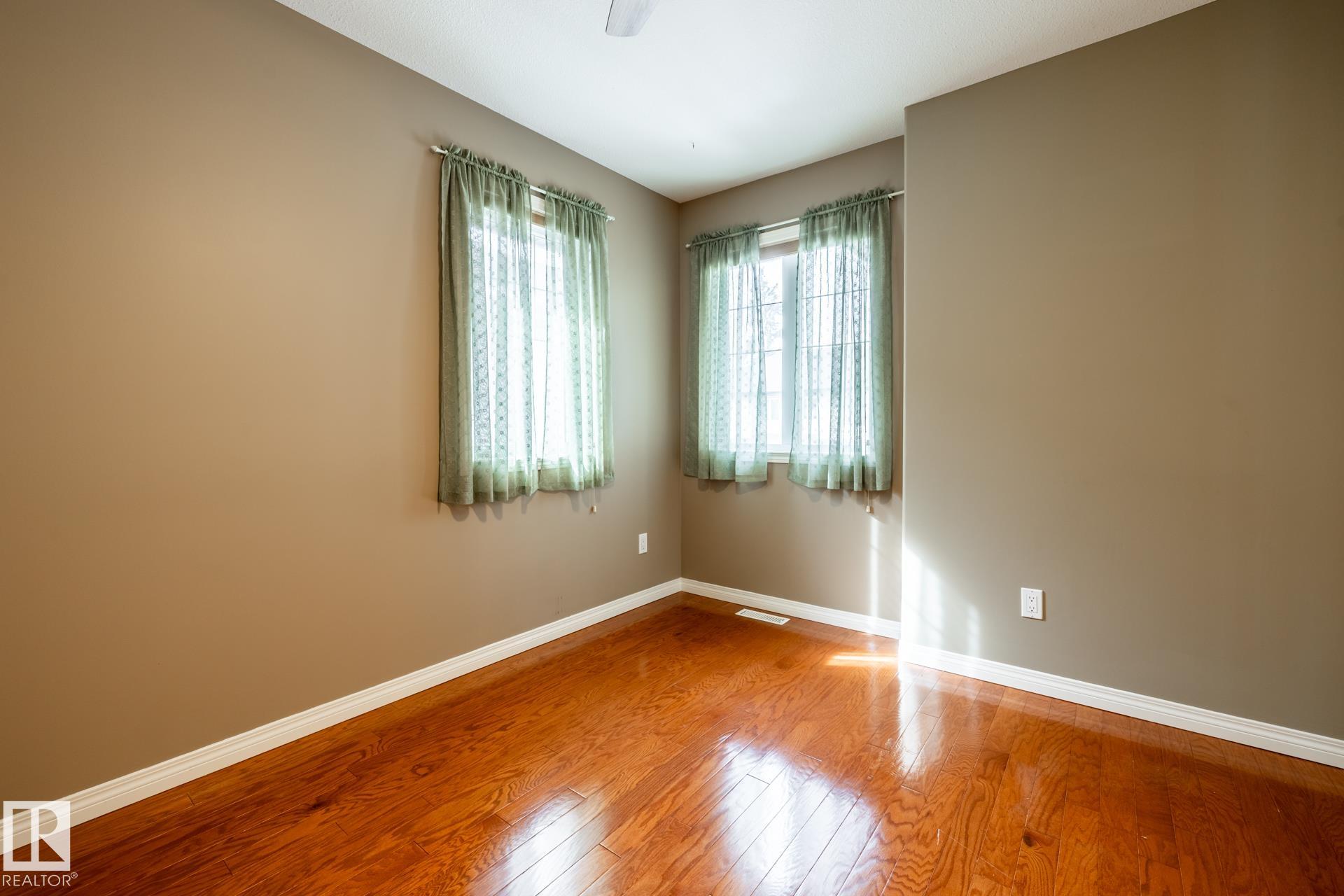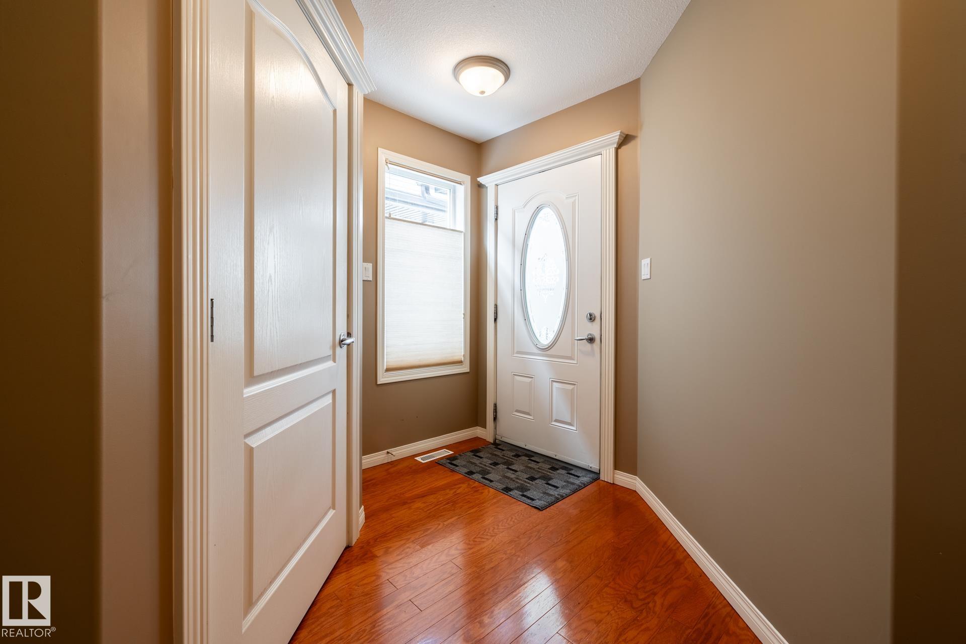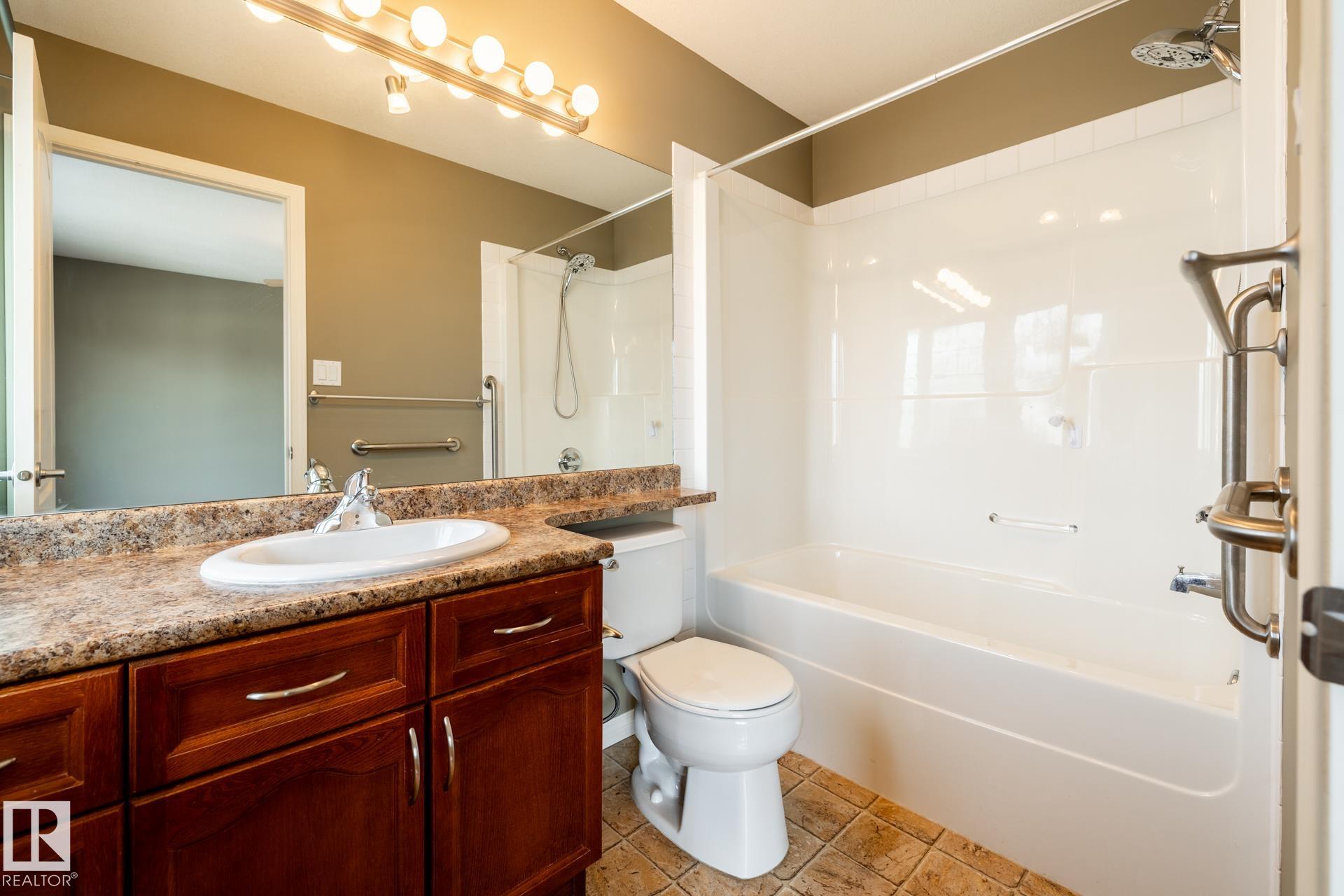 Welcome to Regal Point, an 18+ age-restricted community backing onto the beautifully treed Heritage Park trail in central Spruce Grove, near Queen Street Medical Centre. This well-maintained, 3-level split was built in 2006 & offers over 1,800 sf of developed living space. Generous front entry transitions smoothly to the double (18?Wx20?L) attached garage & laundry room. Impressive main floor features a great room concept w/ vaulted ceiling, hardwood flooring, corner gas f/p, many windows, kitchen w/ brand new countertops & corner pantry. Enjoy your morning coffee on your east-facing balcony. Upstairs: 4-pc bath, 2 bedrooms including the over-sized primary w/ walk-in closet & 4-pc ensuite. Professionally developed 3rd level has just been completed to include a 4-pc bath & WALK-OUT family room w/ sliding patio door access to the covered rear patio. Upgrades: New Carpet, A/C, Refrigerator (2020), Dishwasher (2024), HWT (2021) & Shingles (2019). Only $145/month for lawn maintenance & street snow removal!