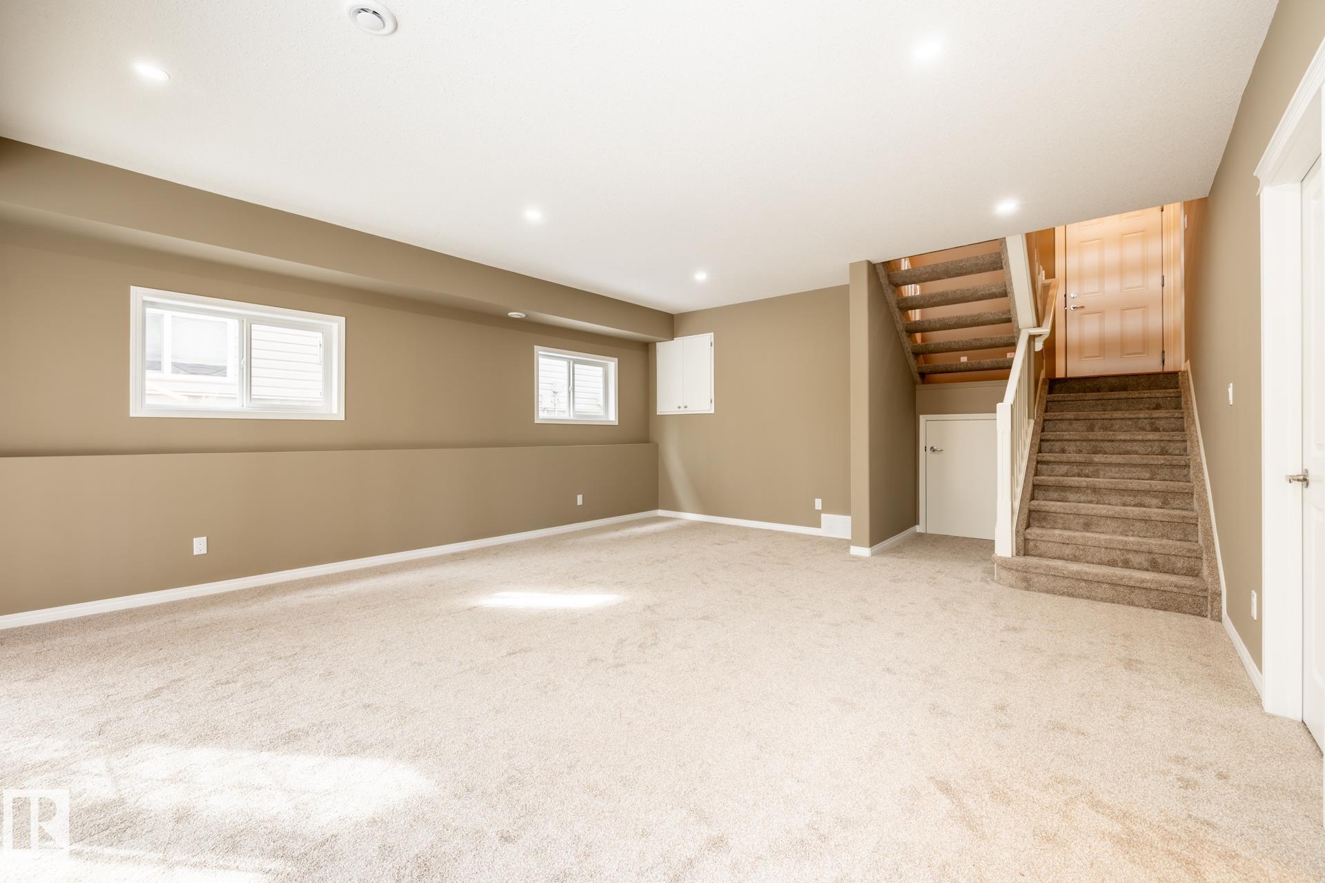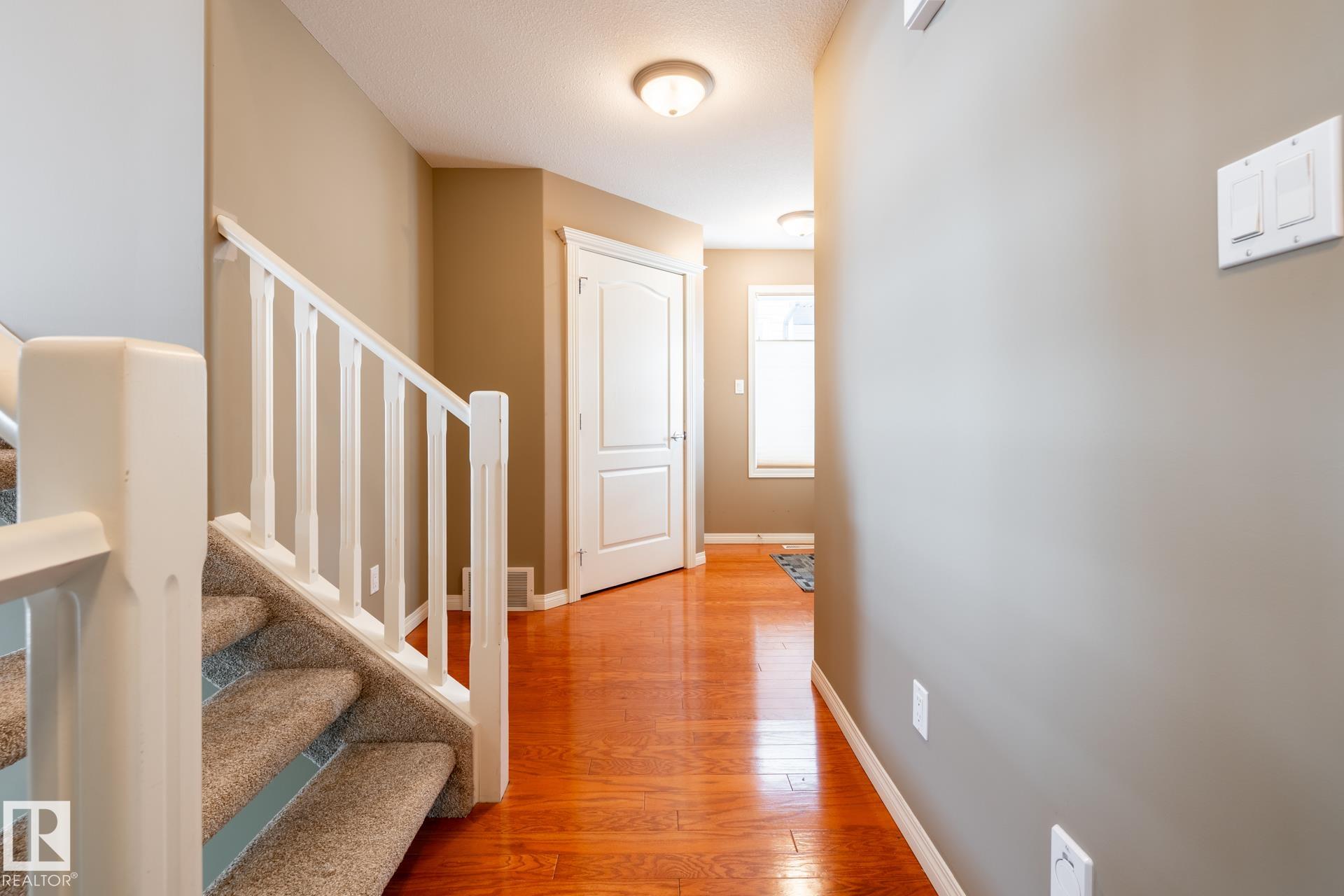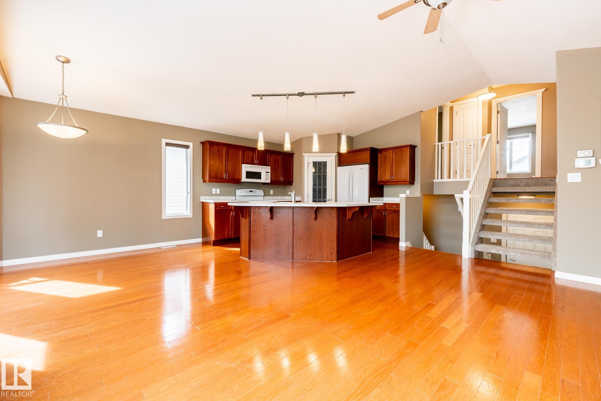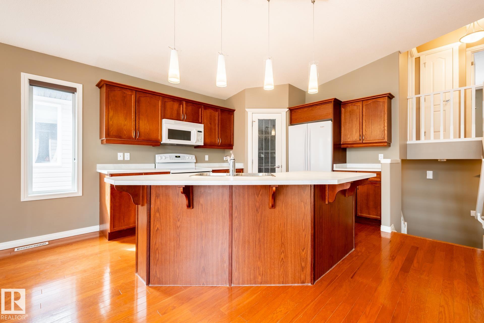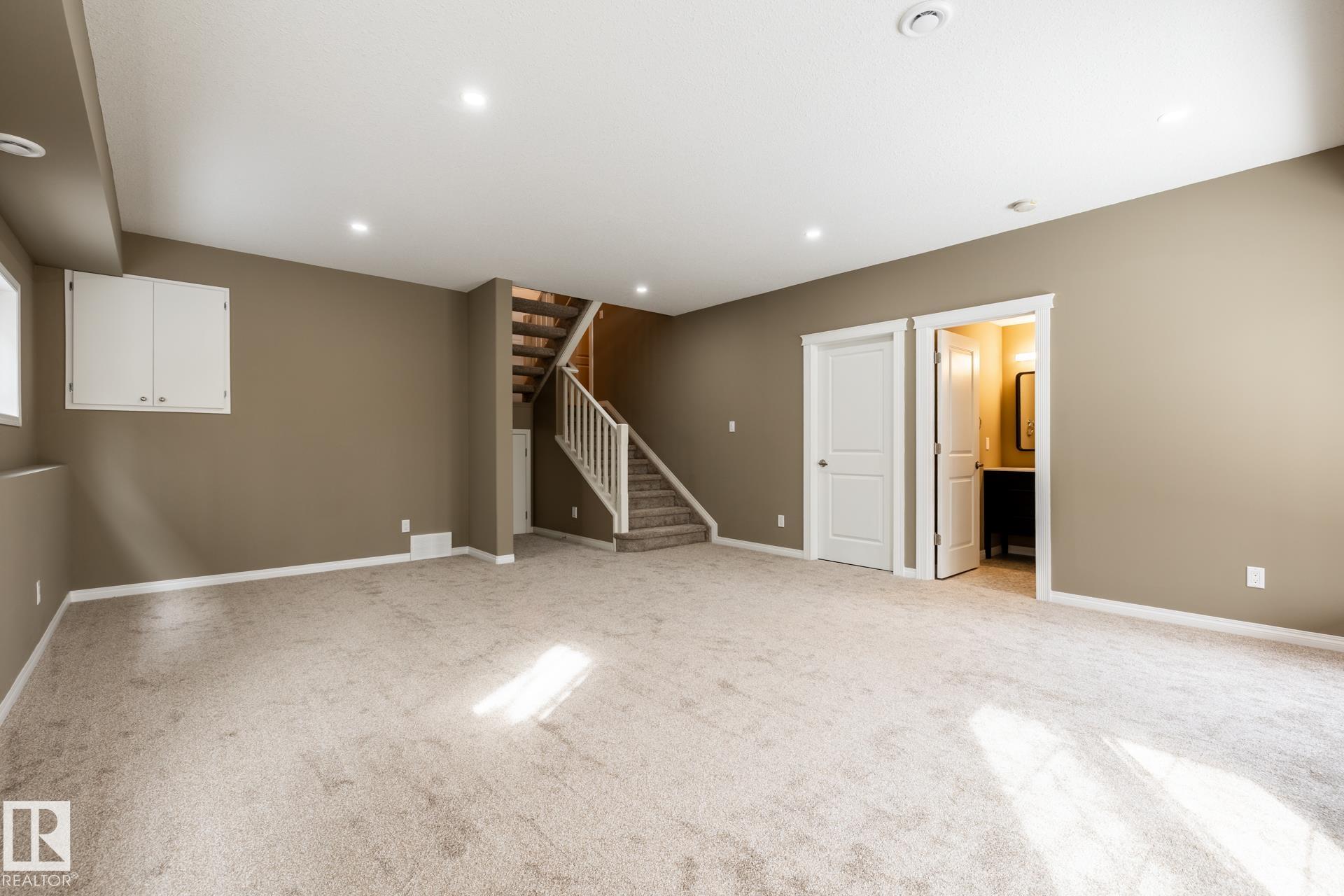 Welcome to Regal Point, an 18+ age-restricted community backing onto the beautifully treed Heritage Park trail in central Spruce Grove, near Queen Street Medical Centre. This well-maintained, 3-level split was built in 2006 & offers over 1,800 sf of developed living space. Generous front entry transitions smoothly to the double (18?Wx20?L) attached garage & laundry room. Impressive main floor features a great room concept w/ vaulted ceiling, hardwood flooring, corner gas f/p, many windows, kitchen w/ brand new countertops & corner pantry. Enjoy your morning coffee on your east-facing balcony. Upstairs: 4-pc bath, 2 bedrooms including the over-sized primary w/ walk-in closet & 4-pc ensuite. Professionally developed 3rd level has just been completed to include a 4-pc bath & WALK-OUT family room w/ sliding patio door access to the covered rear patio. Upgrades: New Carpet, A/C, Refrigerator (2020), Dishwasher (2024), HWT (2021) & Shingles (2019). Only $145/month for lawn maintenance & street snow removal!