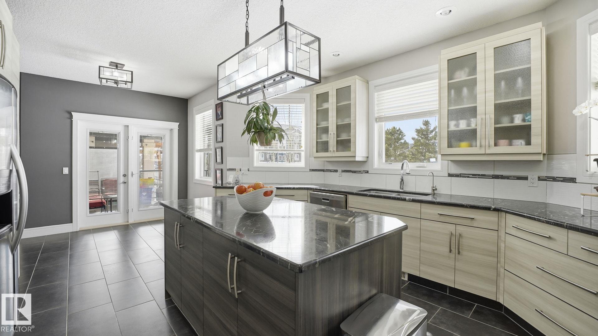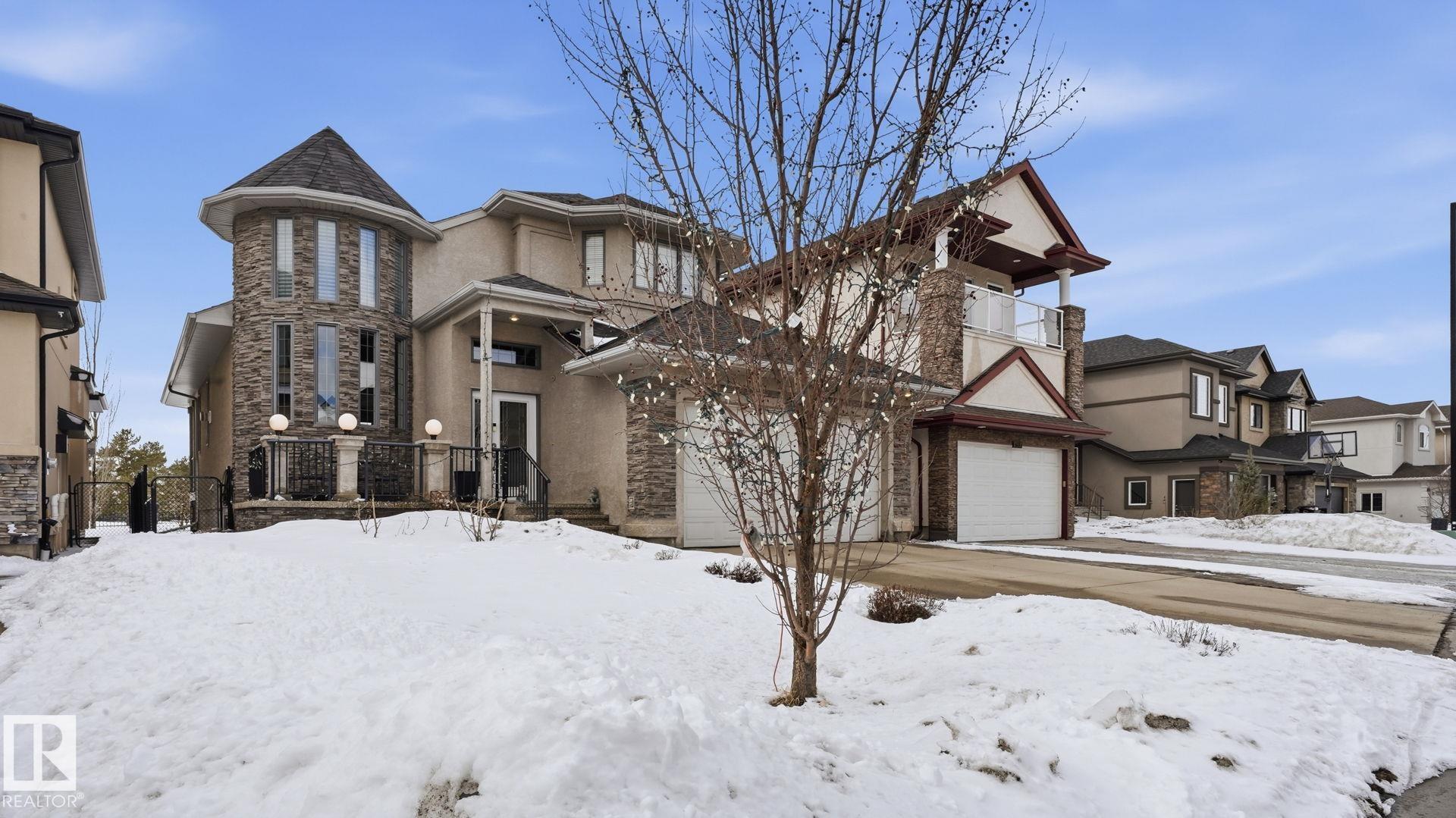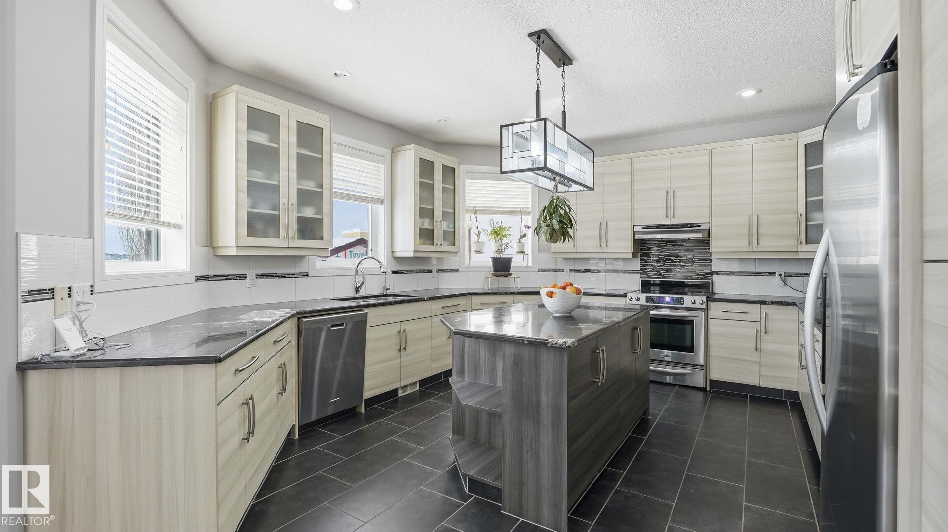Situated in the desirable community of Chambery, this 5-bedroom residence features a private west-facing backyard backing onto green space. The main level offers vaulted ceilings and large windows that allow for abundant natural light. The kitchen is appointed with granite countertops, ample cabinetry, a central island, and stainless steel appliances, with access to a covered deck, while a bedroom, 2-piece bathroom, and laundry complete this level. Upstairs includes 2 additional bedrooms and a spacious primary suite with a fireplace, walk-in closet and a 4-piece ensuite featuring a jetted tub, separate shower, and skylight, along with access to a covered balcony. The fully developed basement features a LEGAL SUITE, kitchen, living area, fireplace, two bedrooms, a 4-piece bathroom, and 9-foot ceilings. Additional features include in-floor heating in the basement and primary bedroom, custom doors, and parking for up to five vehicles, along with convenient access to nearby amenities.
