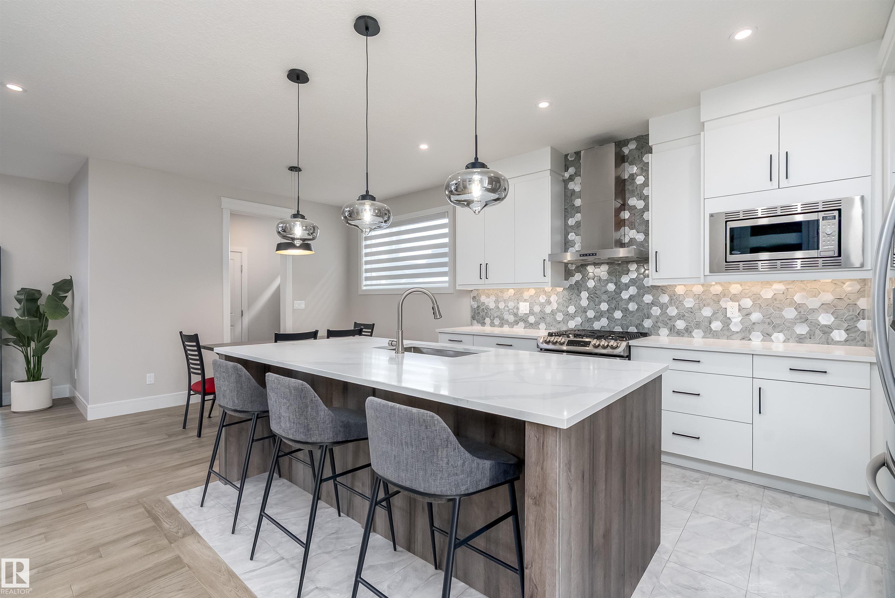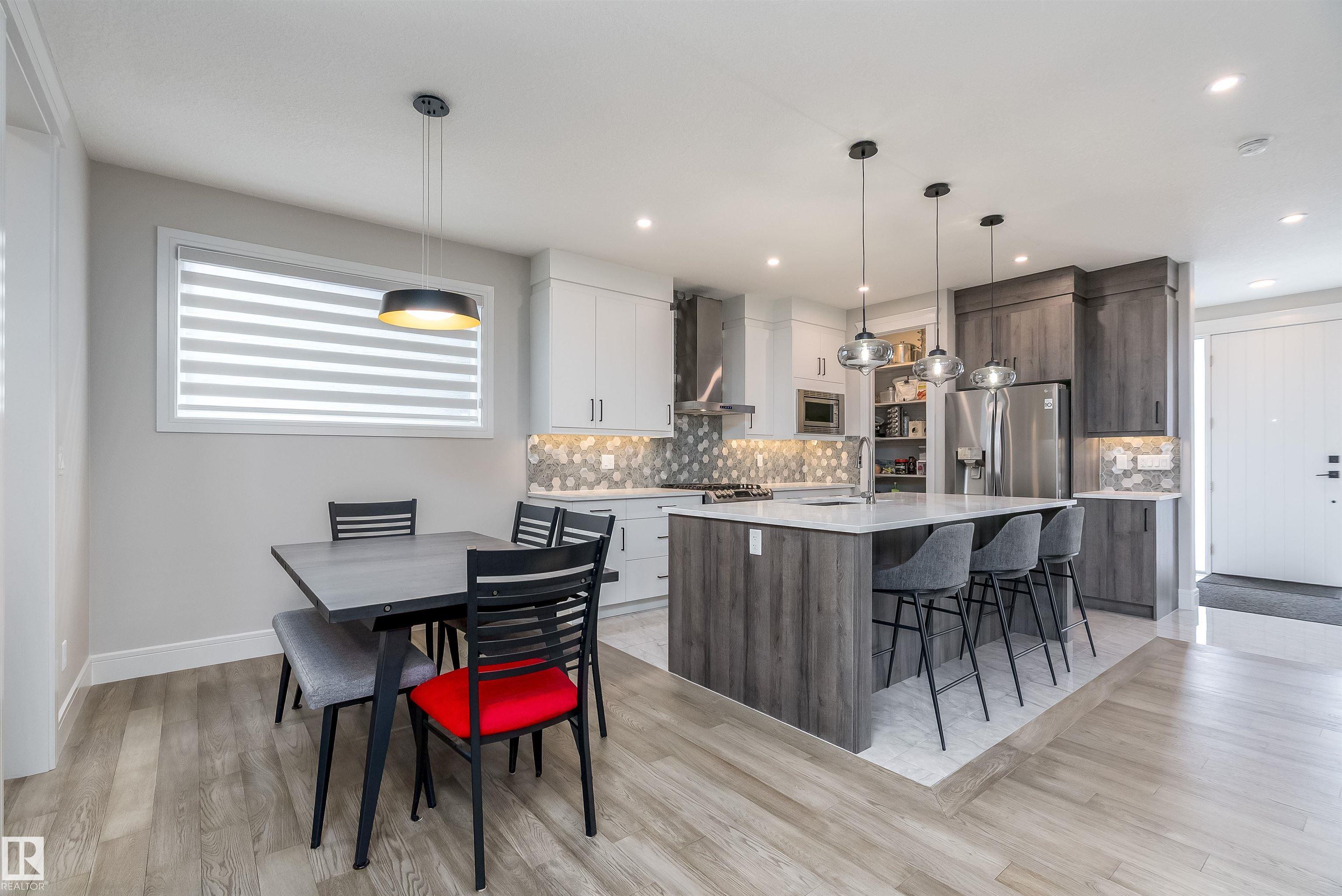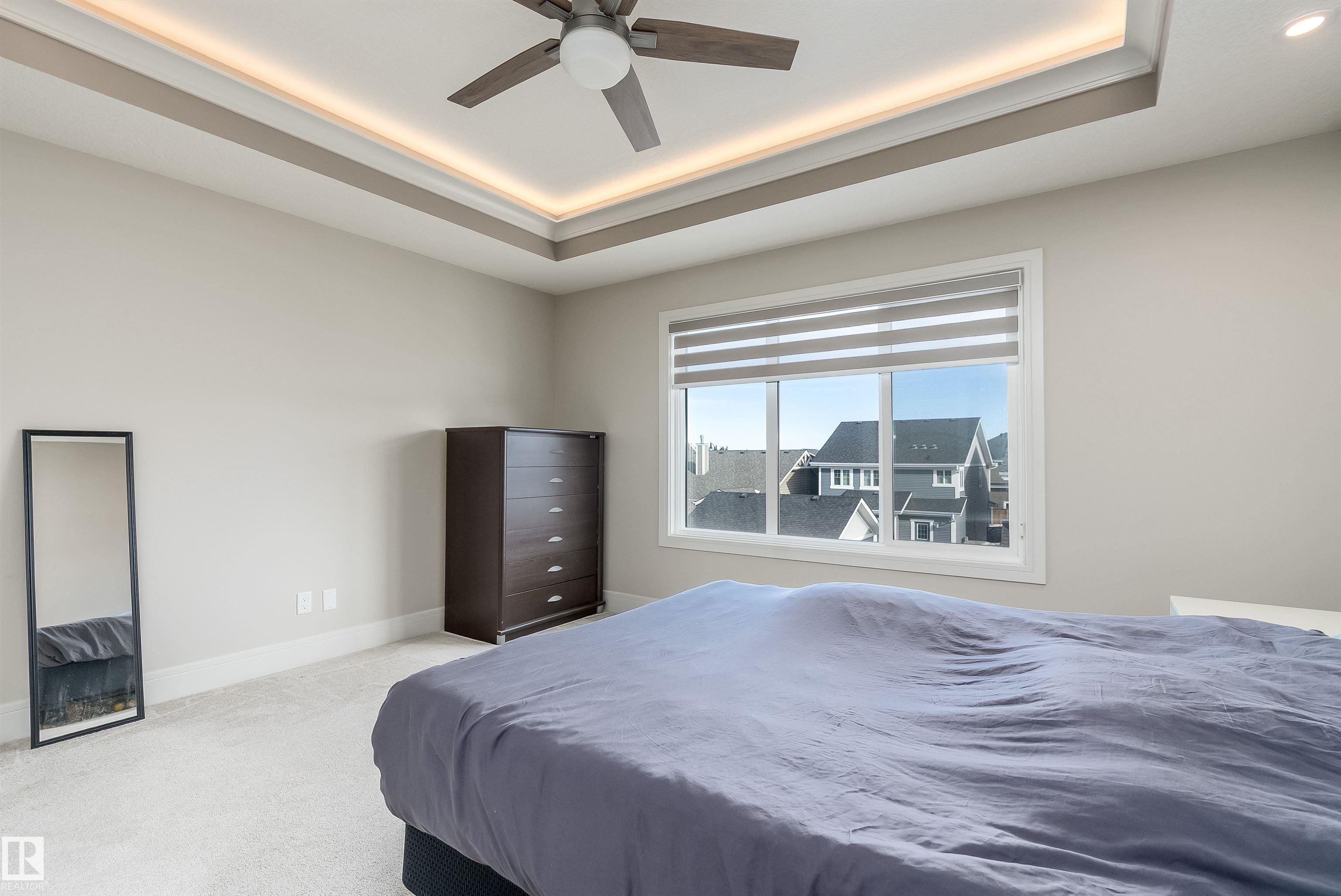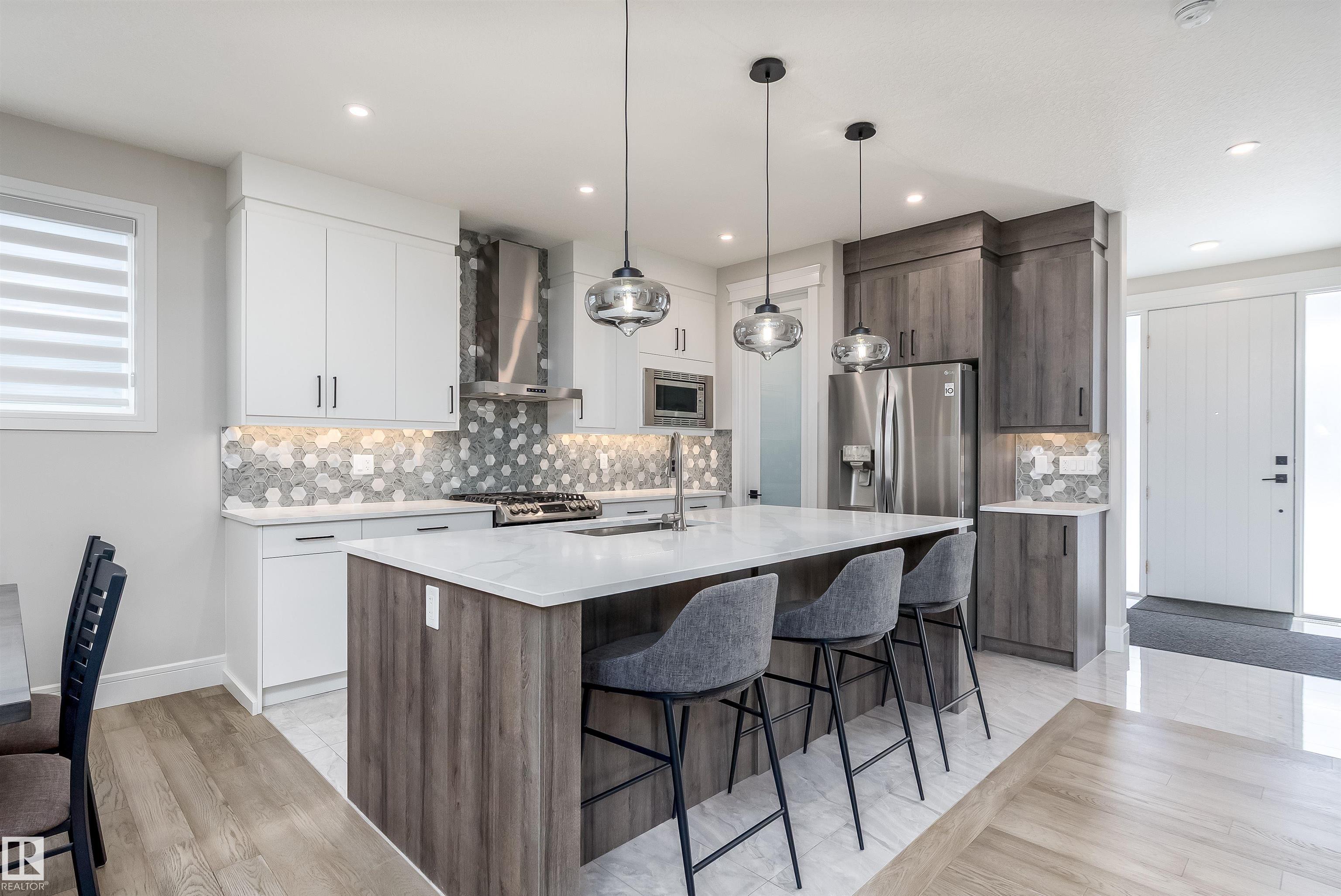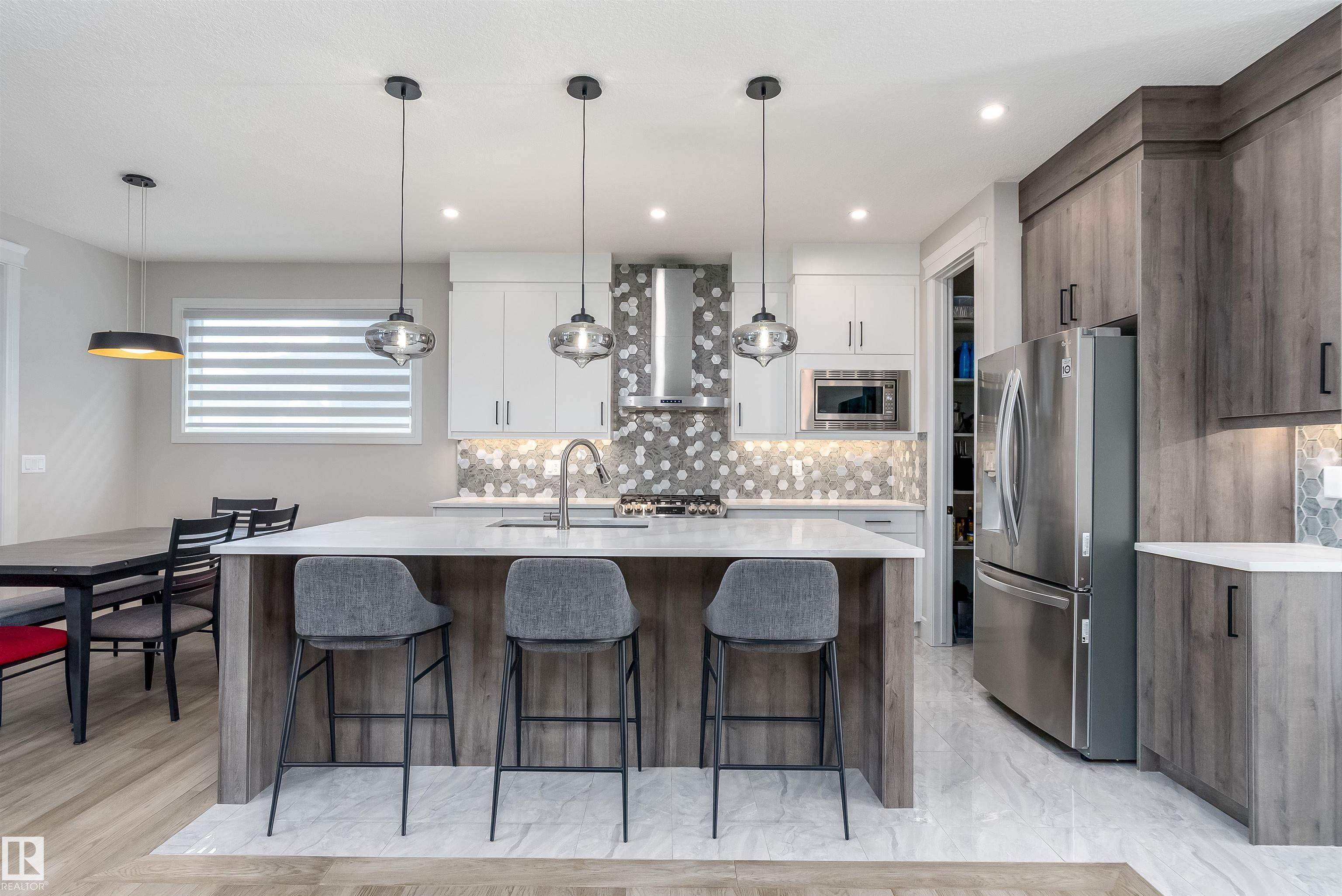 Welcome to this stunning 1894 sqft 2-storey home in the award-winning community of Griesbach, offering a total of 6 bedrooms (4+2) and 4 bathrooms. This property also includes a fully finished 2 bedroom LEGAL suite mortgage helper. Step inside to an impressive open-to-below great room showcasing sophisticated wainscoting and a coffered ceiling feature wall. The modern kitchen is beautifully finished with white and natural wood tone cabinetry, large island, upgraded SS appliances, gas range, hood fan, tiled backsplash, and corner pantry. The main floor also includes a bedroom and full bathroom, ideal for guests or multigenerational living. Upstairs you?ll find a spacious primary retreat with tray ceiling, walk-in closet, and luxurious 5pc ensuite, plus convenient upstairs laundry, a 4pce bath, and two junior bedrooms. The fully finished basement offers a legal 2-bedroom suite, providing additional value. Situated on an extra-wide lot, this home also includes central A/C and rough-ins for EV.