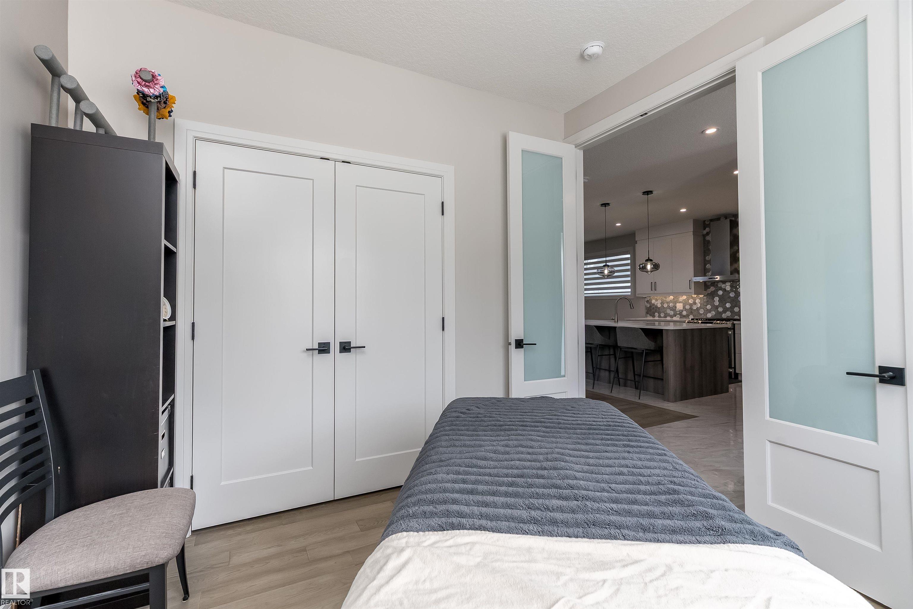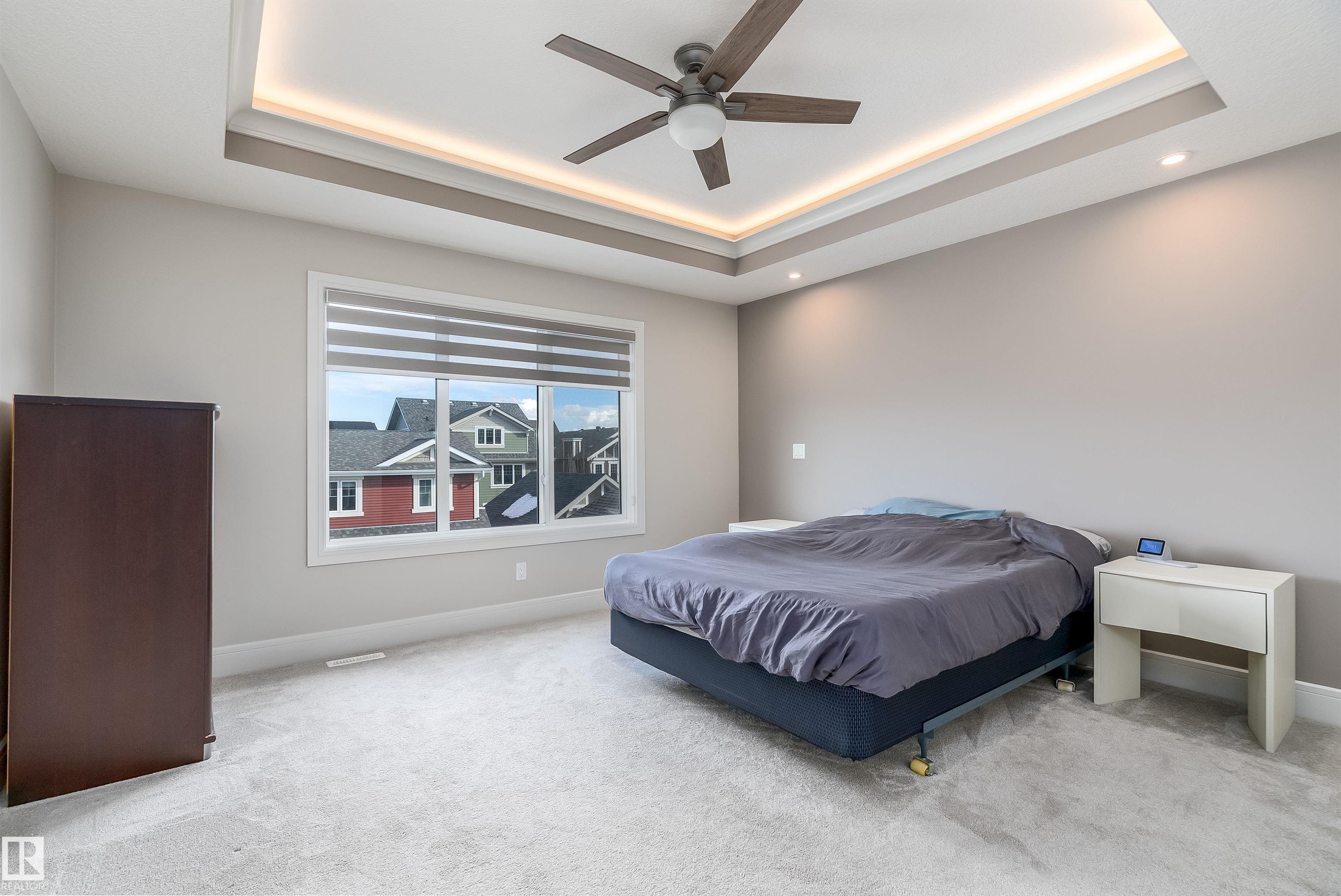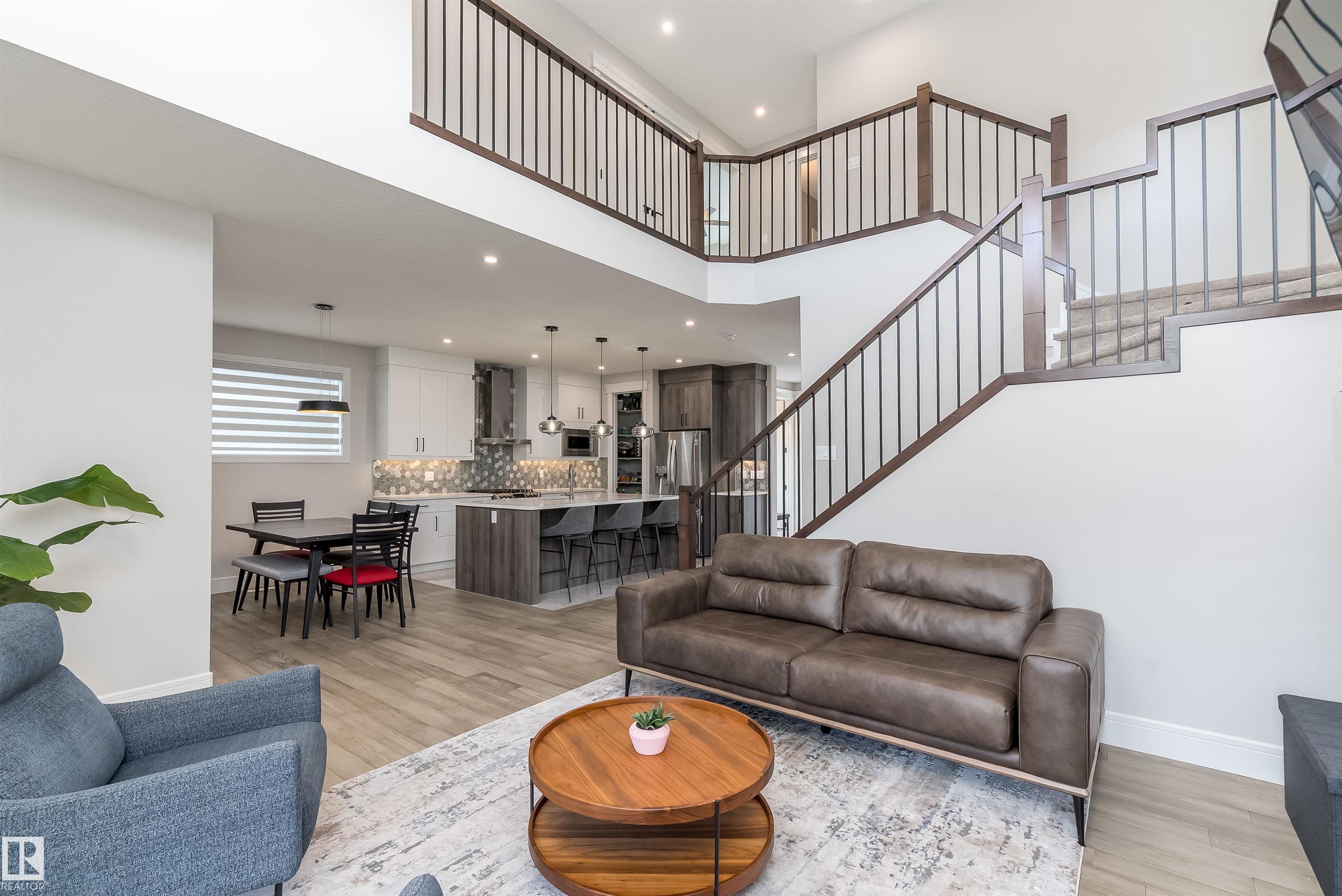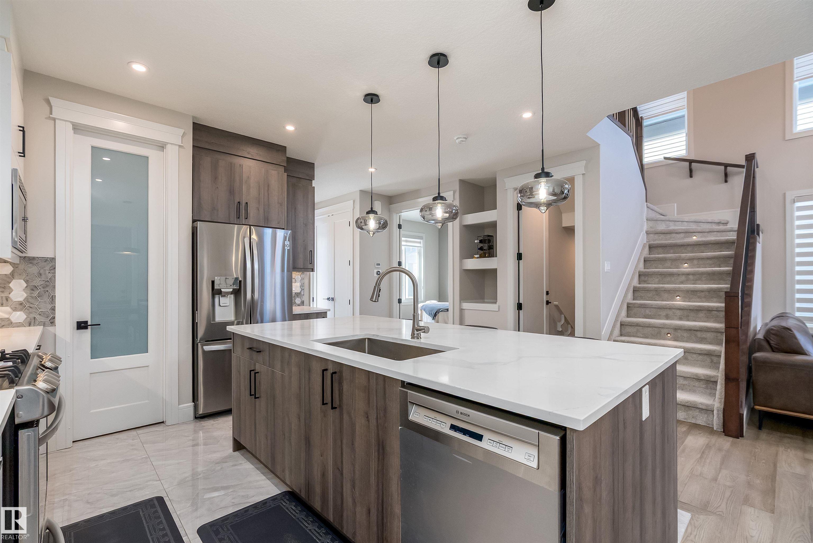 Welcome to this stunning 1894 sqft 2-storey home in the award-winning community of Griesbach, offering a total of 6 bedrooms (4+2) and 4 bathrooms. This property also includes a fully finished 2 bedroom LEGAL suite mortgage helper. Step inside to an impressive open-to-below great room showcasing sophisticated wainscoting and a coffered ceiling feature wall. The modern kitchen is beautifully finished with white and natural wood tone cabinetry, large island, upgraded SS appliances, gas range, hood fan, tiled backsplash, and corner pantry. The main floor also includes a bedroom and full bathroom, ideal for guests or multigenerational living. Upstairs you?ll find a spacious primary retreat with tray ceiling, walk-in closet, and luxurious 5pc ensuite, plus convenient upstairs laundry, a 4pce bath, and two junior bedrooms. The fully finished basement offers a legal 2-bedroom suite, providing additional value. Situated on an extra-wide lot, this home also includes central A/C and rough-ins for EV.