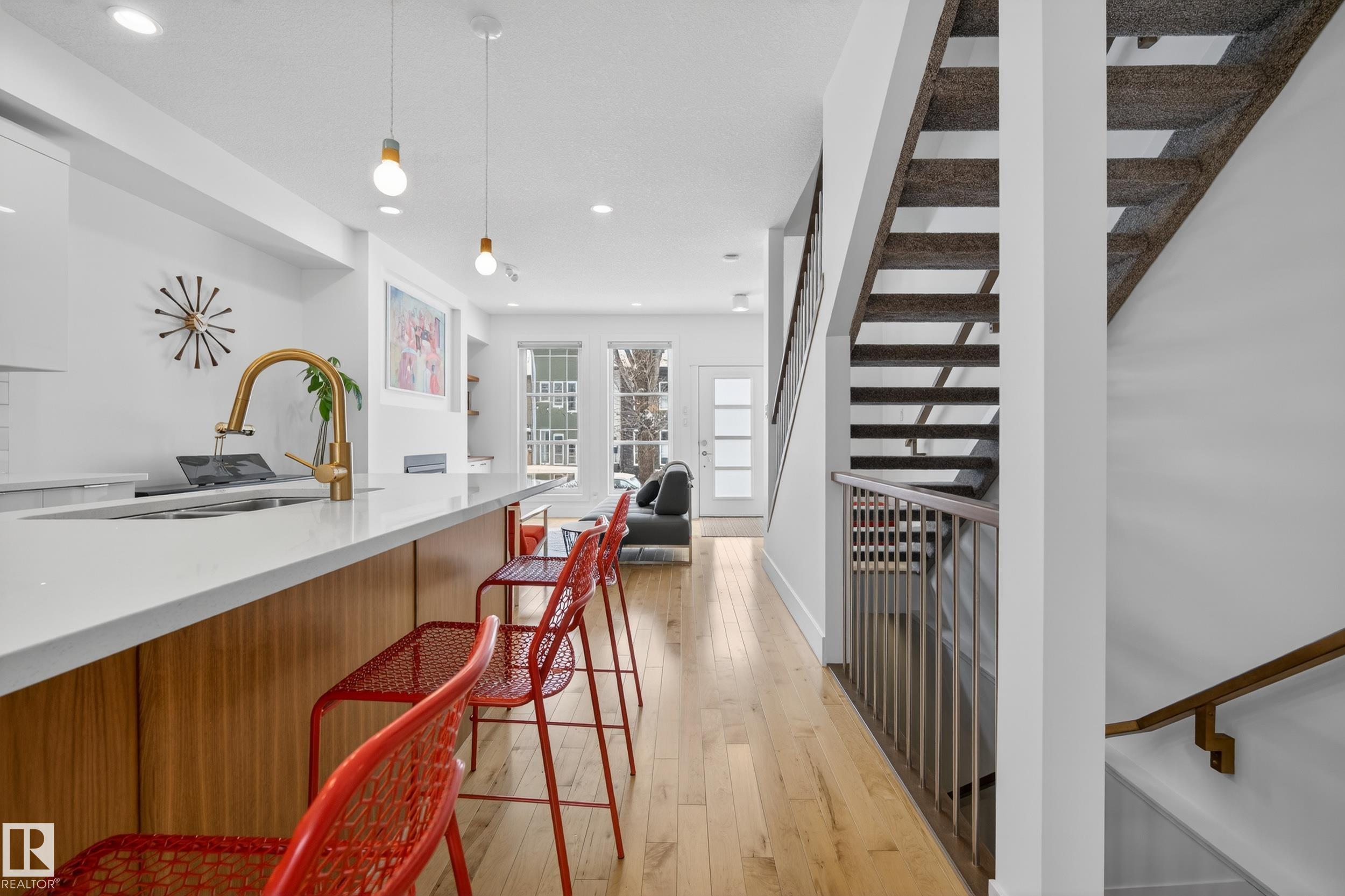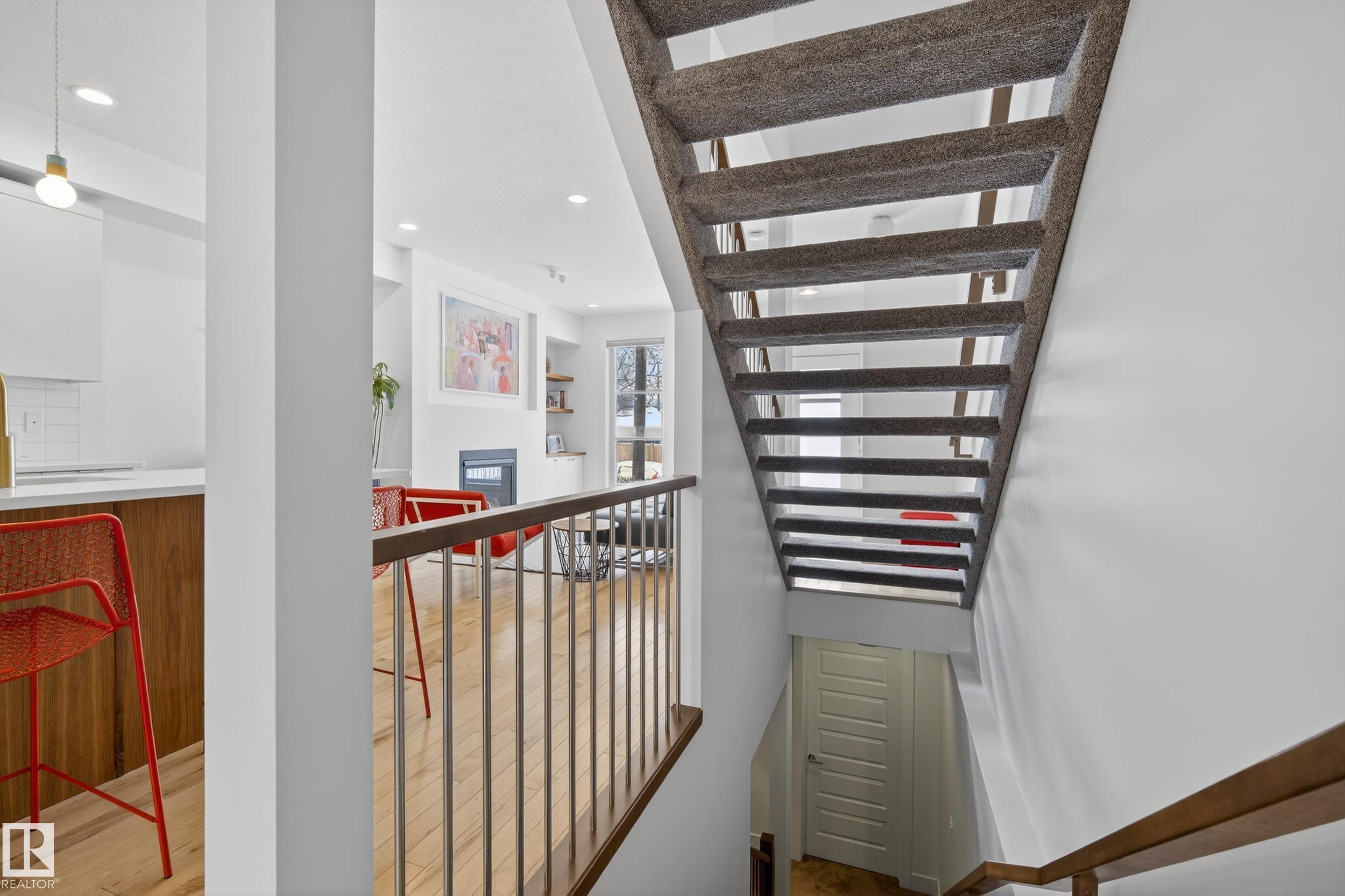 Welcome to this stunning 3-storey townhouse offering the perfect blend of modern style and functional living! The bright main floor features hardwood floors, a cozy gas fireplace, and an open-concept layout connecting the living, dining, and kitchen areas. The kitchen boasts quartz countertops, stainless steel appliances, a spacious dining area, and a convenient 2-piece bath. The second level offers two generous bedrooms, each with its own ensuite, plus a dedicated laundry space with updated cabinetry. The third floor features a private third bedroom and access to your own rooftop patio?perfect for relaxing or entertaining. The fully finished basement includes a rec room, 4th bedroom, and full bathroom. The garage is equipped with power for EV charging, and you?ll love the beautifully landscaped common yard. Ideally located within walking distance to Mill Creek Ravine, Bonnie Doon Shopping Centre, La Cité Francophone, and Colombian Coffee, this home offers incredible value in a prime location!
