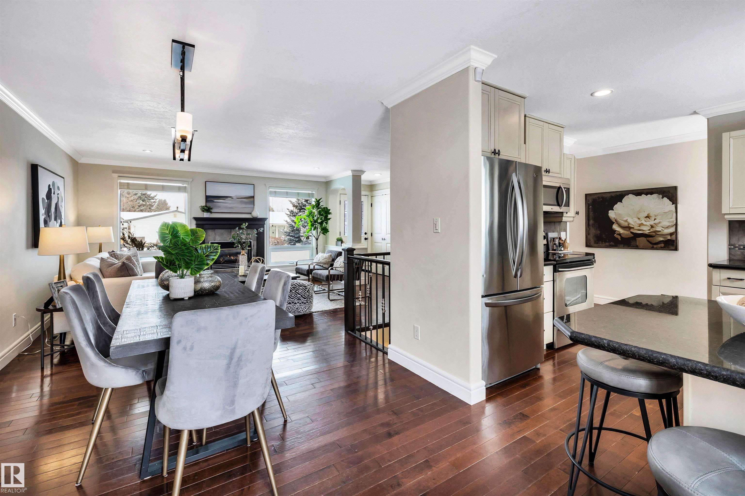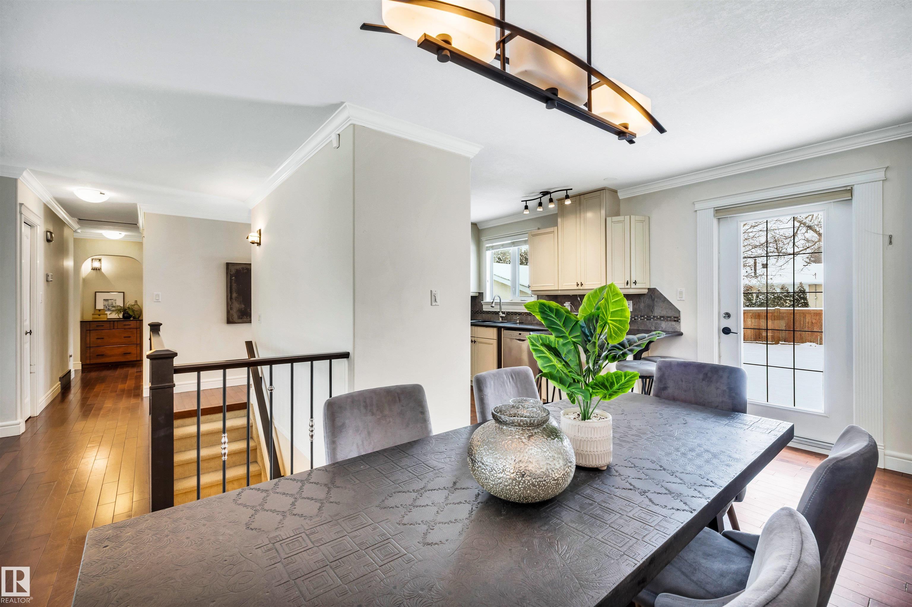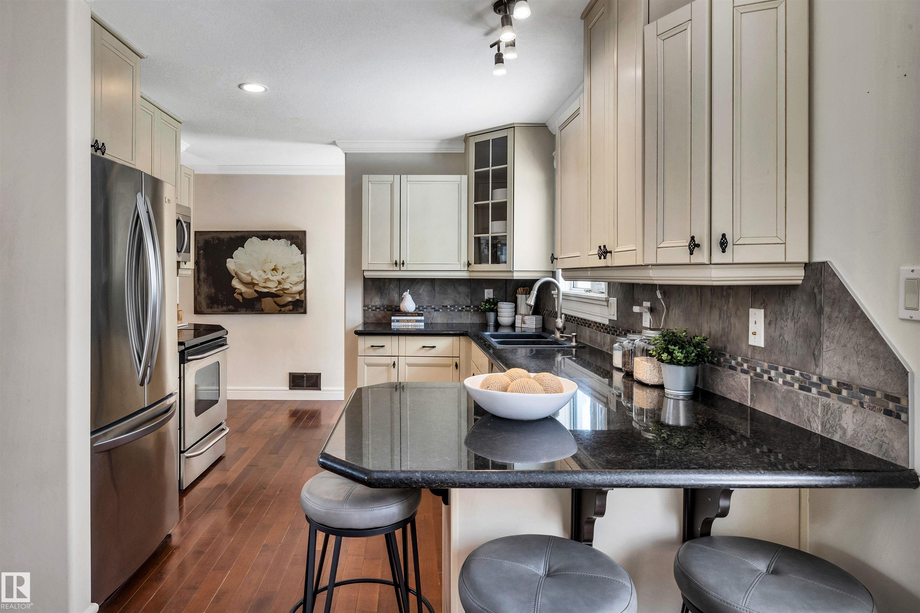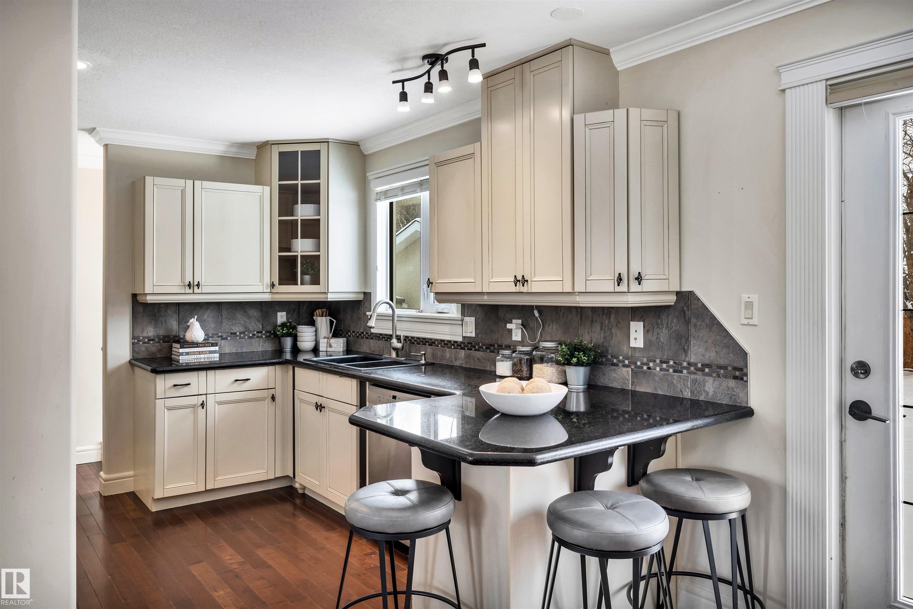 Welcome to Aspen Gardens! This charming 4-bed, 3-bath bungalow, a double detached garage has been tastefully renovated in recent years. The home features rich hdwd flooring thru-out the main level, while large newer windows & west-facing exposure fill the space with natural light. The inviting living rm offers a cozy gas fireplace & flows seamlessly into the dining area, accented by custom built-in cabinetry. The renovated kitchen incls granite countertops, ss appliances, & a convenient eating bar with direct access to the large backyard. The main flr includes a generous primary bdrm w/ a walk-in closet & 2-pce ensuite, along w/ 2 additional bdrms. The fully finished basement adds excellent living space, featuring a large recreation rm, 4th bdrm, office/gym area, 3-pce bath, & an oversized laundry & storage rm. Recent upgrades include A/C, furnace, roof shingles, & an on-demand hot water system. Ideally located on a quiet, family-friendly street near top-rated schools, with quick access to the ravine.