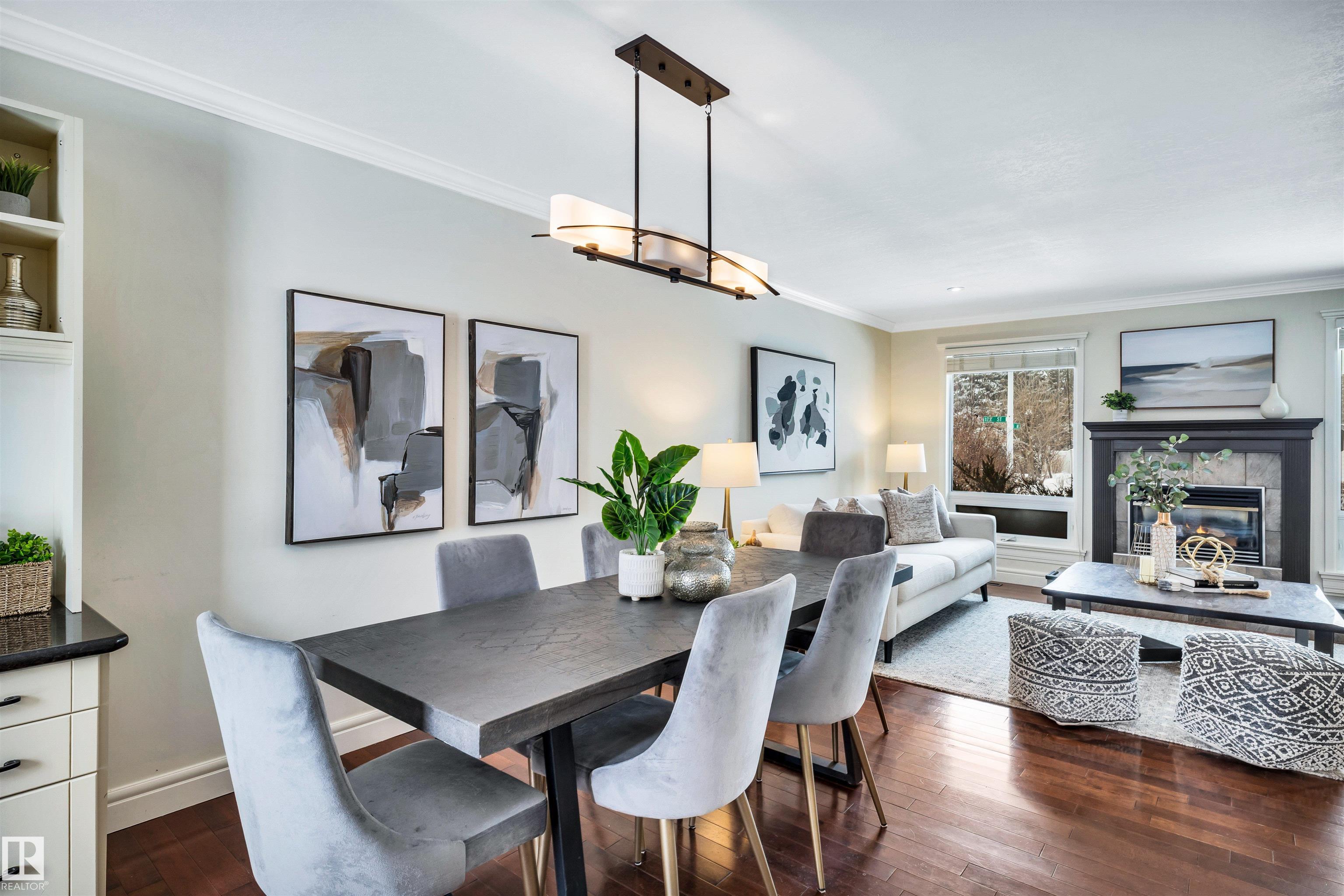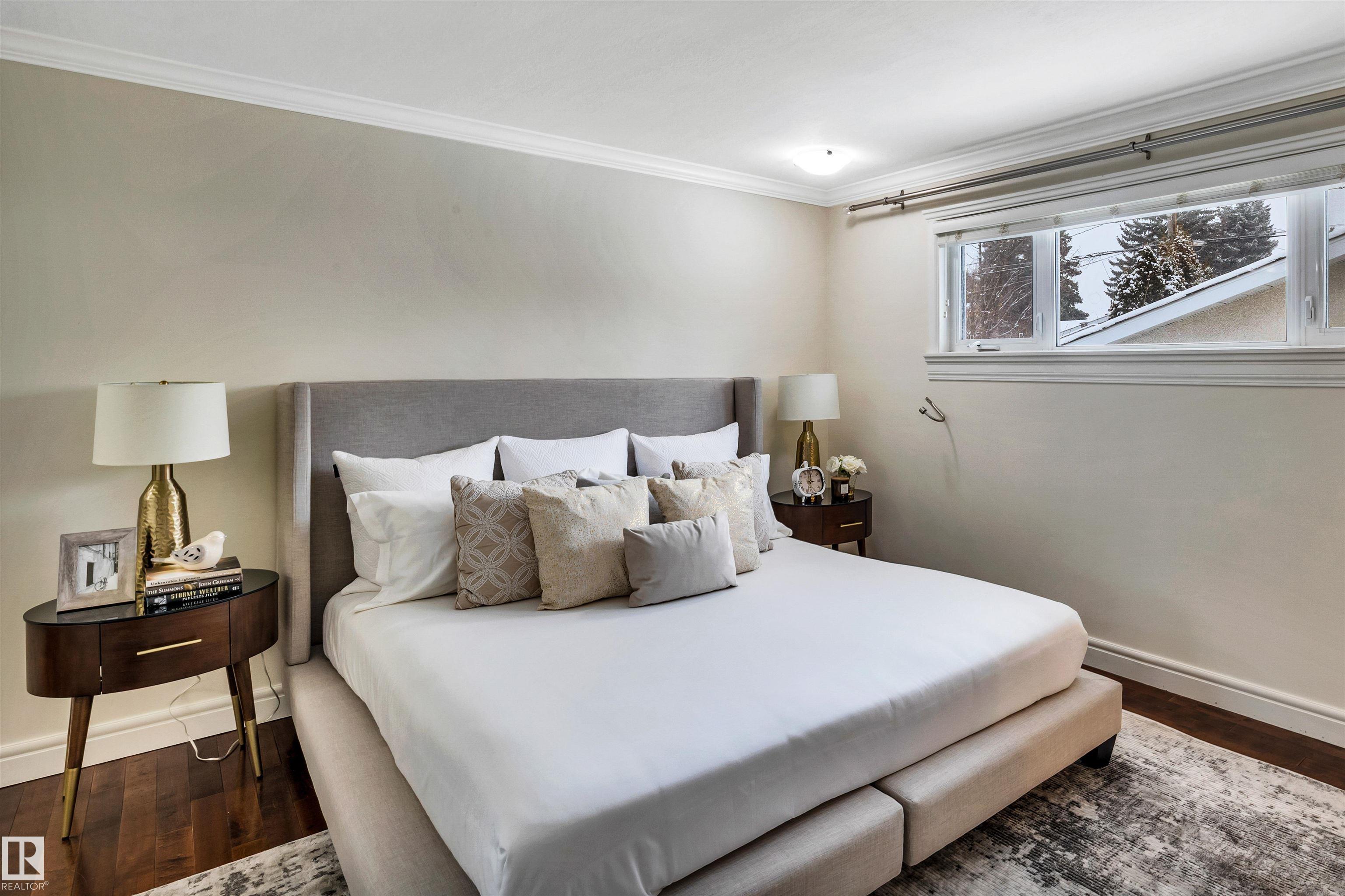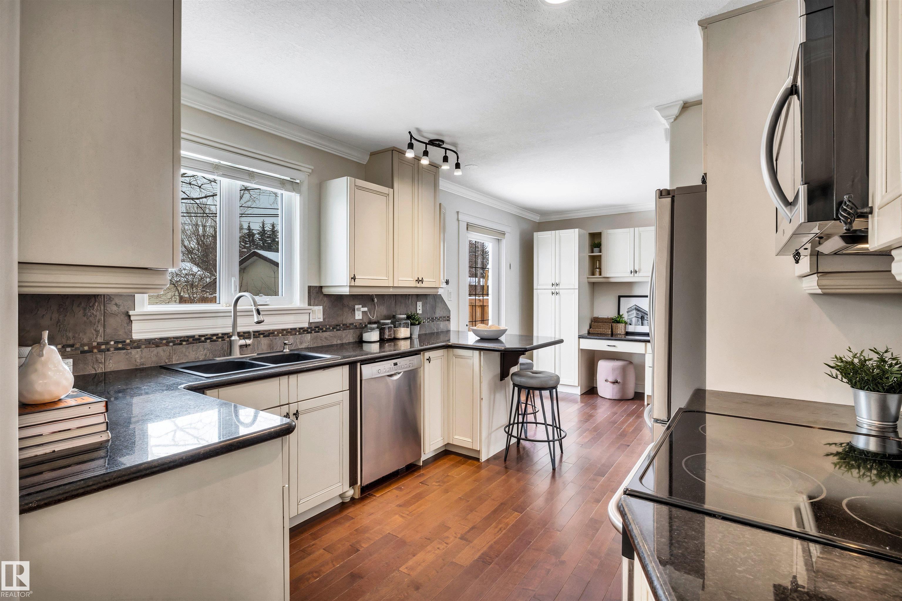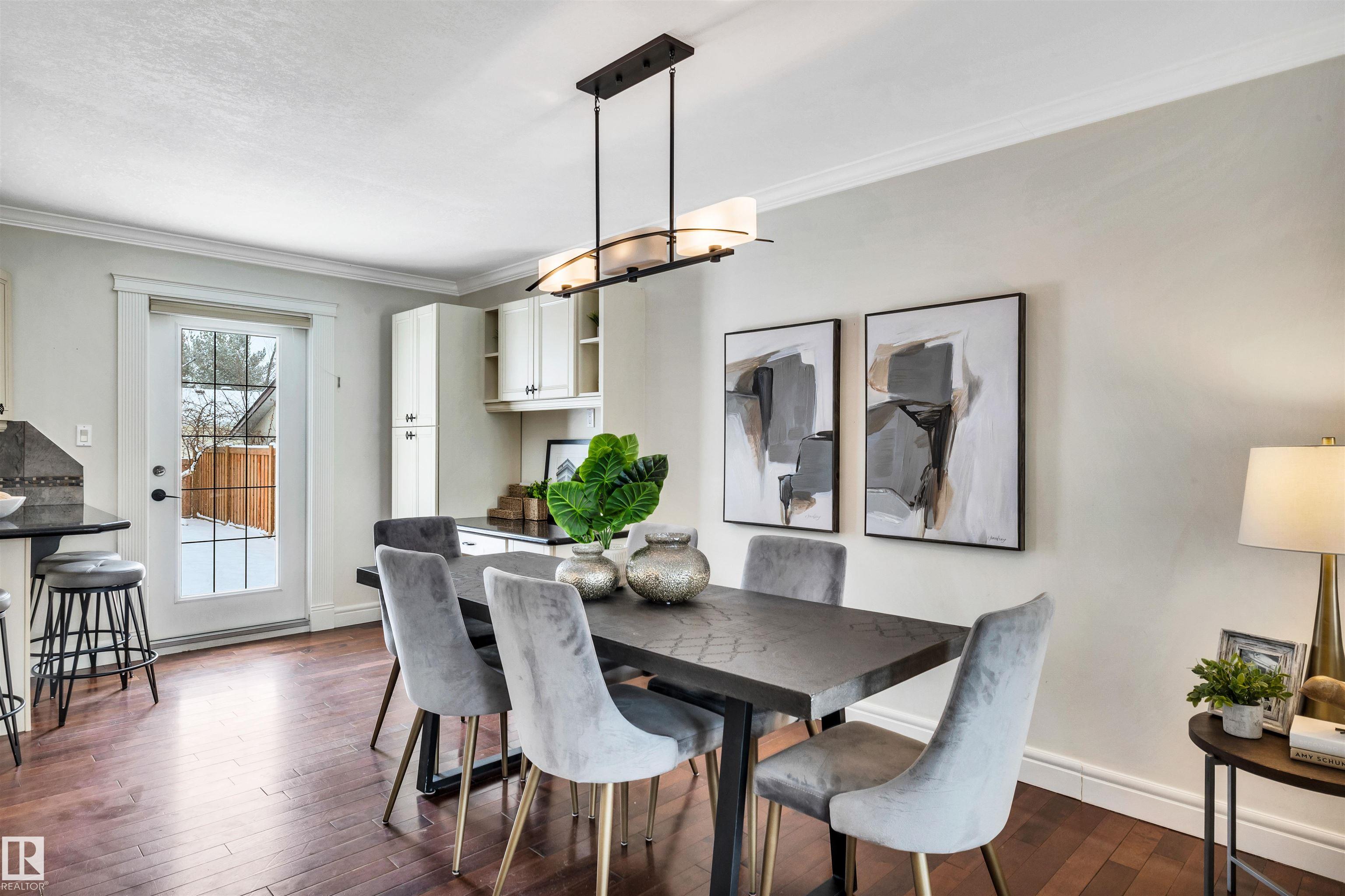 Welcome to Aspen Gardens! This charming 4-bed, 3-bath bungalow, a double detached garage has been tastefully renovated in recent years. The home features rich hdwd flooring thru-out the main level, while large newer windows & west-facing exposure fill the space with natural light. The inviting living rm offers a cozy gas fireplace & flows seamlessly into the dining area, accented by custom built-in cabinetry. The renovated kitchen incls granite countertops, ss appliances, & a convenient eating bar with direct access to the large backyard. The main flr includes a generous primary bdrm w/ a walk-in closet & 2-pce ensuite, along w/ 2 additional bdrms. The fully finished basement adds excellent living space, featuring a large recreation rm, 4th bdrm, office/gym area, 3-pce bath, & an oversized laundry & storage rm. Recent upgrades include A/C, furnace, roof shingles, & an on-demand hot water system. Ideally located on a quiet, family-friendly street near top-rated schools, with quick access to the ravine.