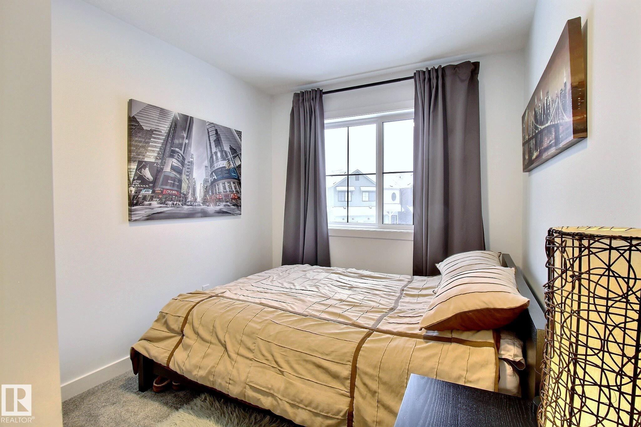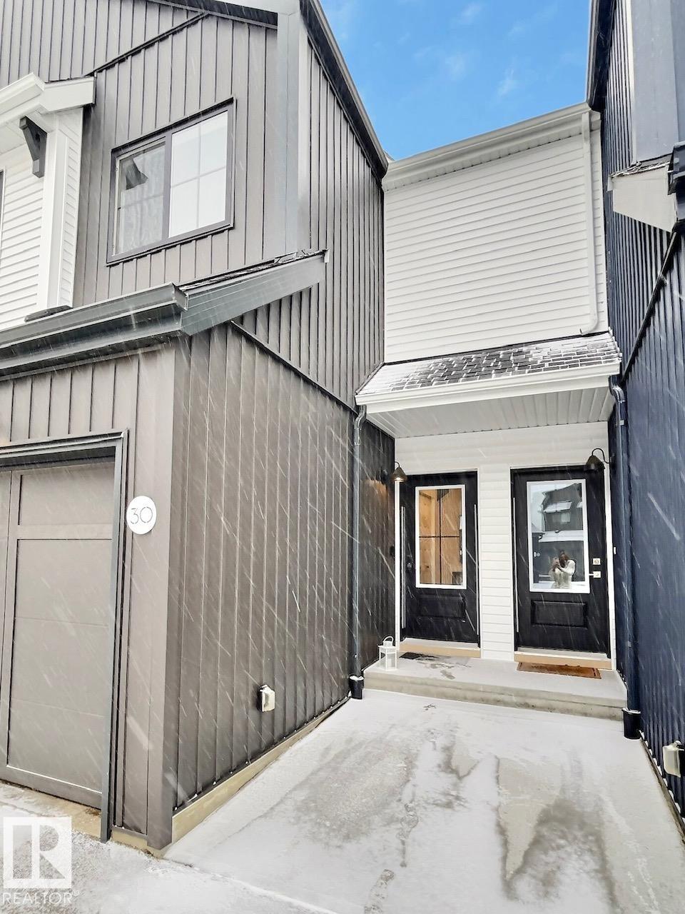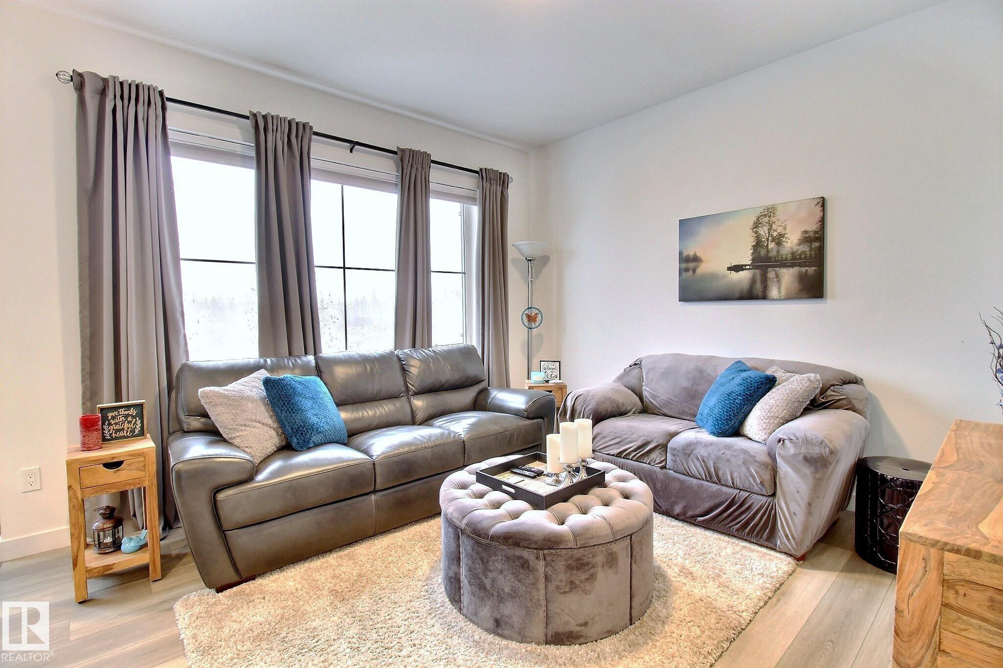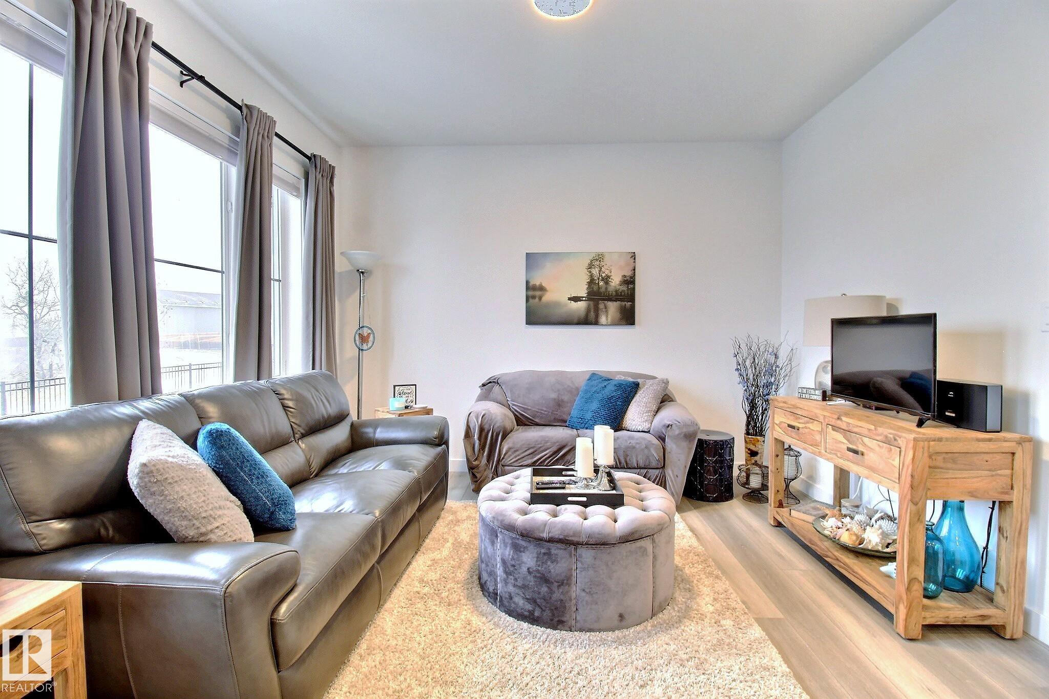 Beautifully maintained and impeccably designed, this exceptional townhome in the desirable Banks of Cavanagh offers a rare blend of style, comfort, and natural serenity. Backing onto the picturesque Blackmud Creek ravine with no neighbours to the south, you'll enjoy peaceful views and direct access to scenic walking trails. The bright, open-concept main floor showcases 9-foot ceilings, large windows, and a modern kitchen with ss appliances, quartz countertops, and seamless flow for everyday living and entertaining. Thoughtfully designed, it features a walk-through mudroom from the double attached garage and central A/C for year-round comfort. Upstairs offers a cozy family room, convenient laundry, and three spacious bedrooms, including a refined primary retreat with a spacious walk-in closet and private 4-pc ensuite. An unfinished basement with roughed-in plumbing provides future potential. Ideally located just minutes from South Edmonton Common and all amenities. A true MUST SEE property!