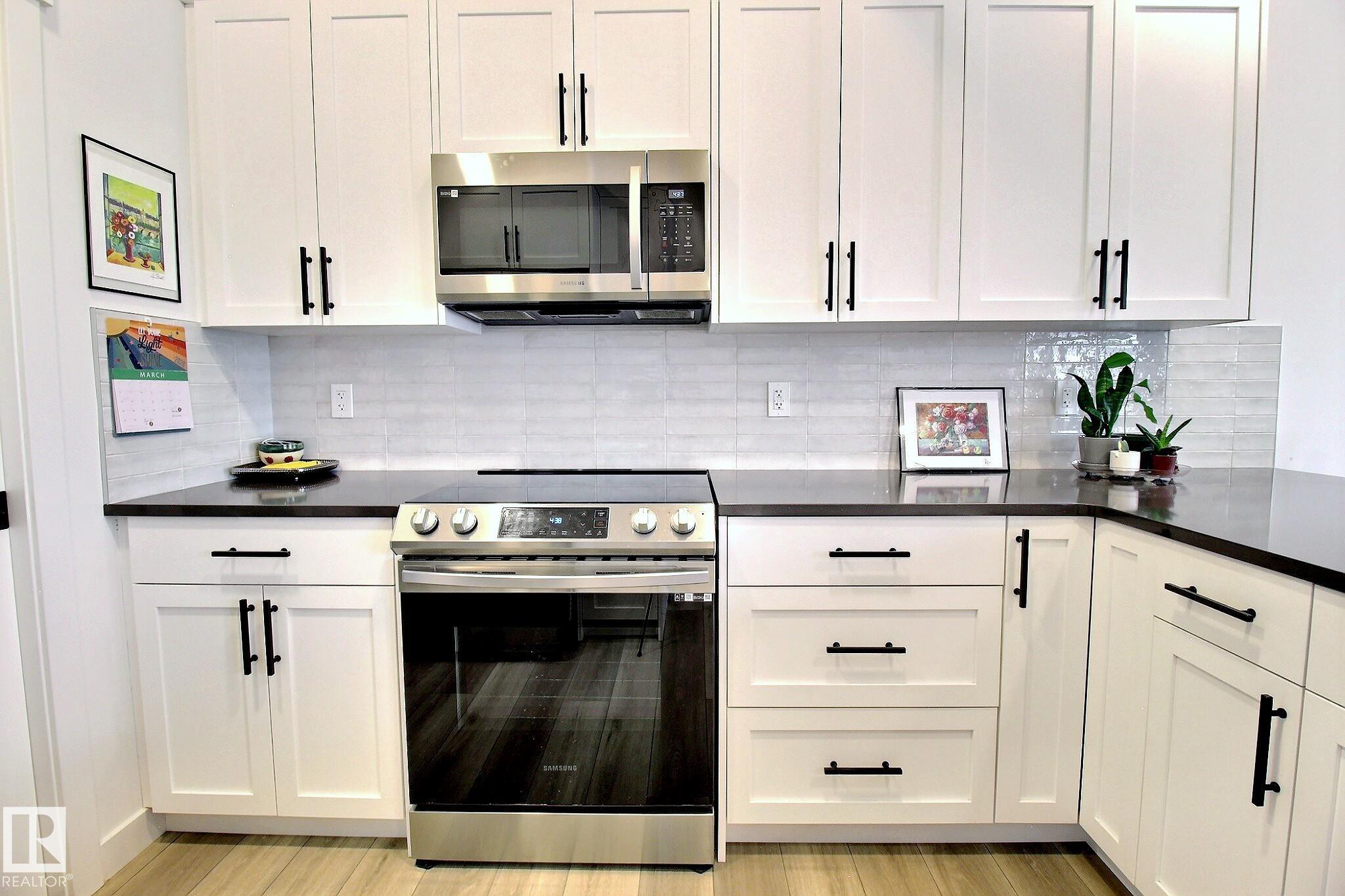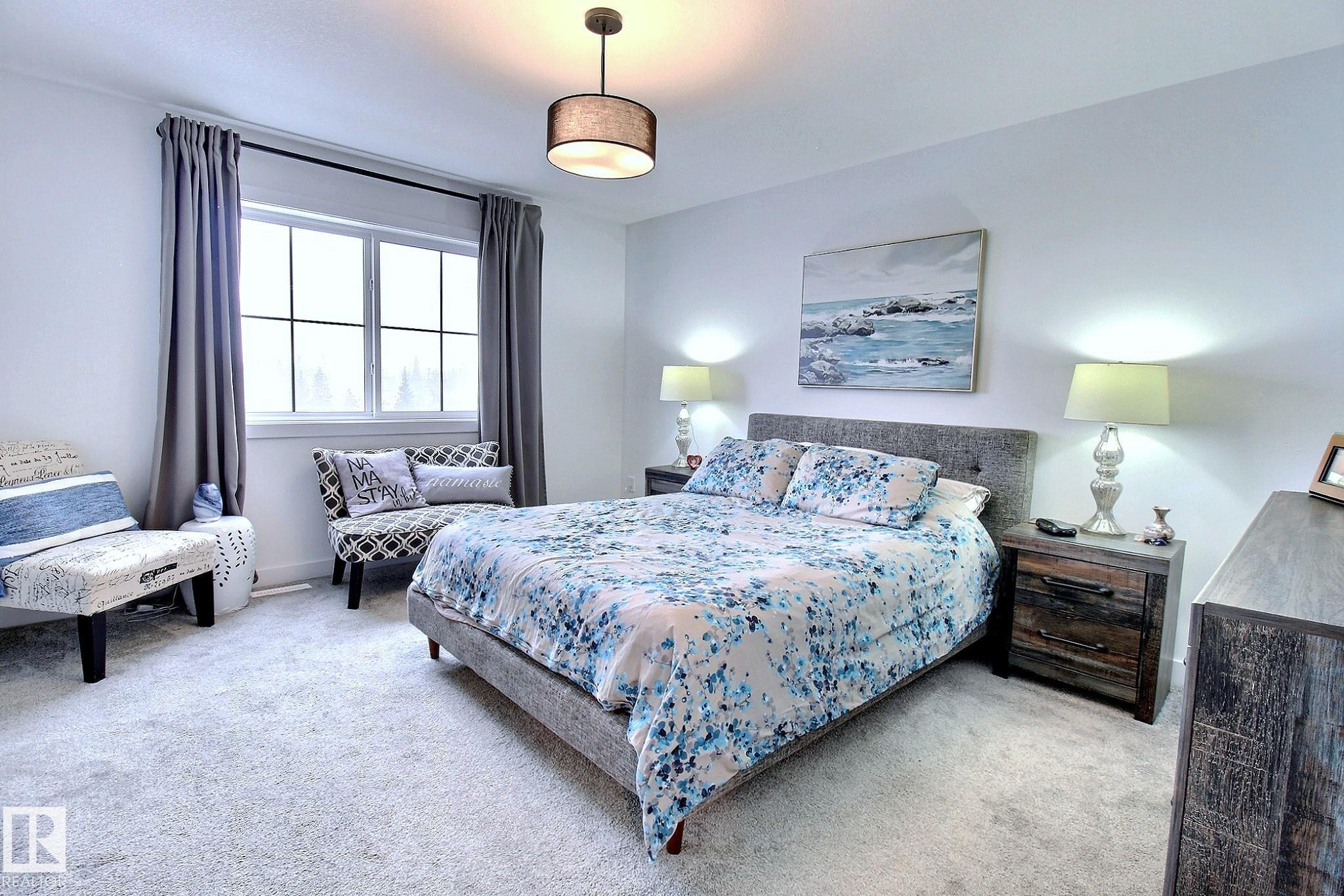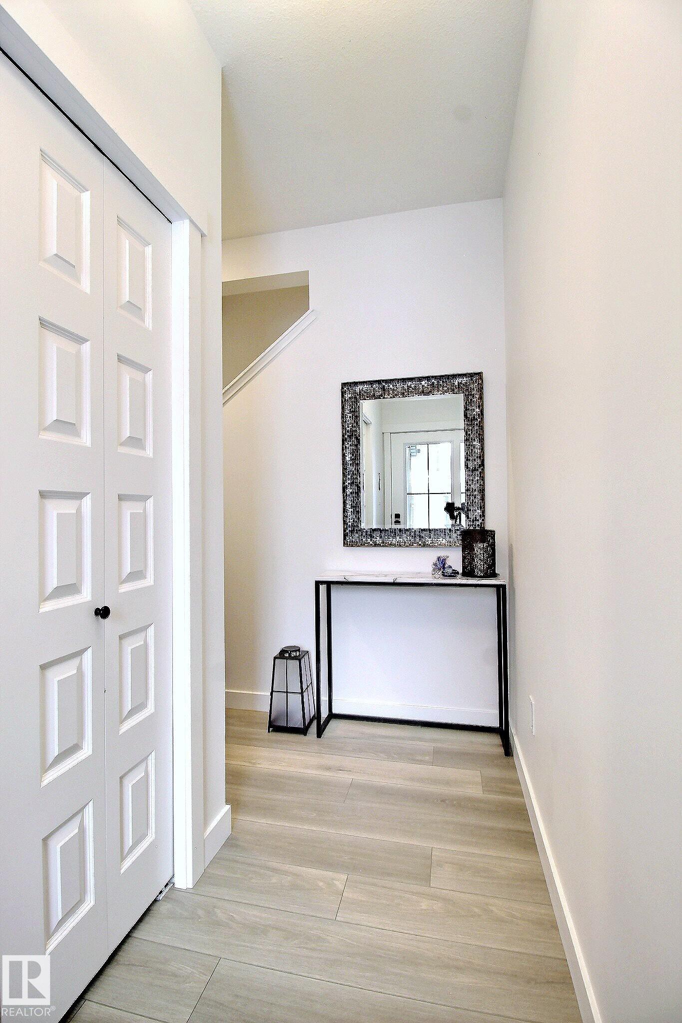 Beautifully maintained and impeccably designed, this exceptional townhome in the desirable Banks of Cavanagh offers a rare blend of style, comfort, and natural serenity. Backing onto the picturesque Blackmud Creek ravine with no neighbours to the south, you'll enjoy peaceful views and direct access to scenic walking trails. The bright, open-concept main floor showcases 9-foot ceilings, large windows, and a modern kitchen with ss appliances, quartz countertops, and seamless flow for everyday living and entertaining. Thoughtfully designed, it features a walk-through mudroom from the double attached garage and central A/C for year-round comfort. Upstairs offers a cozy family room, convenient laundry, and three spacious bedrooms, including a refined primary retreat with a spacious walk-in closet and private 4-pc ensuite. An unfinished basement with roughed-in plumbing provides future potential. Ideally located just minutes from South Edmonton Common and all amenities. A true MUST SEE property!