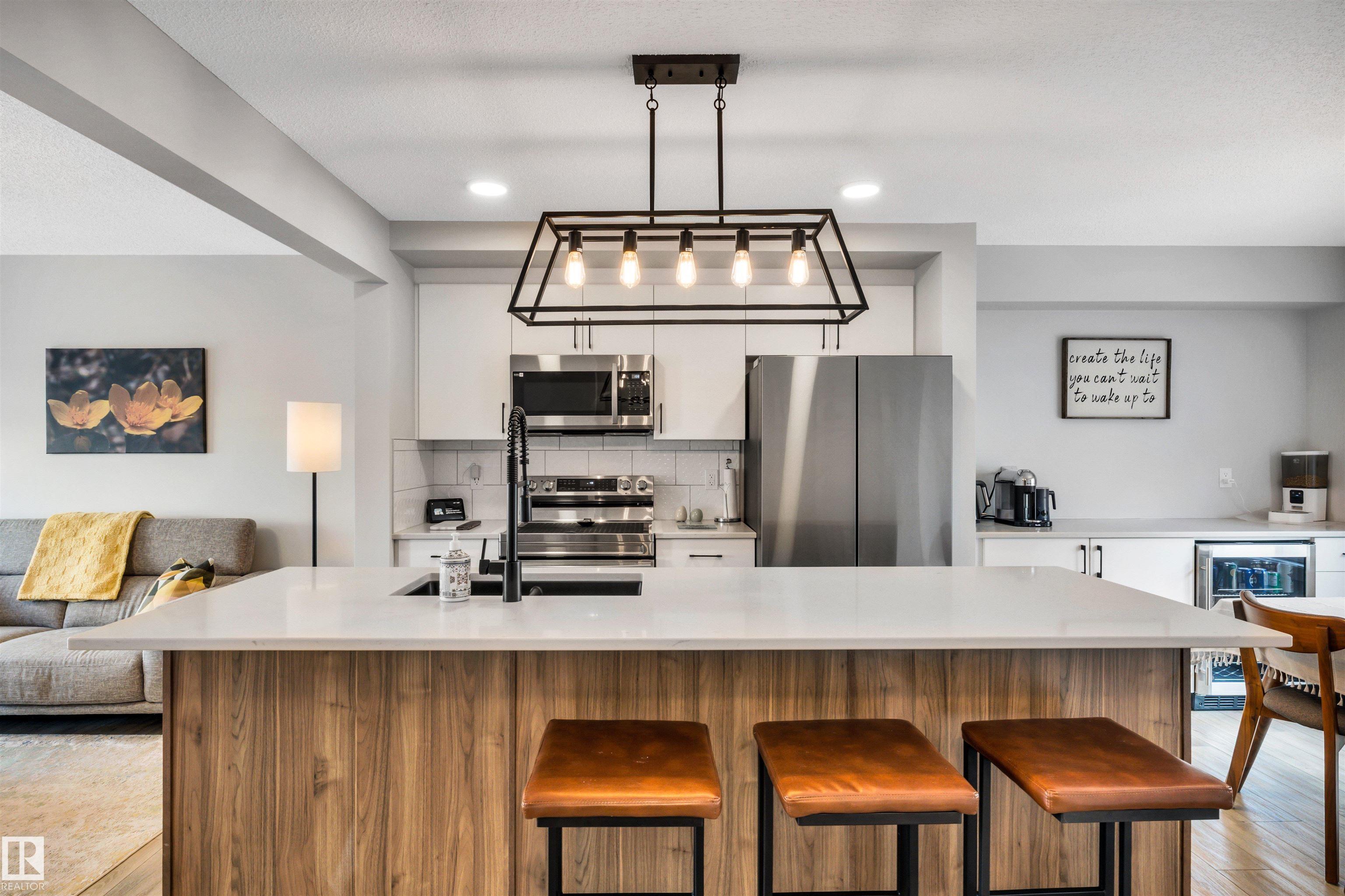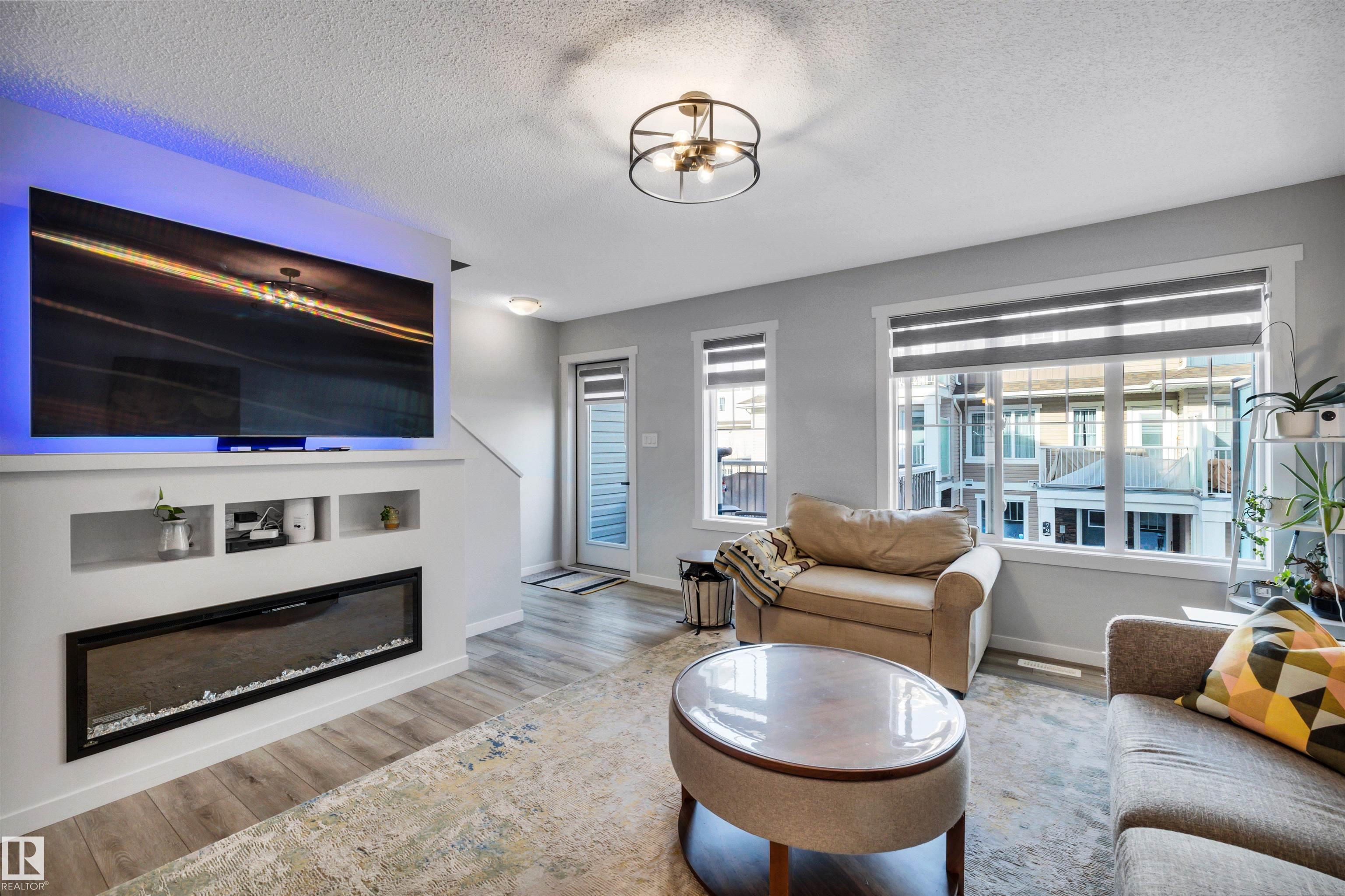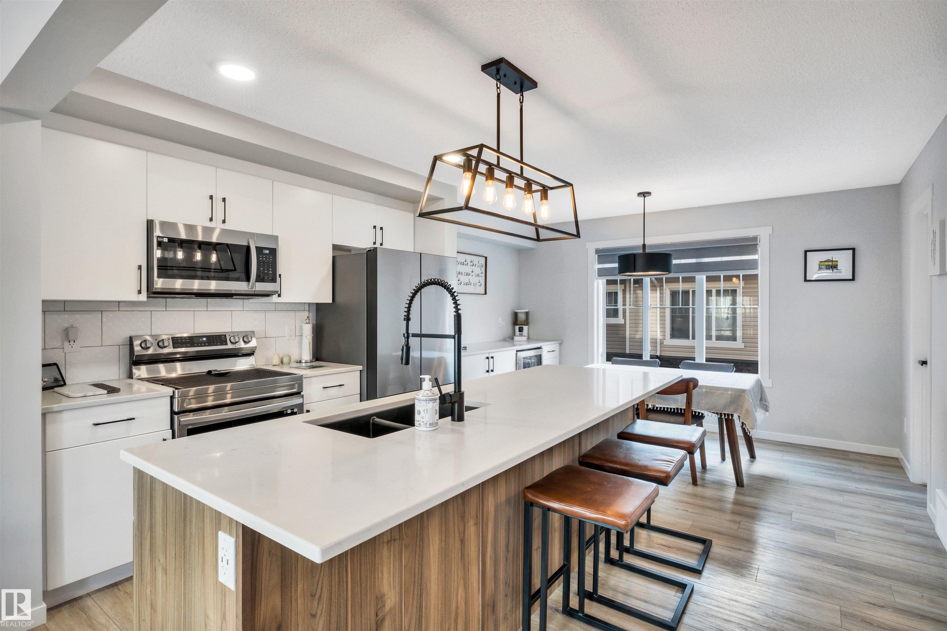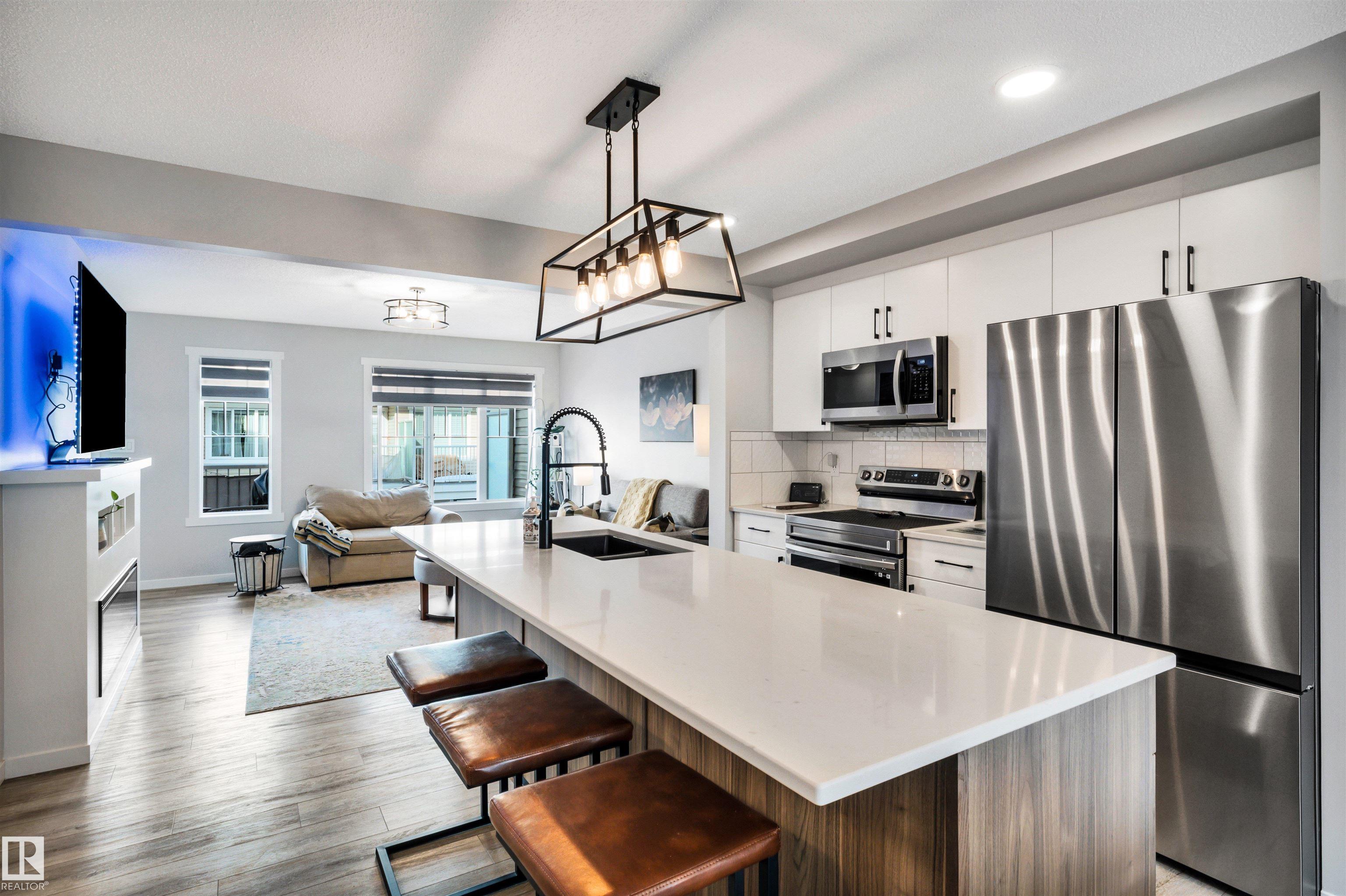 Modern 1408 sq. ft. 3 storey townhouse is in immaculate condition! The owners carefully planned every upgrade to maximize comfort, quality and long-term enjoyment. No carpet here, vinyl plank flooring throughout! Stunning kitchen with upgraded quartz countertops, soft close drawers & cabinets and upgraded stainless steel appliances. The dining room has a built-in coffee bar plus a mini fridge and a walk-in pantry. The living room has an electric fireplace and large windows. Balcony off the living room is perfect to BBQ or enjoy your morning coffee. There are 2 primary bedrooms on the 3rd floor, each with their own walk-in closet and ensuite featuring granite counters, heated towel racks and LED lit mirrors! Zebra blinds throughout the unit. A main floor flex room and access to the double attached garage complete this home. Central A/C and vacuum. Quiet location with shopping, walking trails and a pond nearby.