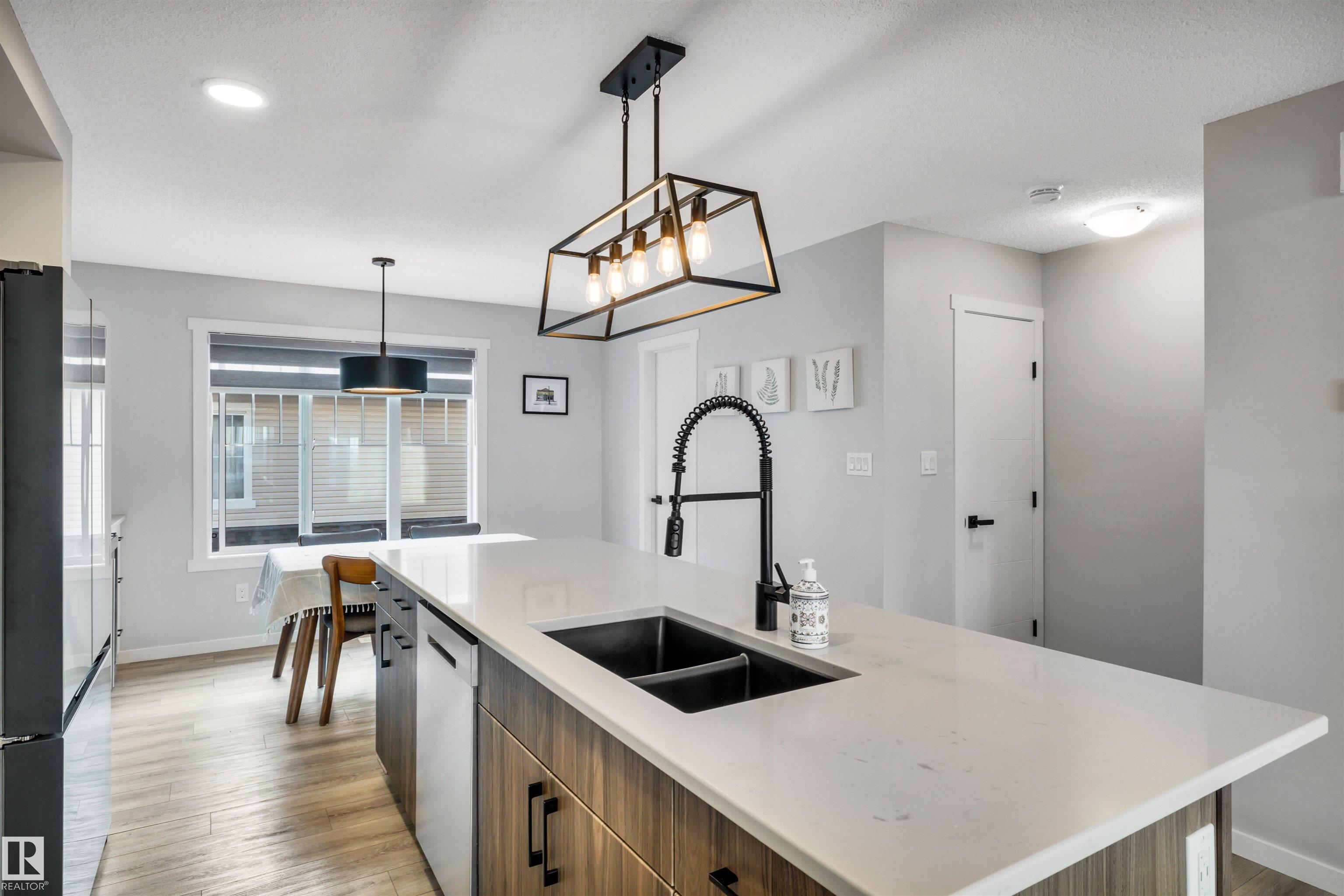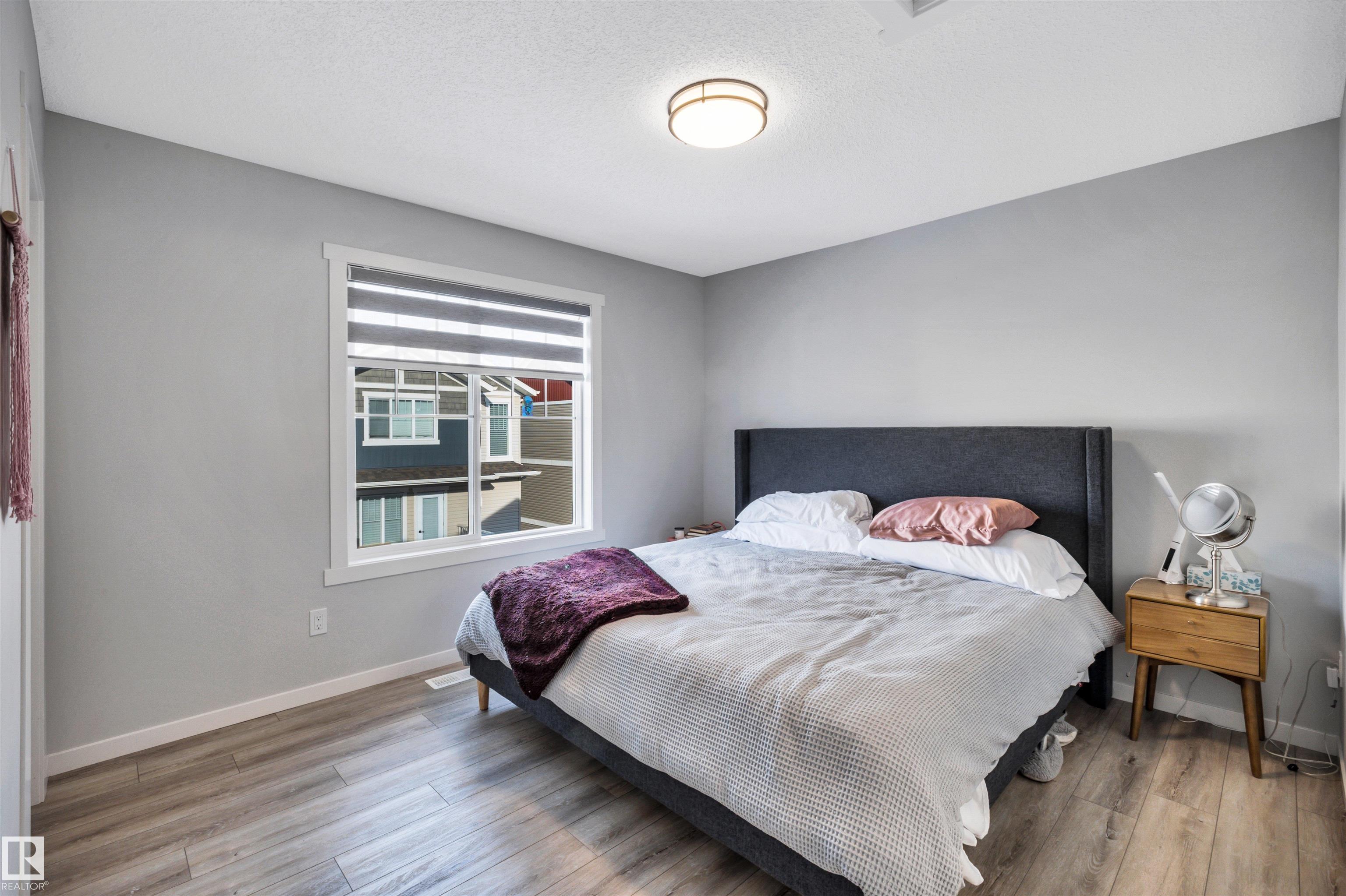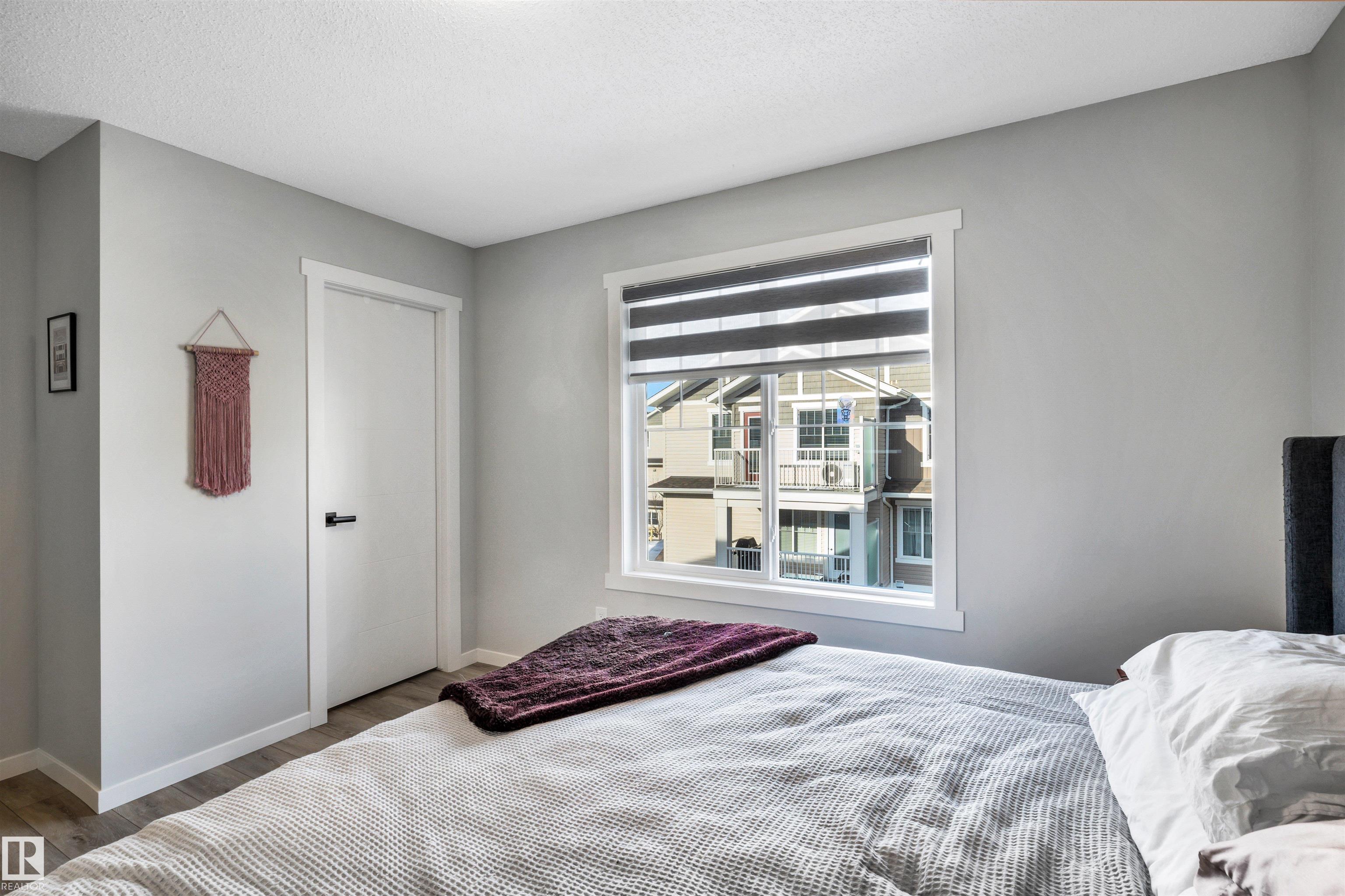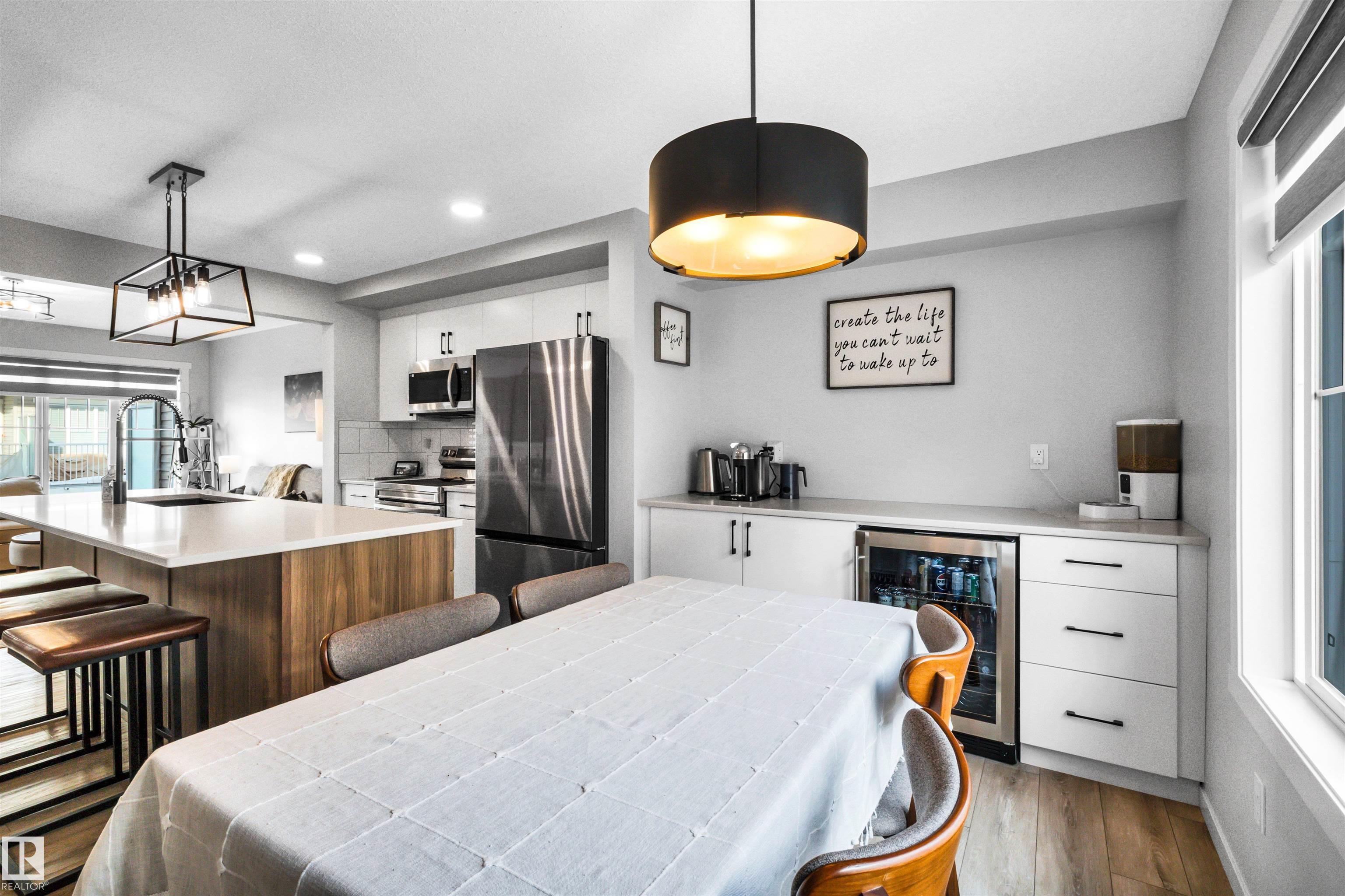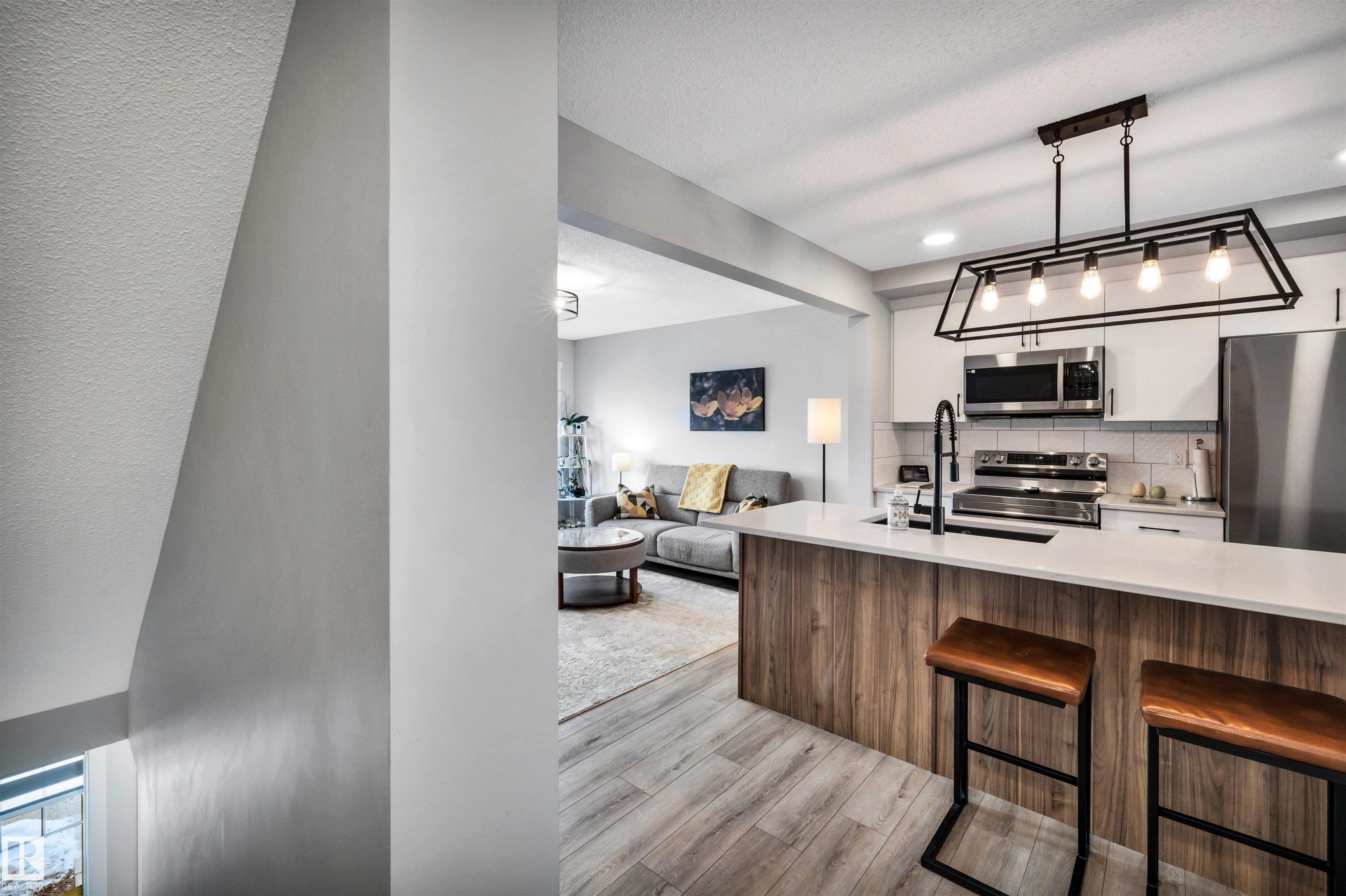 Modern 1408 sq. ft. 3 storey townhouse is in immaculate condition! The owners carefully planned every upgrade to maximize comfort, quality and long-term enjoyment. No carpet here, vinyl plank flooring throughout! Stunning kitchen with upgraded quartz countertops, soft close drawers & cabinets and upgraded stainless steel appliances. The dining room has a built-in coffee bar plus a mini fridge and a walk-in pantry. The living room has an electric fireplace and large windows. Balcony off the living room is perfect to BBQ or enjoy your morning coffee. There are 2 primary bedrooms on the 3rd floor, each with their own walk-in closet and ensuite featuring granite counters, heated towel racks and LED lit mirrors! Zebra blinds throughout the unit. A main floor flex room and access to the double attached garage complete this home. Central A/C and vacuum. Quiet location with shopping, walking trails and a pond nearby.