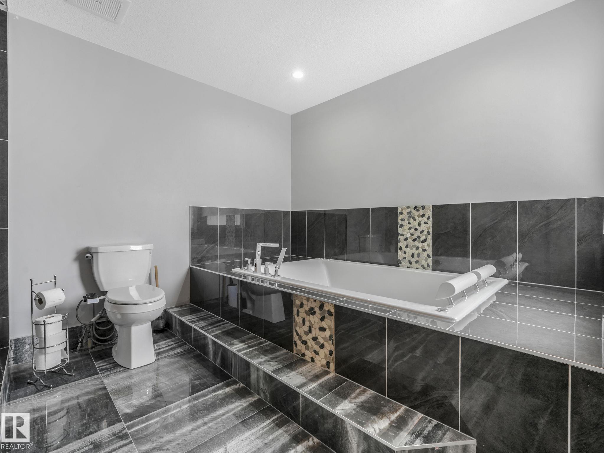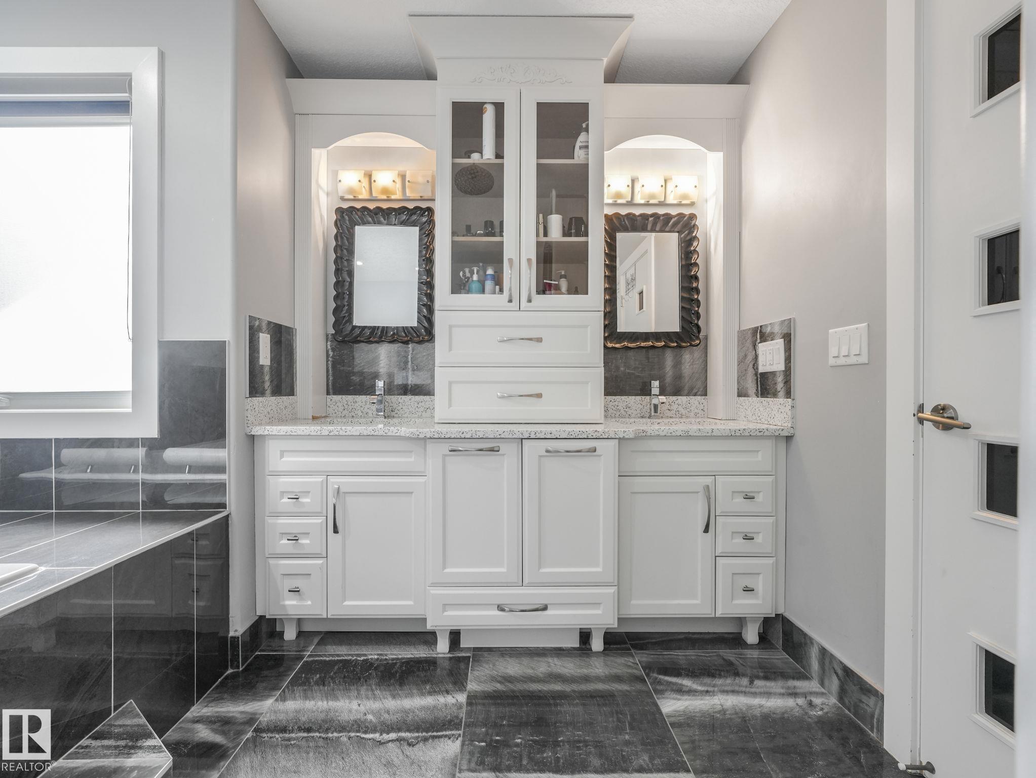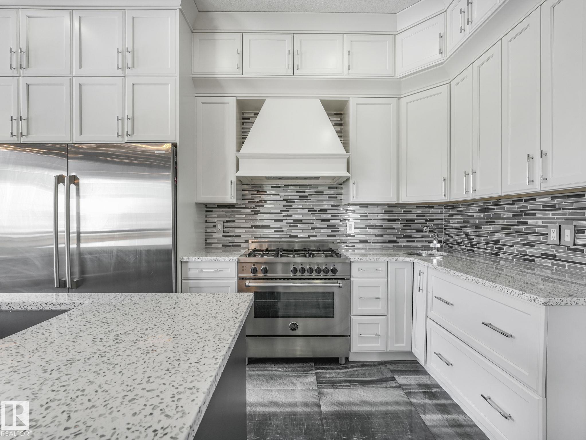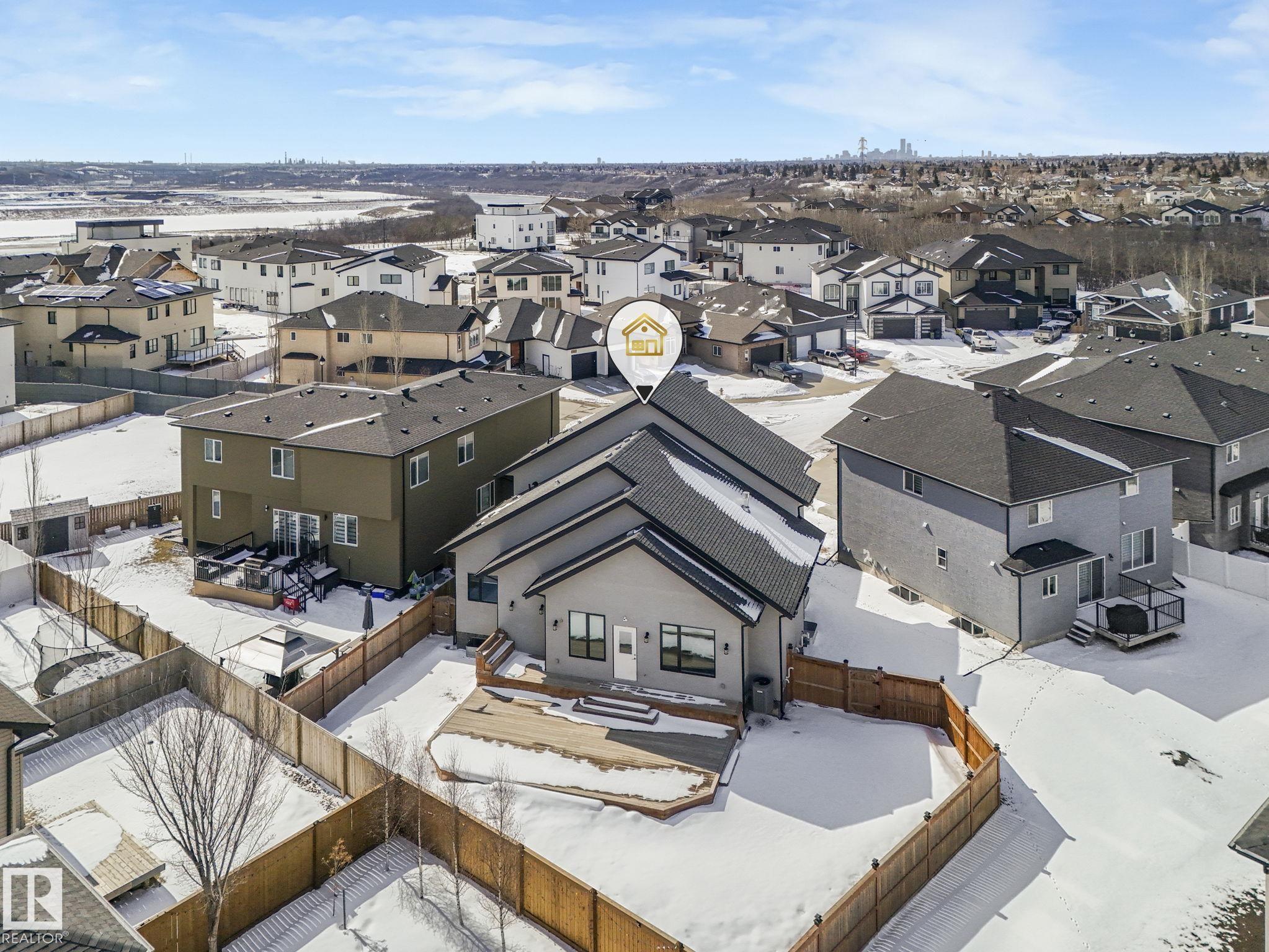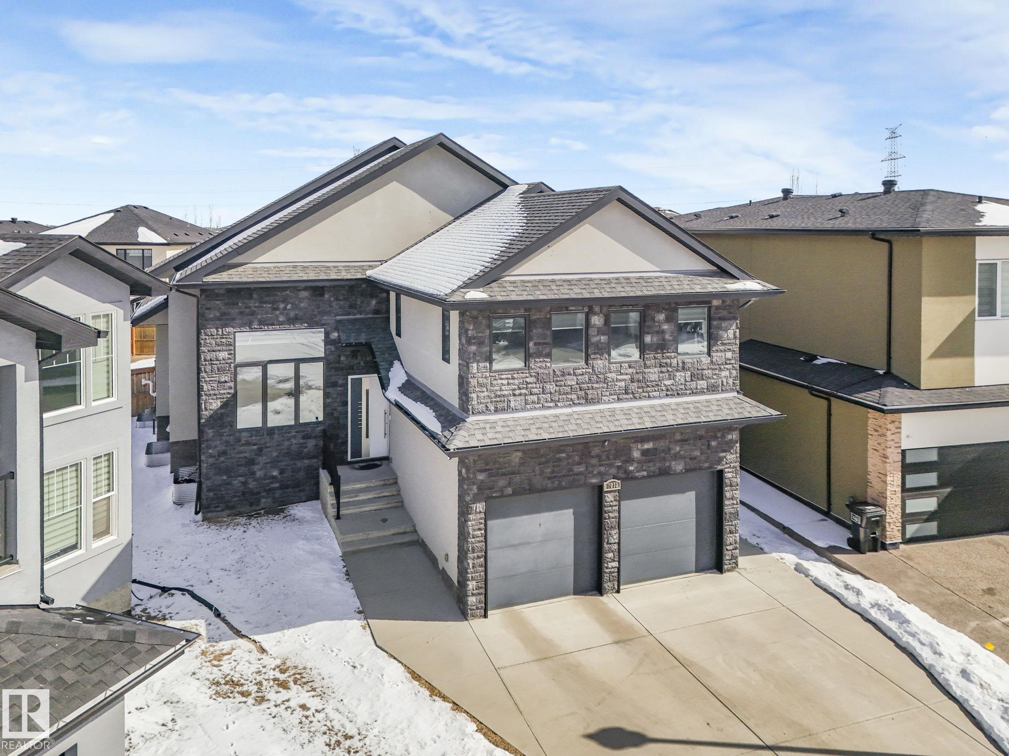 LUXURY LIVING IN AN UNBEATABLE LOCATION! Nestled in a quiet cul-de-sac just steps to the North Saskatchewan River & scenic walking trails, this stunning executive bi-level offers over 4,600 sq ft of upscale living on a large lot. Showcasing a LEGAL SUITE & exceptional craftsmanship, this home impresses with porcelain tile, glass railings & exquisite custom millwork throughout. The main level features a bright living room, elegant dining area with a striking stone feature wall, dual linear fireplace & family room with coffered ceilings. The chef-inspired kitchen is a showstopper, quartz countertops, large island, European cabinetry, premium s/s appliances, gas range, & w/i pantry. 2 spacious bedrooms share a Jack & Jill bath, while the upper level boasts a luxurious primary retreat, spa-like 5-pce ensuite, jacuzzi & steam shower. The finished lower level with SEPARATE ENTRANCE offers an equisite kitchen, 3 bedrooms, multiple baths, family room & separate laundry. Complete with a huge deck - IMPRESSIVE!!