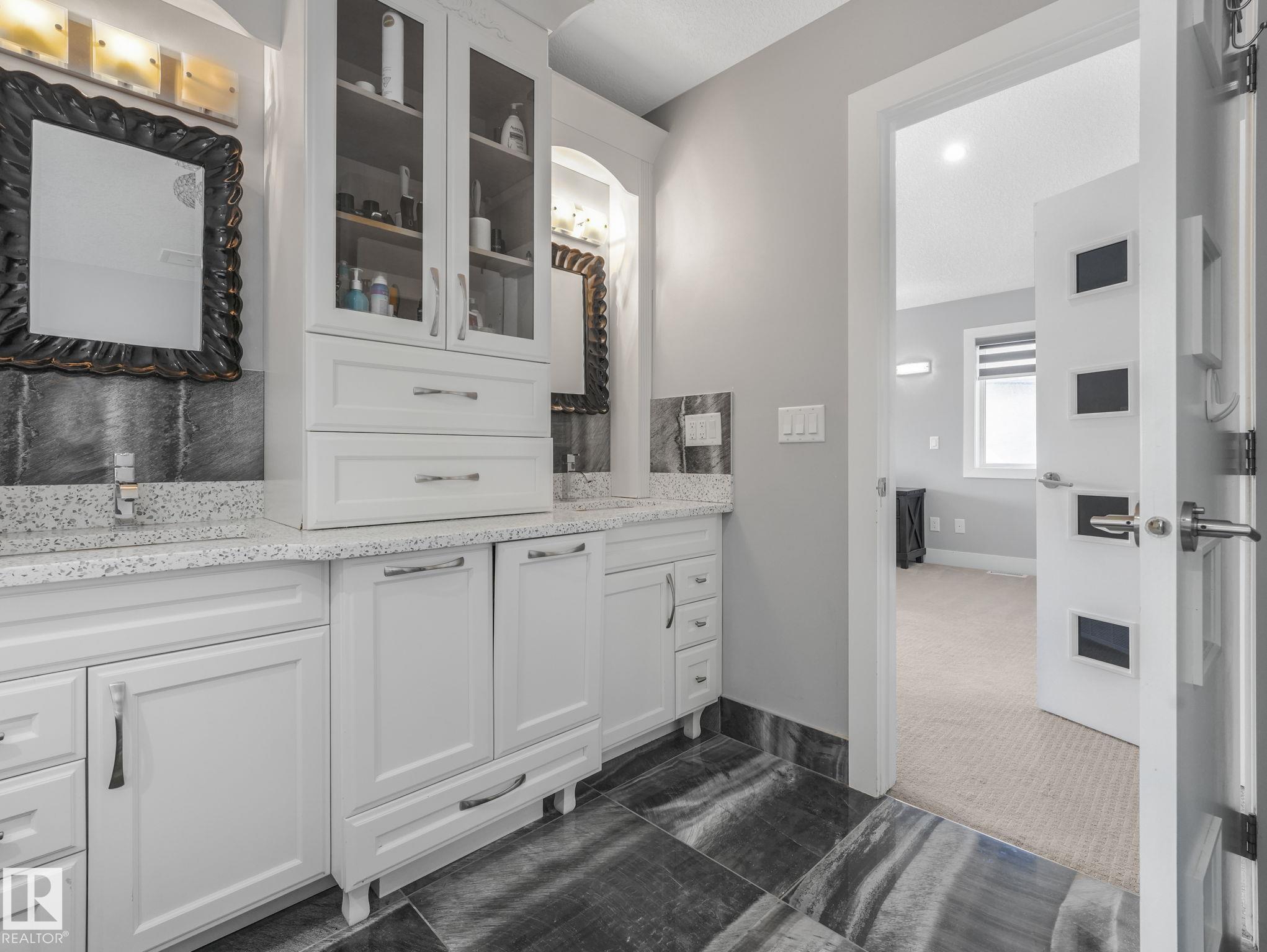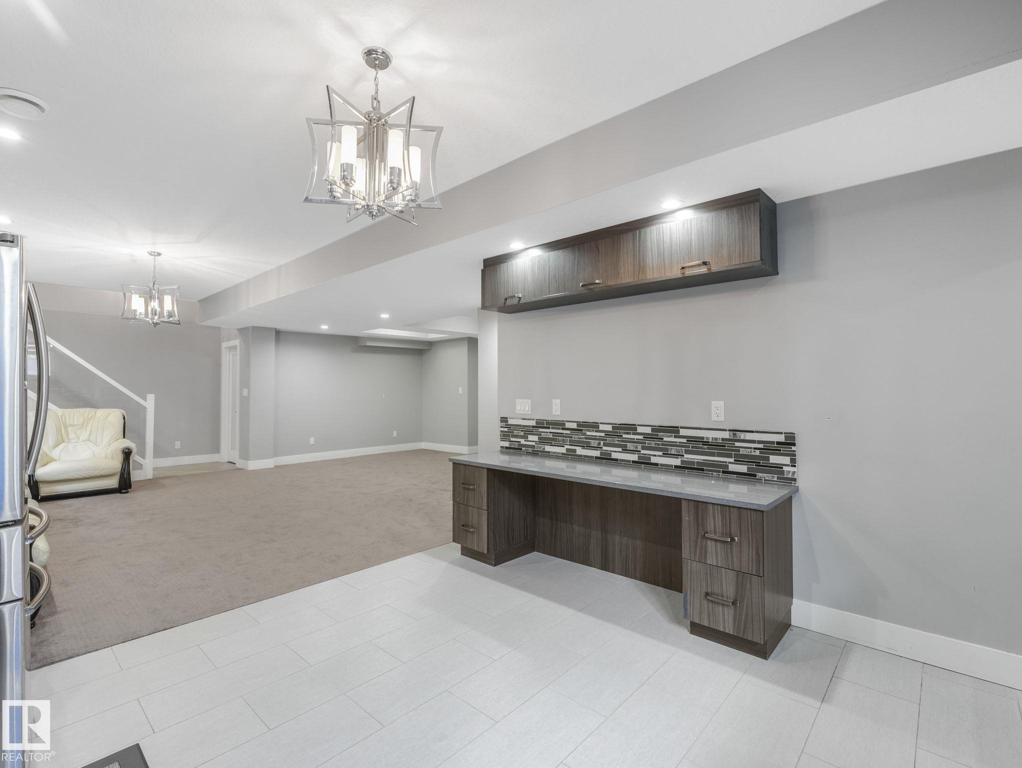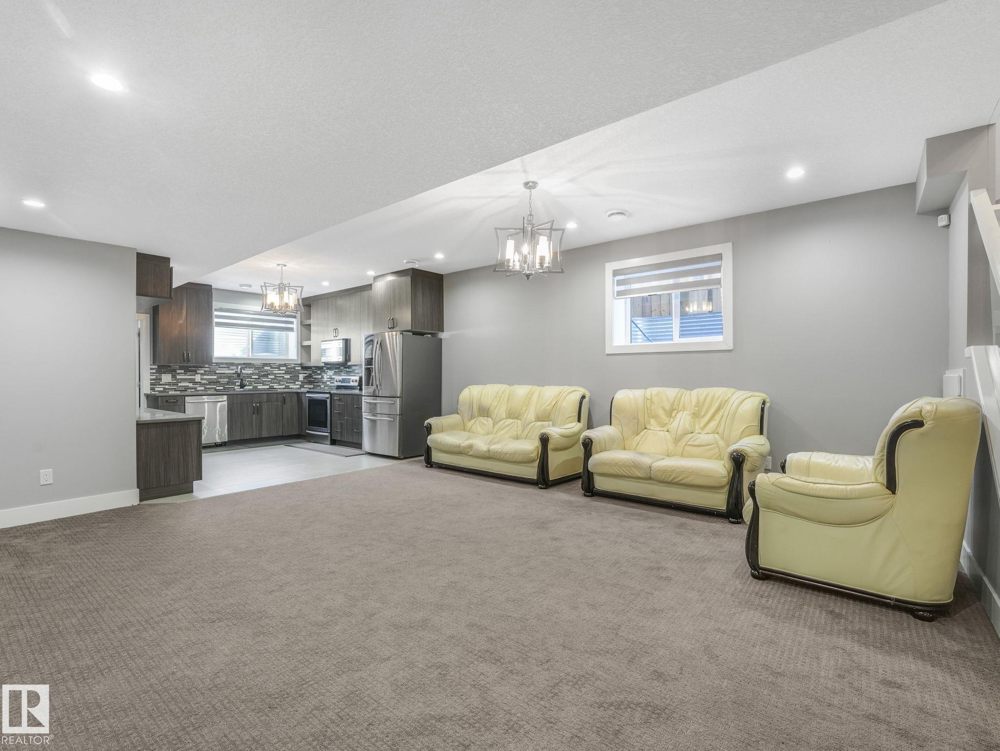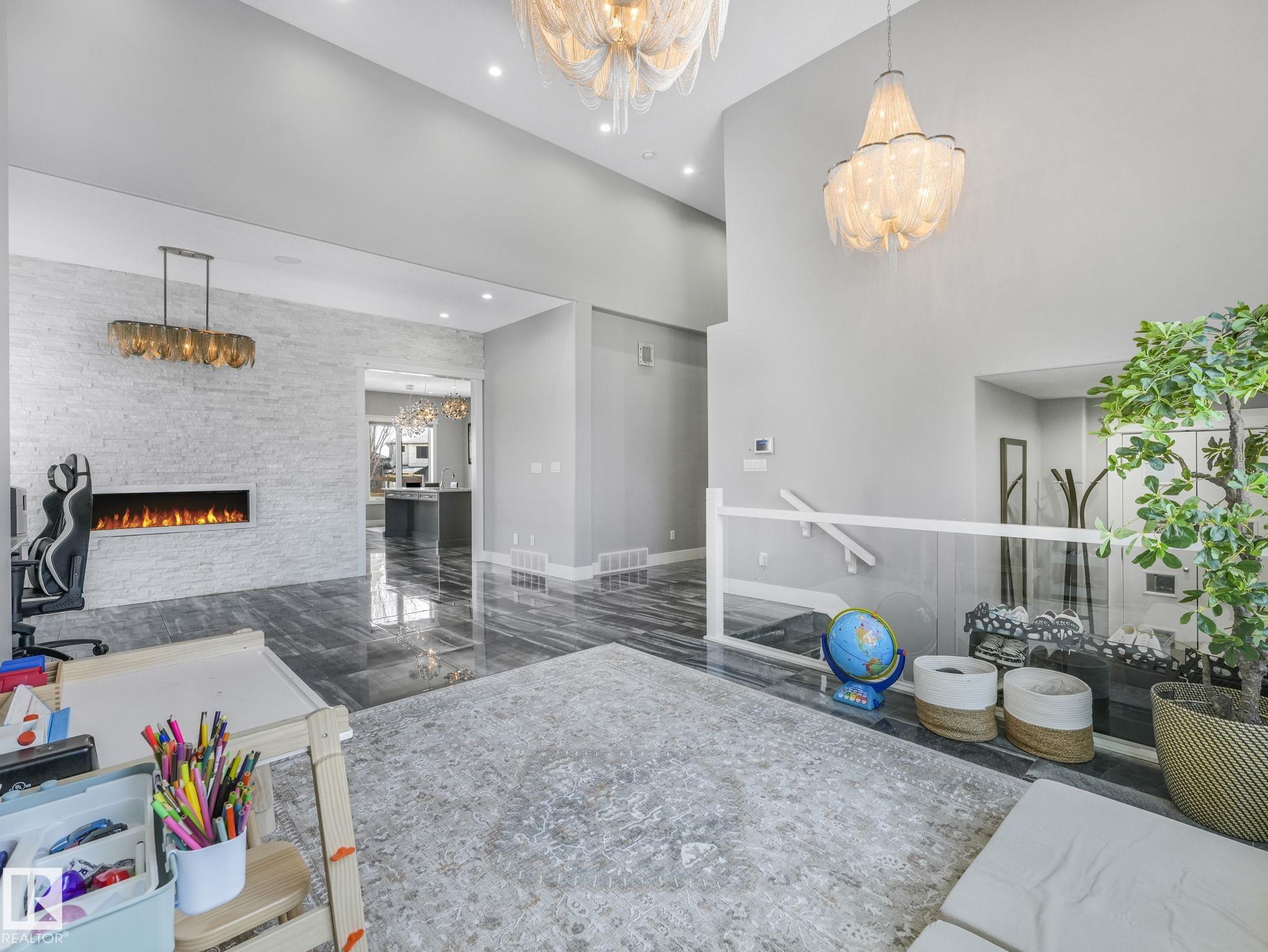 LUXURY LIVING IN AN UNBEATABLE LOCATION! Nestled in a quiet cul-de-sac just steps to the North Saskatchewan River & scenic walking trails, this stunning executive bi-level offers over 4,600 sq ft of upscale living on a large lot. Showcasing a LEGAL SUITE & exceptional craftsmanship, this home impresses with porcelain tile, glass railings & exquisite custom millwork throughout. The main level features a bright living room, elegant dining area with a striking stone feature wall, dual linear fireplace & family room with coffered ceilings. The chef-inspired kitchen is a showstopper, quartz countertops, large island, European cabinetry, premium s/s appliances, gas range, & w/i pantry. 2 spacious bedrooms share a Jack & Jill bath, while the upper level boasts a luxurious primary retreat, spa-like 5-pce ensuite, jacuzzi & steam shower. The finished lower level with SEPARATE ENTRANCE offers an equisite kitchen, 3 bedrooms, multiple baths, family room & separate laundry. Complete with a huge deck - IMPRESSIVE!!