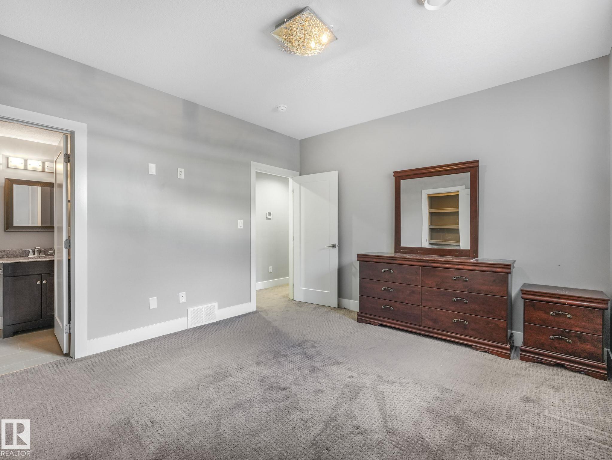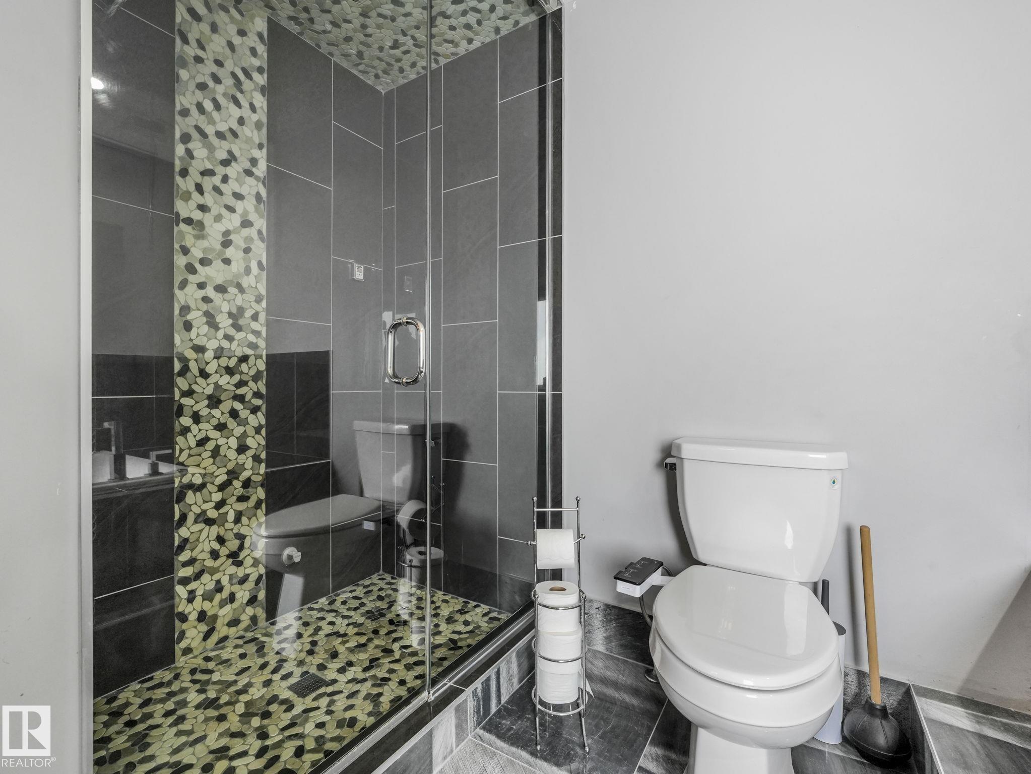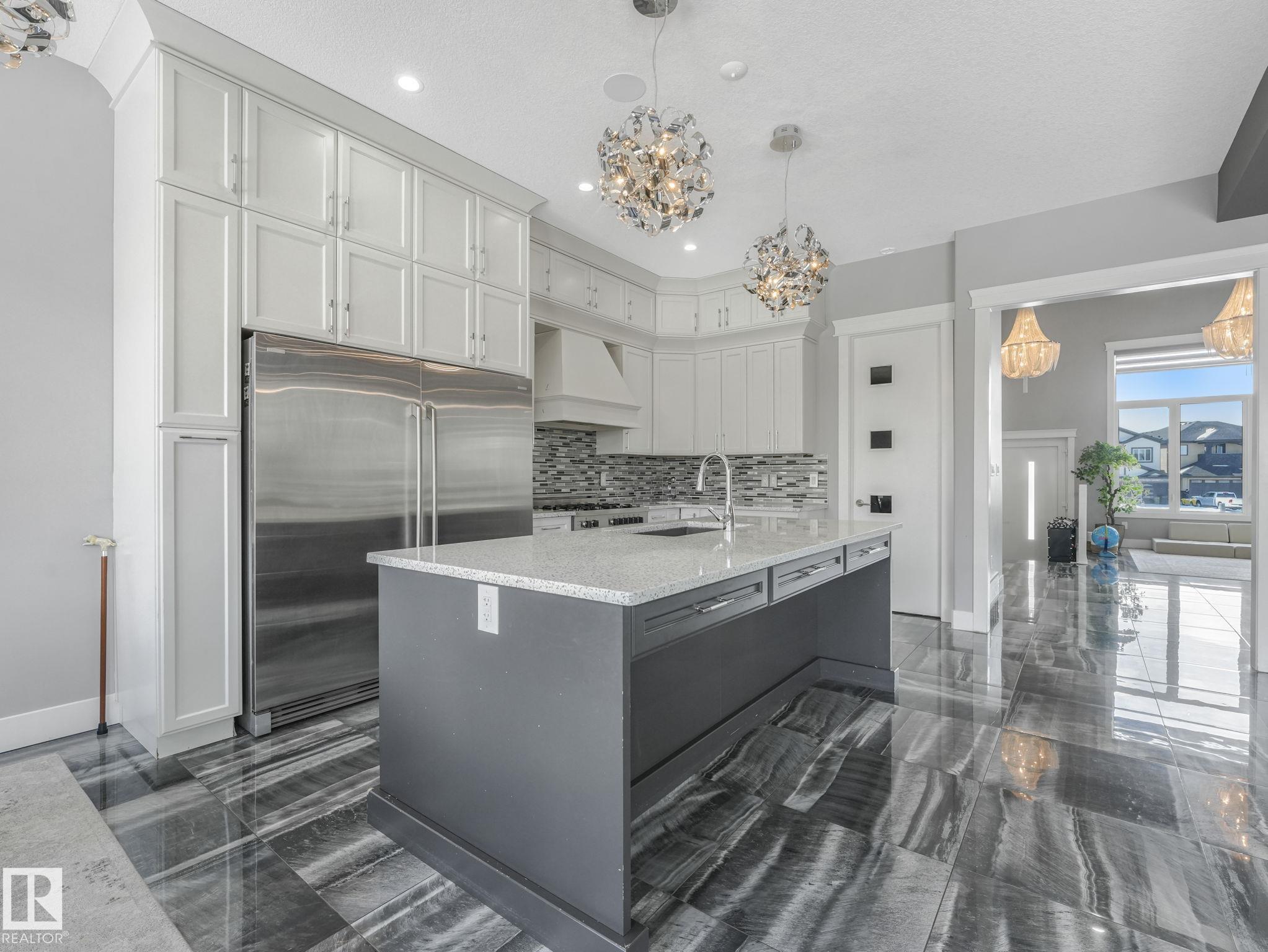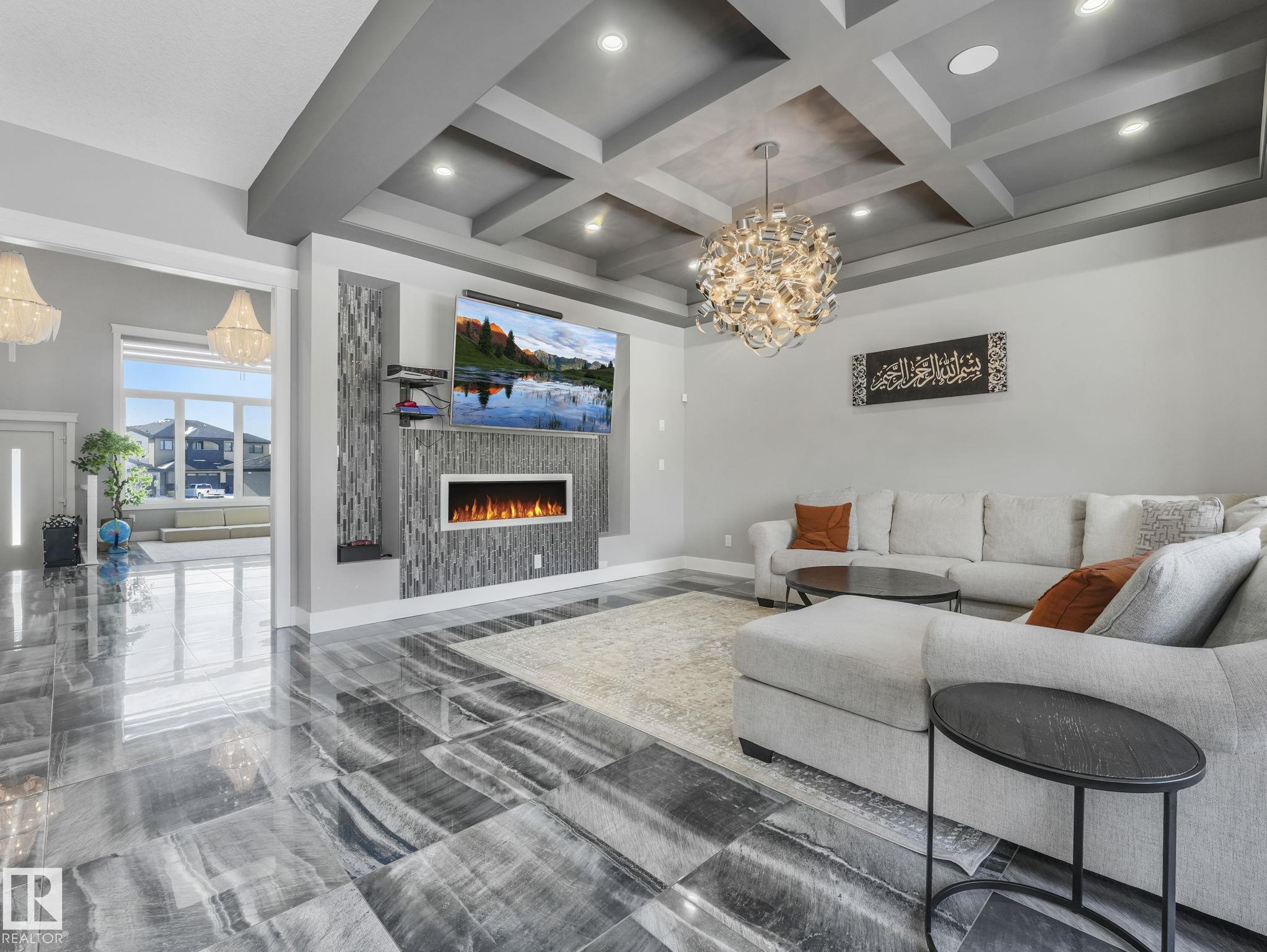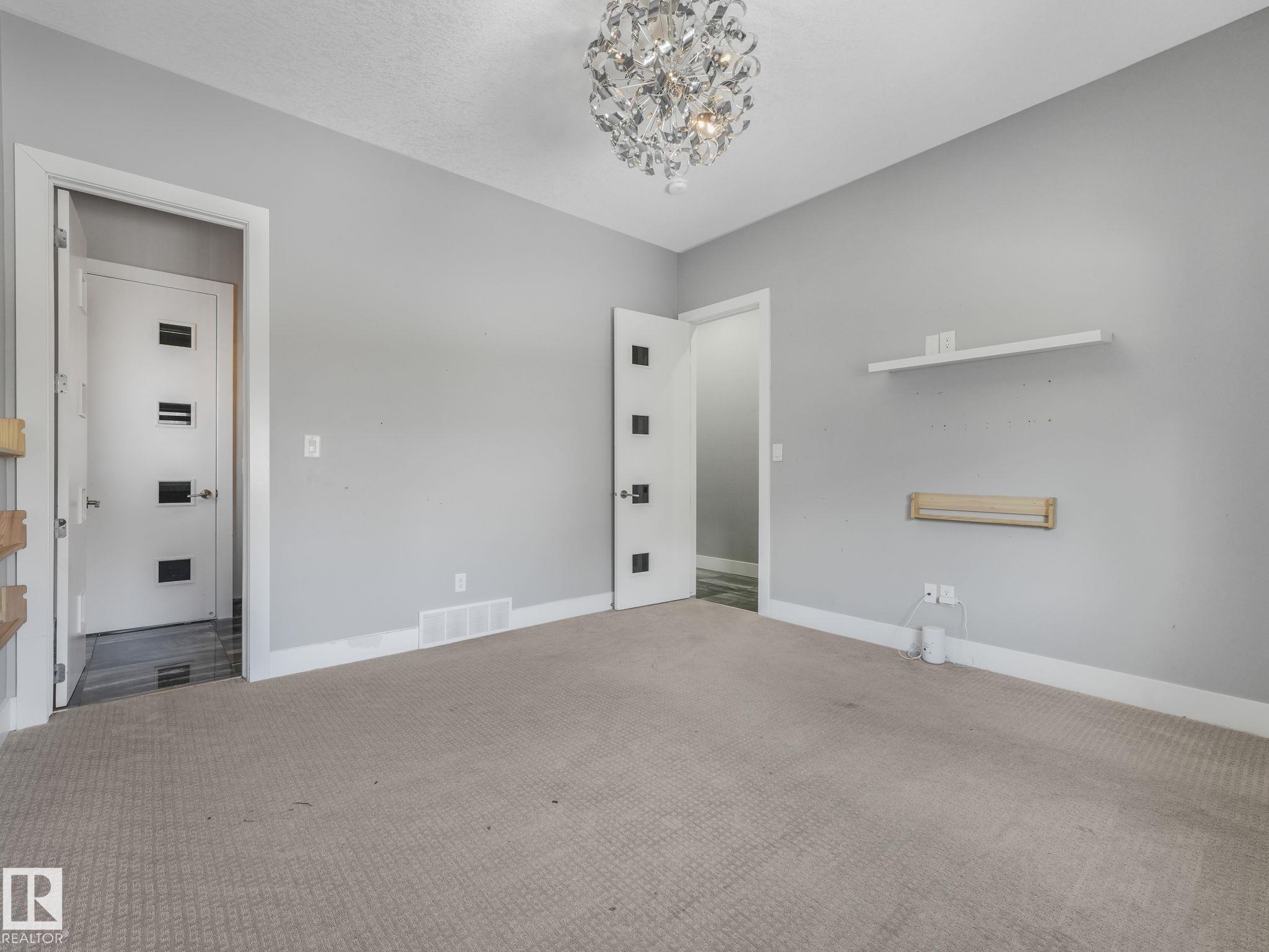 LUXURY LIVING IN AN UNBEATABLE LOCATION! Nestled in a quiet cul-de-sac just steps to the North Saskatchewan River & scenic walking trails, this stunning executive bi-level offers over 4,600 sq ft of upscale living on a large lot. Showcasing a LEGAL SUITE & exceptional craftsmanship, this home impresses with porcelain tile, glass railings & exquisite custom millwork throughout. The main level features a bright living room, elegant dining area with a striking stone feature wall, dual linear fireplace & family room with coffered ceilings. The chef-inspired kitchen is a showstopper, quartz countertops, large island, European cabinetry, premium s/s appliances, gas range, & w/i pantry. 2 spacious bedrooms share a Jack & Jill bath, while the upper level boasts a luxurious primary retreat, spa-like 5-pce ensuite, jacuzzi & steam shower. The finished lower level with SEPARATE ENTRANCE offers an equisite kitchen, 3 bedrooms, multiple baths, family room & separate laundry. Complete with a huge deck - IMPRESSIVE!!