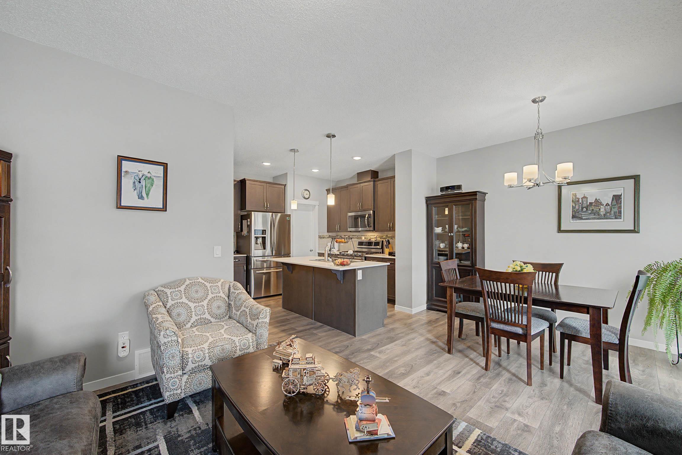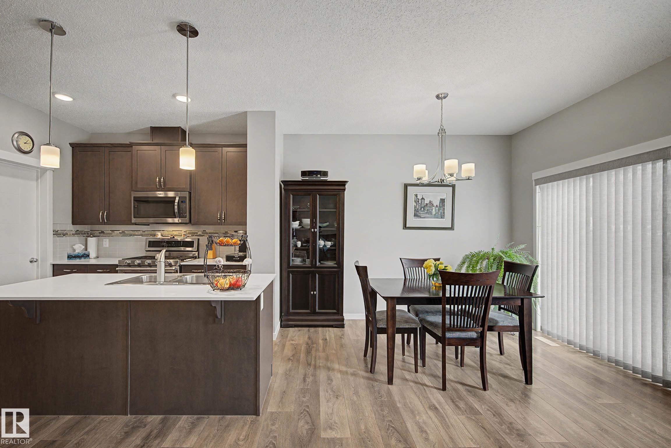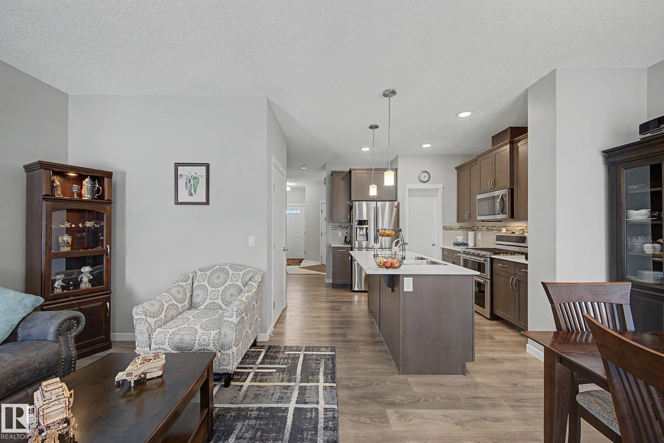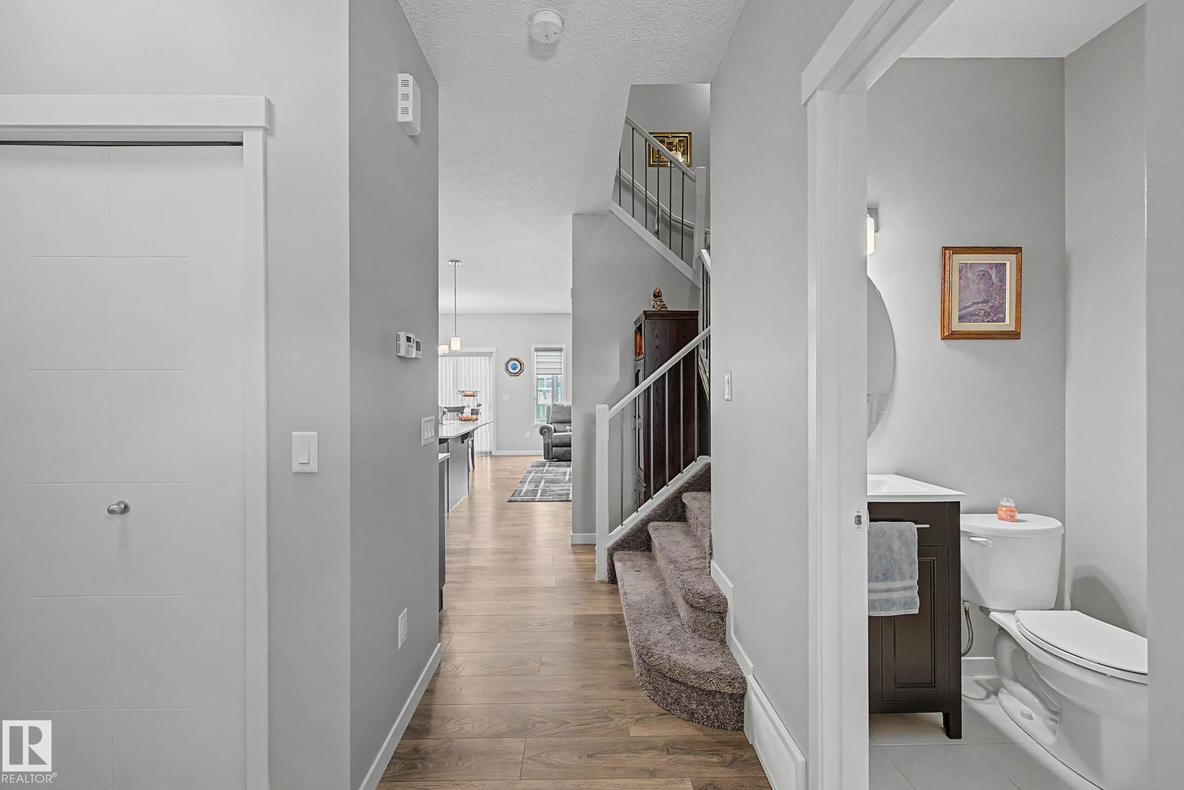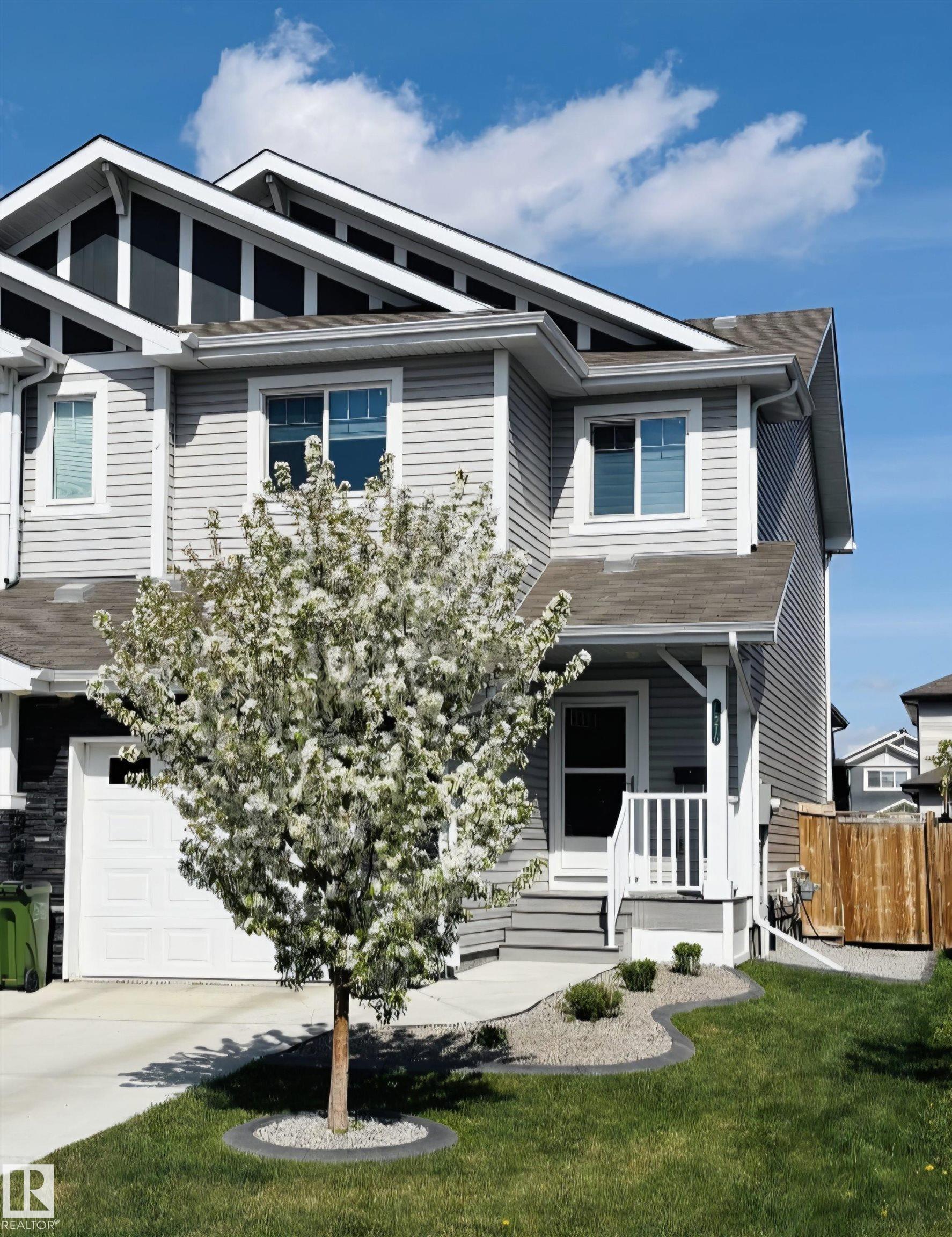 Beautifully finished 2-storey half-duplex offering 3 bedrooms and 3 bathrooms, complete with a single attached garage. The main floor features impressive 9? ceilings and an open-concept layout with laminate flooring throughout. The kitchen is well-appointed with maple cabinetry, a central island with eating ledge, and a convenient walk-through pantry, flowing into a spacious dining nook with patio doors leading to the backyard. Outside, enjoy the durable and low-maintenance composite deck & the front porch/steps are also finished in matching composite decking for added curb appeal and longevity. A stylish half bath with pedestal sink completes the main level. Upstairs, you?ll find a convenient laundry area, a primary suite with walk-in closet and 4-piece ensuite, plus two additional well-sized bedrooms and a full bathroom. The unfinished basement offers endless potential for future development. This home offers plenty of outdoor space and is ideally located near parks with quick access to the Henday!