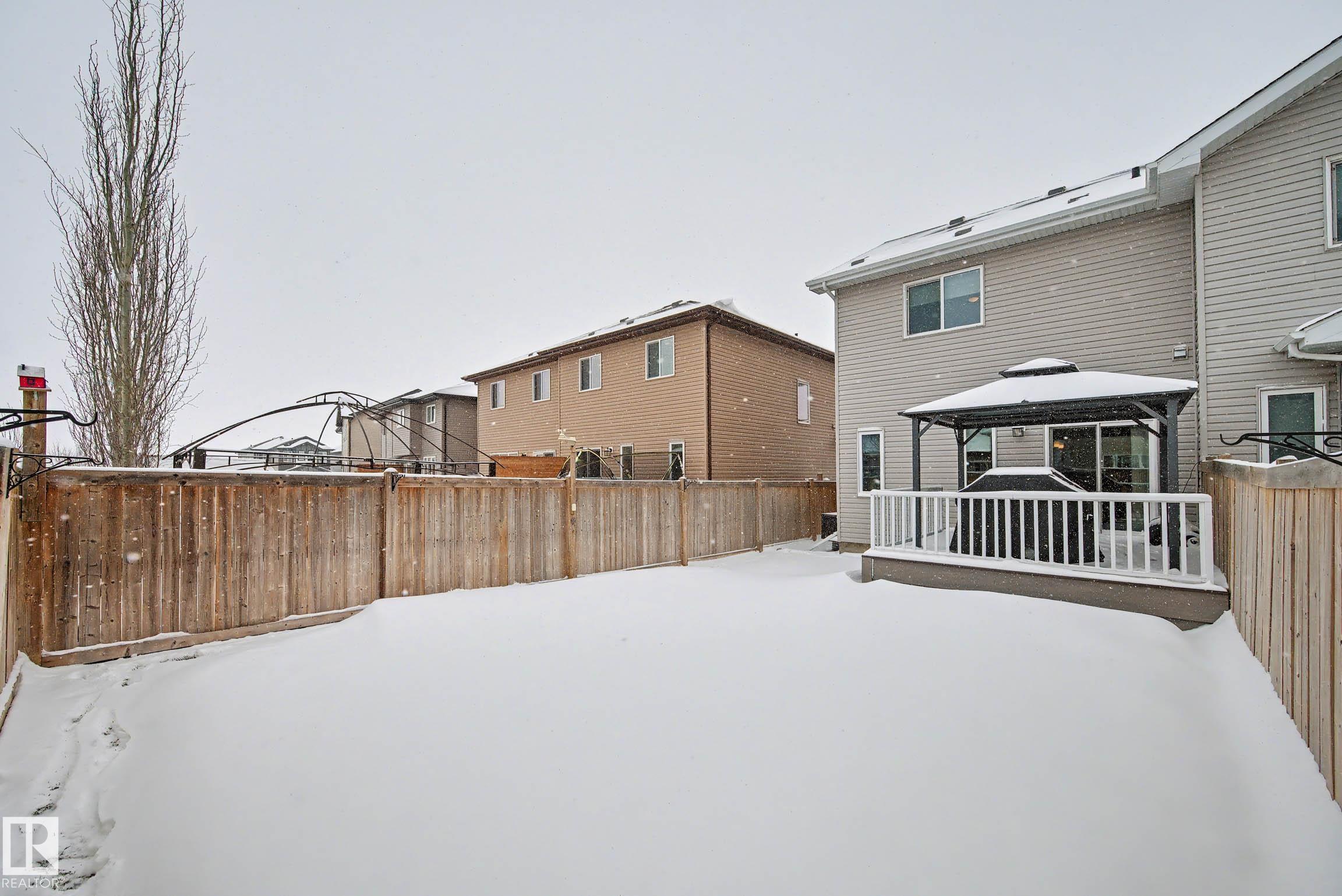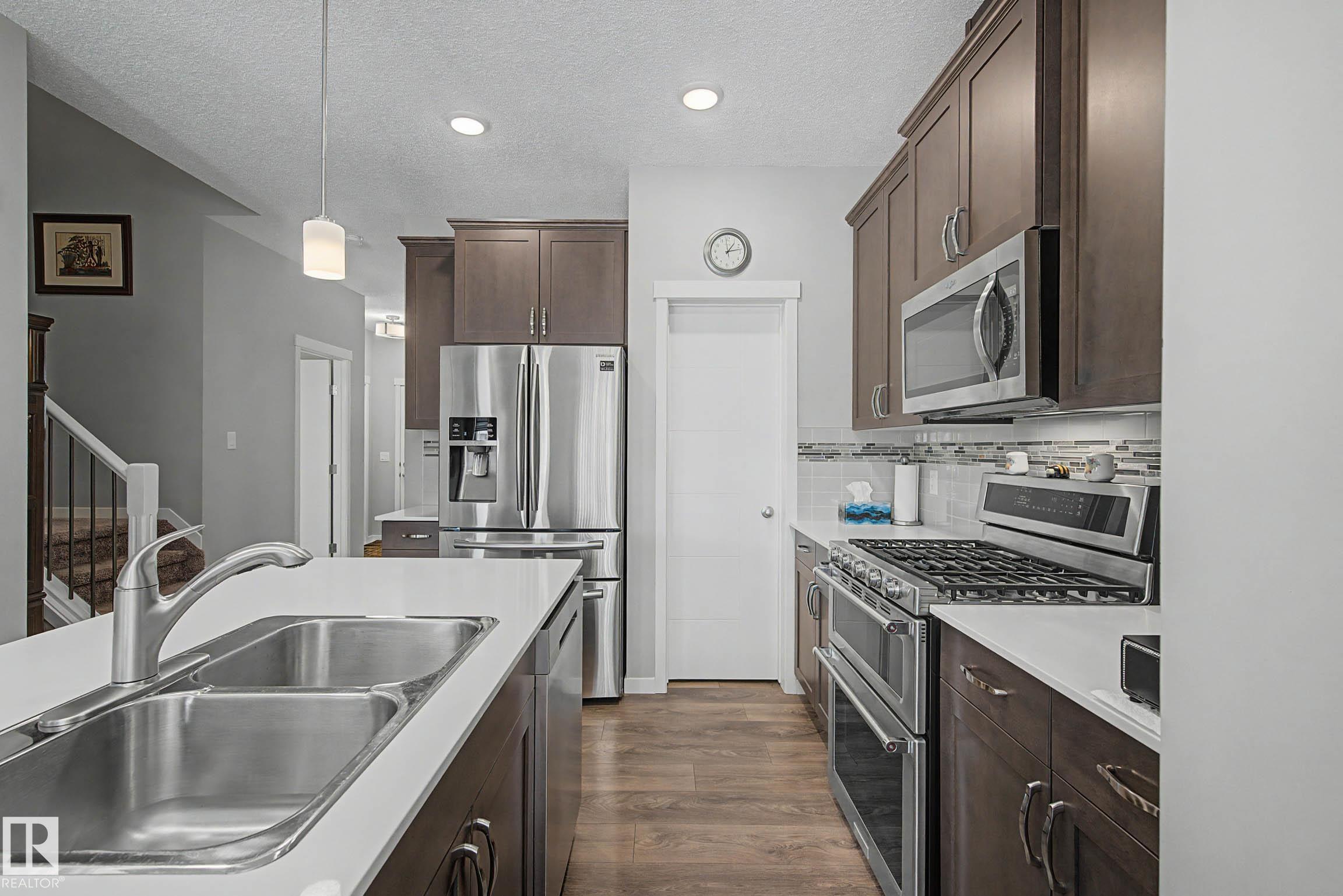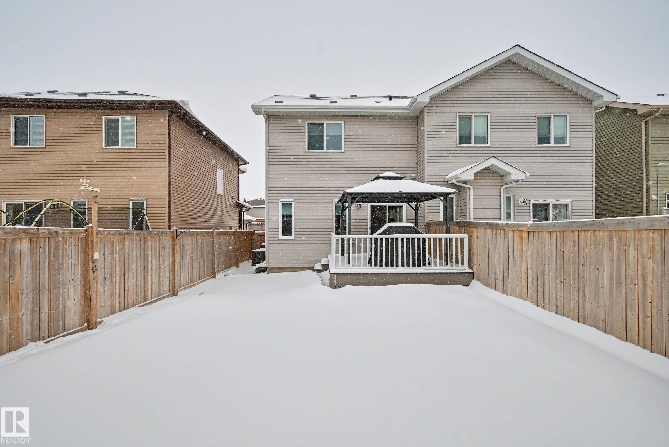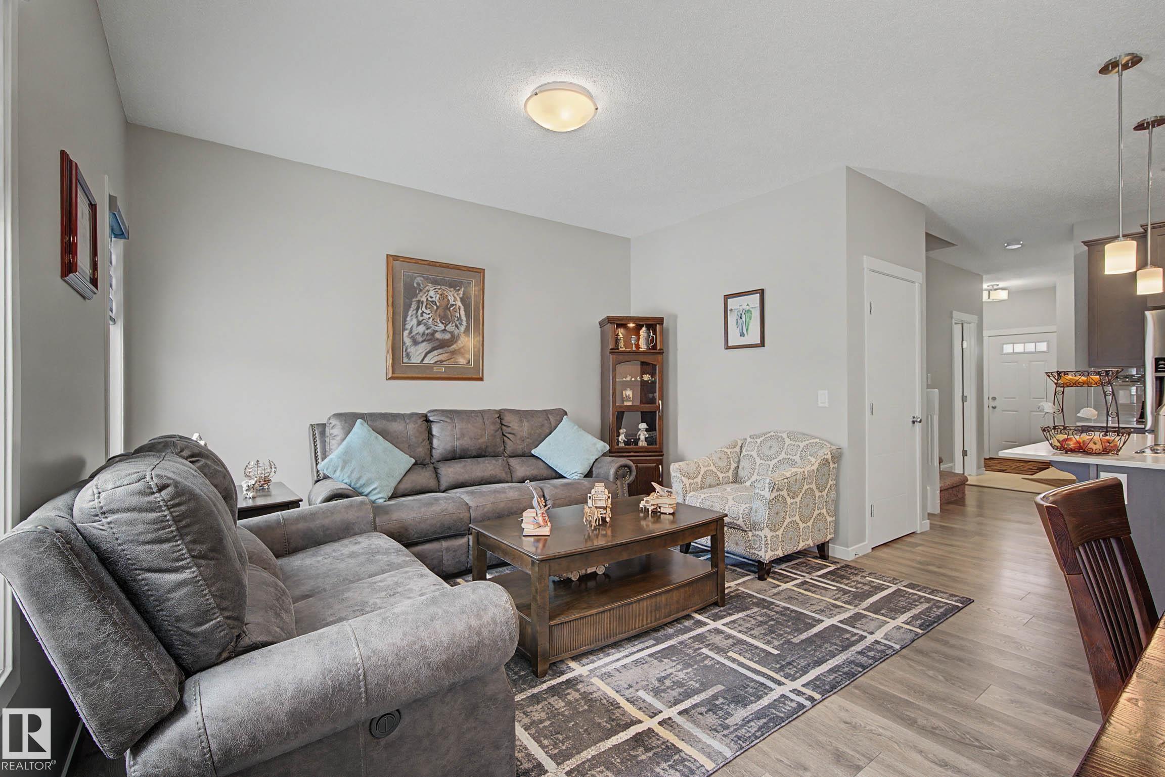 Beautifully finished 2-storey half-duplex offering 3 bedrooms and 3 bathrooms, complete with a single attached garage. The main floor features impressive 9? ceilings and an open-concept layout with laminate flooring throughout. The kitchen is well-appointed with maple cabinetry, a central island with eating ledge, and a convenient walk-through pantry, flowing into a spacious dining nook with patio doors leading to the backyard. Outside, enjoy the durable and low-maintenance composite deck & the front porch/steps are also finished in matching composite decking for added curb appeal and longevity. A stylish half bath with pedestal sink completes the main level. Upstairs, you?ll find a convenient laundry area, a primary suite with walk-in closet and 4-piece ensuite, plus two additional well-sized bedrooms and a full bathroom. The unfinished basement offers endless potential for future development. This home offers plenty of outdoor space and is ideally located near parks with quick access to the Henday!