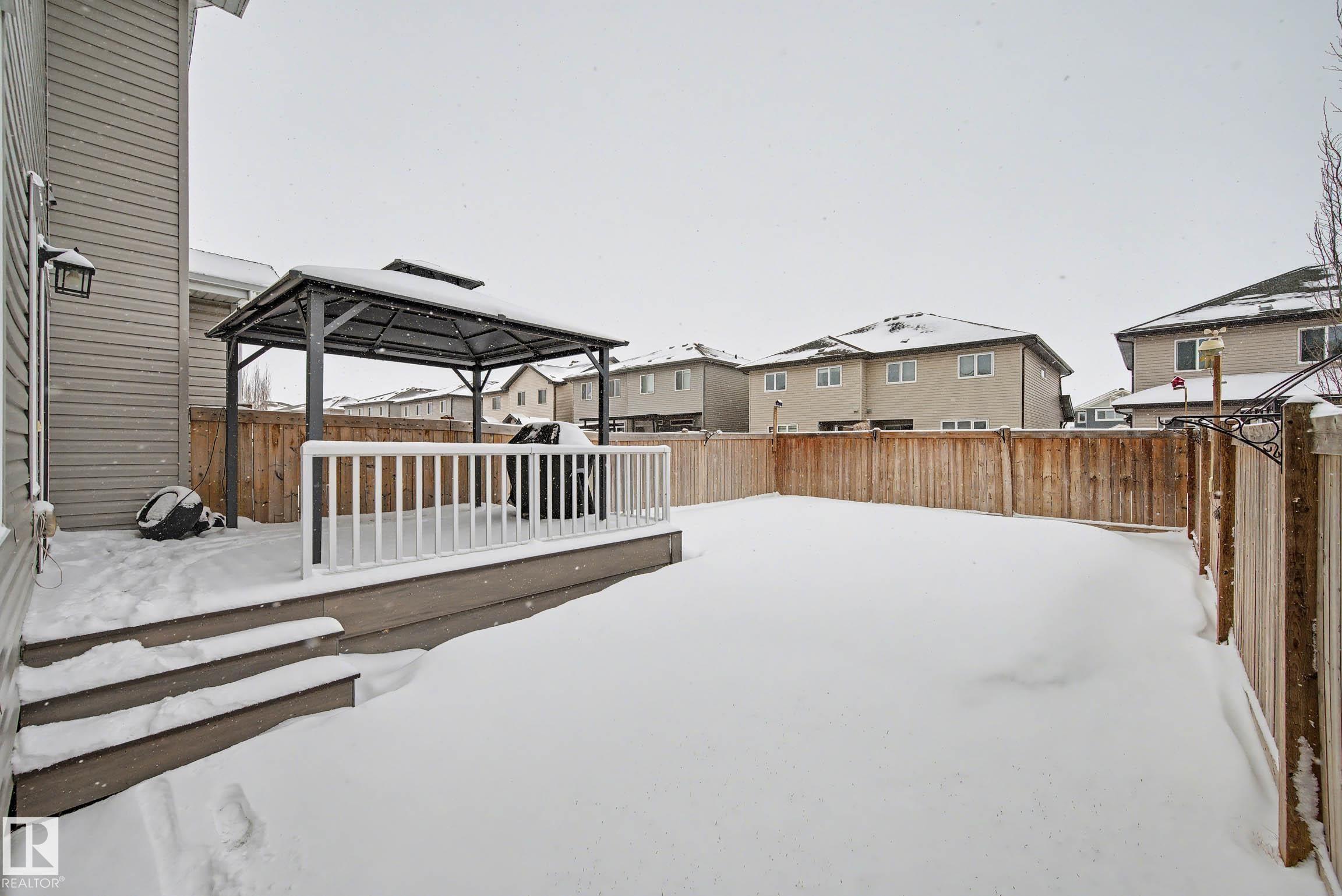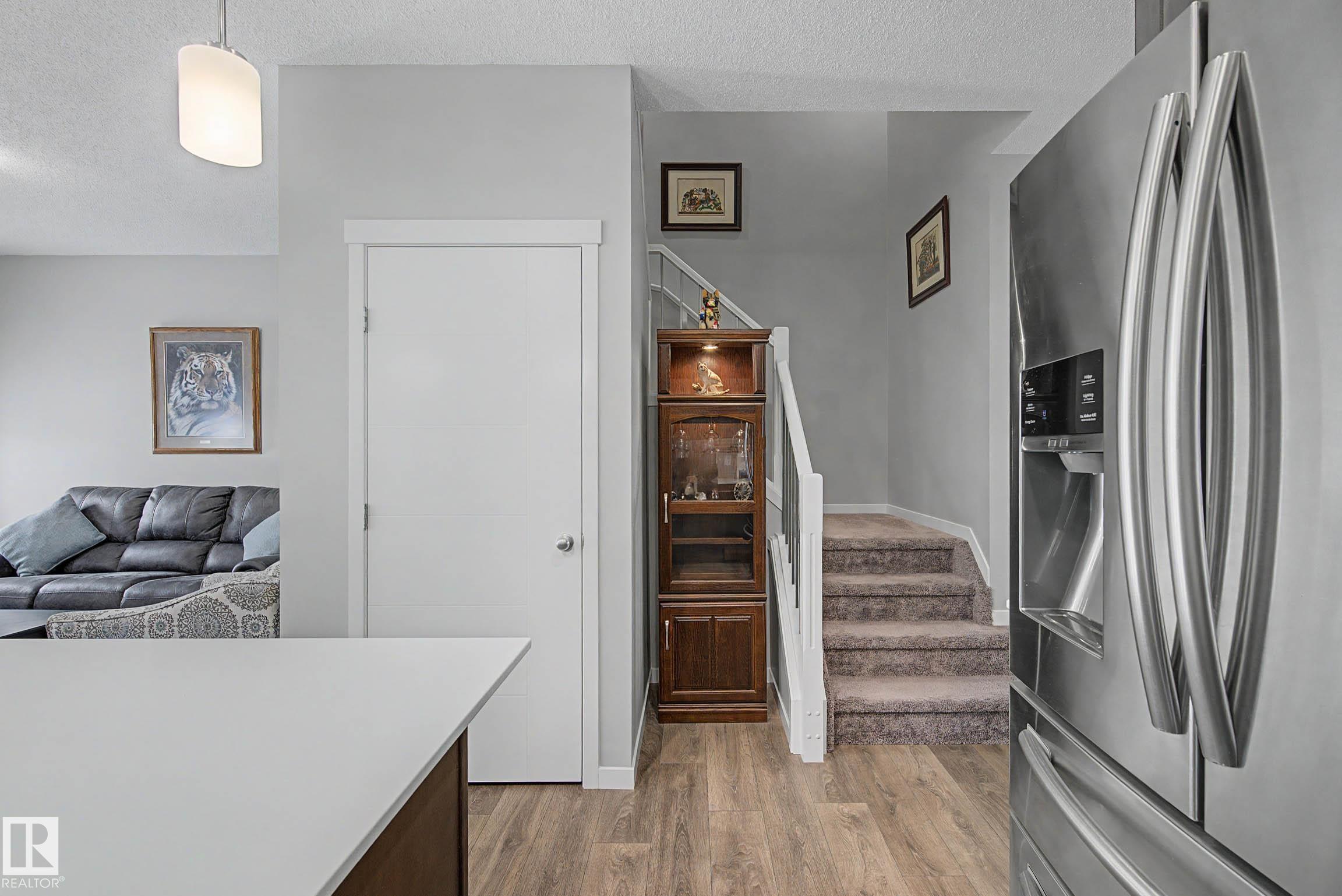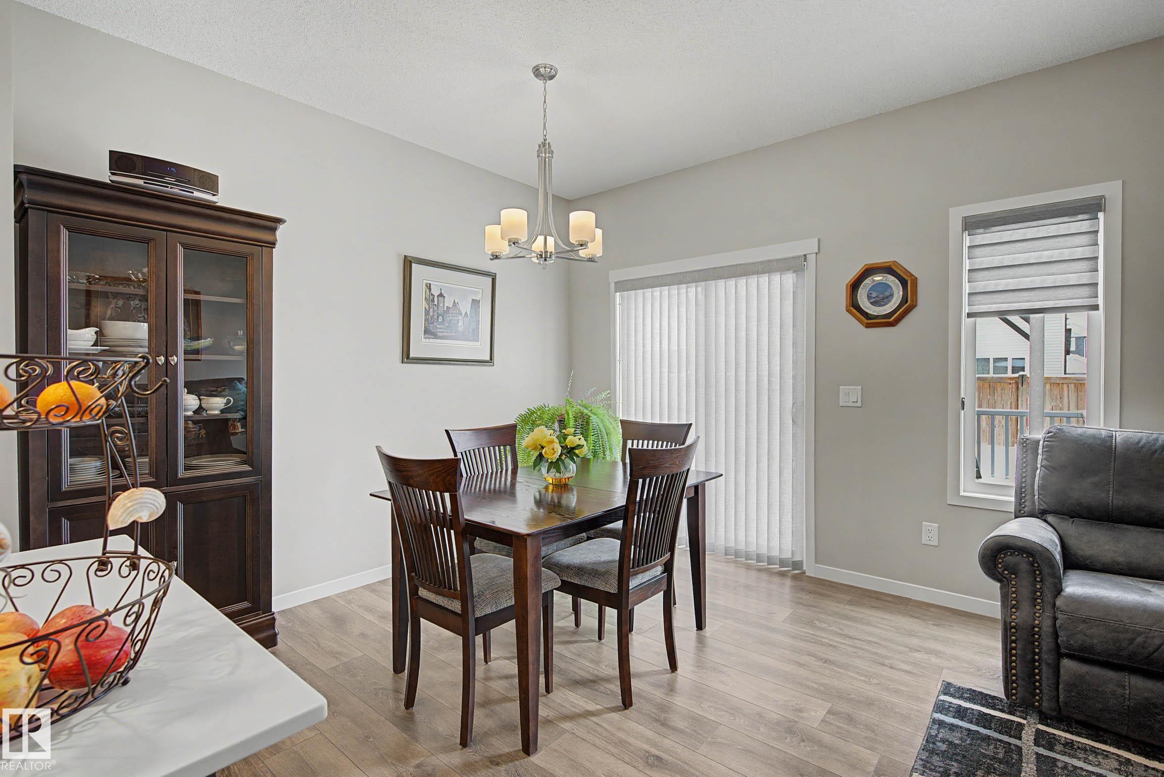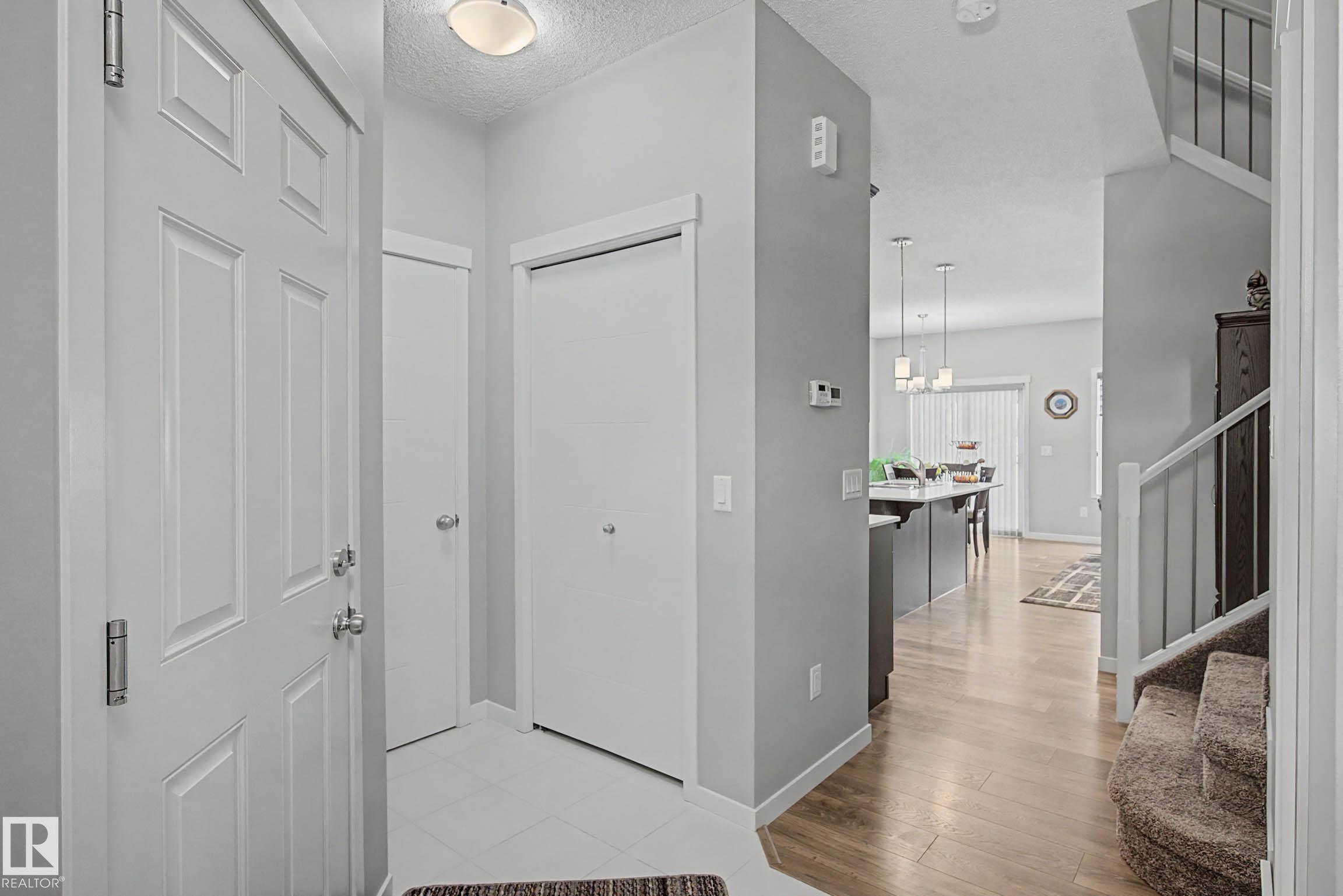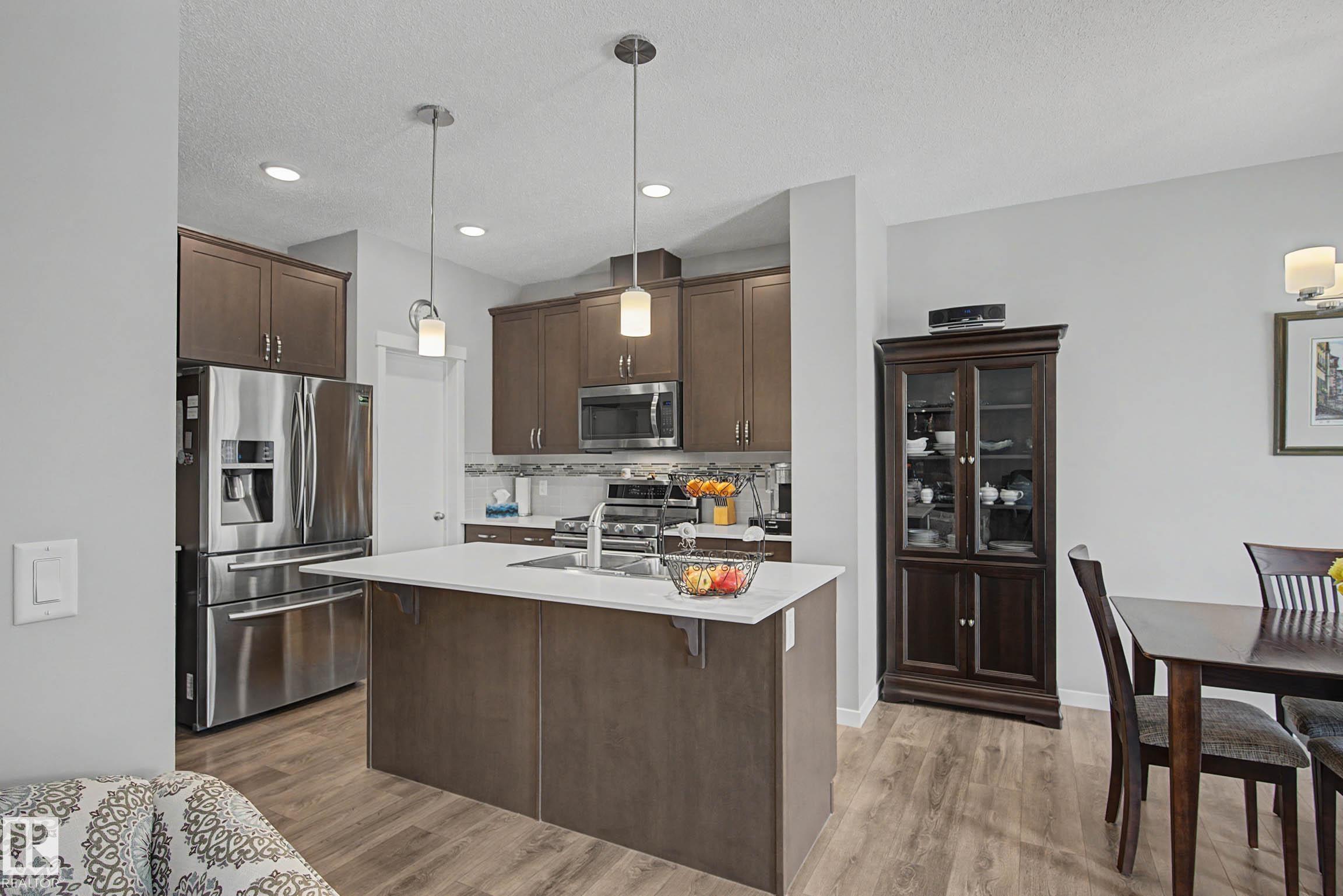 Beautifully finished 2-storey half-duplex offering 3 bedrooms and 3 bathrooms, complete with a single attached garage. The main floor features impressive 9? ceilings and an open-concept layout with laminate flooring throughout. The kitchen is well-appointed with maple cabinetry, a central island with eating ledge, and a convenient walk-through pantry, flowing into a spacious dining nook with patio doors leading to the backyard. Outside, enjoy the durable and low-maintenance composite deck & the front porch/steps are also finished in matching composite decking for added curb appeal and longevity. A stylish half bath with pedestal sink completes the main level. Upstairs, you?ll find a convenient laundry area, a primary suite with walk-in closet and 4-piece ensuite, plus two additional well-sized bedrooms and a full bathroom. The unfinished basement offers endless potential for future development. This home offers plenty of outdoor space and is ideally located near parks with quick access to the Henday!
