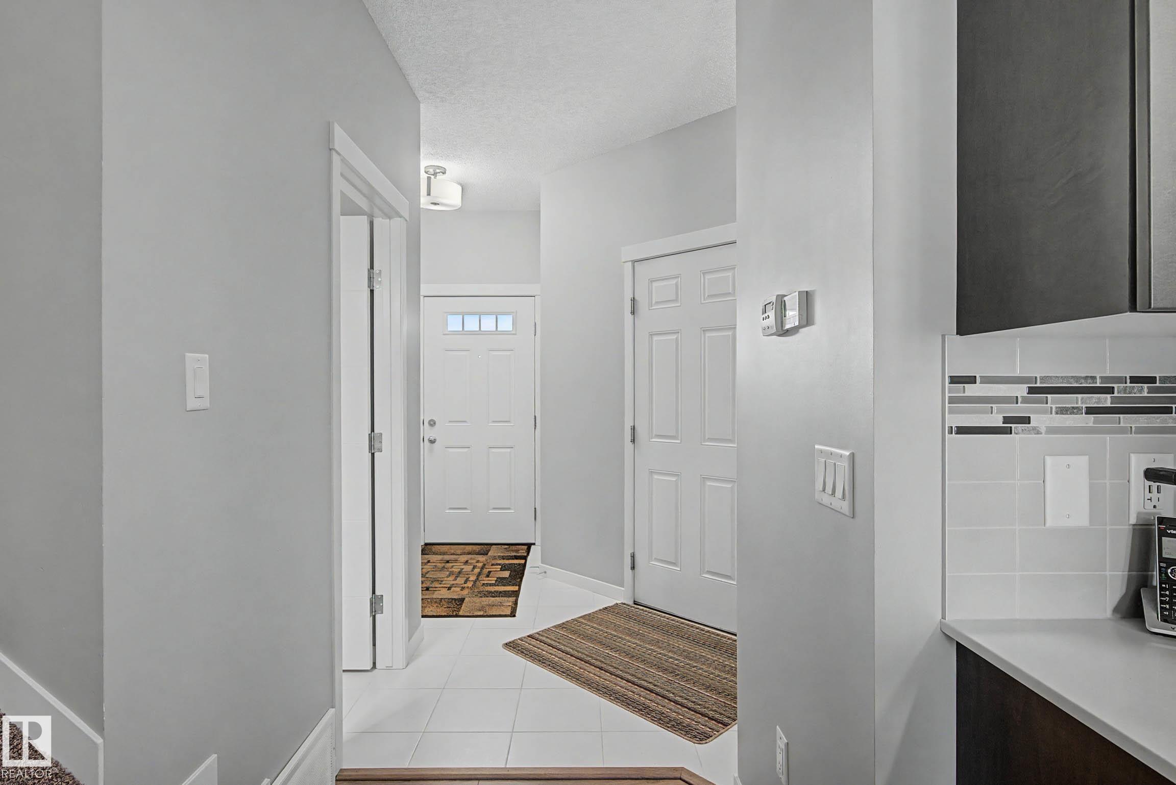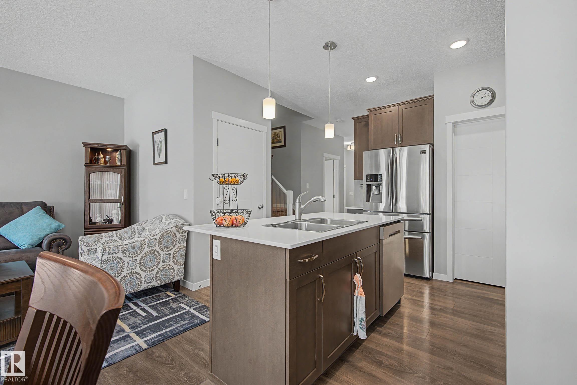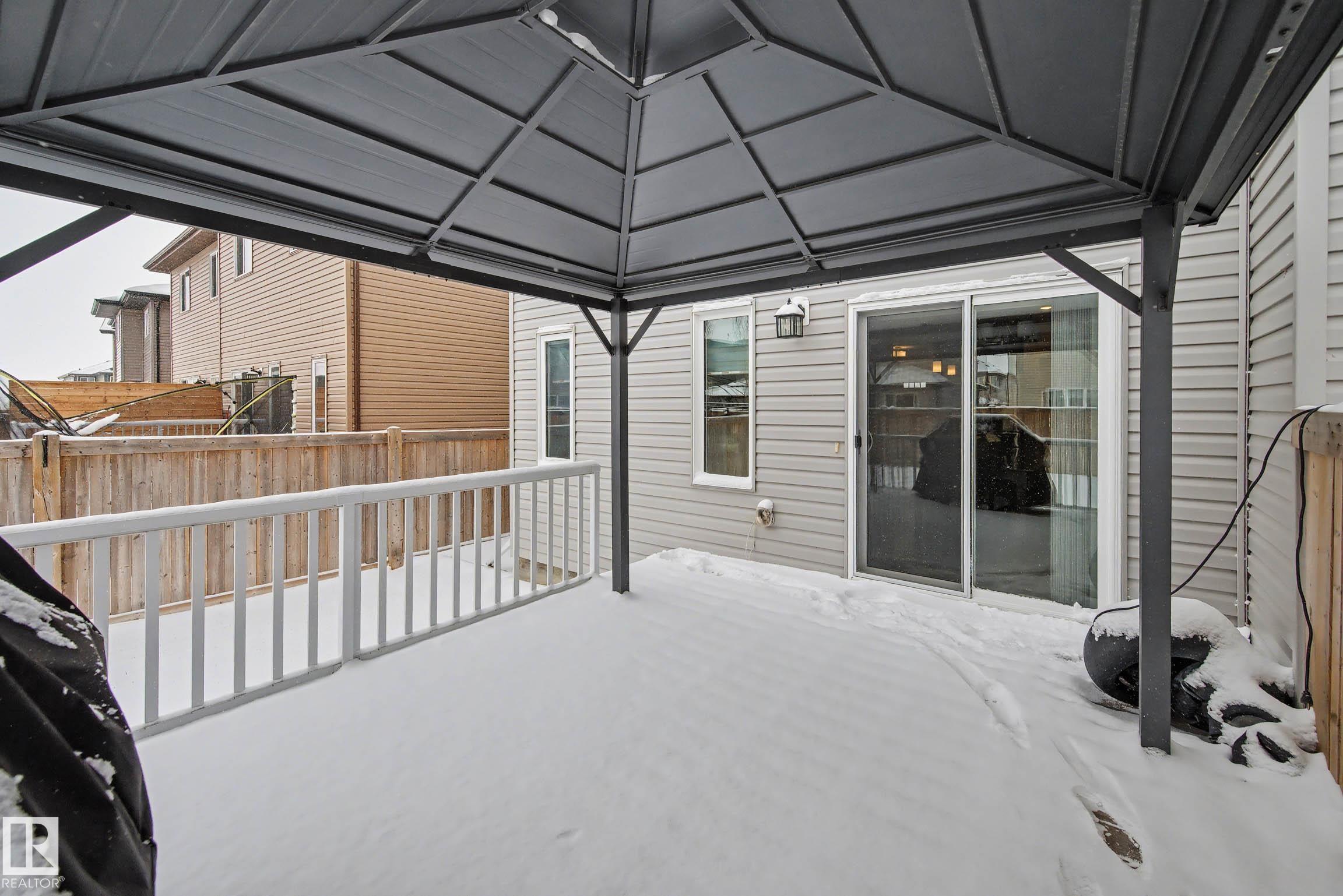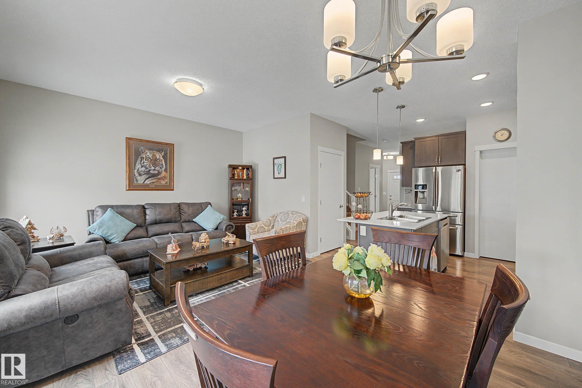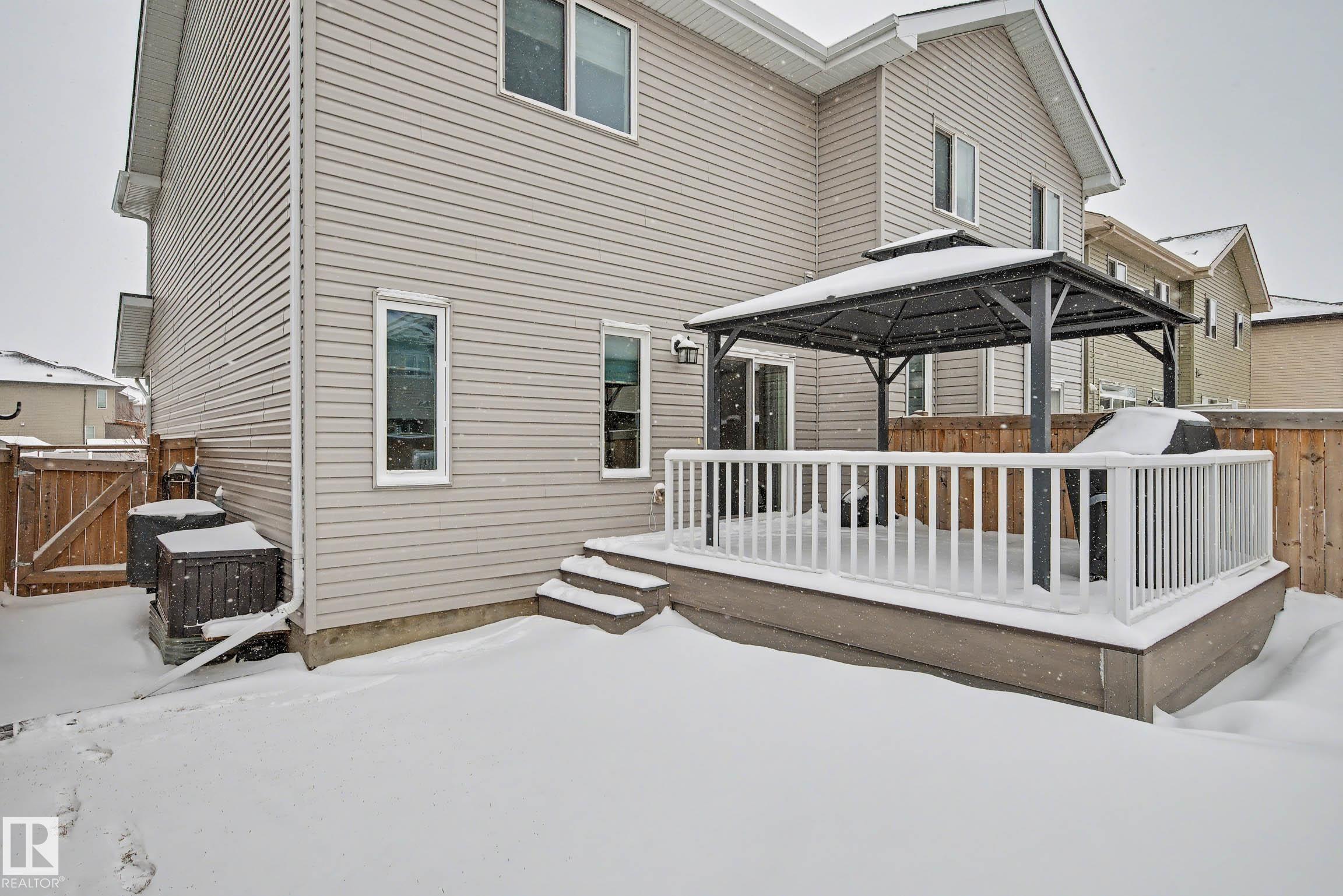 Beautifully finished 2-storey half-duplex offering 3 bedrooms and 3 bathrooms, complete with a single attached garage. The main floor features impressive 9? ceilings and an open-concept layout with laminate flooring throughout. The kitchen is well-appointed with maple cabinetry, a central island with eating ledge, and a convenient walk-through pantry, flowing into a spacious dining nook with patio doors leading to the backyard. Outside, enjoy the durable and low-maintenance composite deck & the front porch/steps are also finished in matching composite decking for added curb appeal and longevity. A stylish half bath with pedestal sink completes the main level. Upstairs, you?ll find a convenient laundry area, a primary suite with walk-in closet and 4-piece ensuite, plus two additional well-sized bedrooms and a full bathroom. The unfinished basement offers endless potential for future development. This home offers plenty of outdoor space and is ideally located near parks with quick access to the Henday!