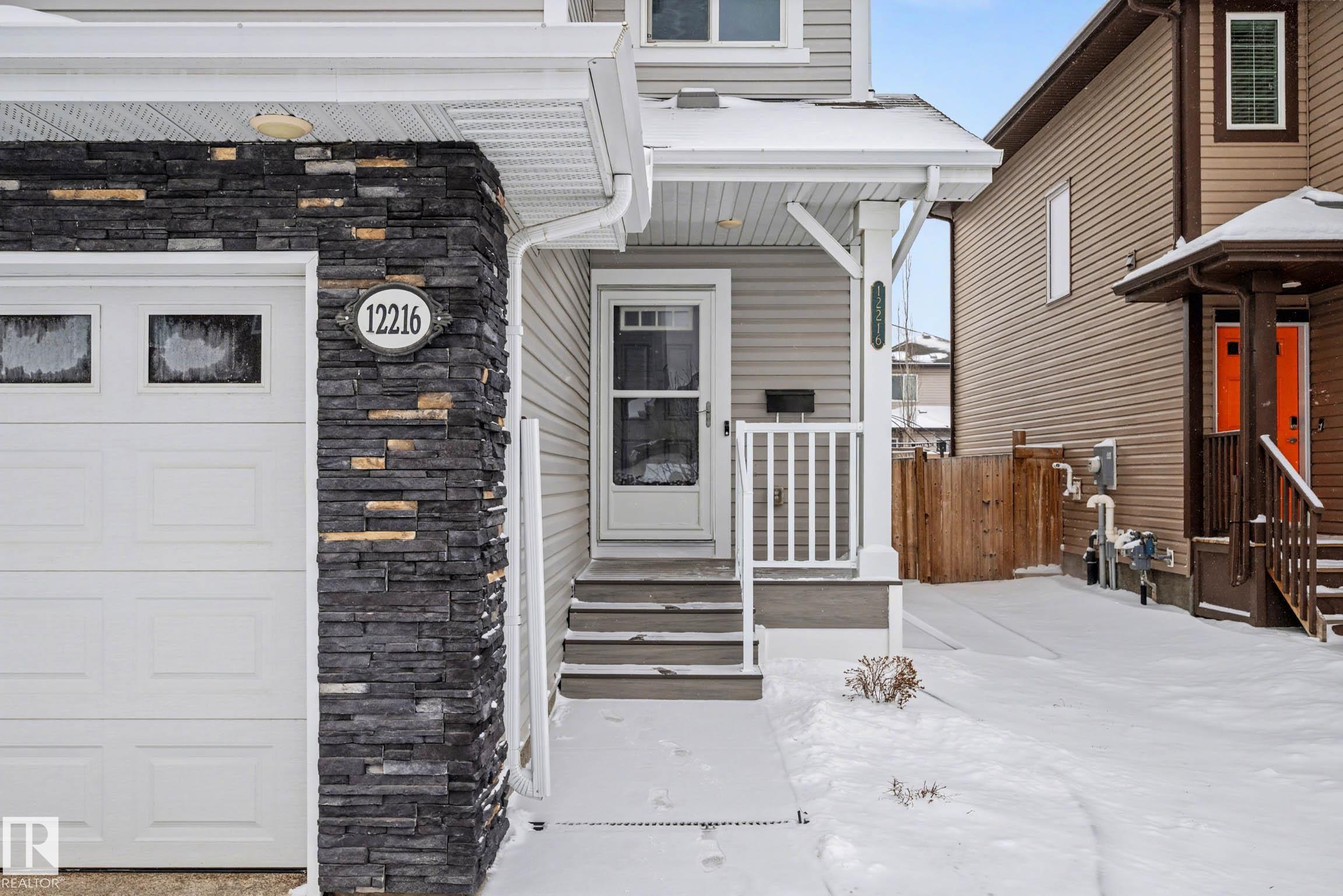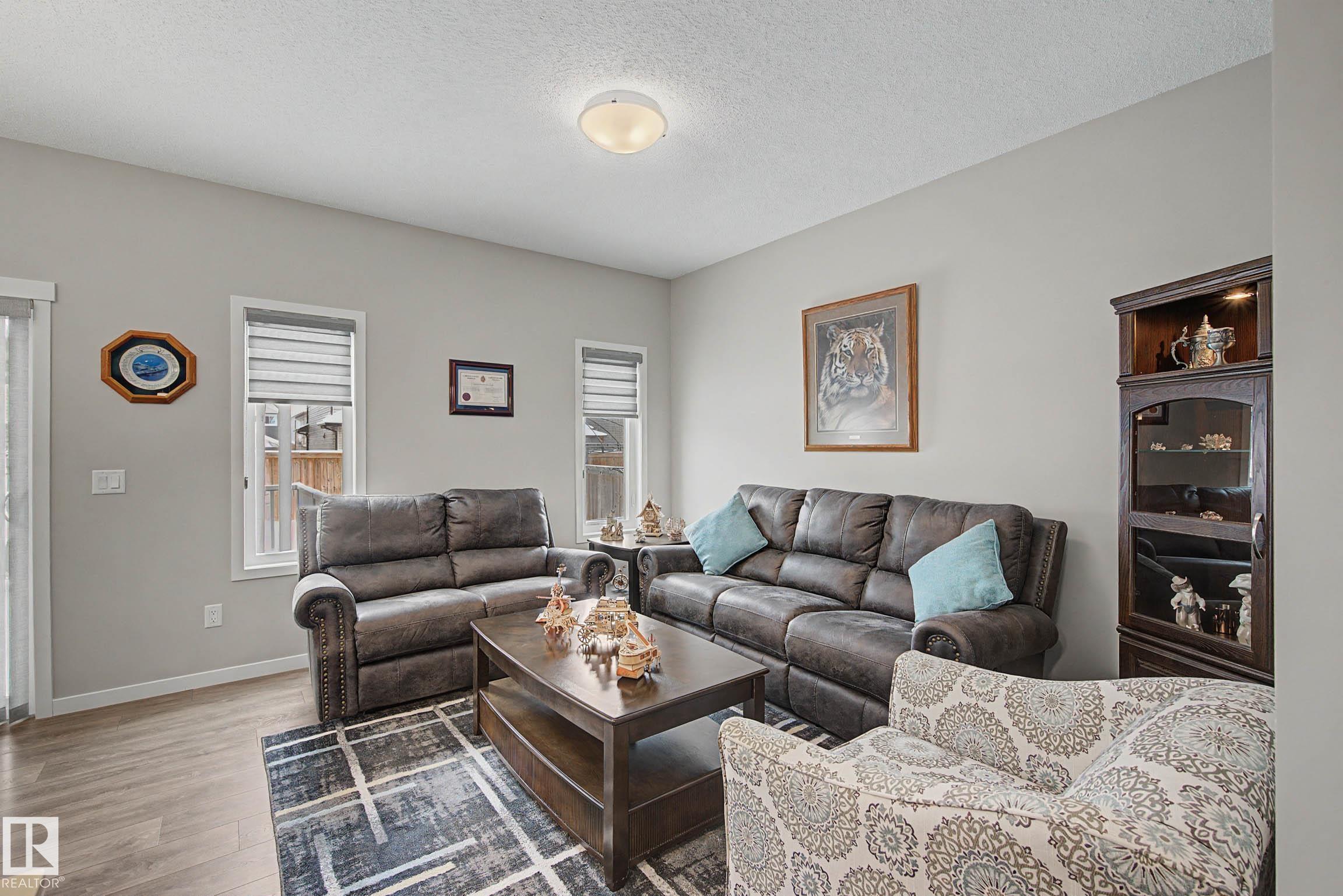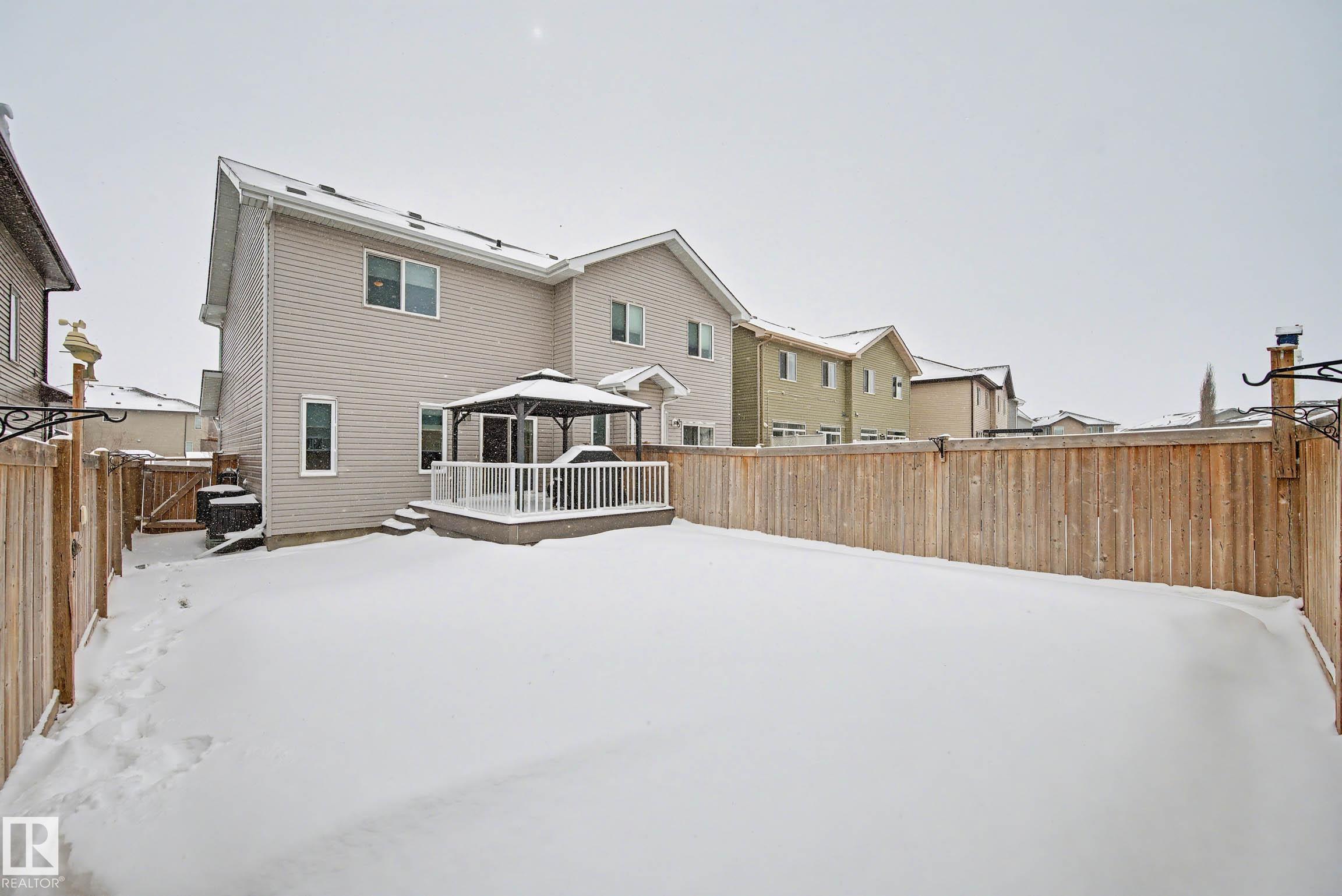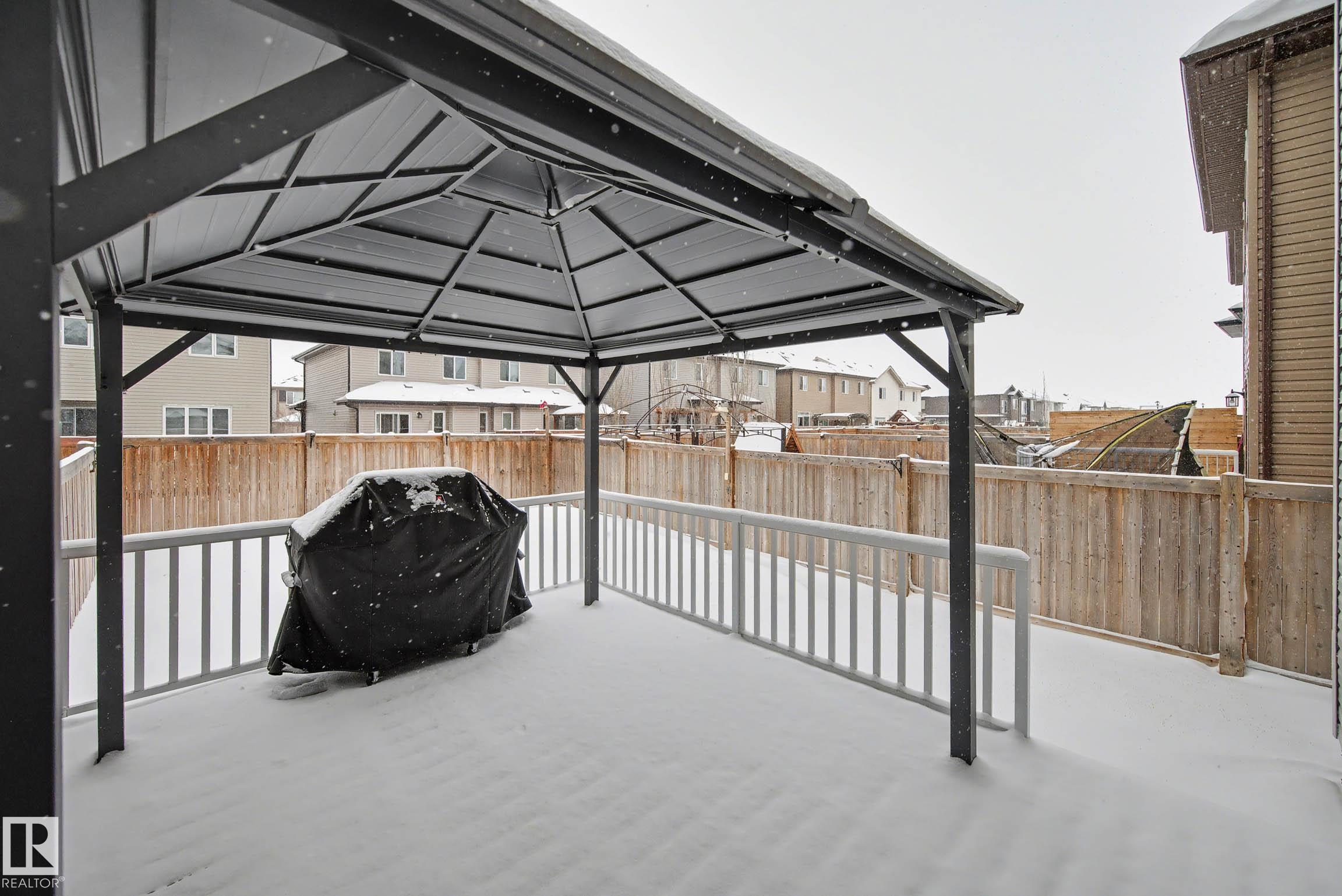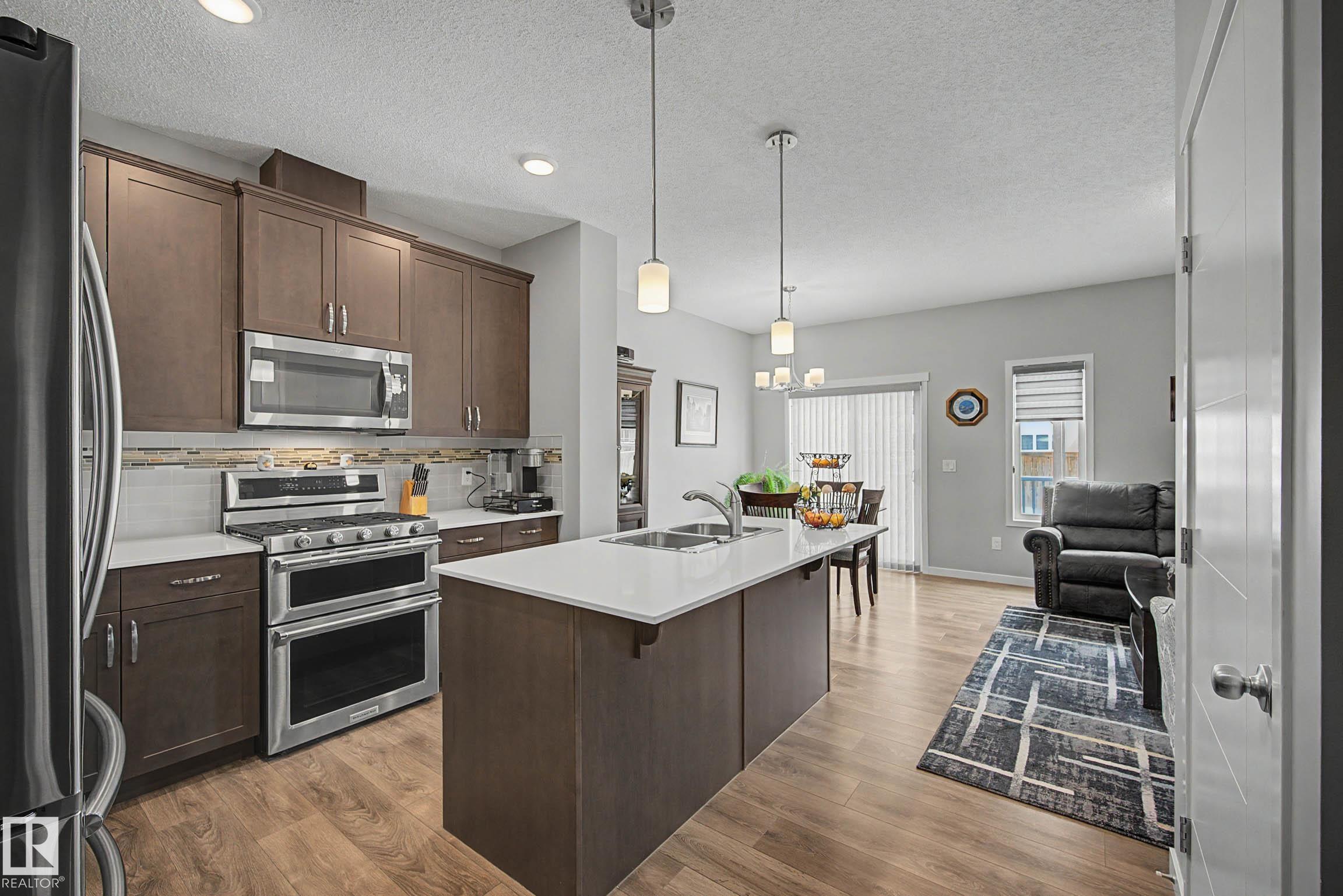 Beautifully finished 2-storey half-duplex offering 3 bedrooms and 3 bathrooms, complete with a single attached garage. The main floor features impressive 9? ceilings and an open-concept layout with laminate flooring throughout. The kitchen is well-appointed with maple cabinetry, a central island with eating ledge, and a convenient walk-through pantry, flowing into a spacious dining nook with patio doors leading to the backyard. Outside, enjoy the durable and low-maintenance composite deck & the front porch/steps are also finished in matching composite decking for added curb appeal and longevity. A stylish half bath with pedestal sink completes the main level. Upstairs, you?ll find a convenient laundry area, a primary suite with walk-in closet and 4-piece ensuite, plus two additional well-sized bedrooms and a full bathroom. The unfinished basement offers endless potential for future development. This home offers plenty of outdoor space and is ideally located near parks with quick access to the Henday!