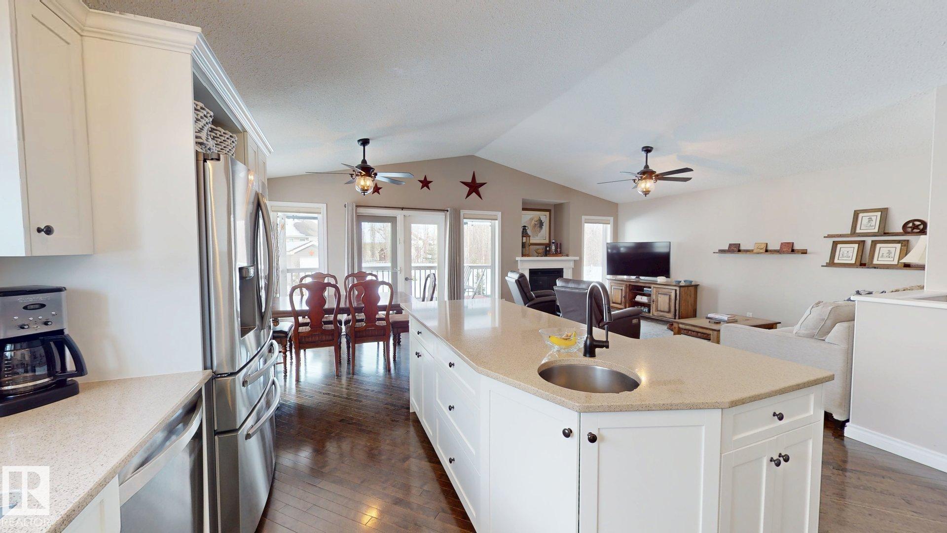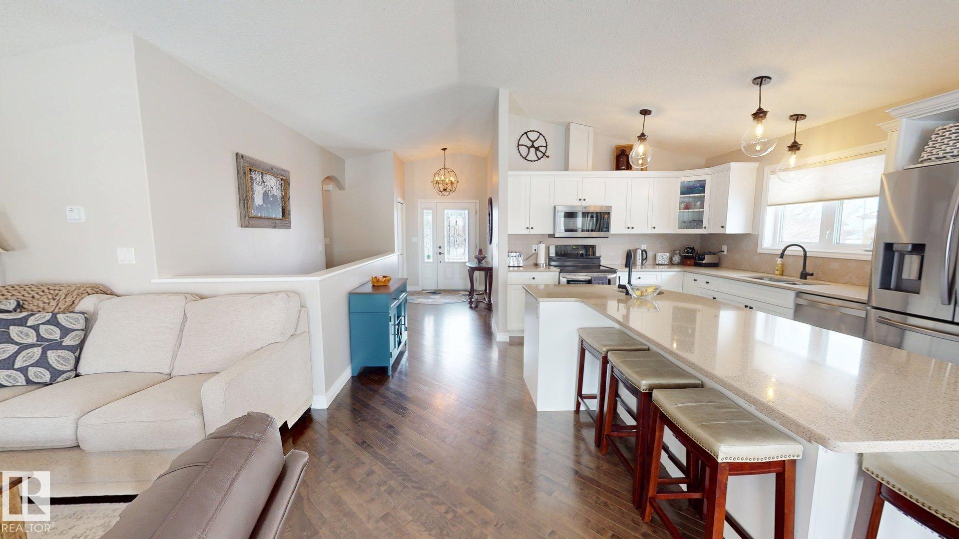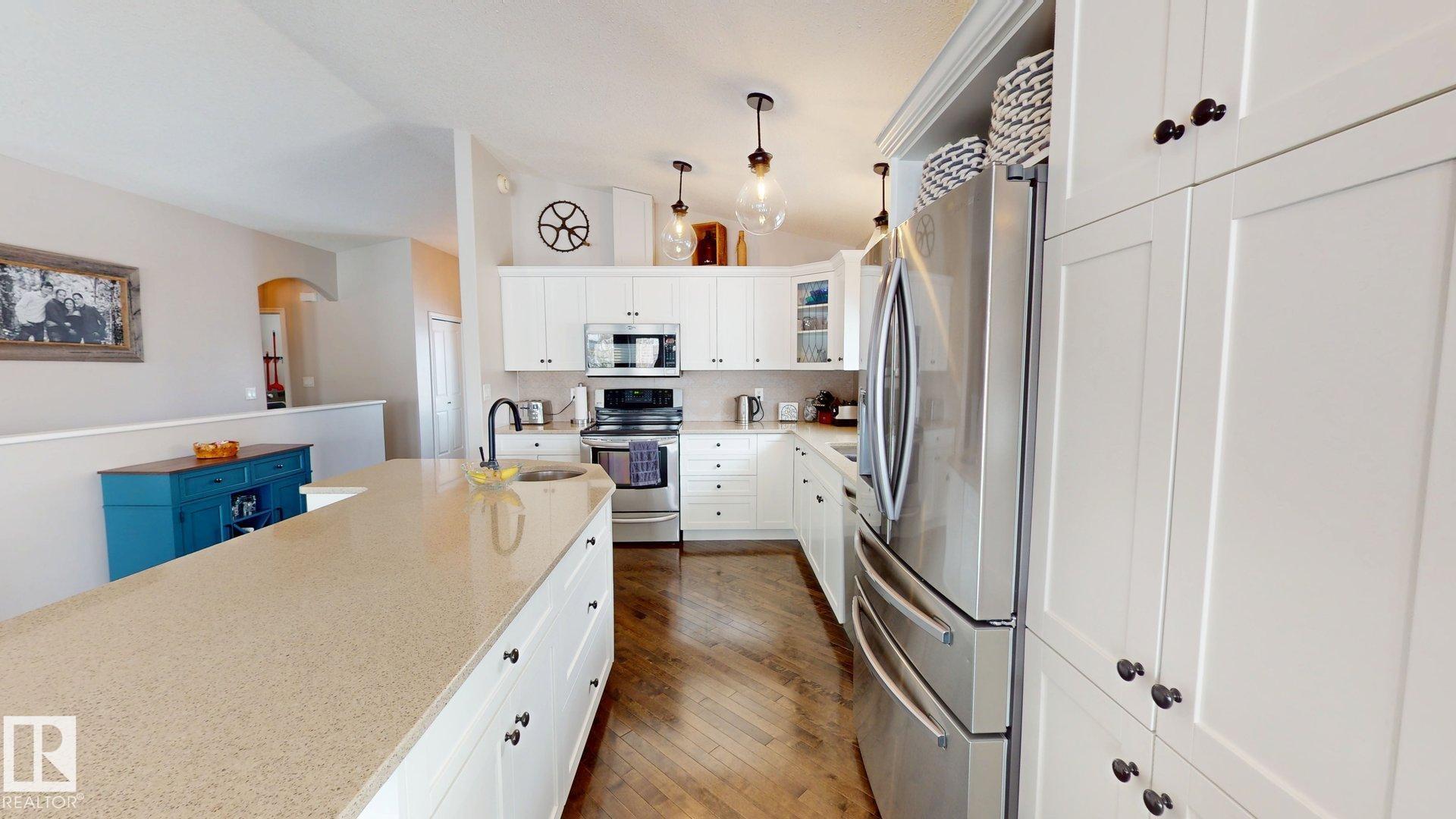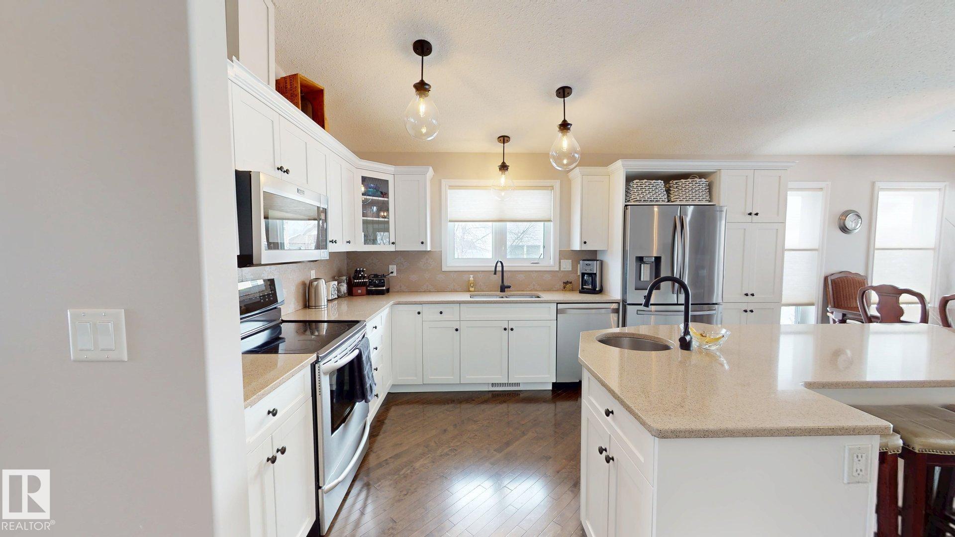 STUNNING 3+2 bdrm home on a HUGE lot in highly sought after Regency Park! Pride of ownership is abundantly clear in this fabulous home, you'll begin to see it from the curb! You walk into a sprawling open floorplan with soaring vaulted ceilings, gleaming hardwood, and a kitchen you'll look forward to cooking in! Tons of cabinets, custom Italian tile backsplash, quartz countertops, PLUS..an extra sink in the island that also features a breakfast bar! Just adjacent is a spacious living room with a cozy gas fireplace, & garden doors leading to your covered deck with gas line...perfect for entertaining! Further, there are 3 spacious bdrms, as well as a gorgeous office/den, or possible 4th bdrm up with in-floor heat! Downstairs features vinyl plank flooring, a bright oversized family room with 2 more bdrms, & one is oversized! Don't forget the backyard!! one of the largest lots in town, you've got more than enough room for a pool, skating rink, & ALL of your garden furniture! BONUS There's room for an RV pad!